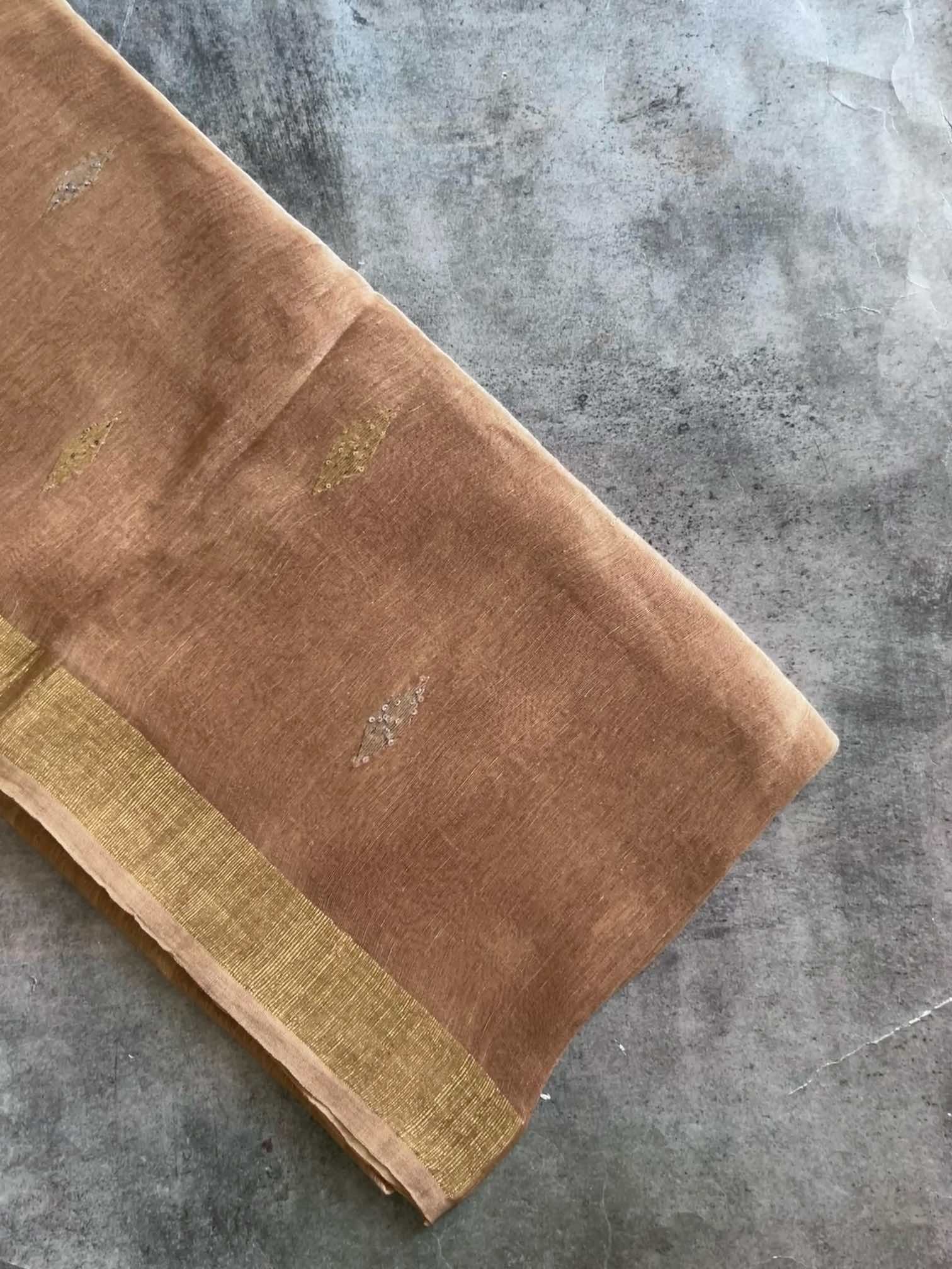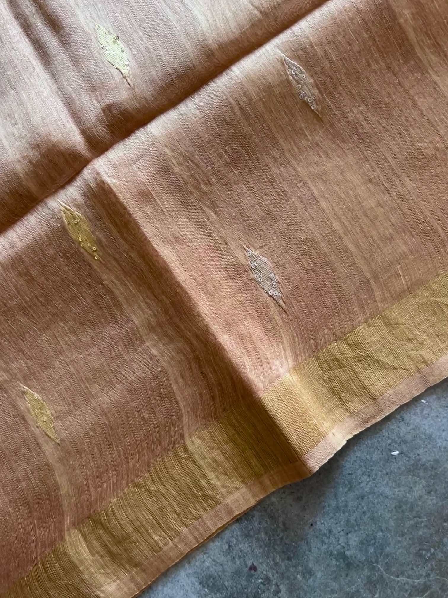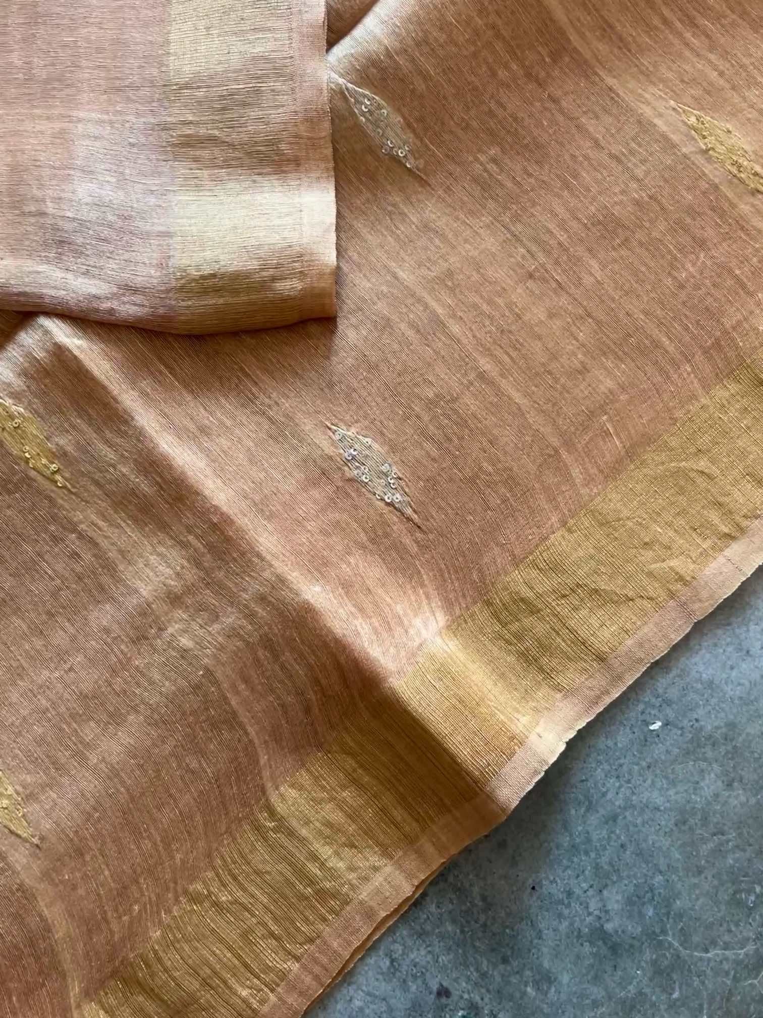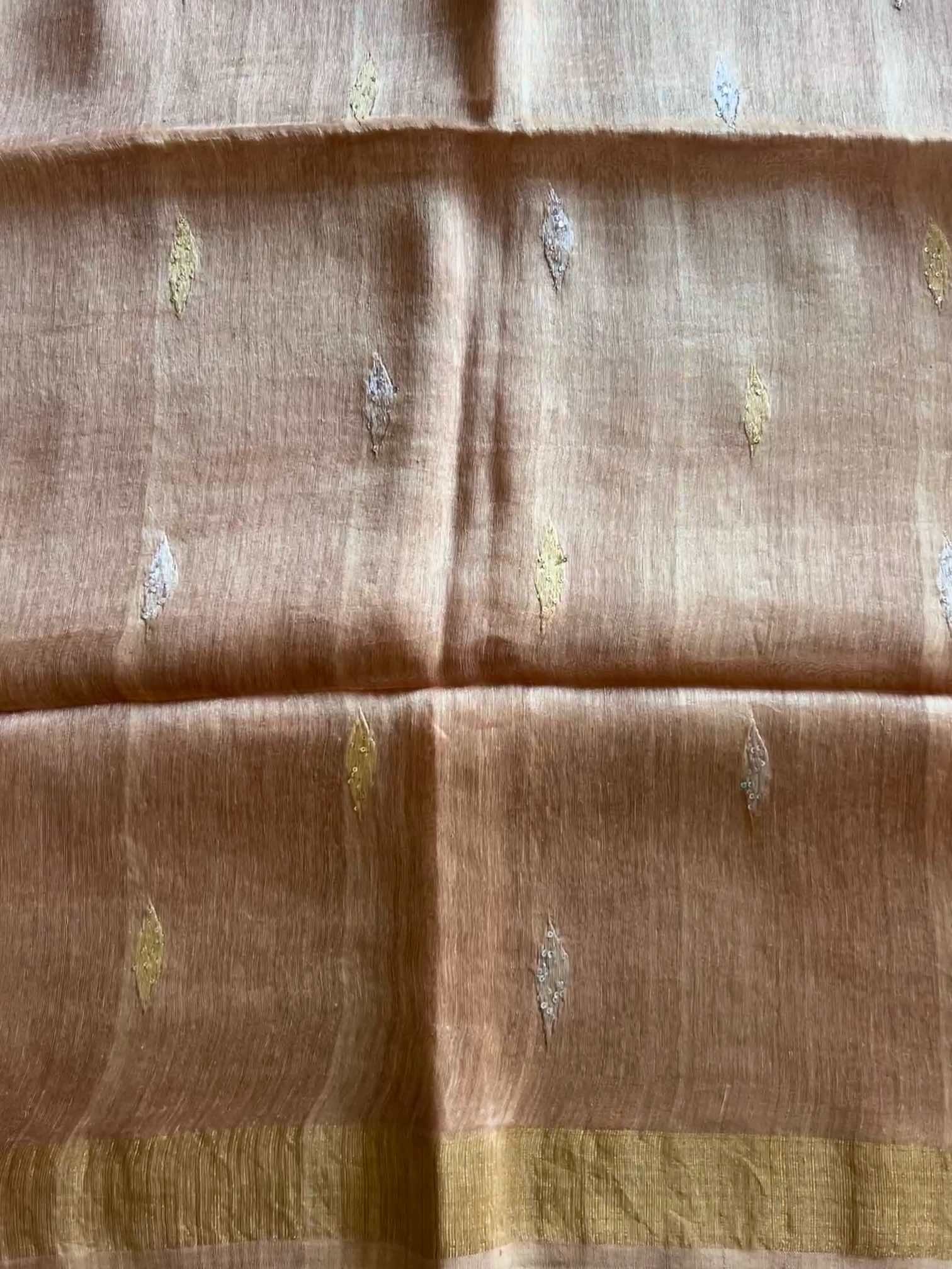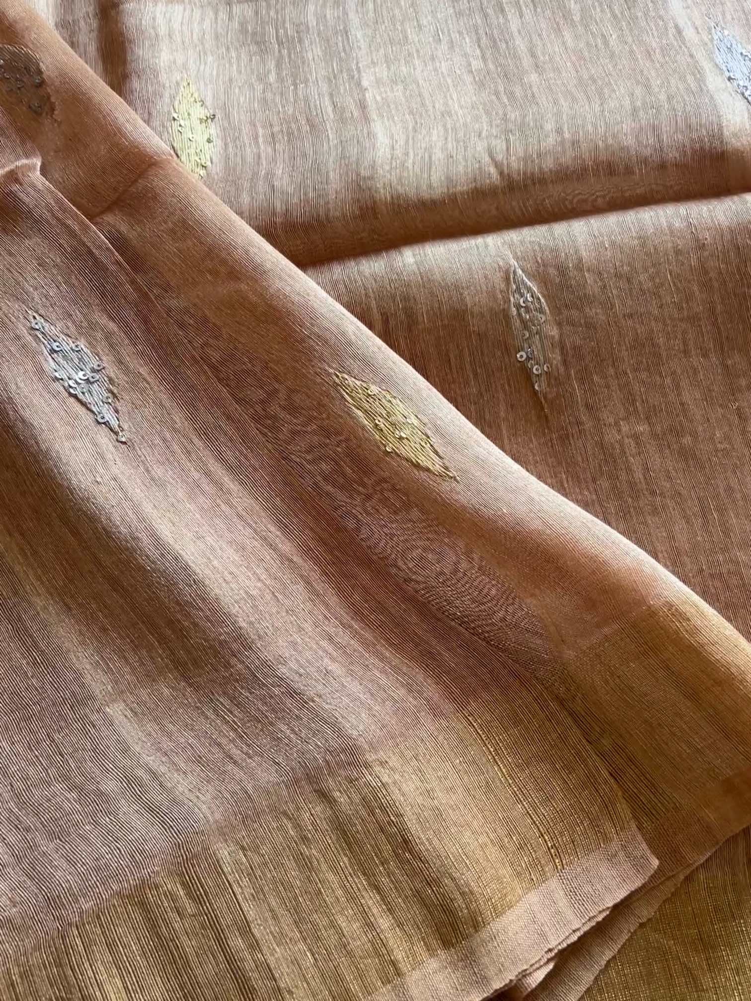The linen silk saree is a stunning blend of subtle charm and regal artistry. The body is adorned with small diamond-shaped Jamdhani motifs, delicately highlighted with sequins that add a gentle sparkle without overpowering its elegance. The true showstopper is the Paithani-inspired Jamdhani pallu — rich in heritage, with intricate patterns woven to reflect timeless tradition. The crisp texture of linen silk paired with the shimmer of sequins and the grandeur of Paithani design makes this saree a perfect harmony of understated beauty and cultural richness.