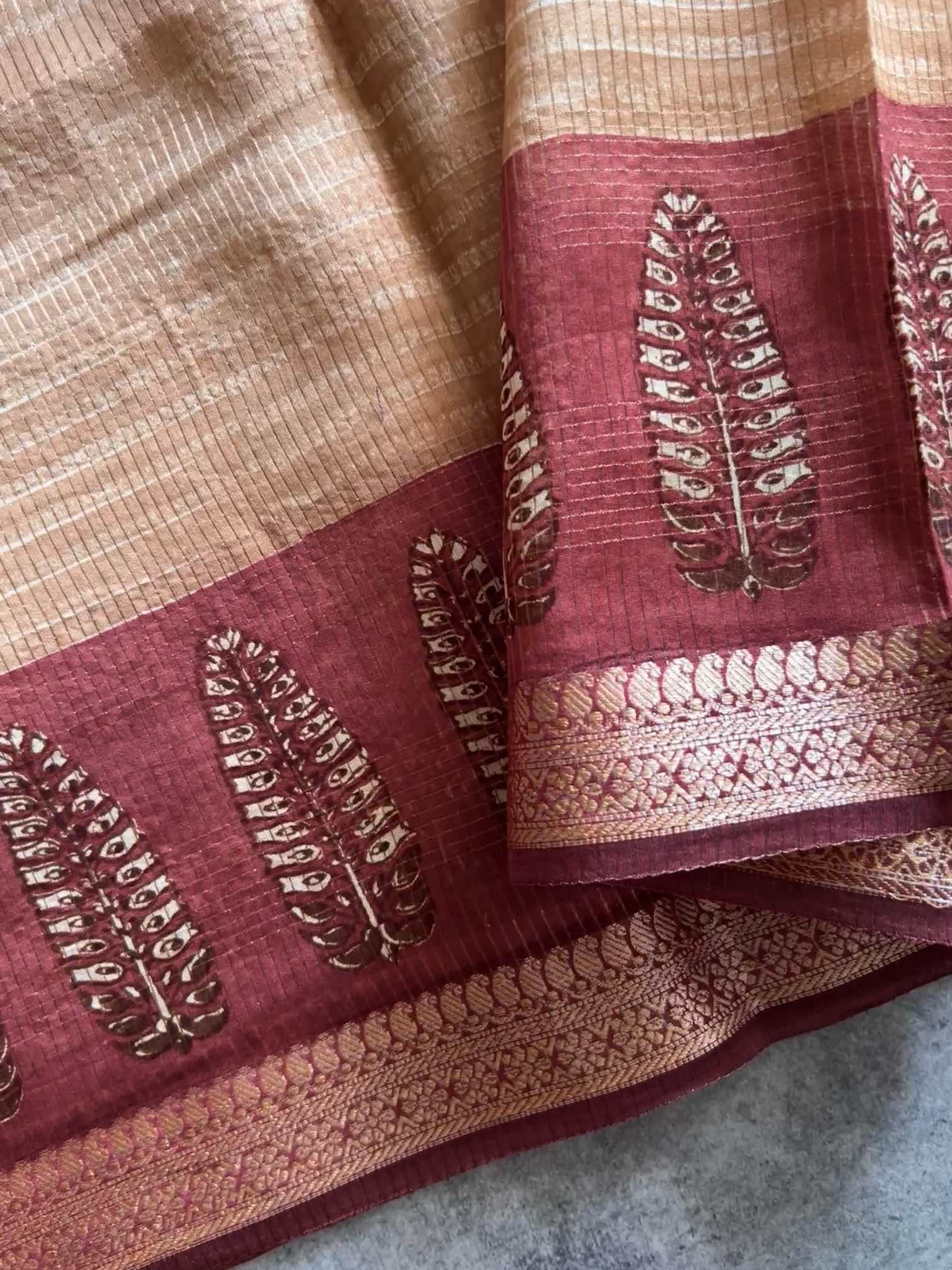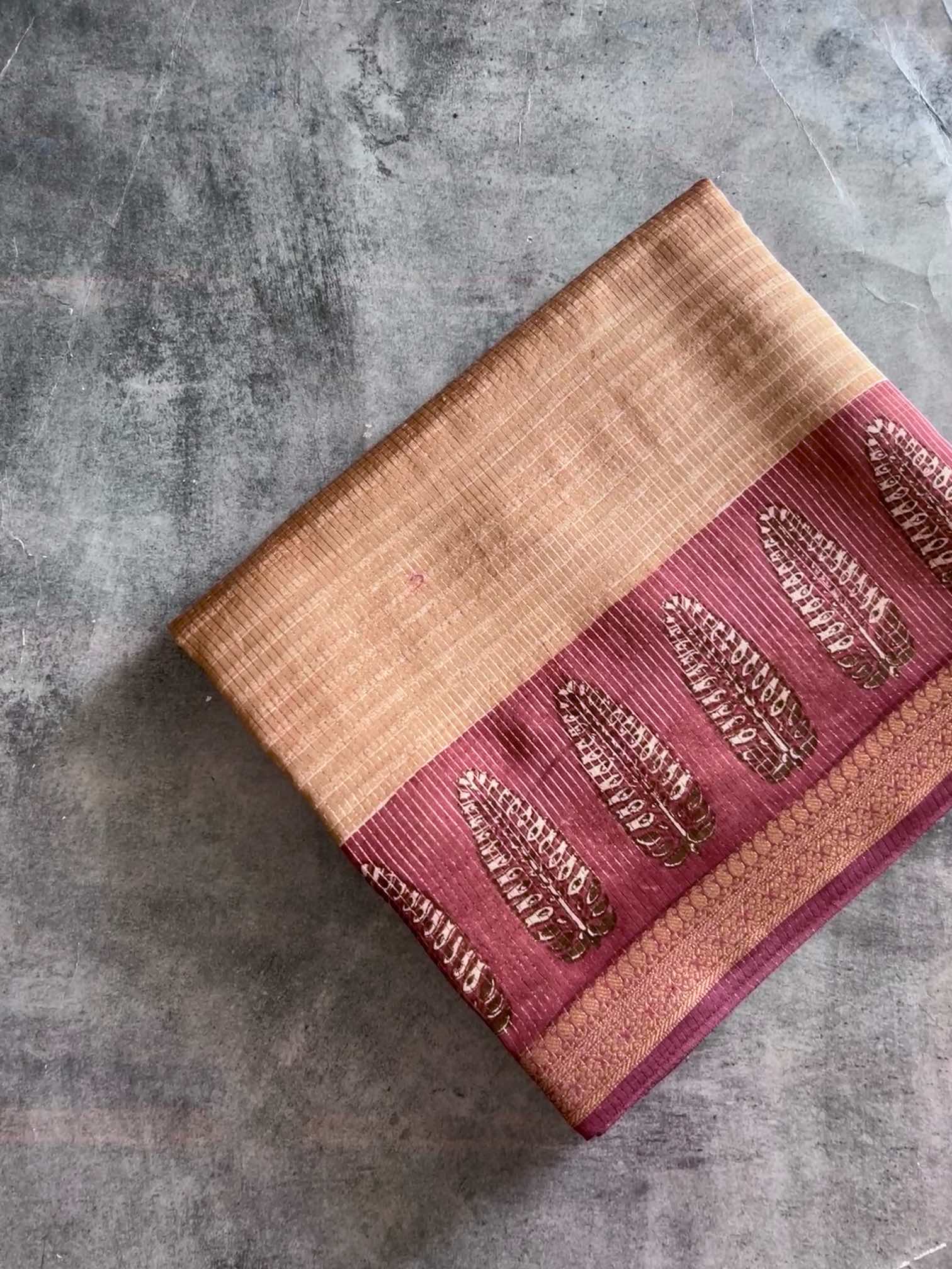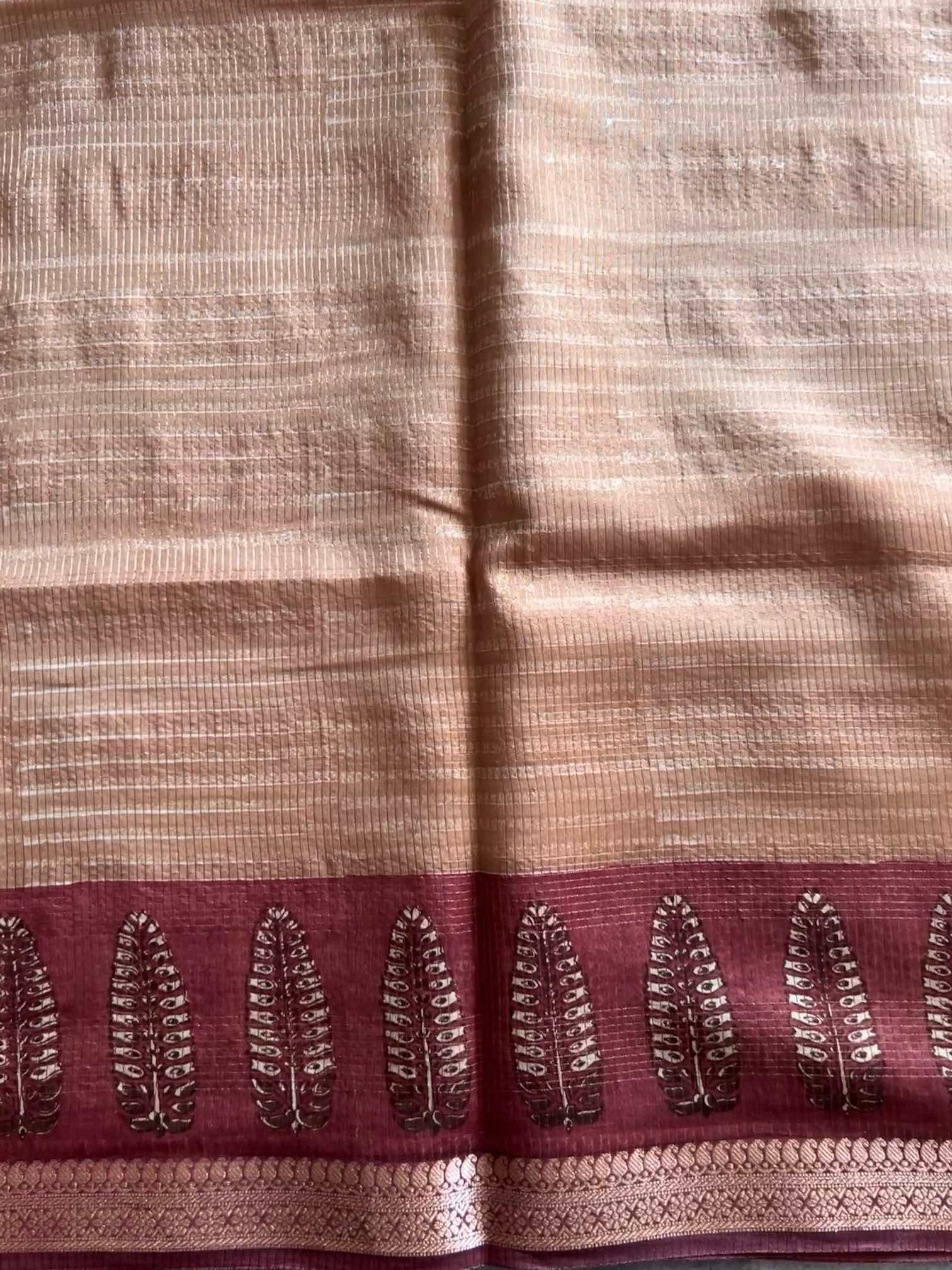 Elegant Chanderi fancy saree featuring all-over stripes and prints, highlighted with a rich zari border and graceful zari pallu. Paired with a plain blouse, it offers a perfect blend of tradition and contemporary charm.
