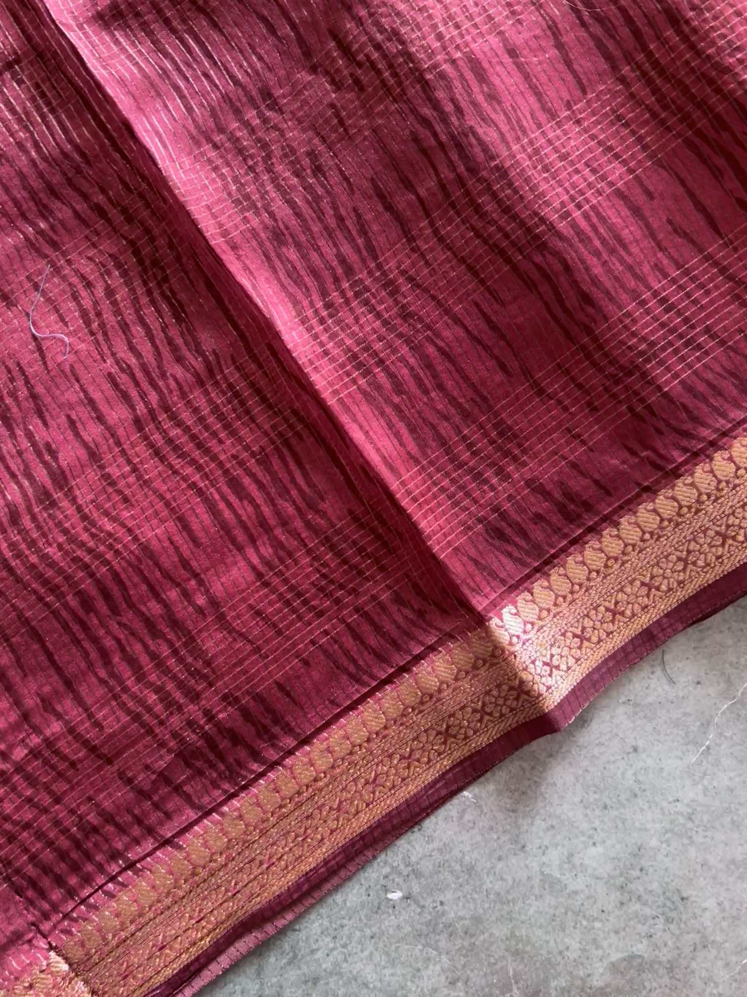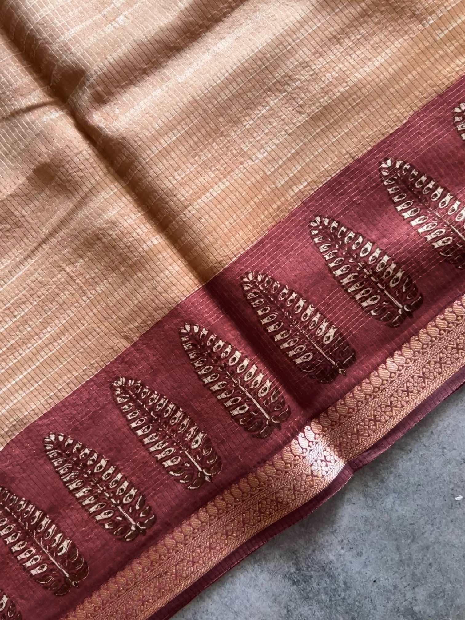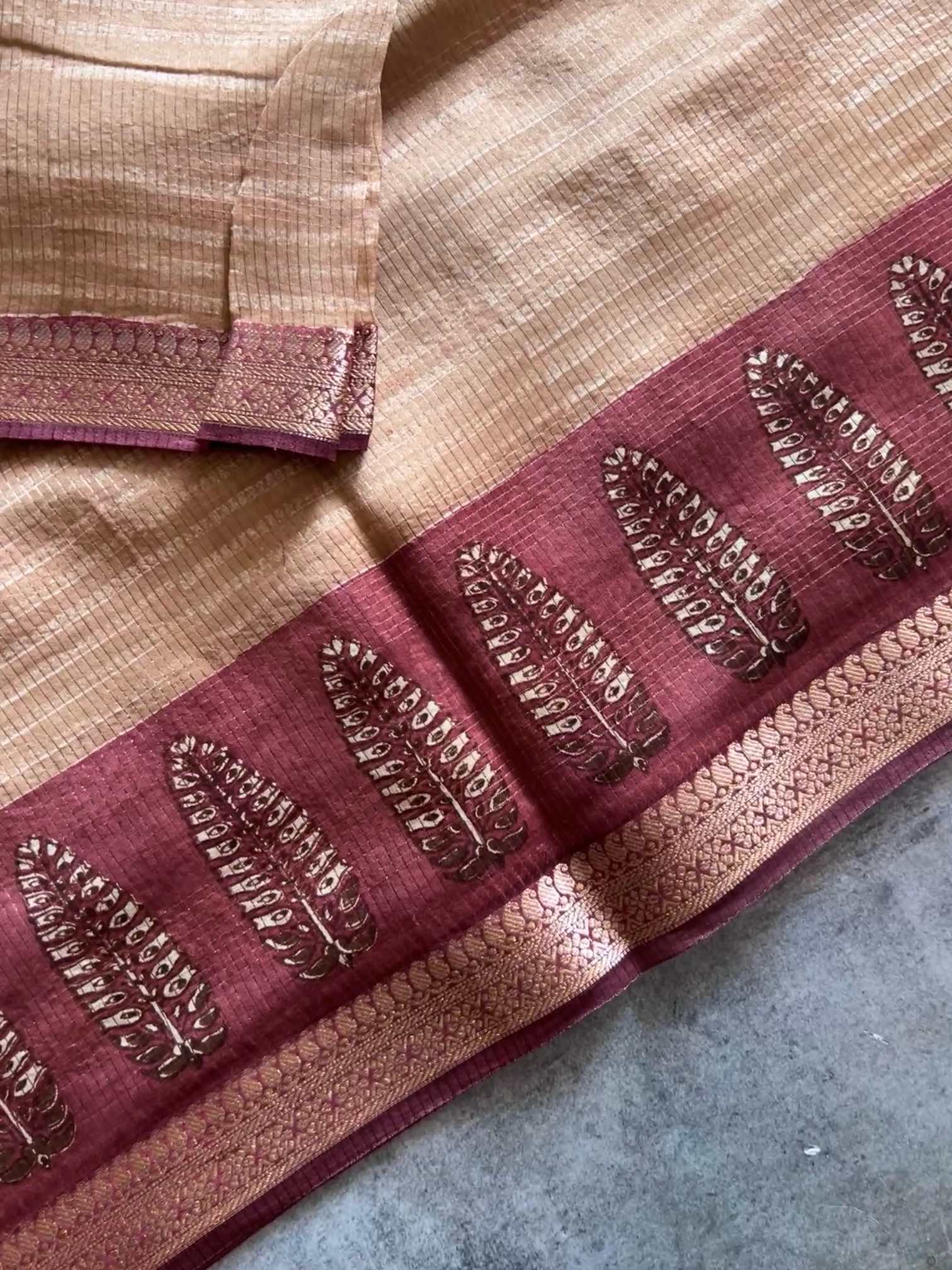 Elegant Chanderi fancy saree featuring all-over stripes and prints, highlighted with a rich zari border and graceful zari pallu. Paired with a plain blouse, it offers a perfect blend of tradition and contemporary charm.