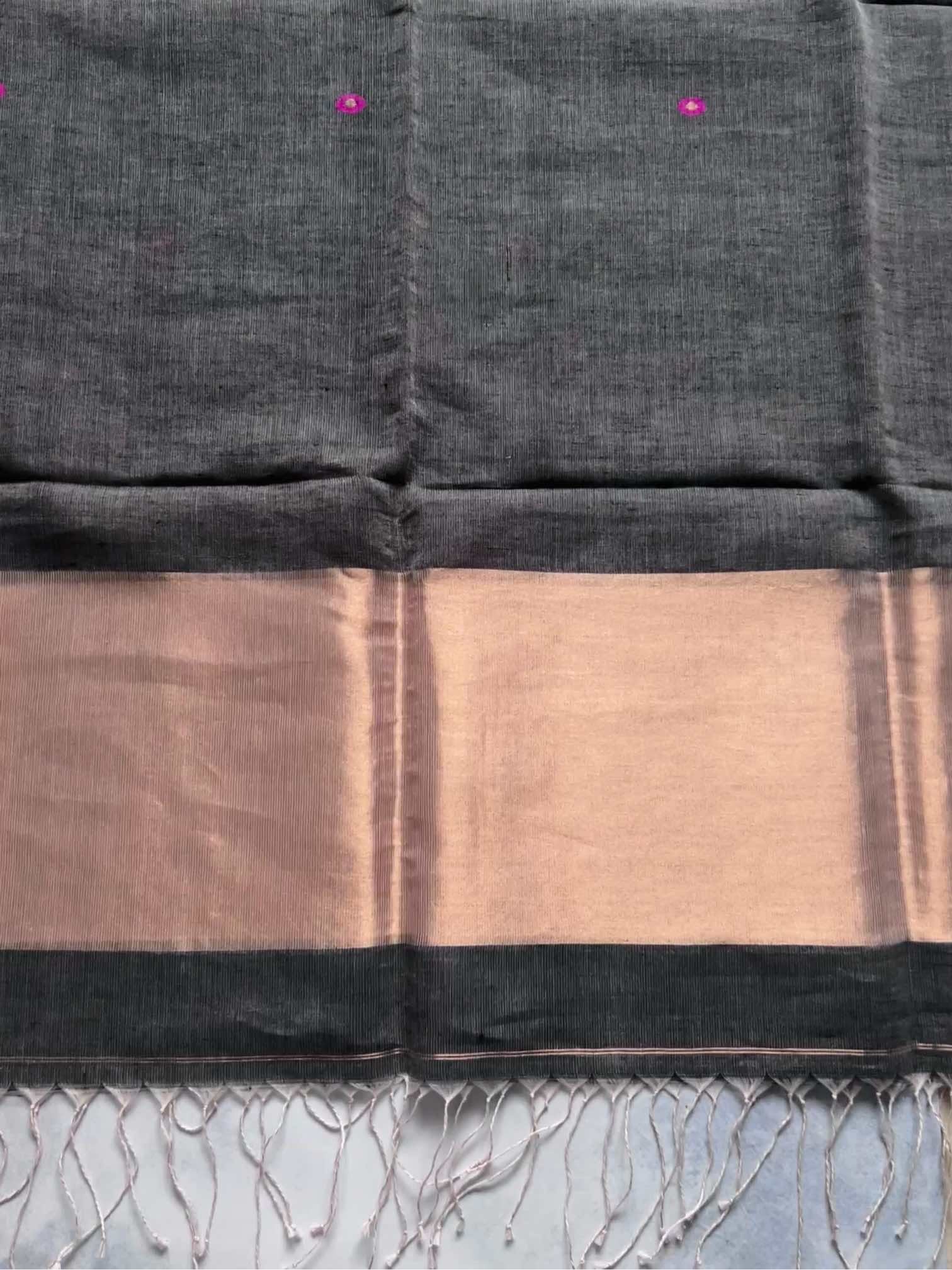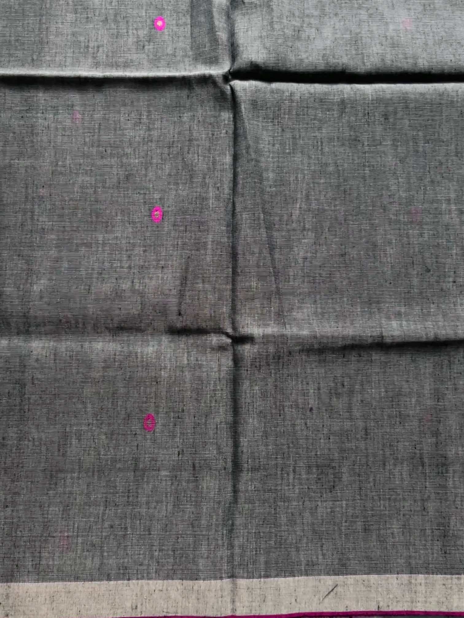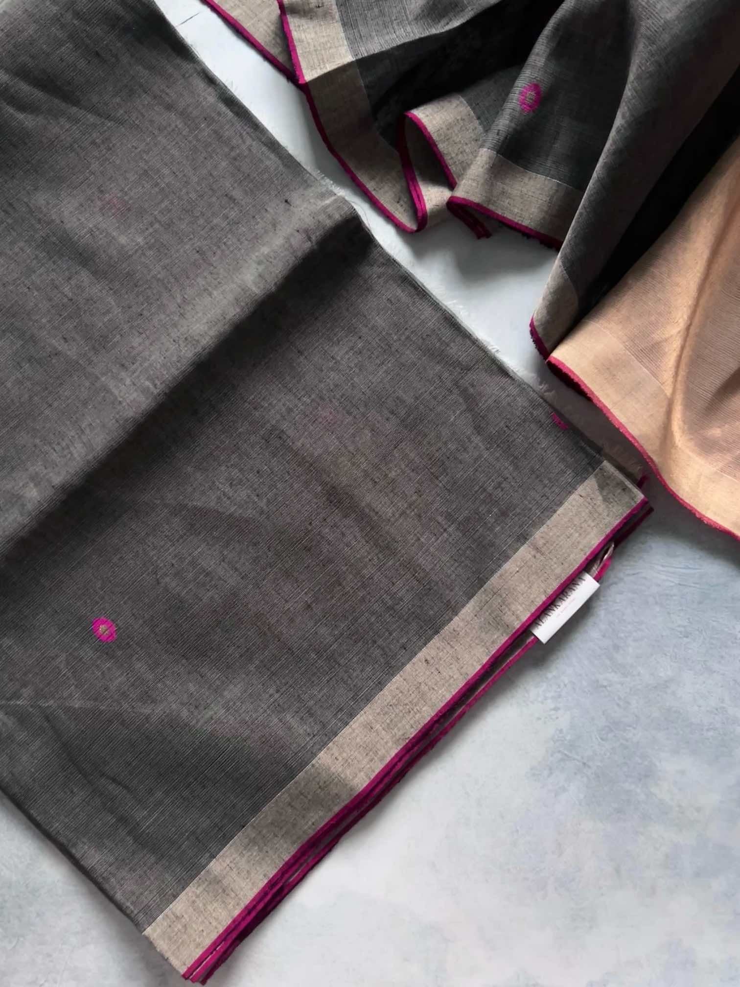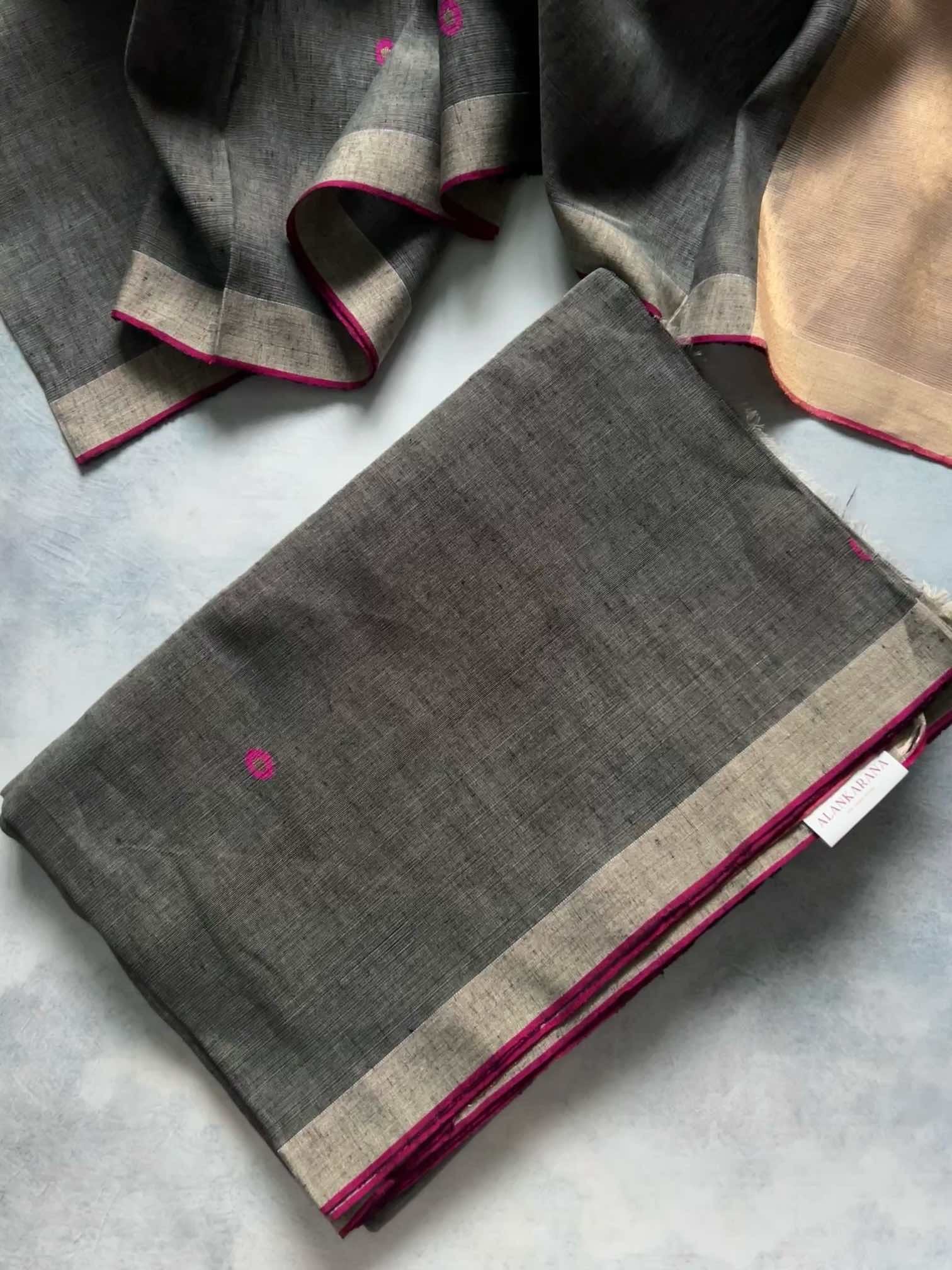 A handwoven 2 piece linen salwar set adorned with shimmering zari borders and delicate thread buttas—where understated elegance meets artisanal charm.