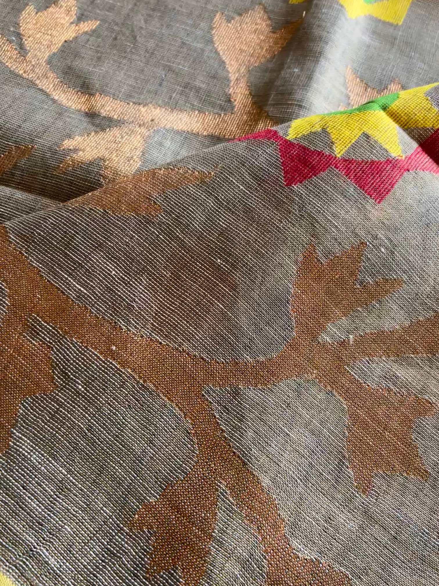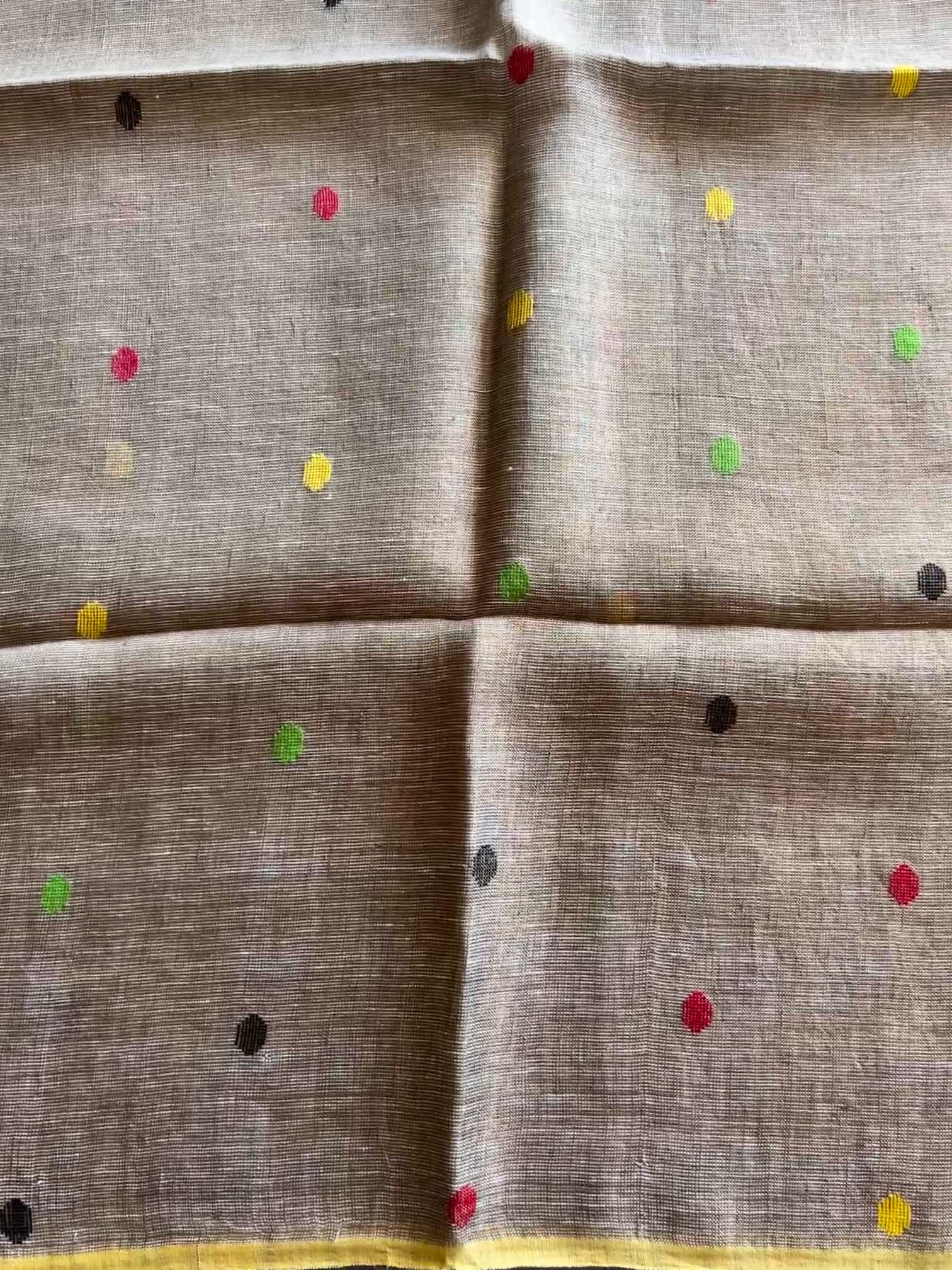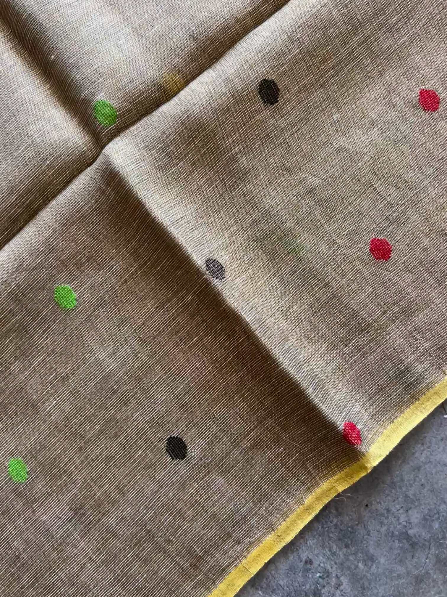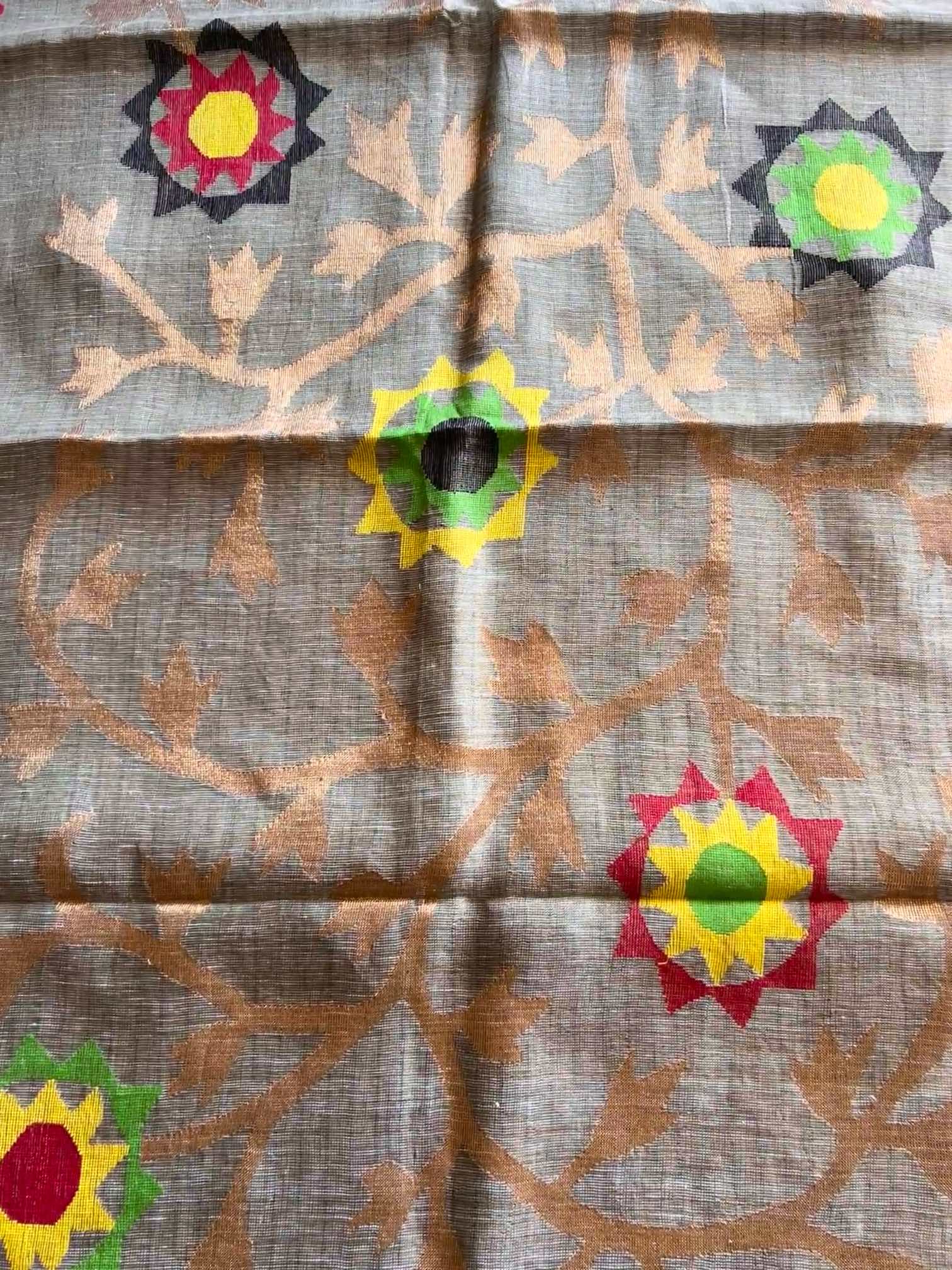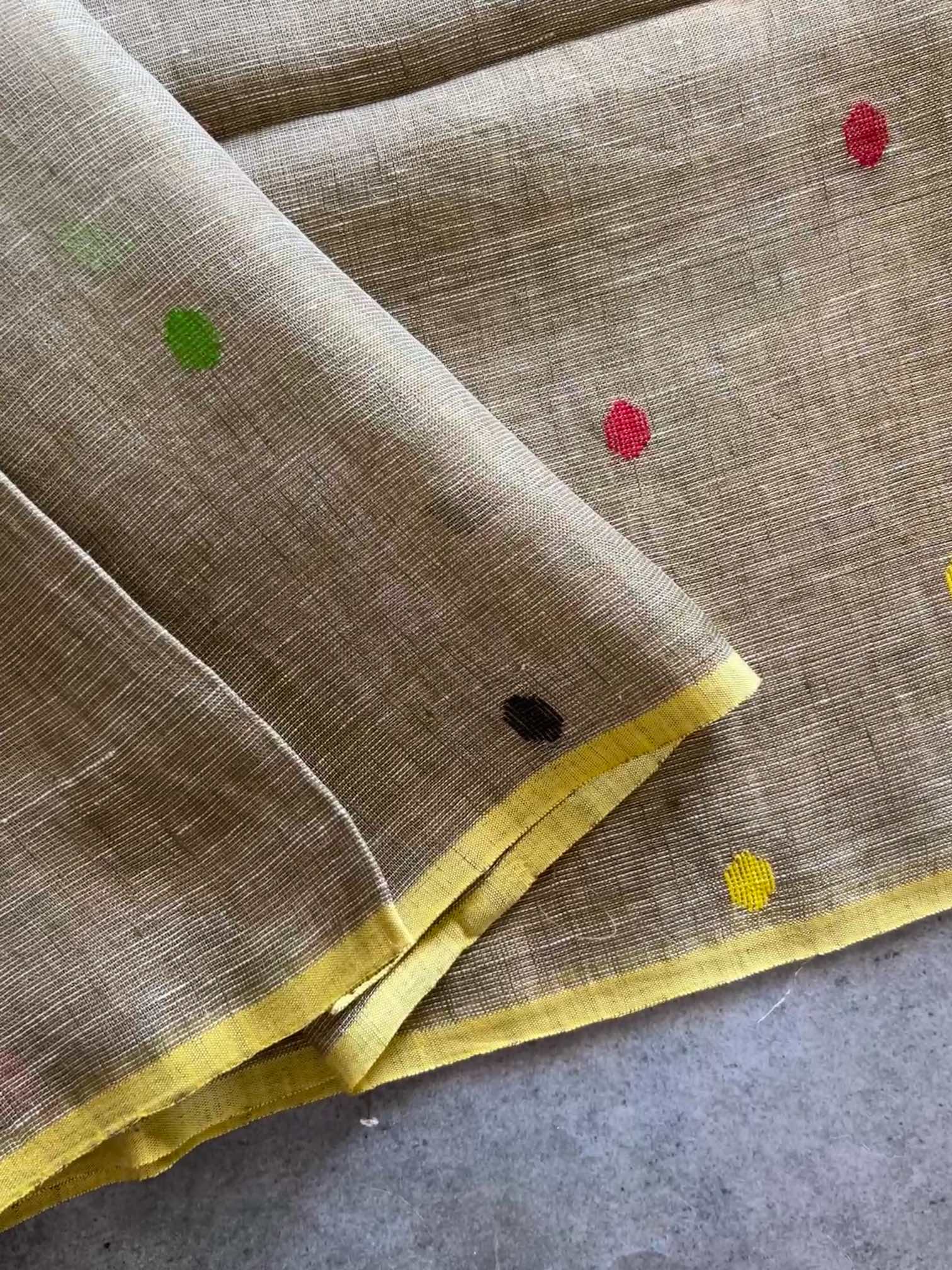 Pure linen silk adorned with Jamdhani weave is a true embodiment of elegance and tradition. The floral motifs delicately woven into the body lend a timeless charm, showcasing the artistry of handloom craftsmanship.Together, the blend of airy linen silk and intricate Jamdhani floral designs creates a piece that's both luxurious and effortlessly graceful.