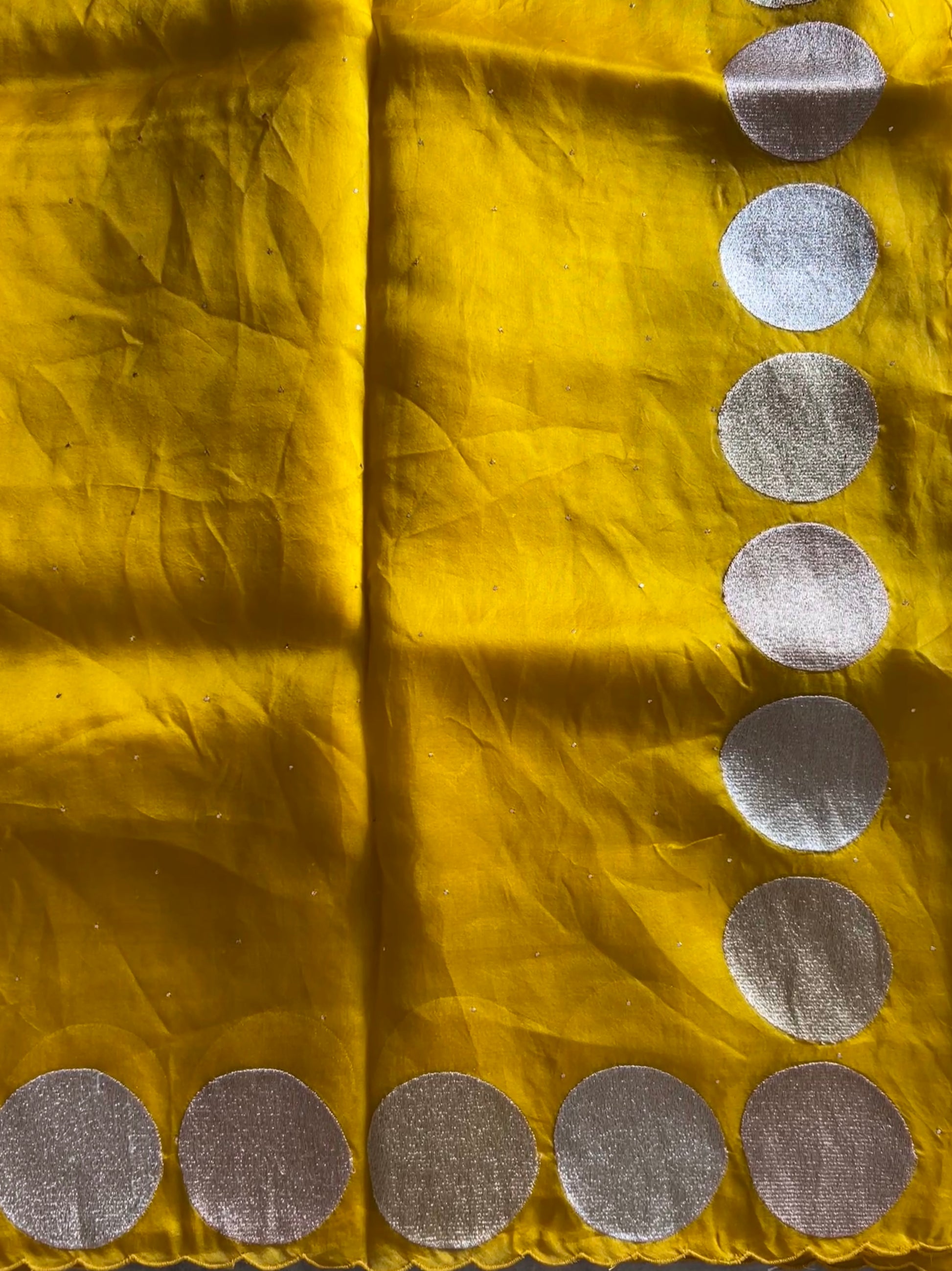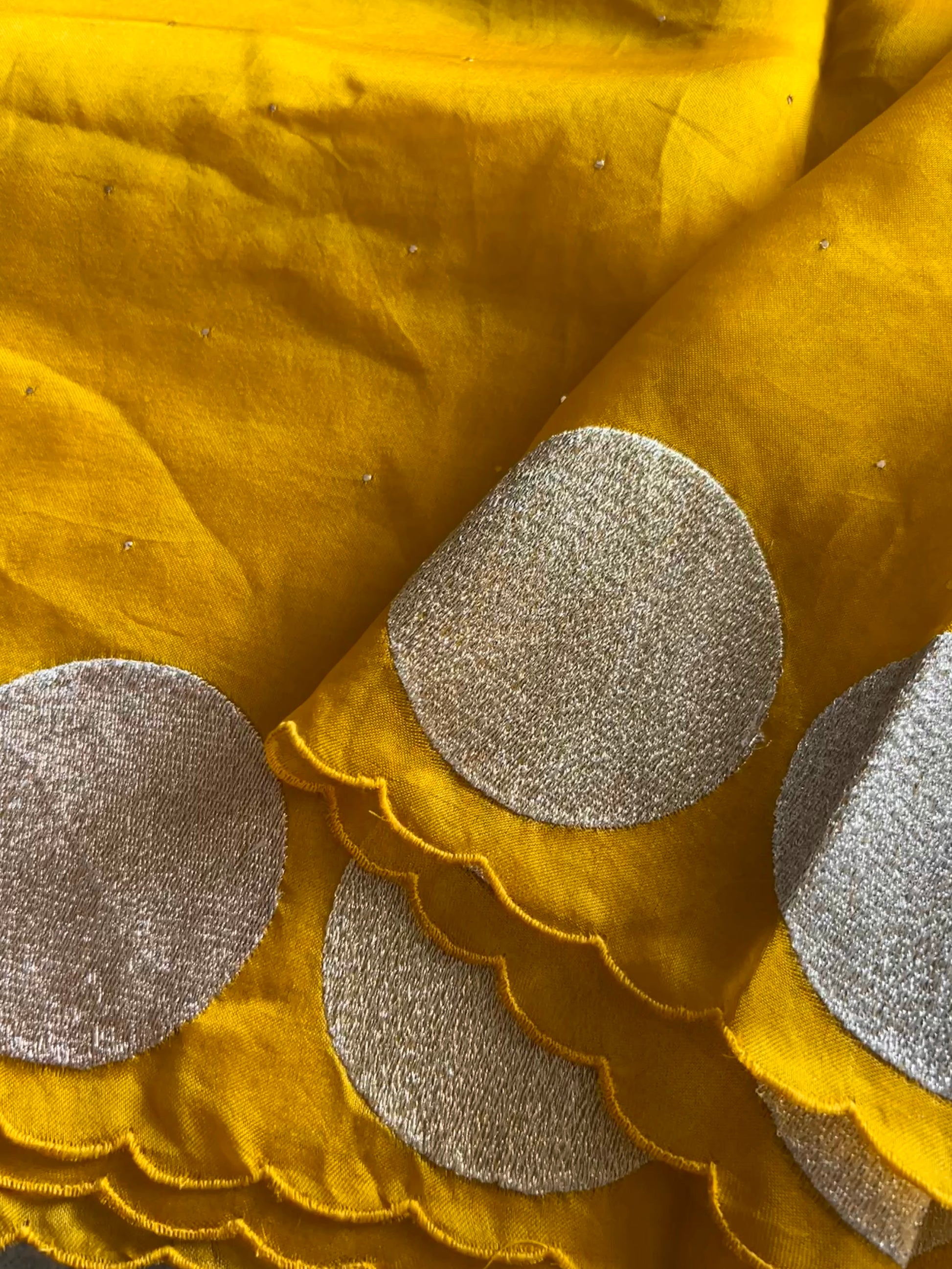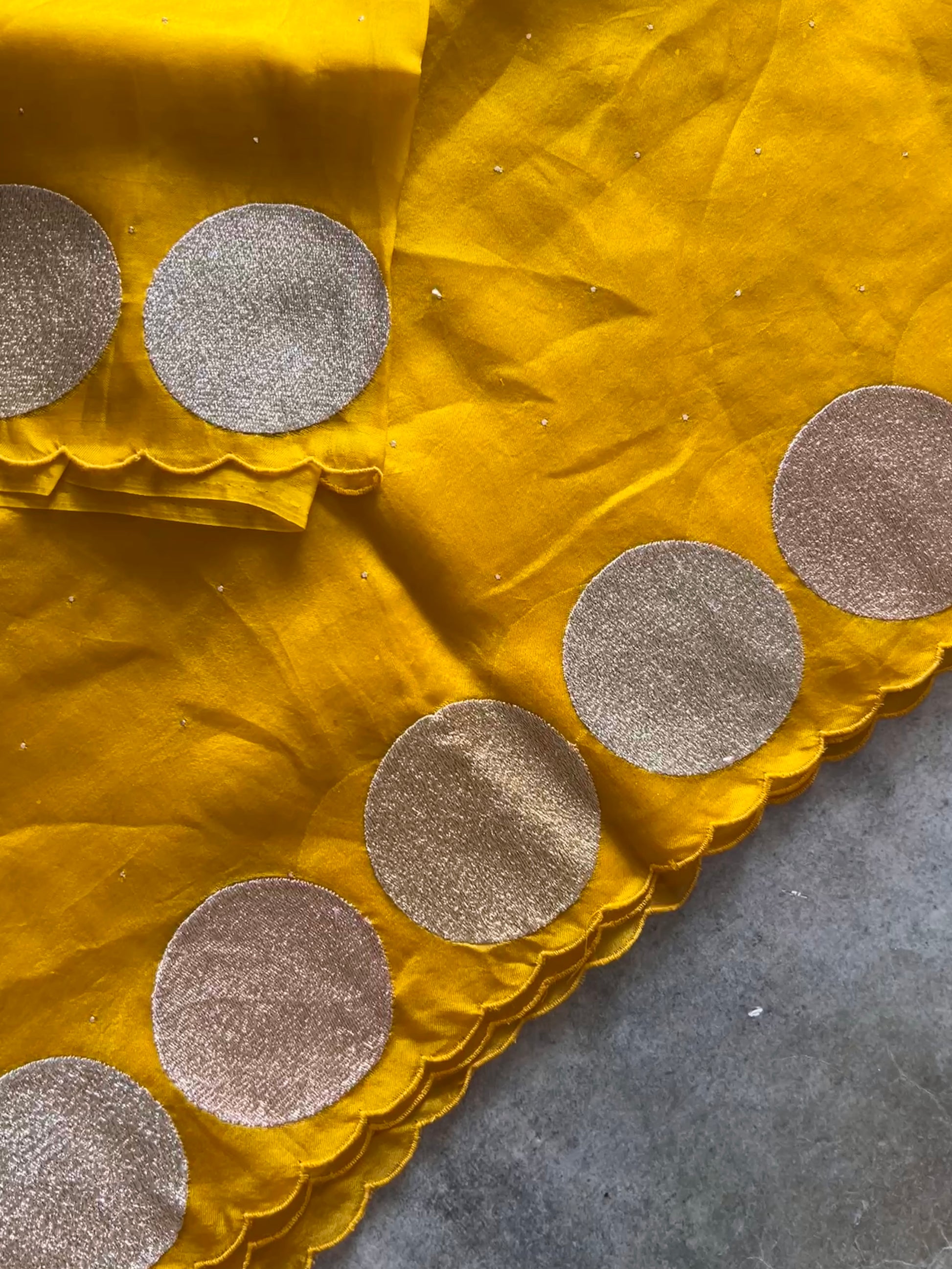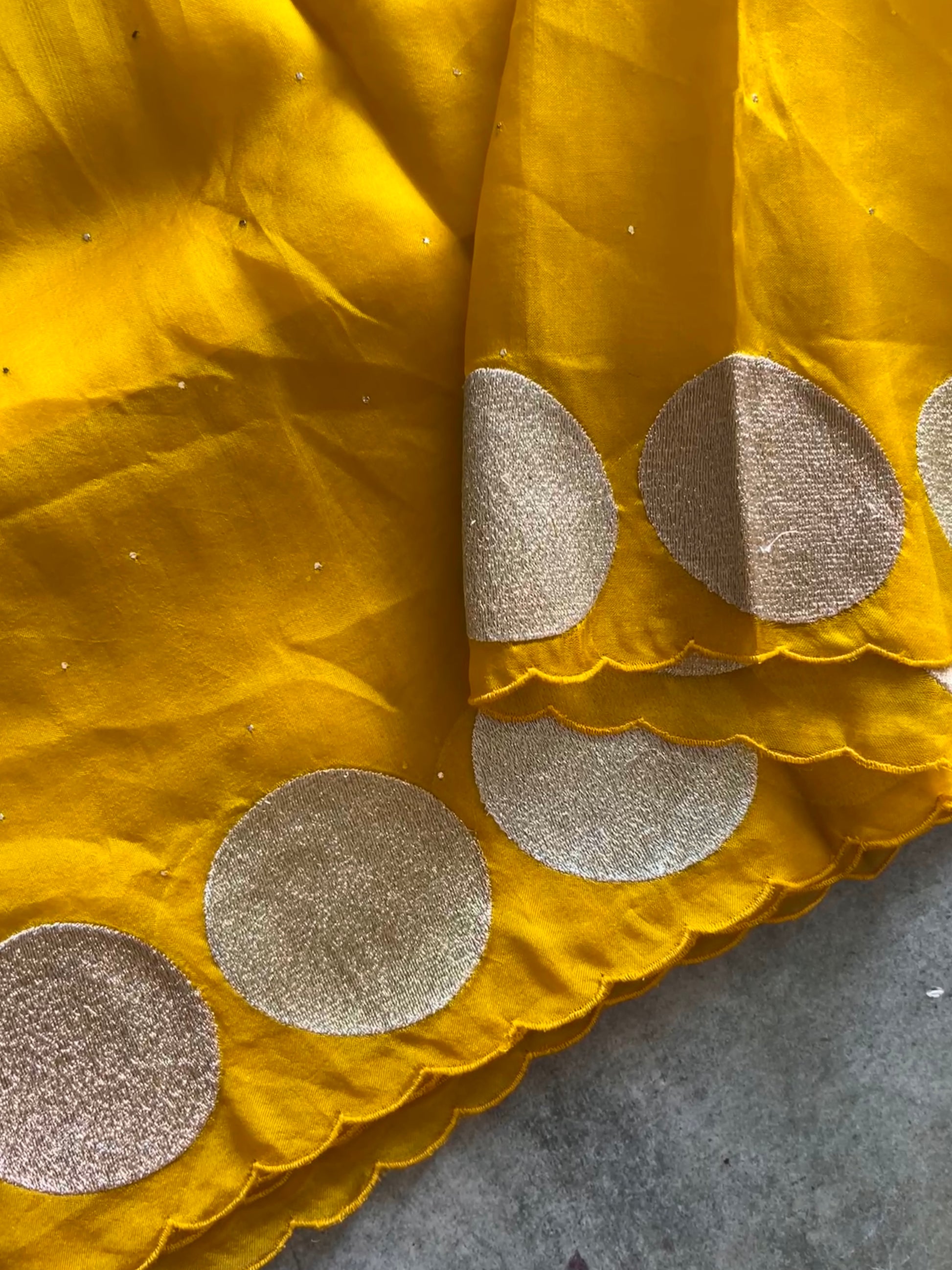 The sheer, lightweight texture of organza lends a graceful flow, while the intricate circle zari designs shimmer with timeless opulence. The subtle shimmer of Mukesh work adds a delicate sparkle to the sheer elegance of organza. The scalloped edging adds a delicate, handcrafted charm, perfectly balancing sophistication with subtle glamour. It’s a fabric that captures light beautifully, making every drape look ethereal and regal.