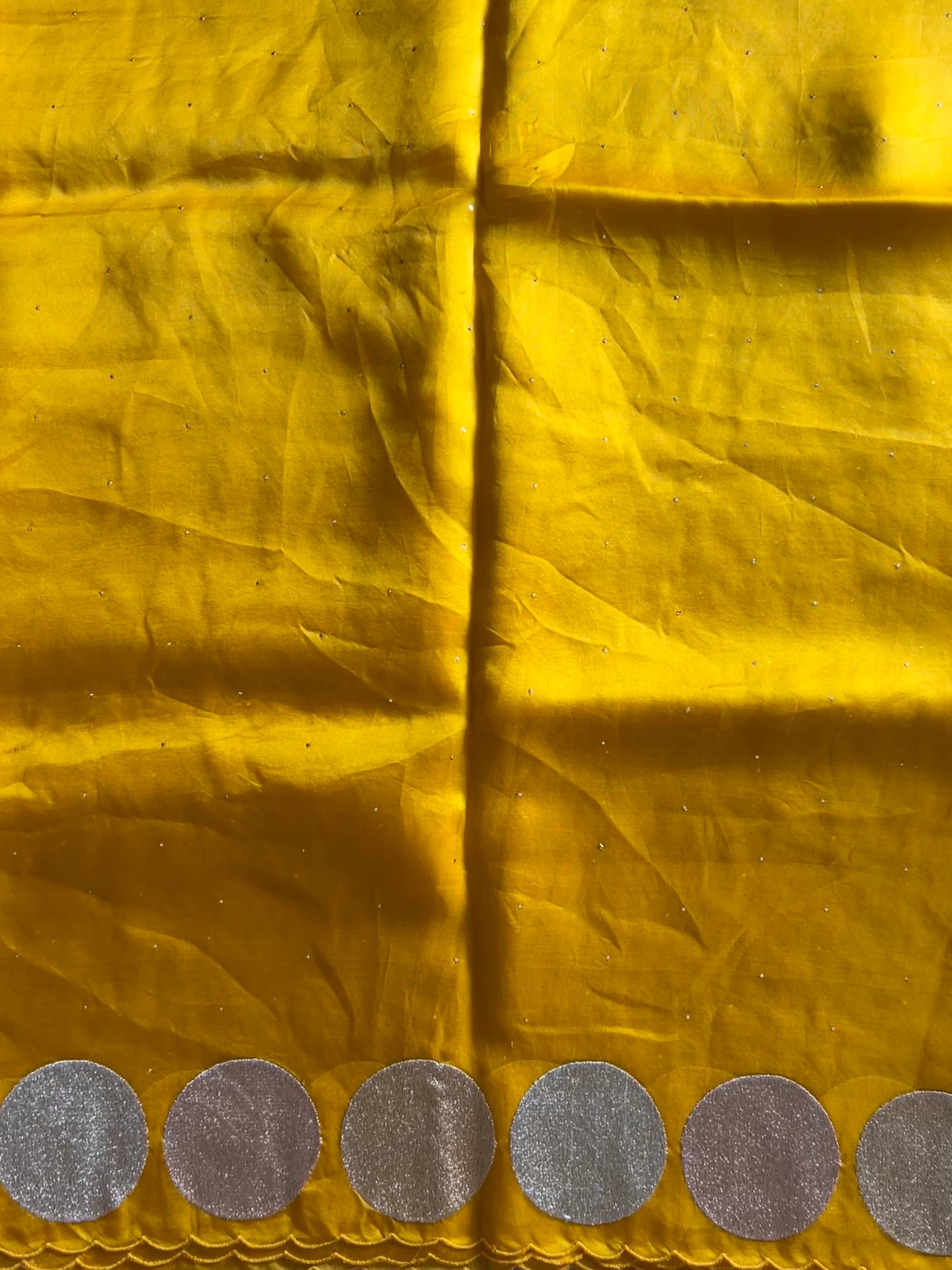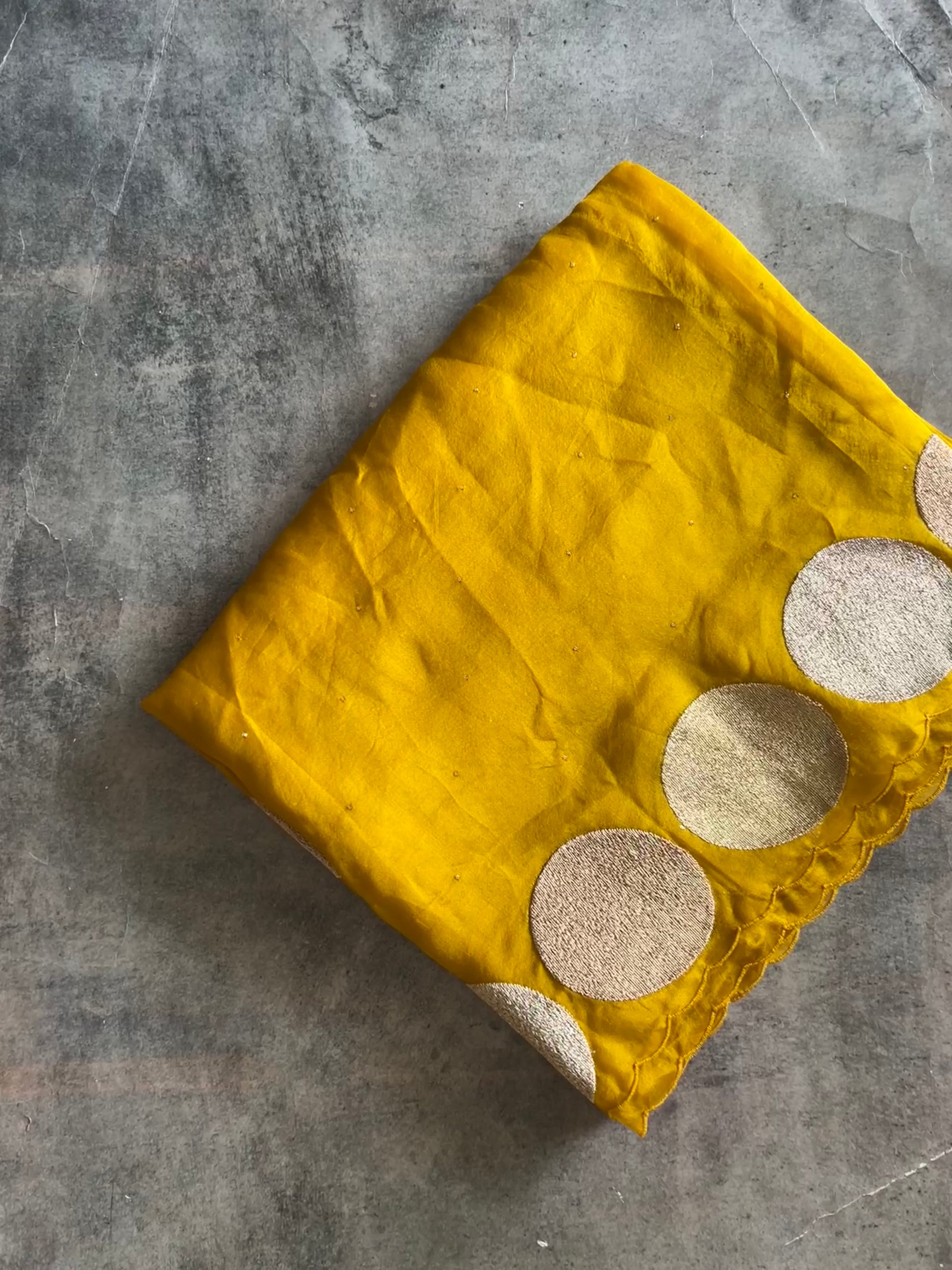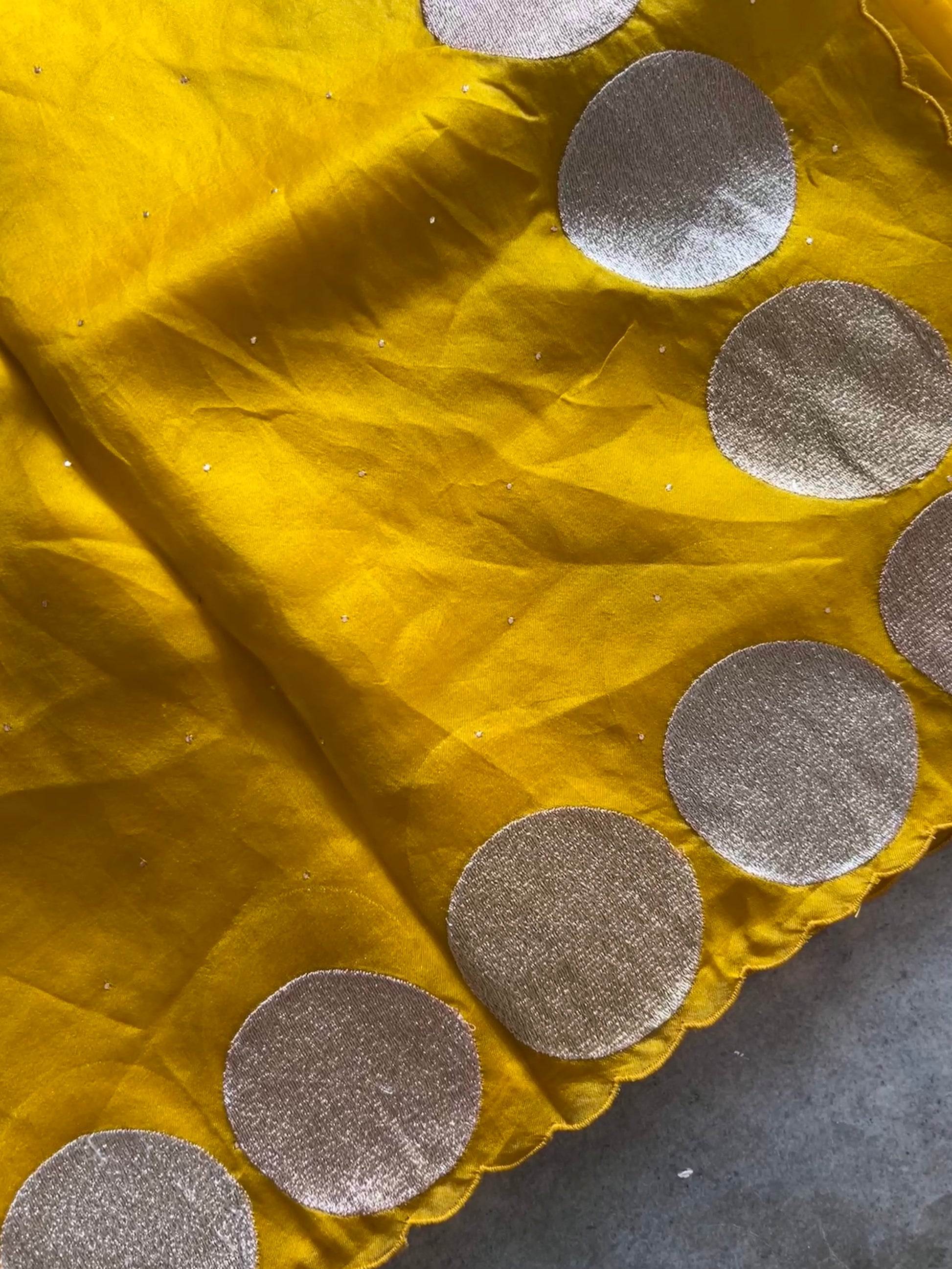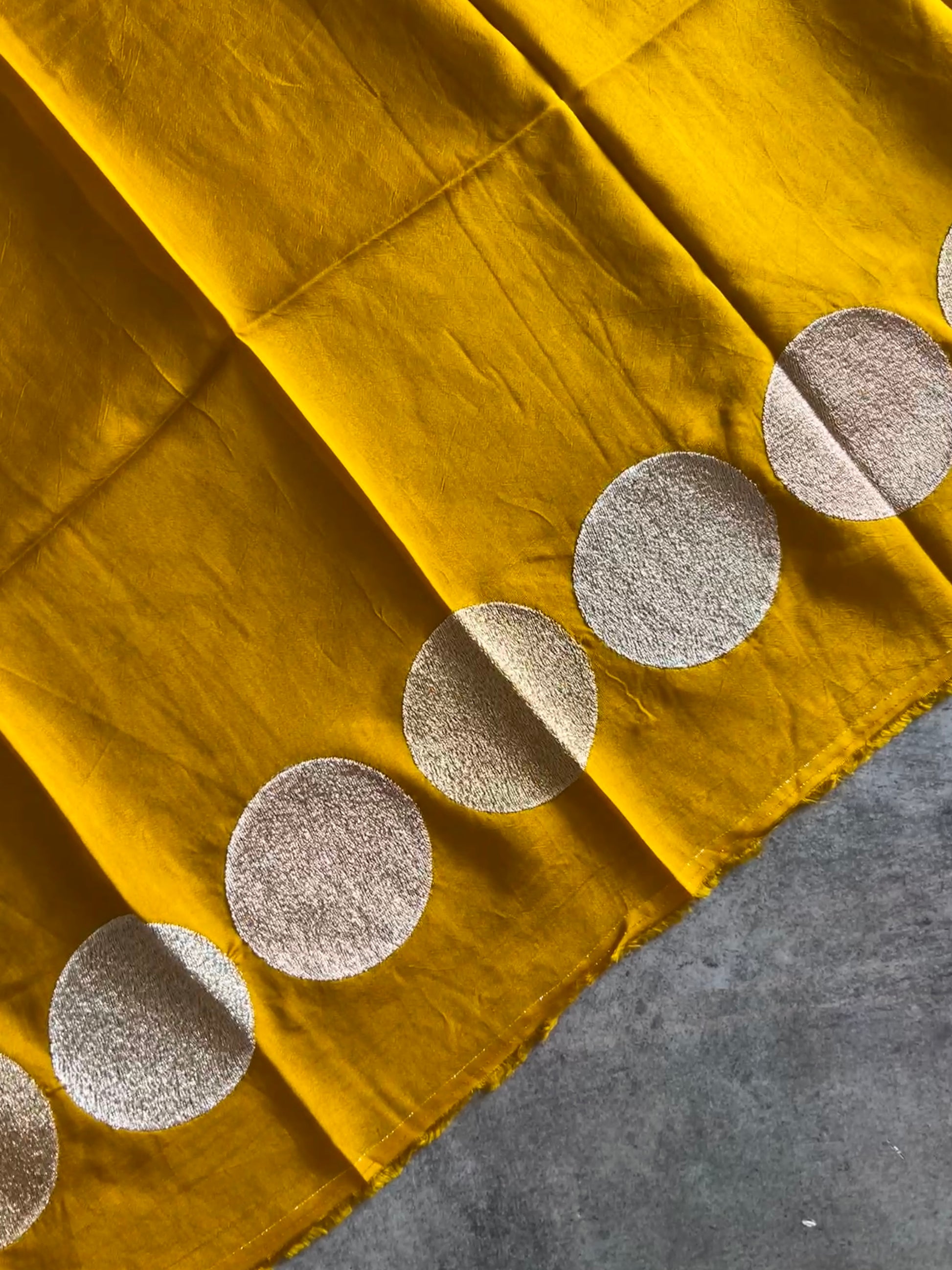 The sheer, lightweight texture of organza lends a graceful flow, while the intricate circle zari designs shimmer with timeless opulence. The subtle shimmer of Mukesh work adds a delicate sparkle to the sheer elegance of organza. The scalloped edging adds a delicate, handcrafted charm, perfectly balancing sophistication with subtle glamour. It’s a fabric that captures light beautifully, making every drape look ethereal and regal.