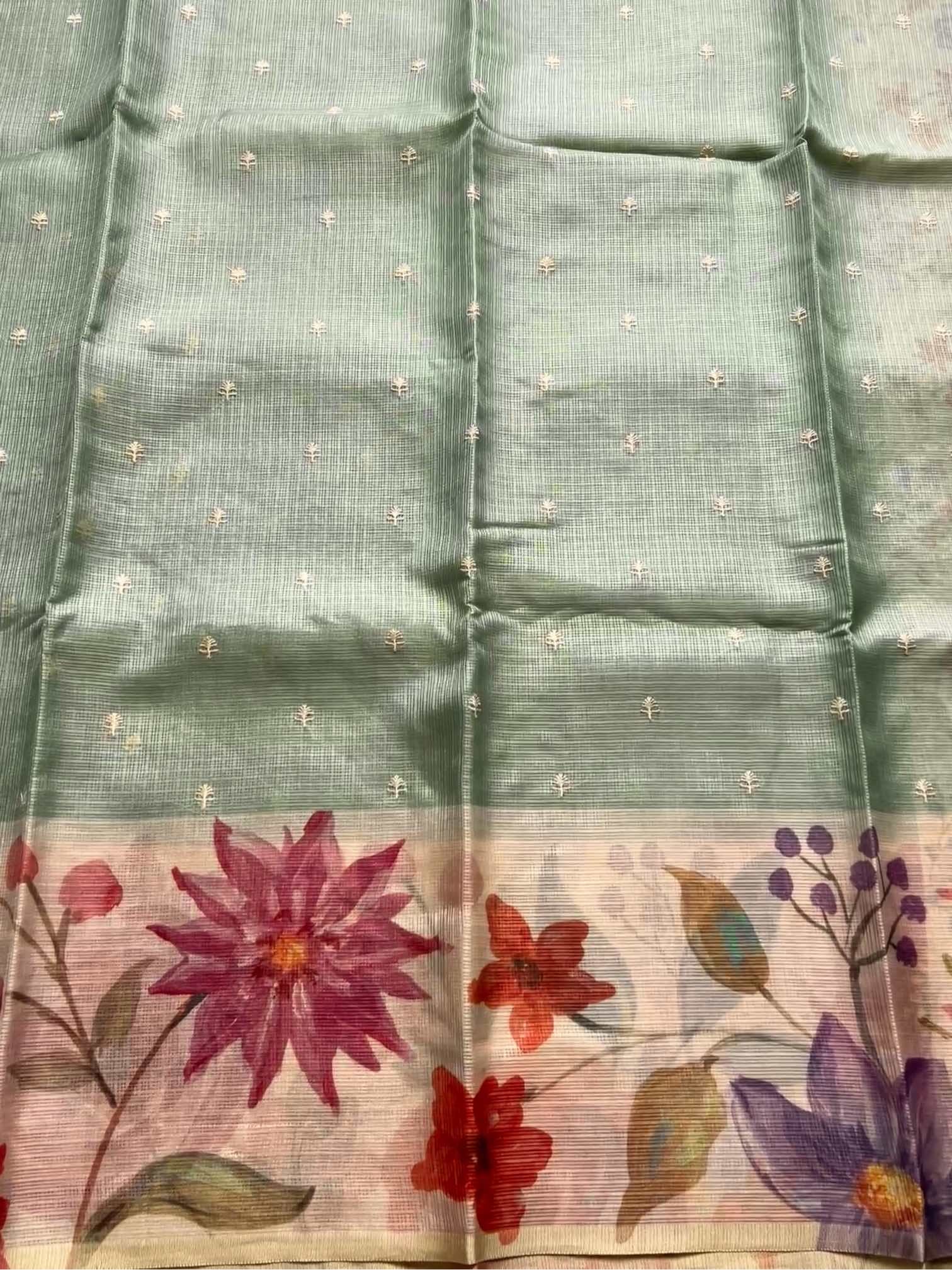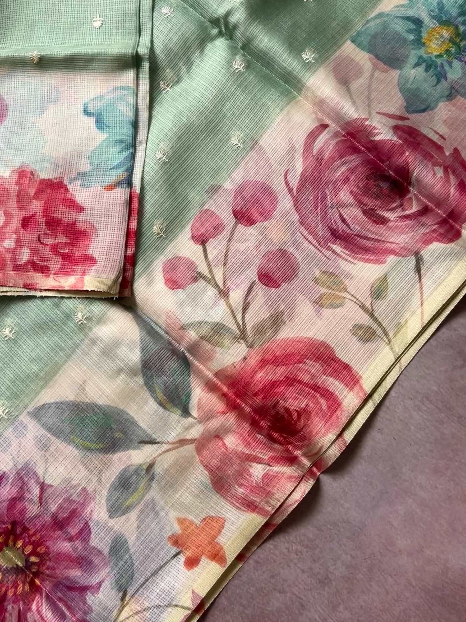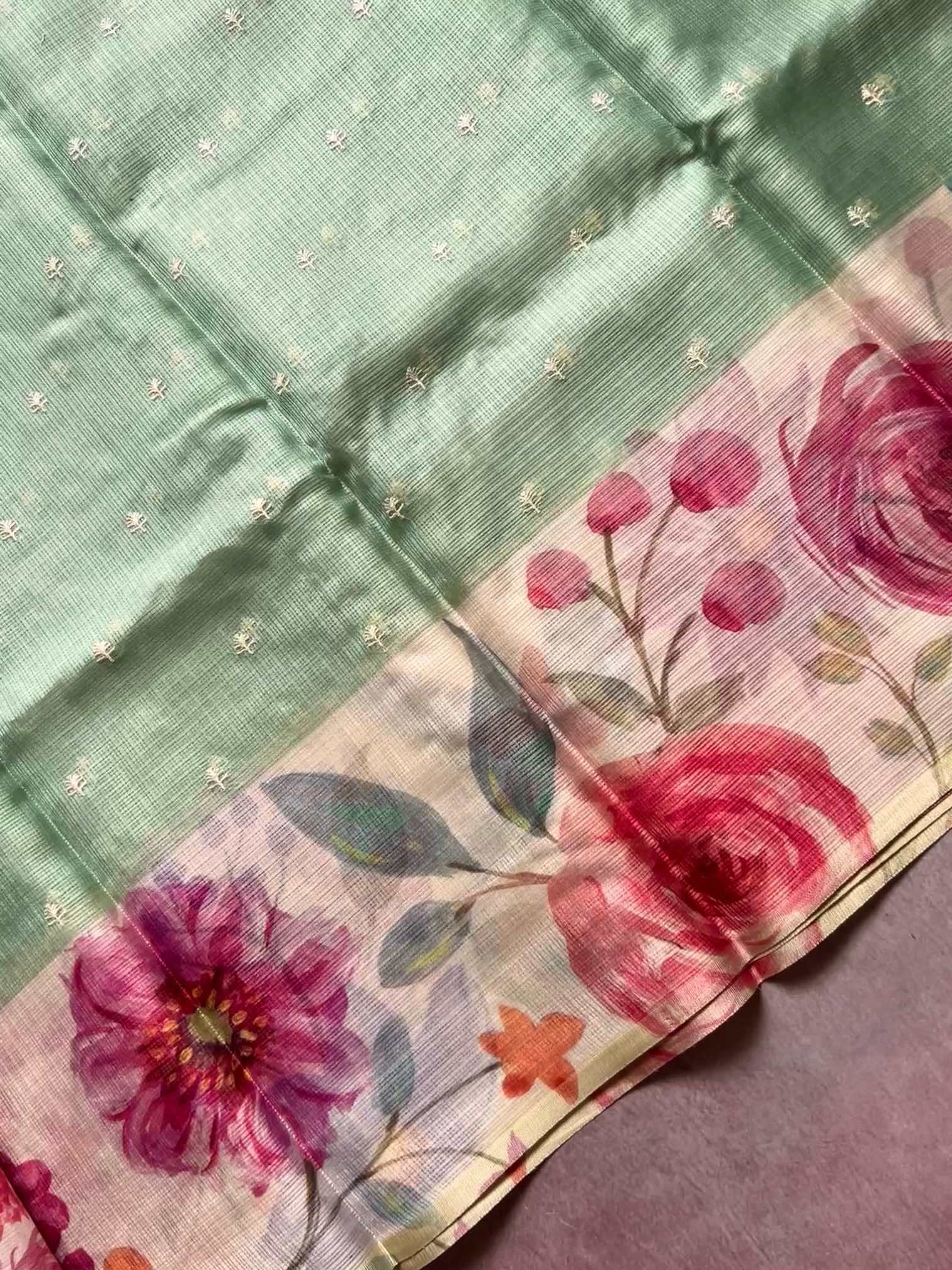 Printed Kota sarees with lace work borders exude a unique blend of simplicity and elegance. The airy, translucent texture of Kota fabric, combined with vibrant prints, creates a refreshing and graceful look. The delicate lace border adds a touch of sophistication, beautifully framing the saree with subtle charm.