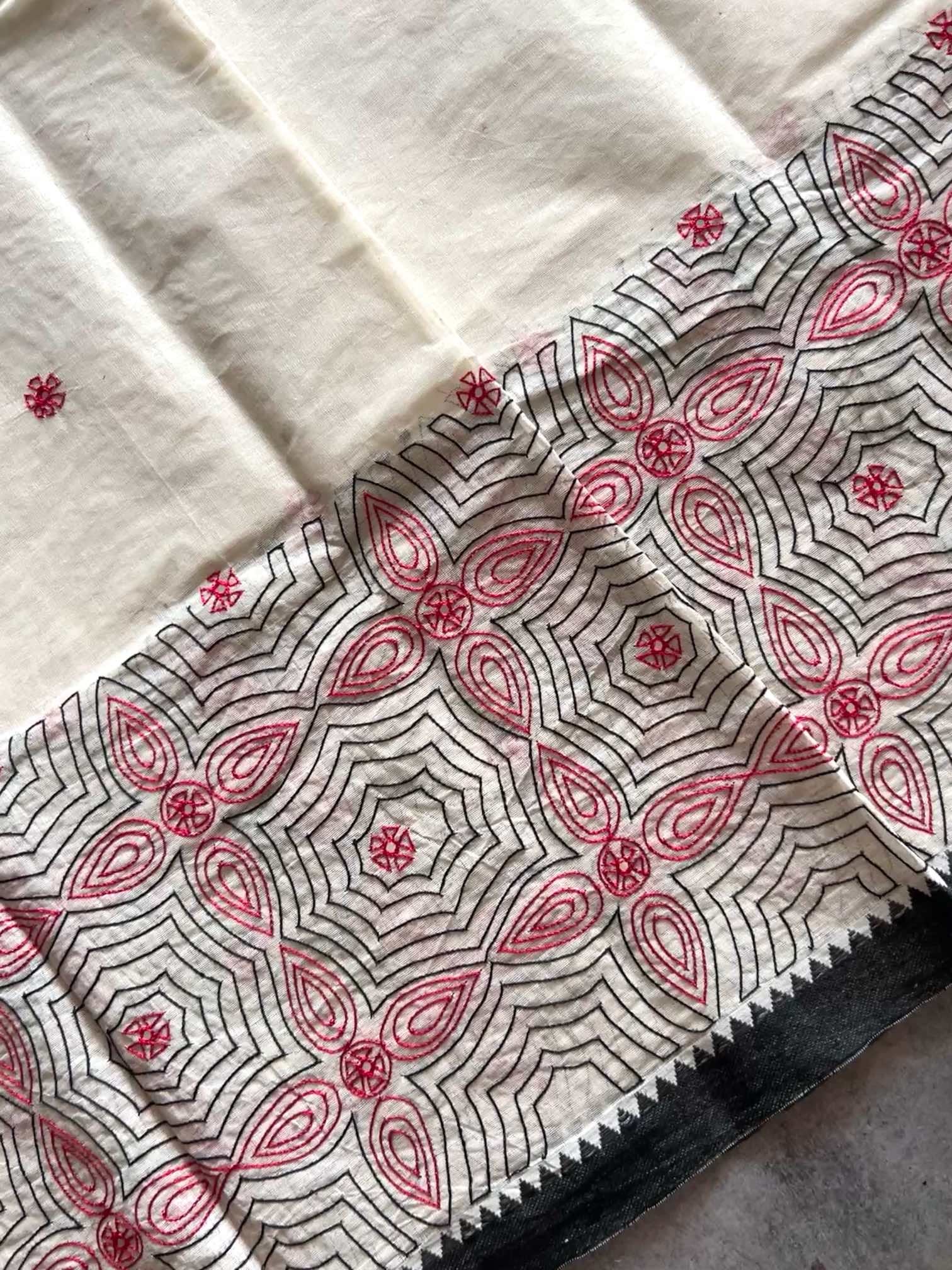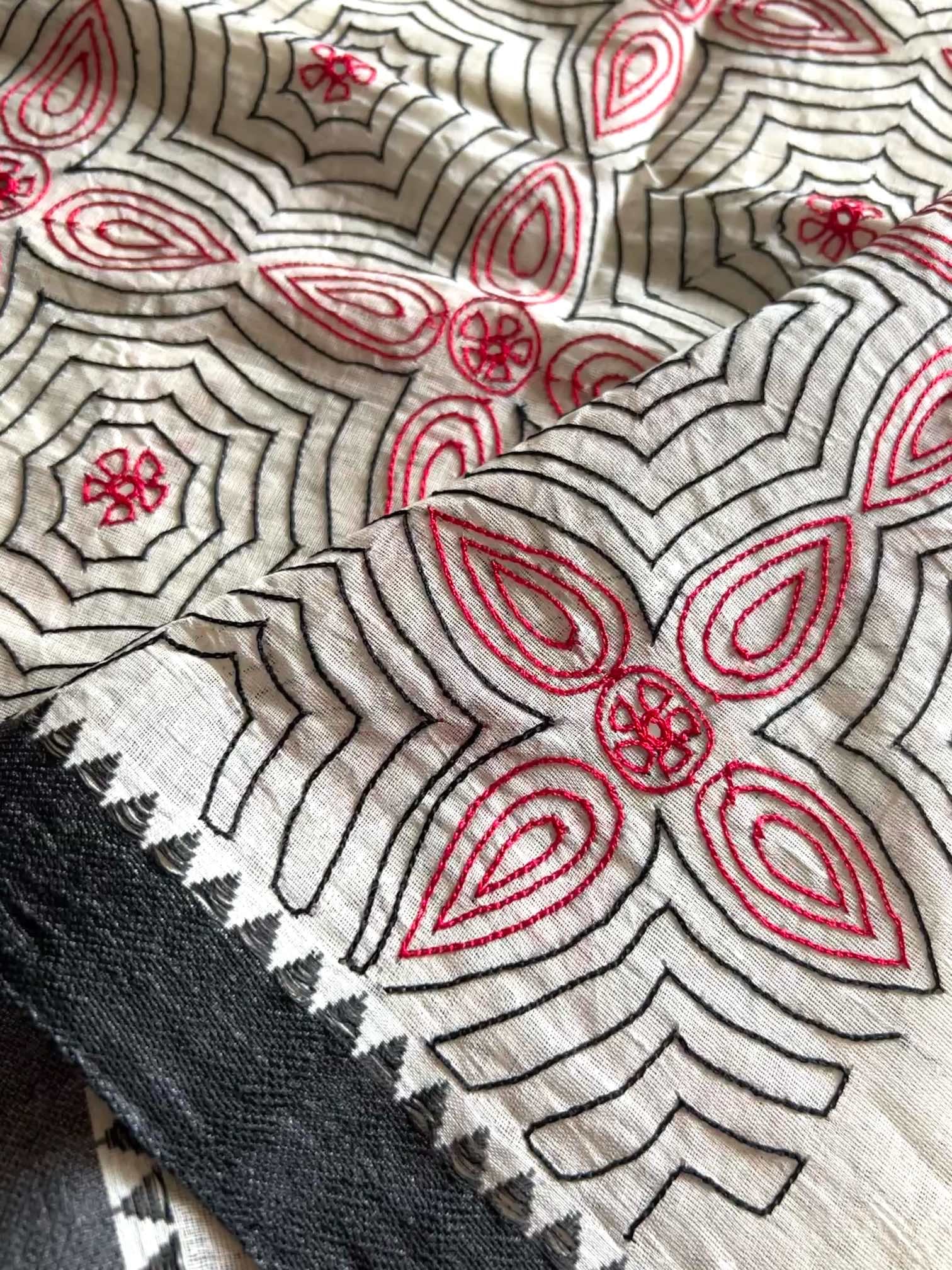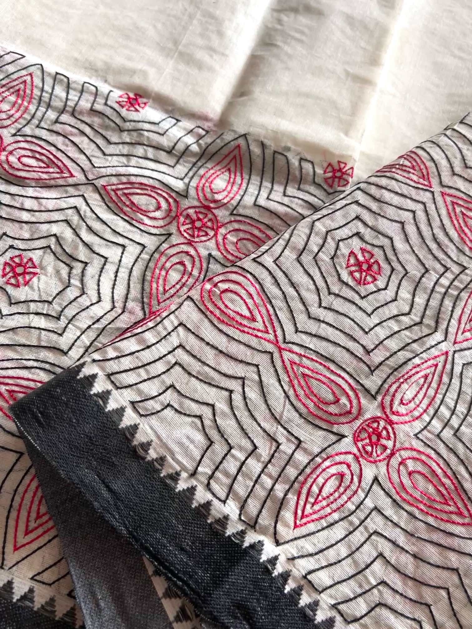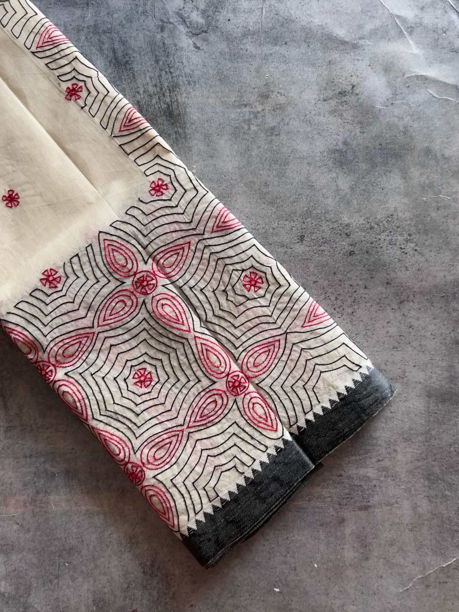 The softness of cotton combined with intricate, delicate hand-embroidered patterns adds an elegant charm that is both lightweight and graceful. The mirror work, often shimmering against vibrant threads, brings an additional layer of texture and sparkle, catching the light with every movement. This blend of comfort and artistry makes cotton sarees a versatile choice for any occasion, from festive celebrations to casual gatherings.