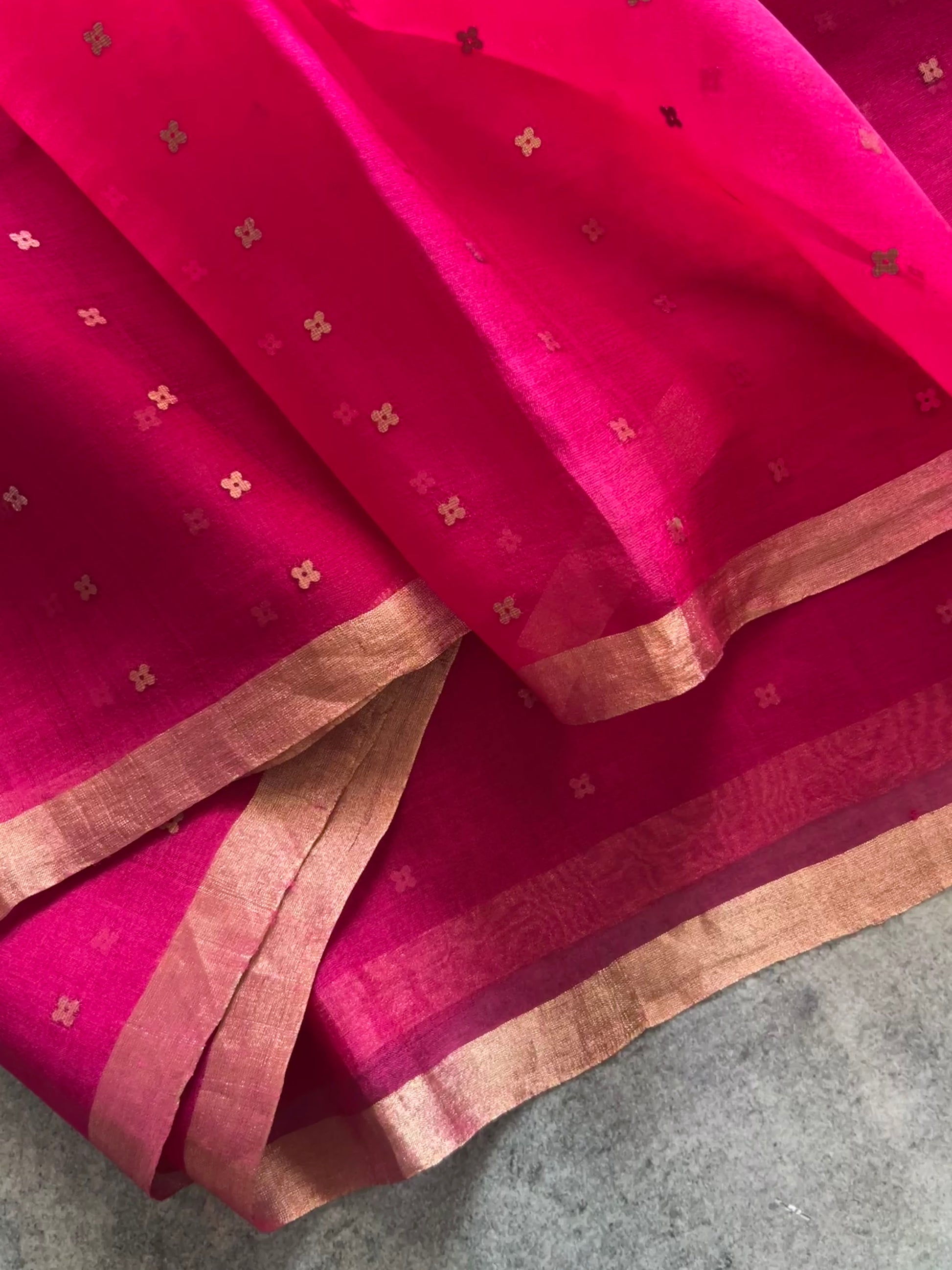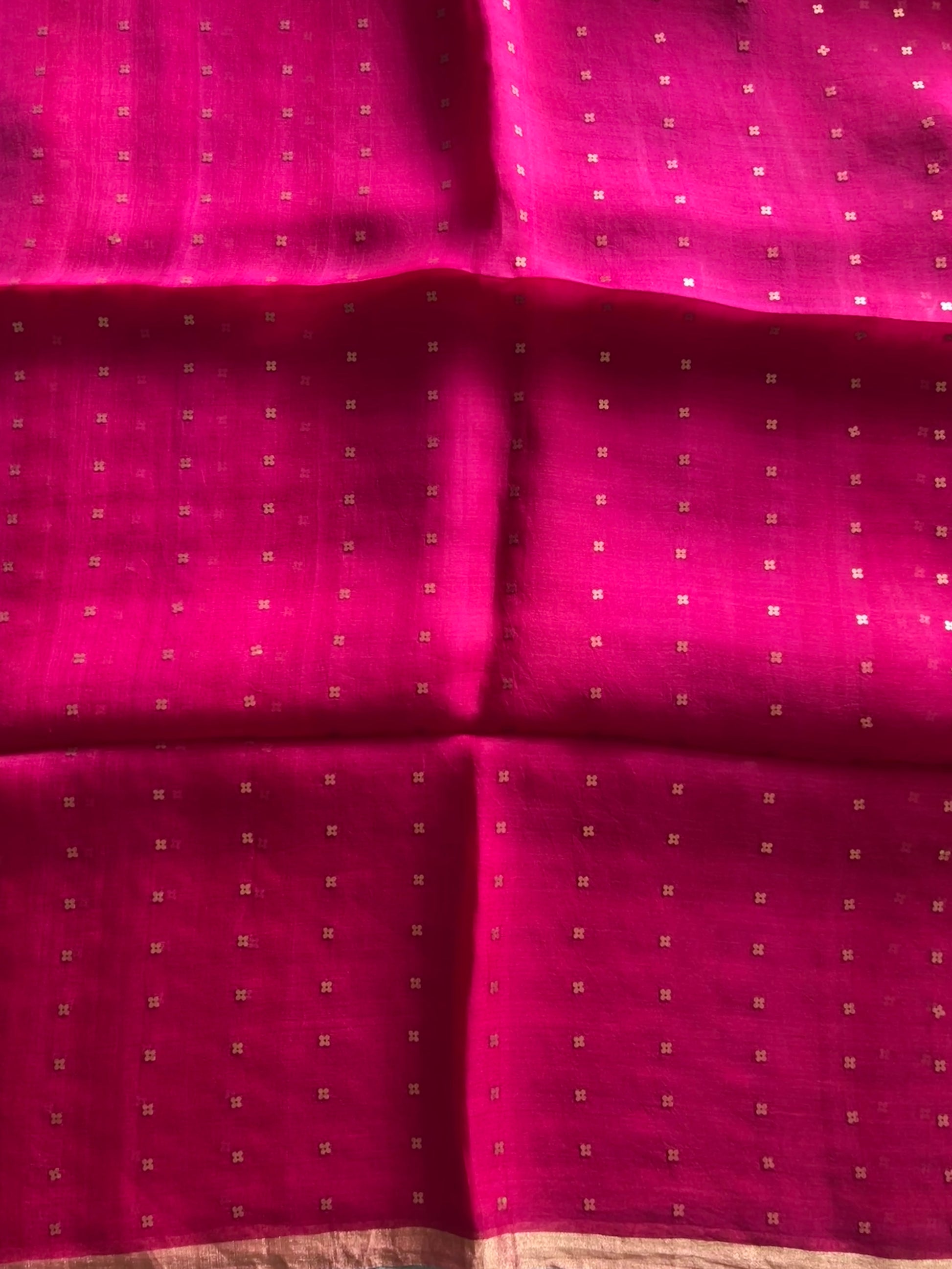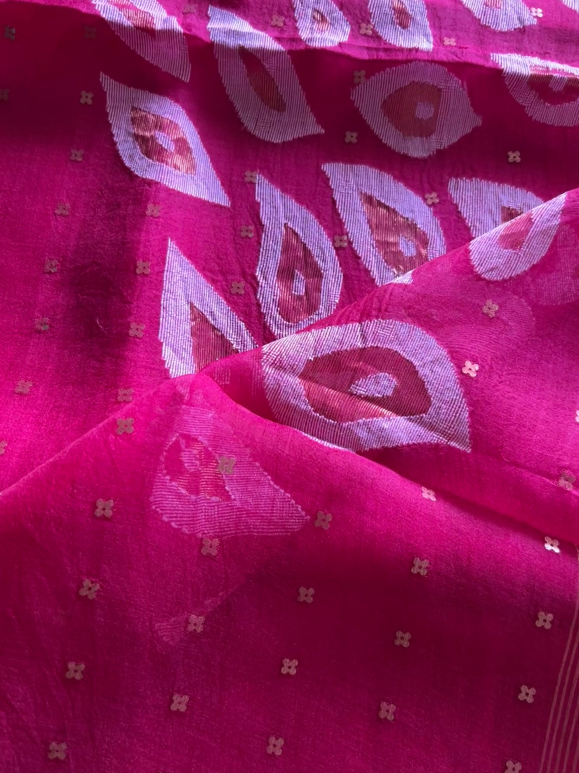 The delicate sheen of the Muslin silk fabric, renowned for its softness and lightweight nature, drapes gracefully, enhancing the wearer's beauty. The sequence work adds a subtle yet mesmerizing sparkle, elevating the saree with a modern touch of glamour while maintaining its traditional essence. The Jamdani Pallu , handwoven with intricate patterns, brings an exquisite cultural richness to the saree. The combination of these elements creates a perfect balance between luxurious opulence and traditional artistry, making the saree a stunning choice for weddings, festivals, or any special occasion.