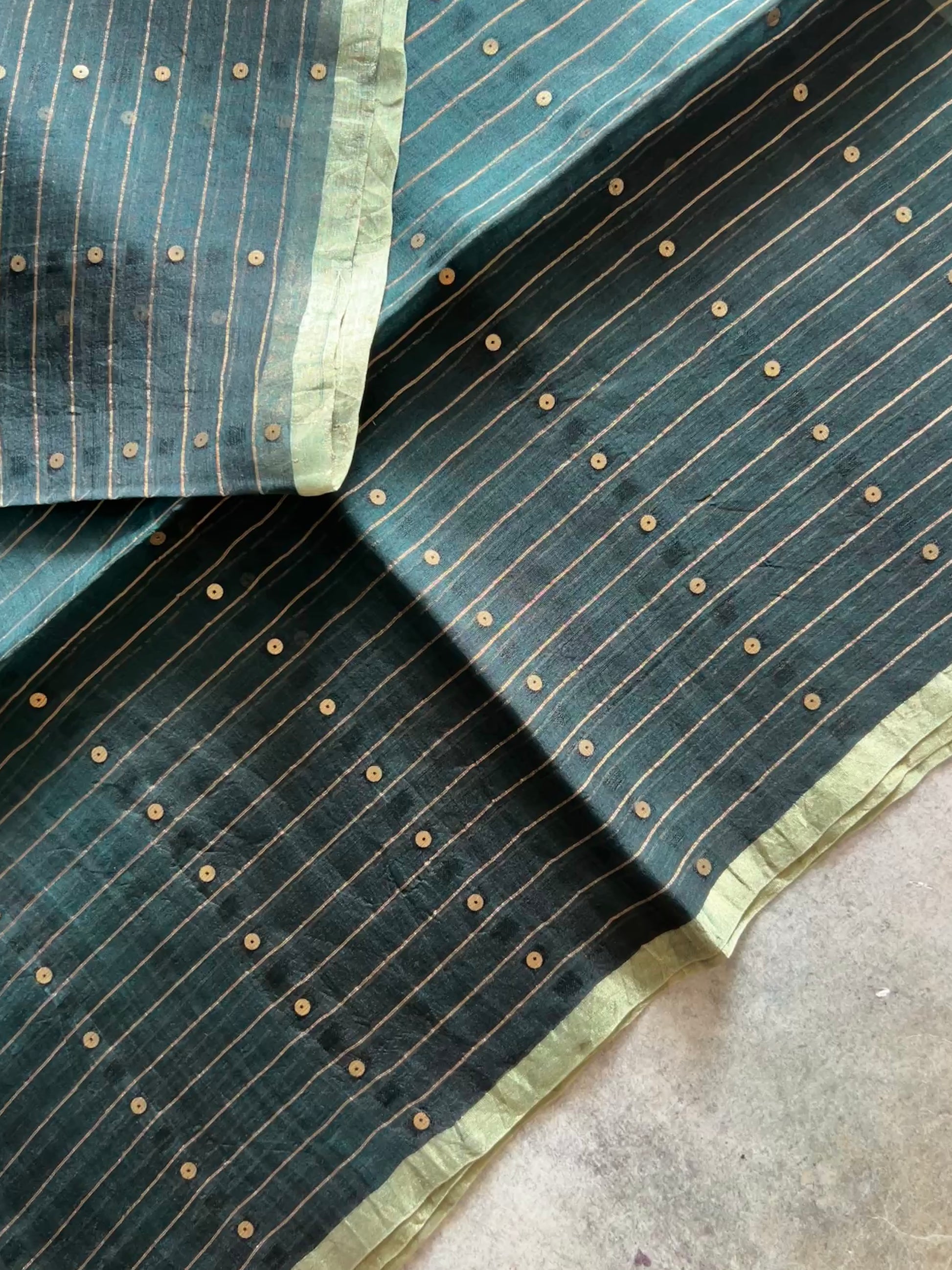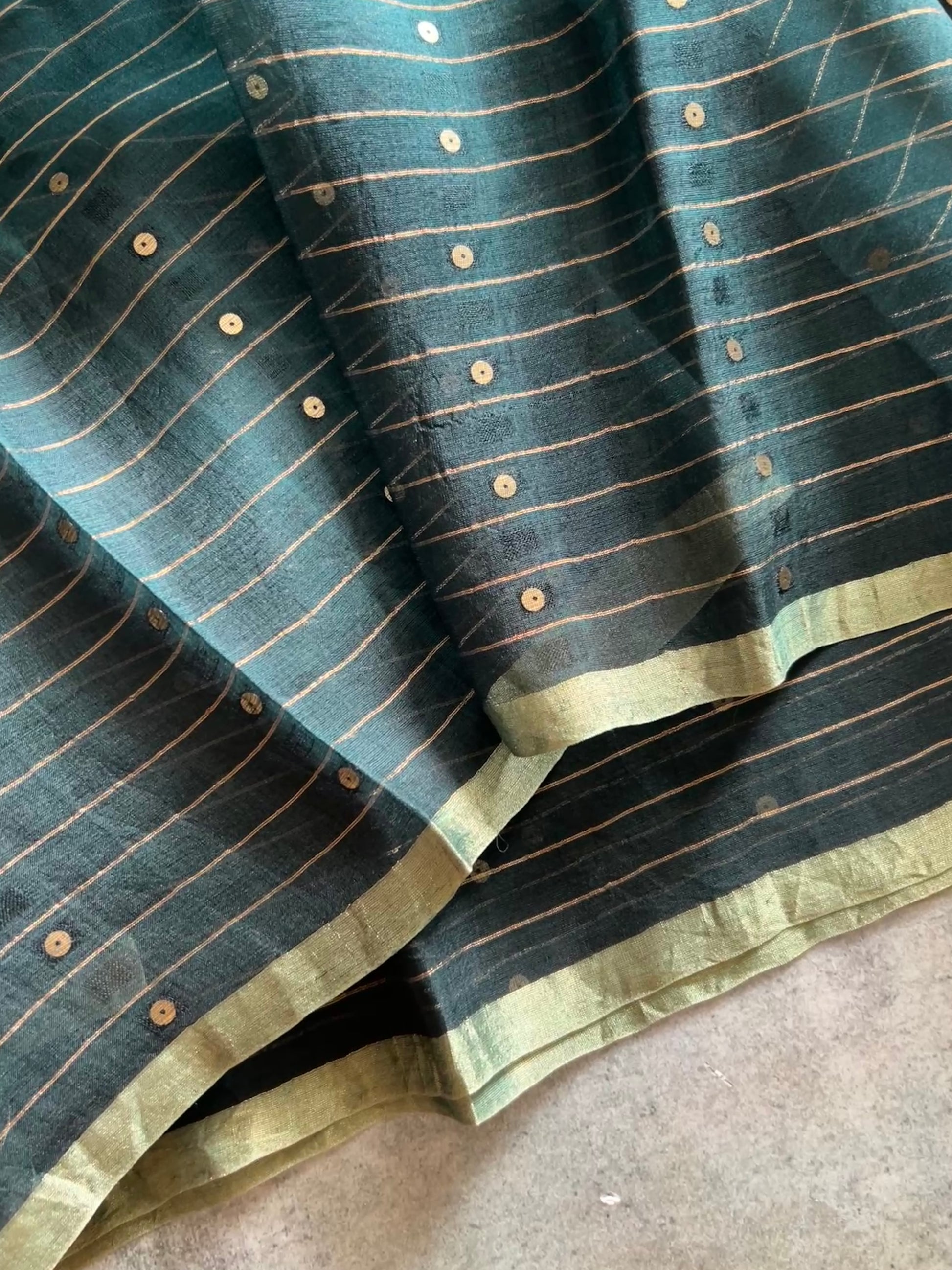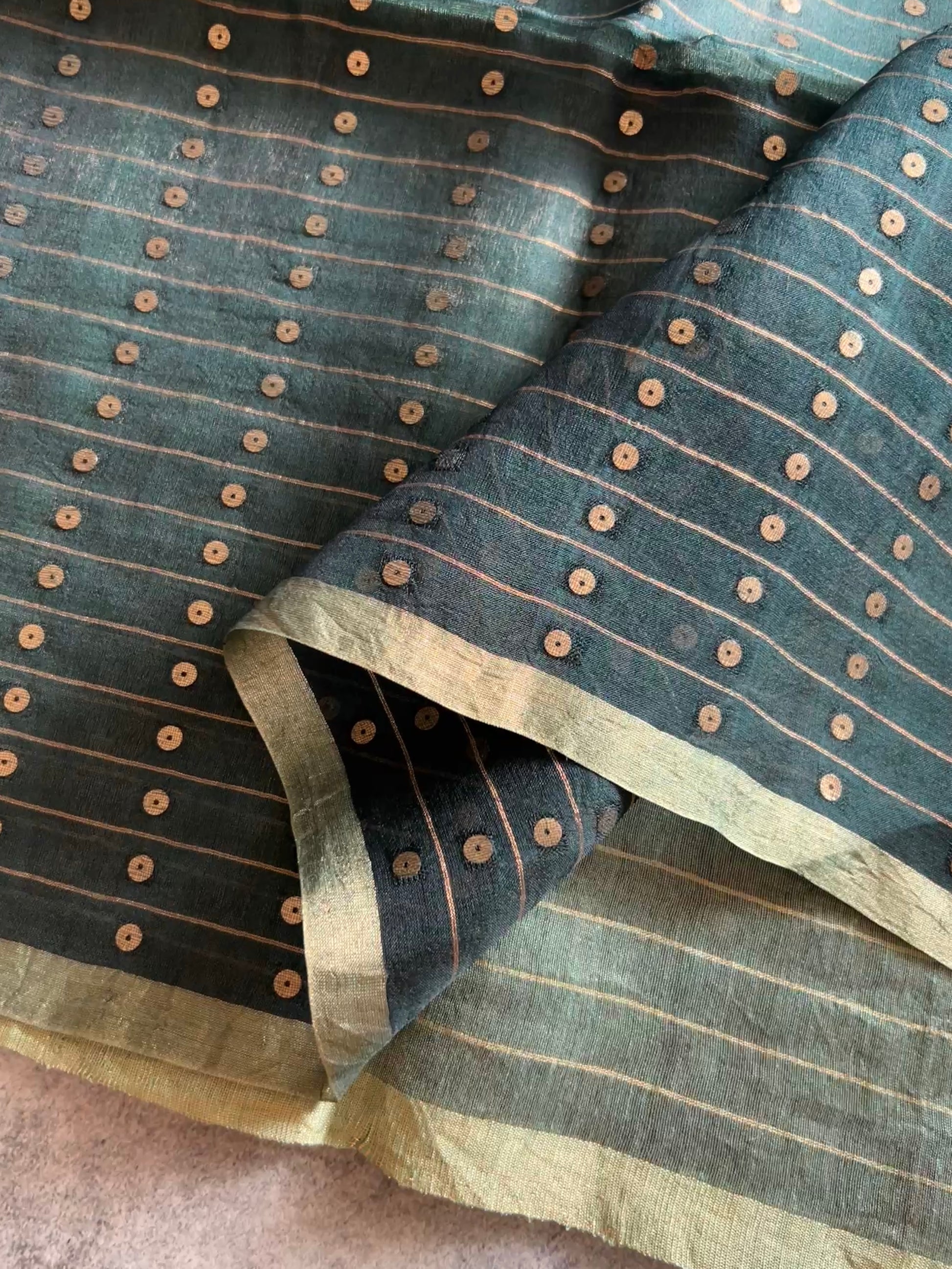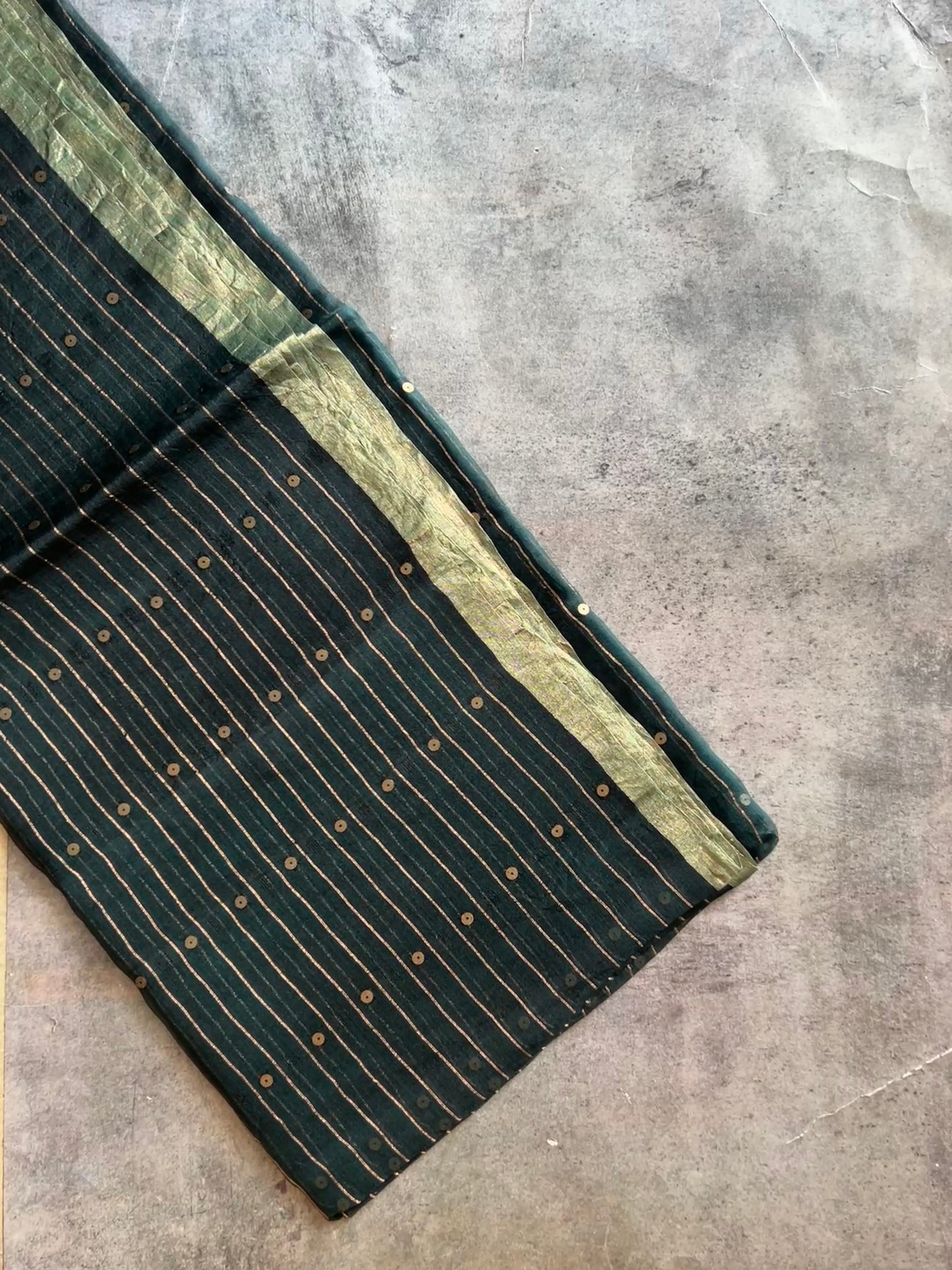 The muslin silk, known for its feather-light texture and smooth finish, drapes like a whisper, while the gini work—fine metallic detailing—adds a gentle sparkle throughout. With its subtle elegance and intricate craftsmanship, this saree captures the essence of understated luxury, making it perfect for both festive and formal occasions.