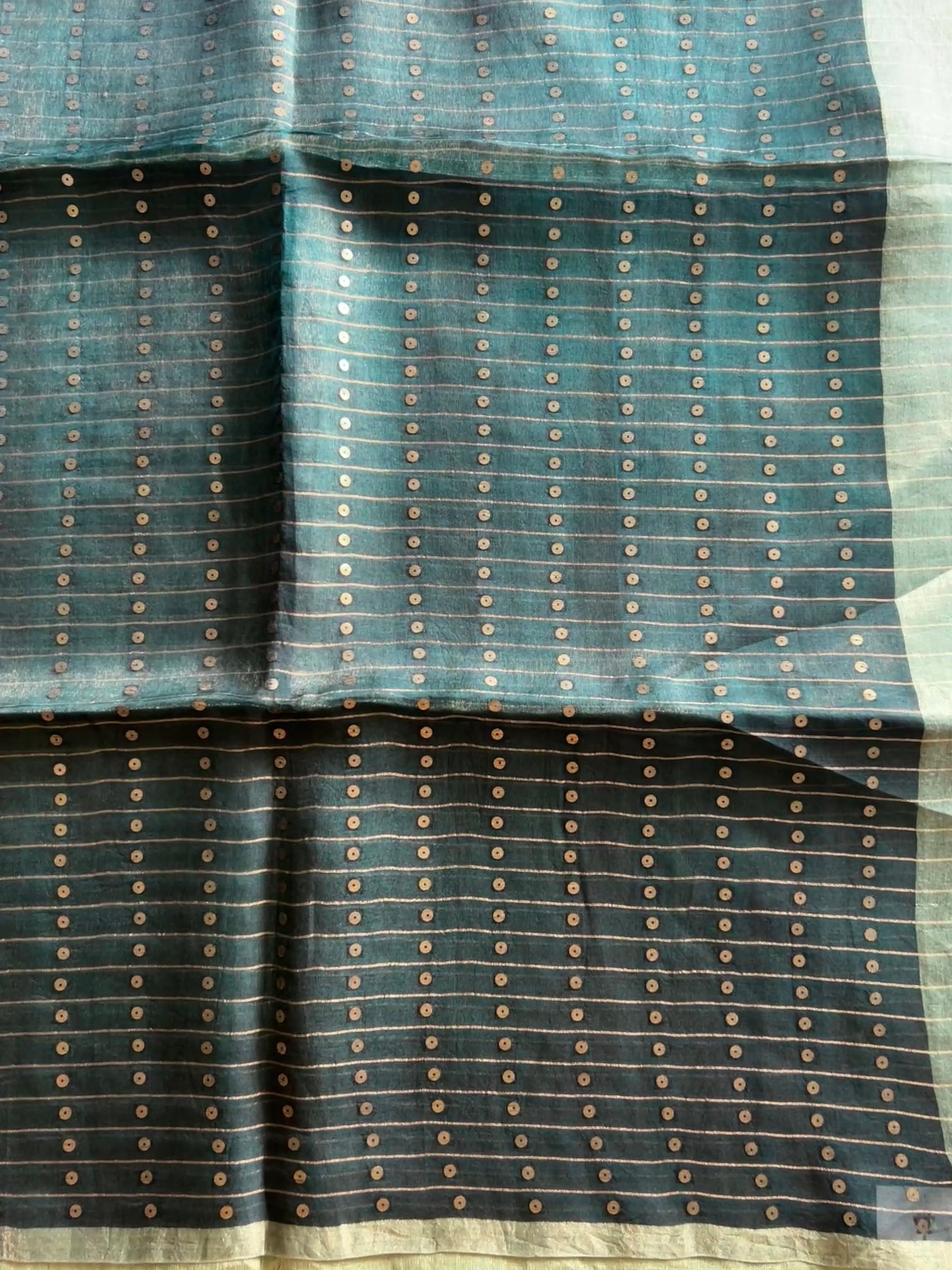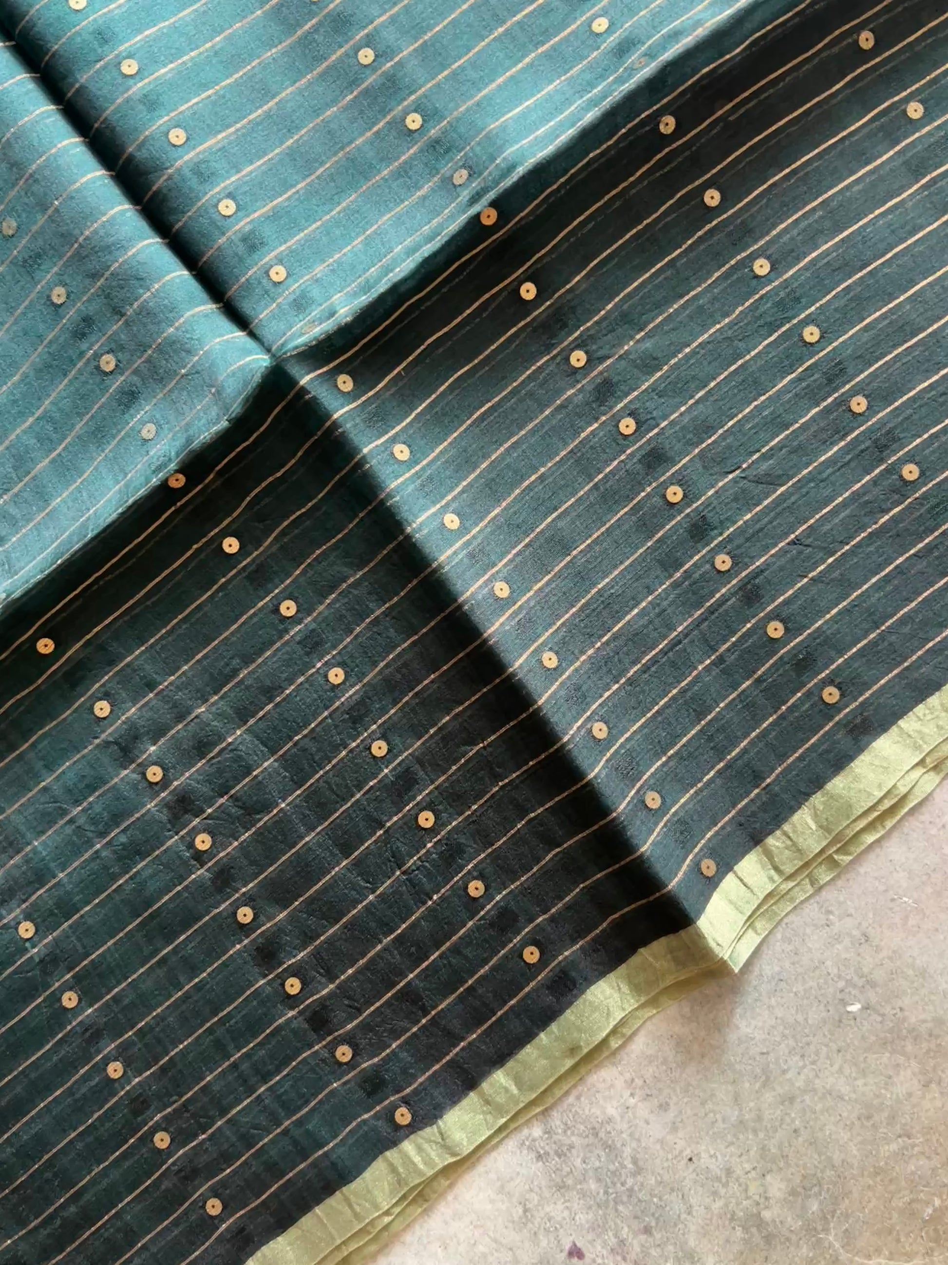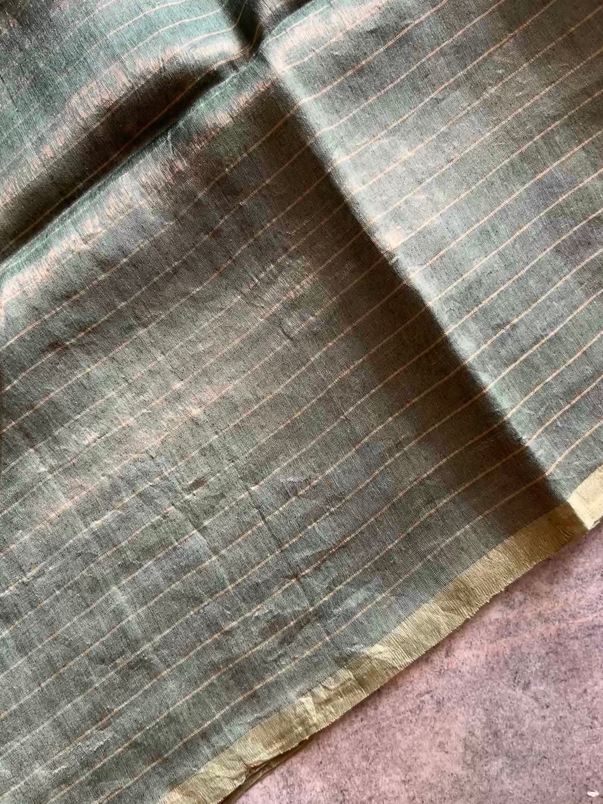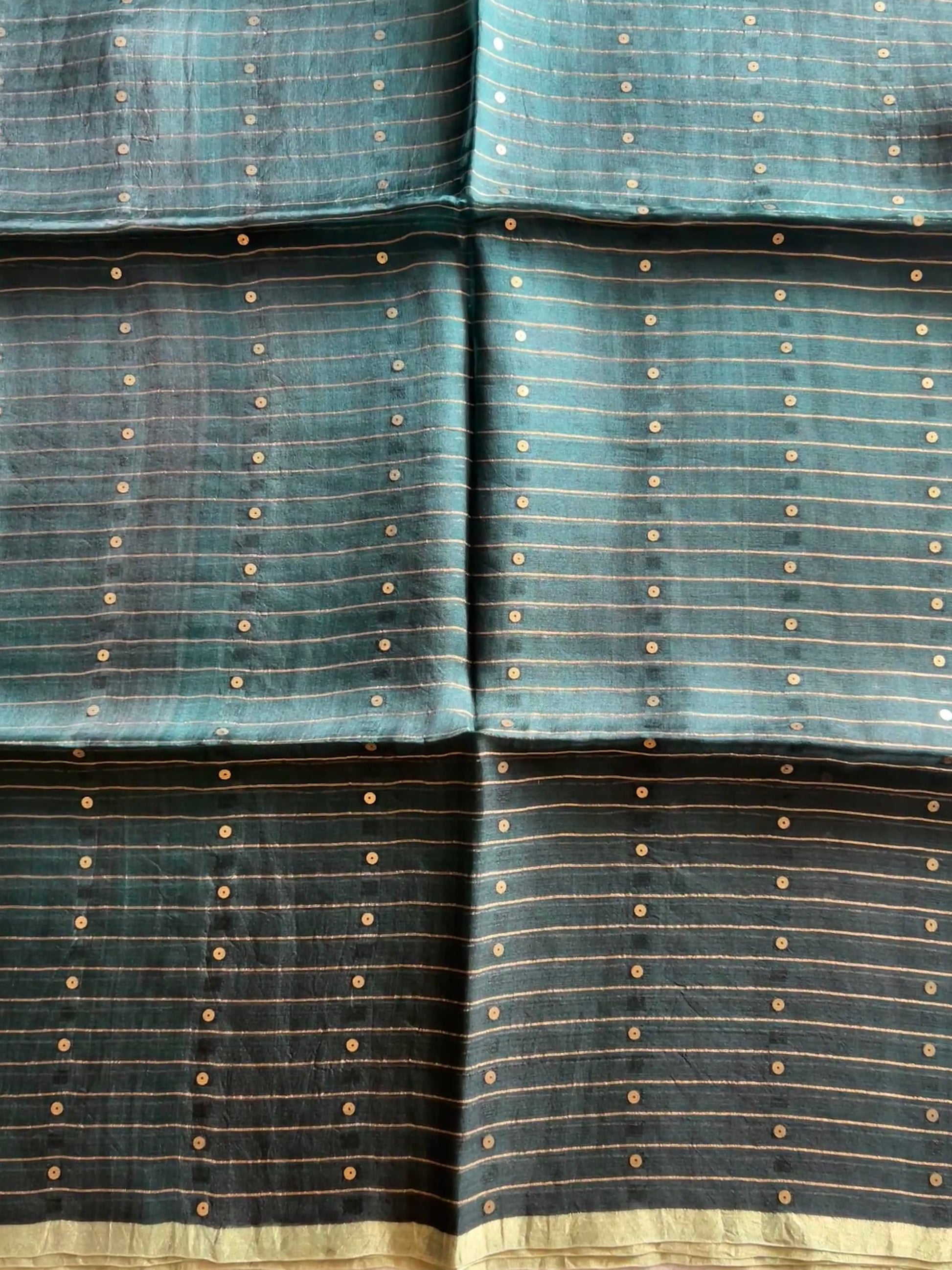 The muslin silk, known for its feather-light texture and smooth finish, drapes like a whisper, while the gini work—fine metallic detailing—adds a gentle sparkle throughout. With its subtle elegance and intricate craftsmanship, this saree captures the essence of understated luxury, making it perfect for both festive and formal occasions.