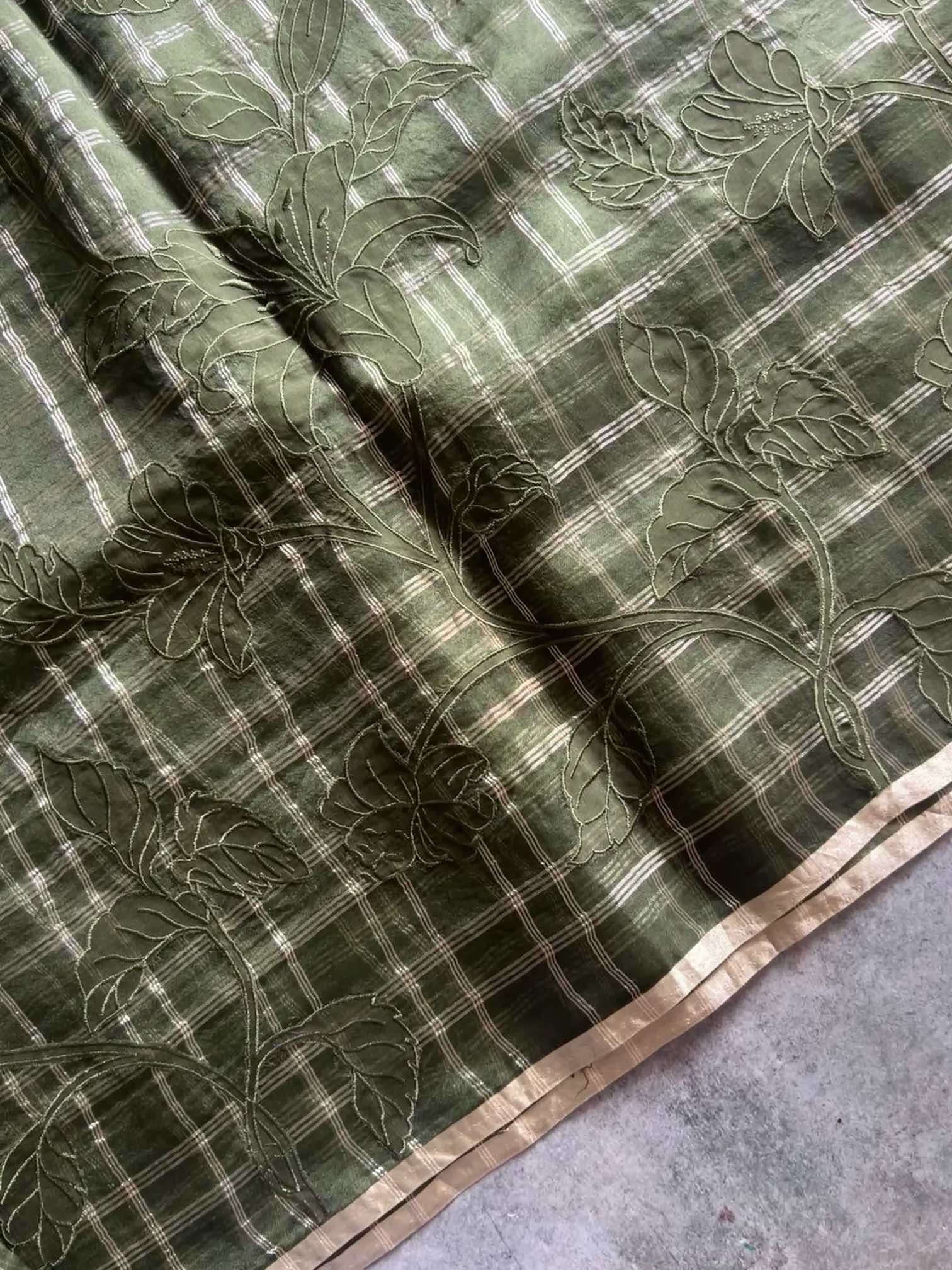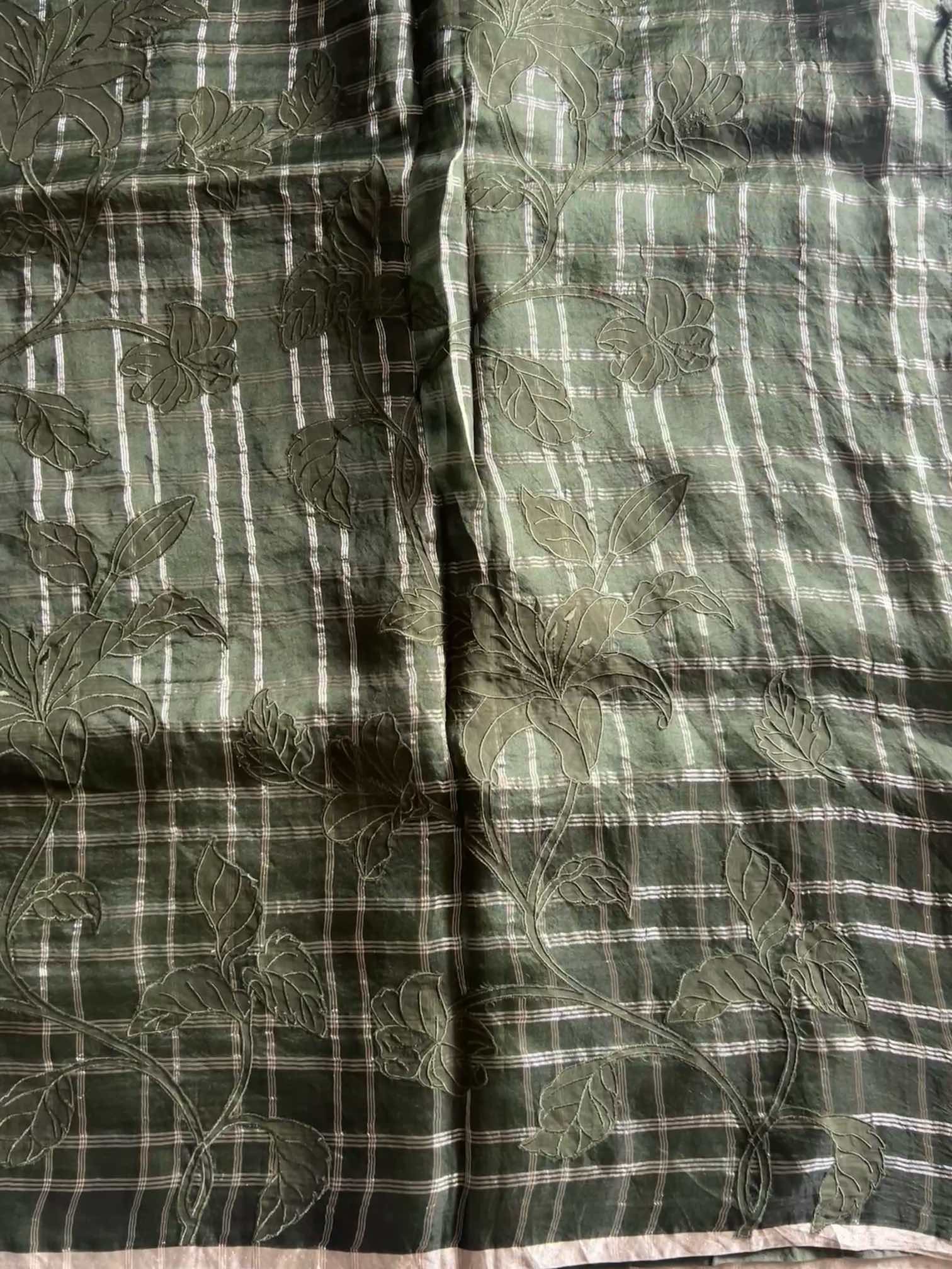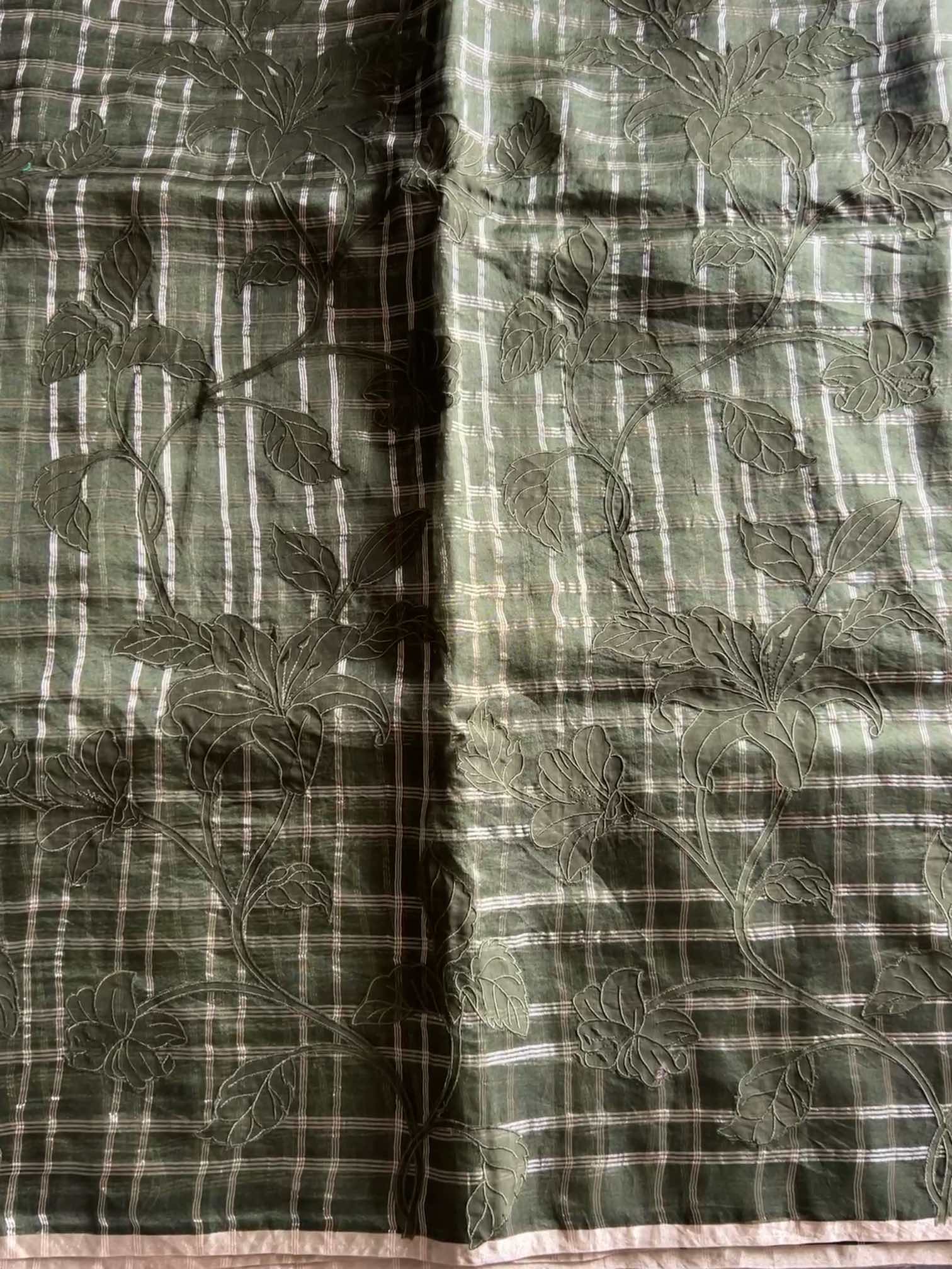 An organza silk saree with silver checks and delicate appliqué work exudes sheer elegance. Its translucent texture gives a graceful, airy charm, while the silver checks add a subtle shimmer and timeless sophistication. The appliqué detailing enhances its artisanal beauty, making the saree look refined, luxurious, and effortlessly captivating.