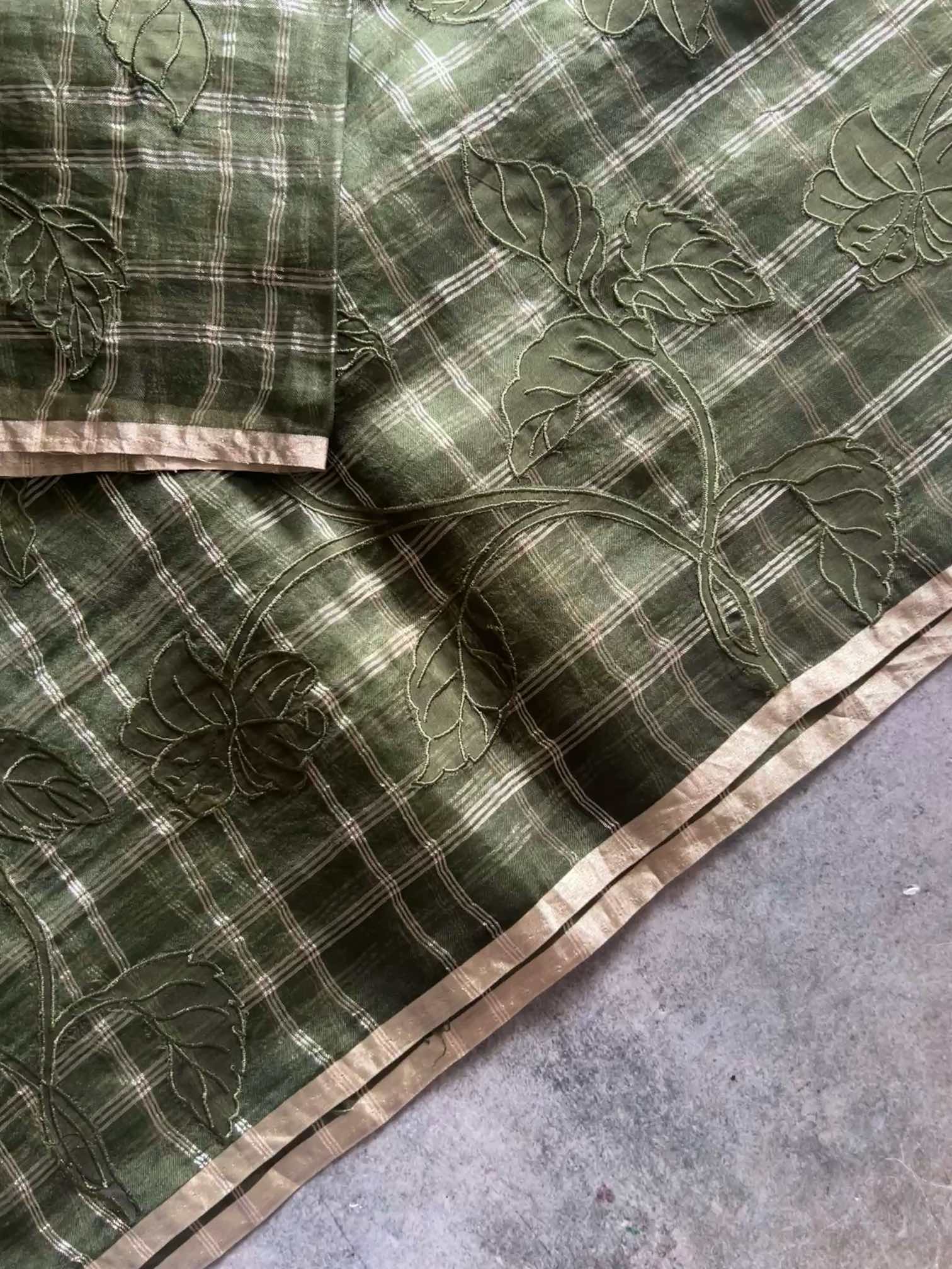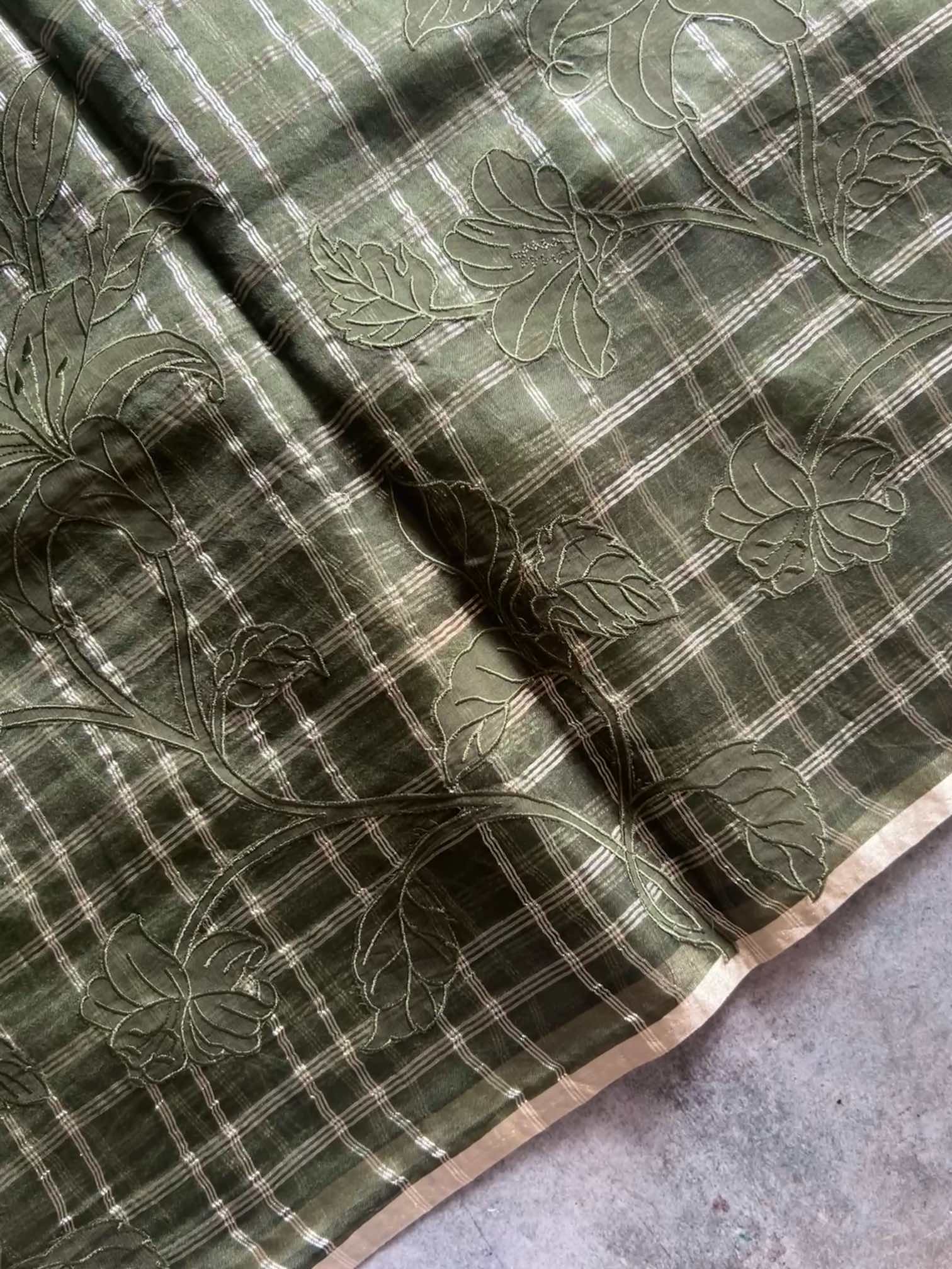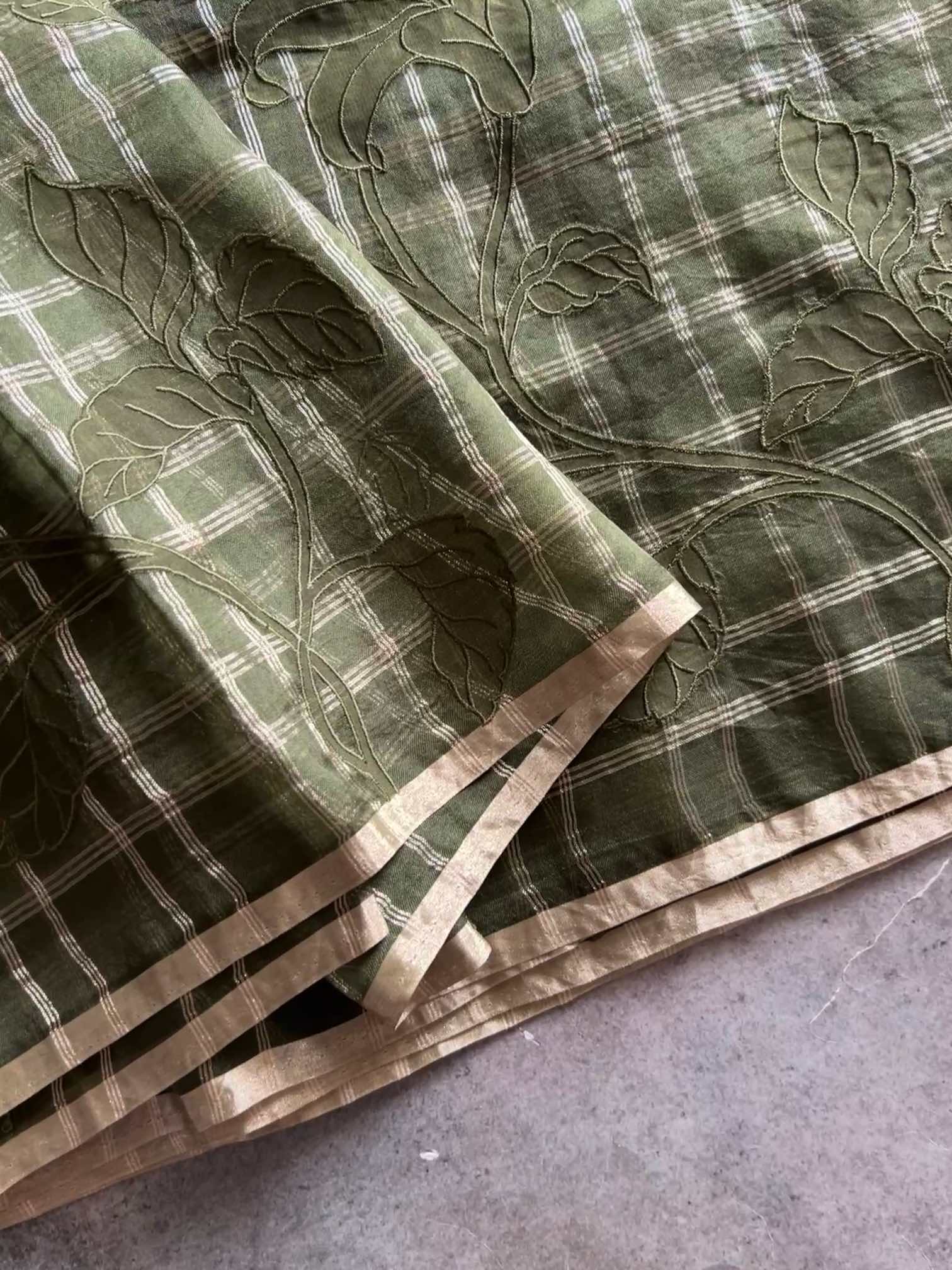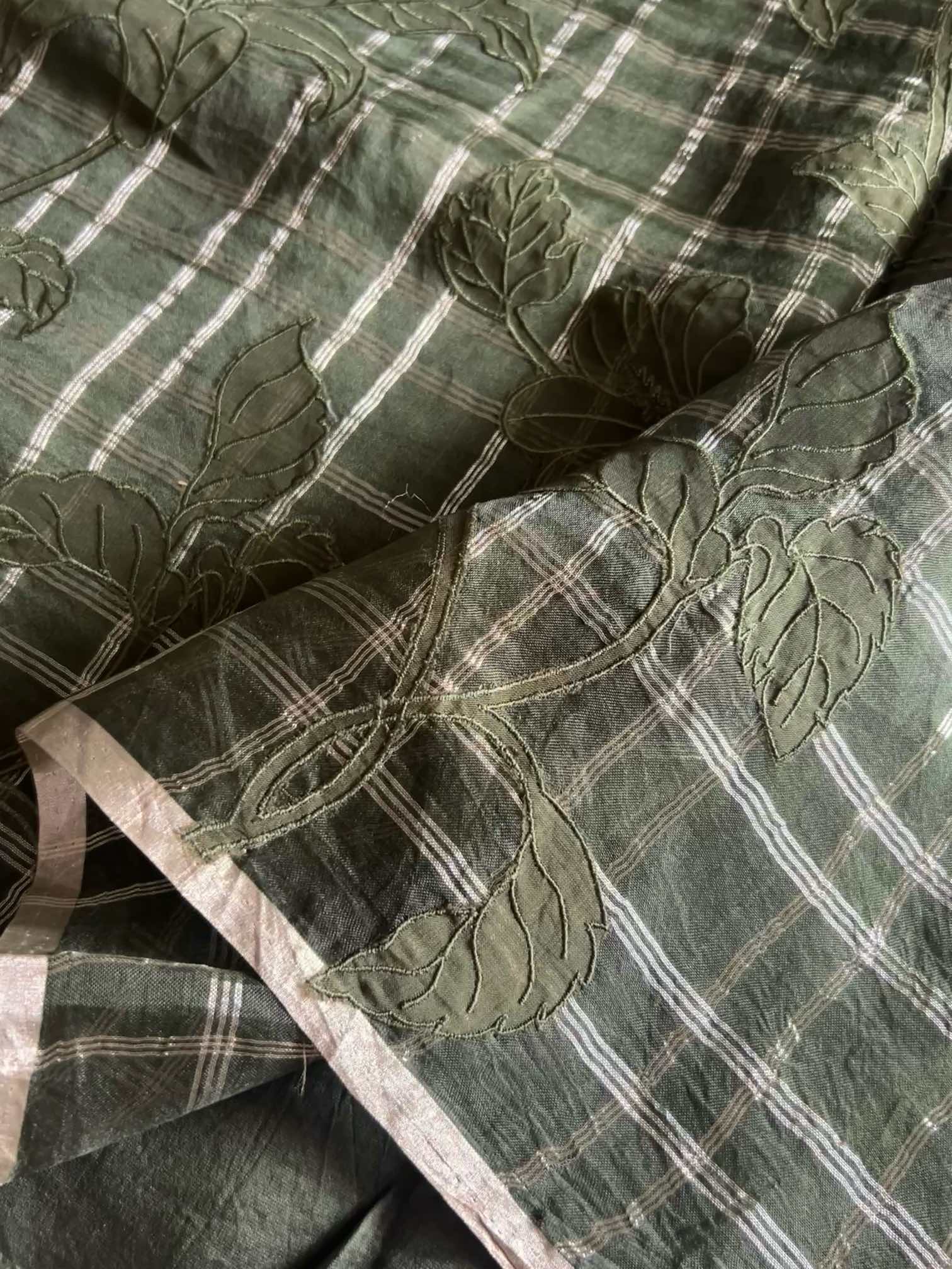 An organza silk saree with silver checks and delicate appliqué work exudes sheer elegance. Its translucent texture gives a graceful, airy charm, while the silver checks add a subtle shimmer and timeless sophistication. The appliqué detailing enhances its artisanal beauty, making the saree look refined, luxurious, and effortlessly captivating.