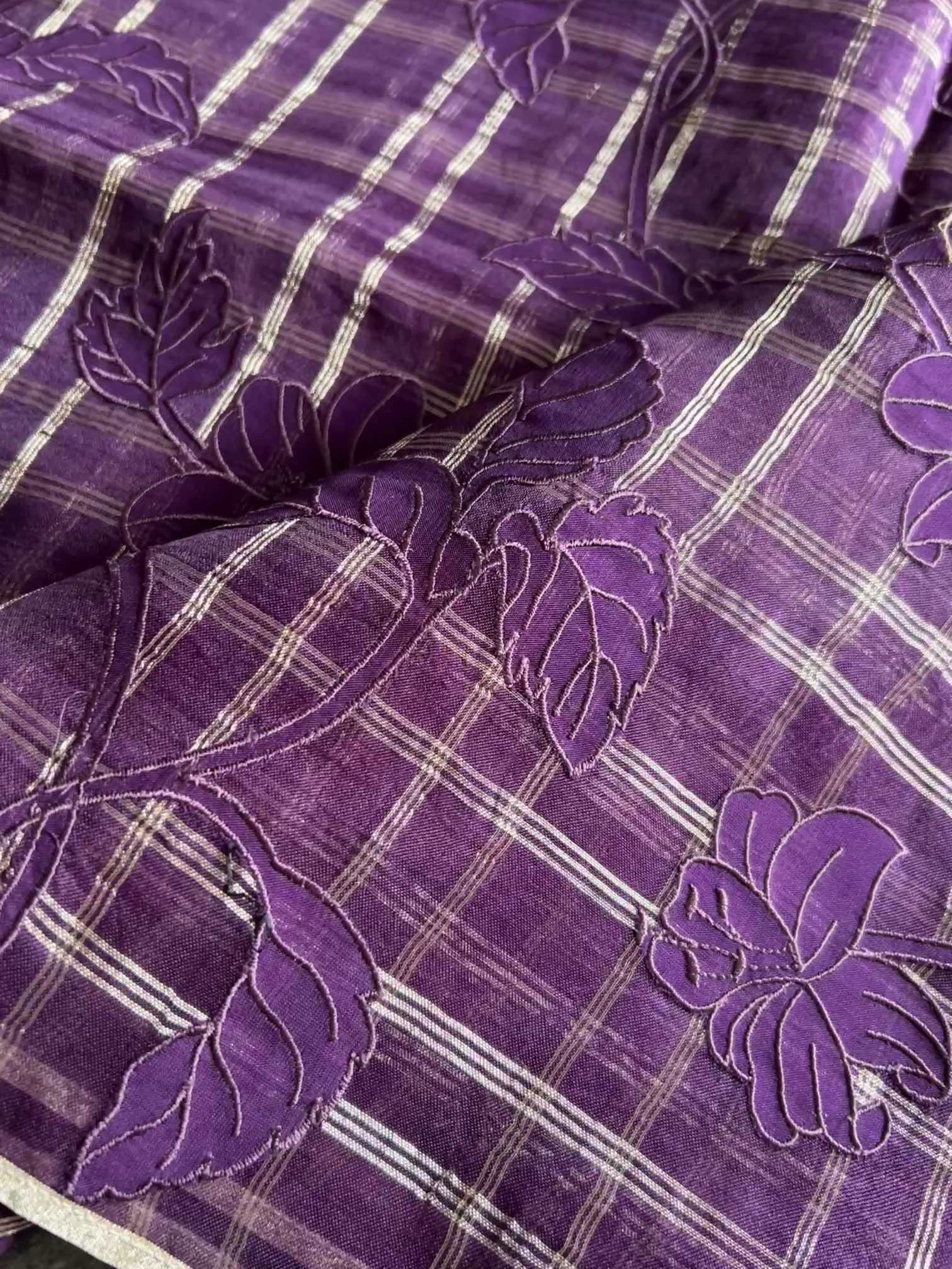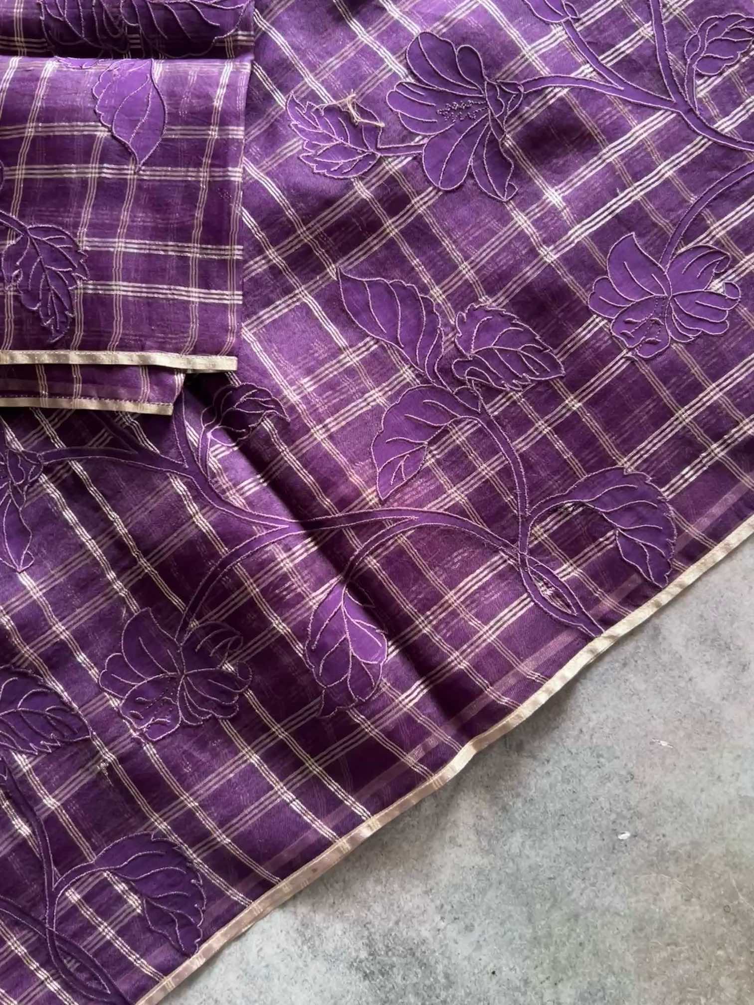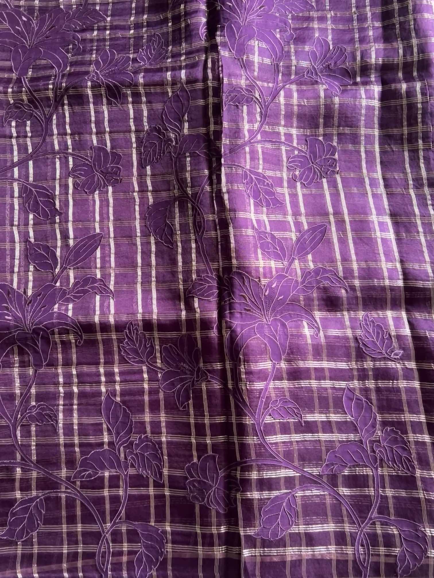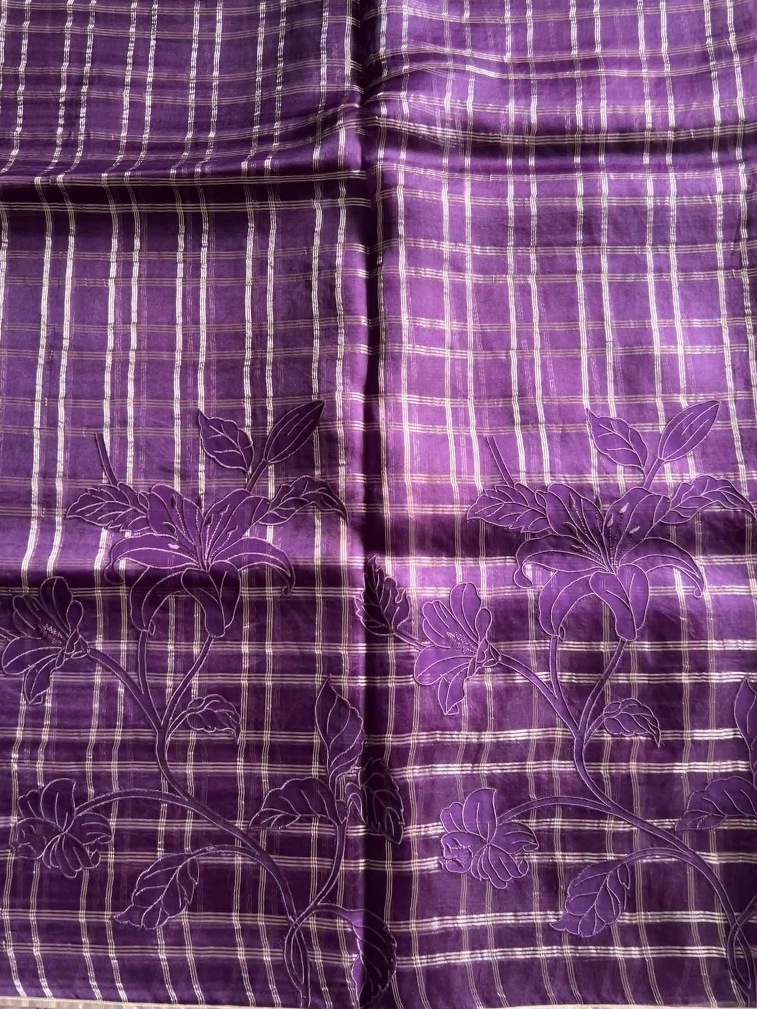 An organza silk saree with silver checks and delicate appliqué work exudes sheer elegance. Its translucent texture gives a graceful, airy charm, while the silver checks add a subtle shimmer and timeless sophistication. The appliqué detailing enhances its artisanal beauty, making the saree look refined, luxurious, and effortlessly captivating.