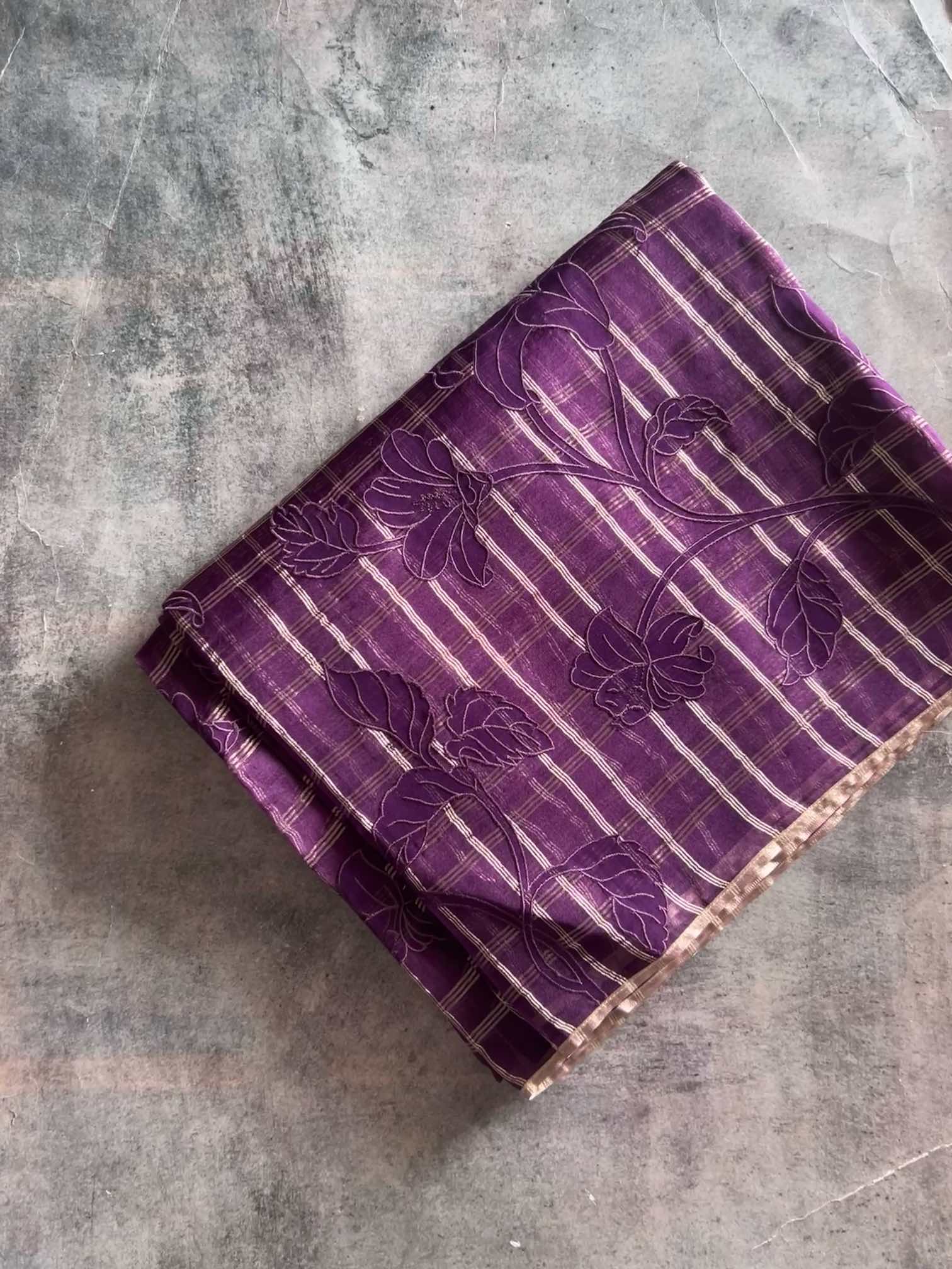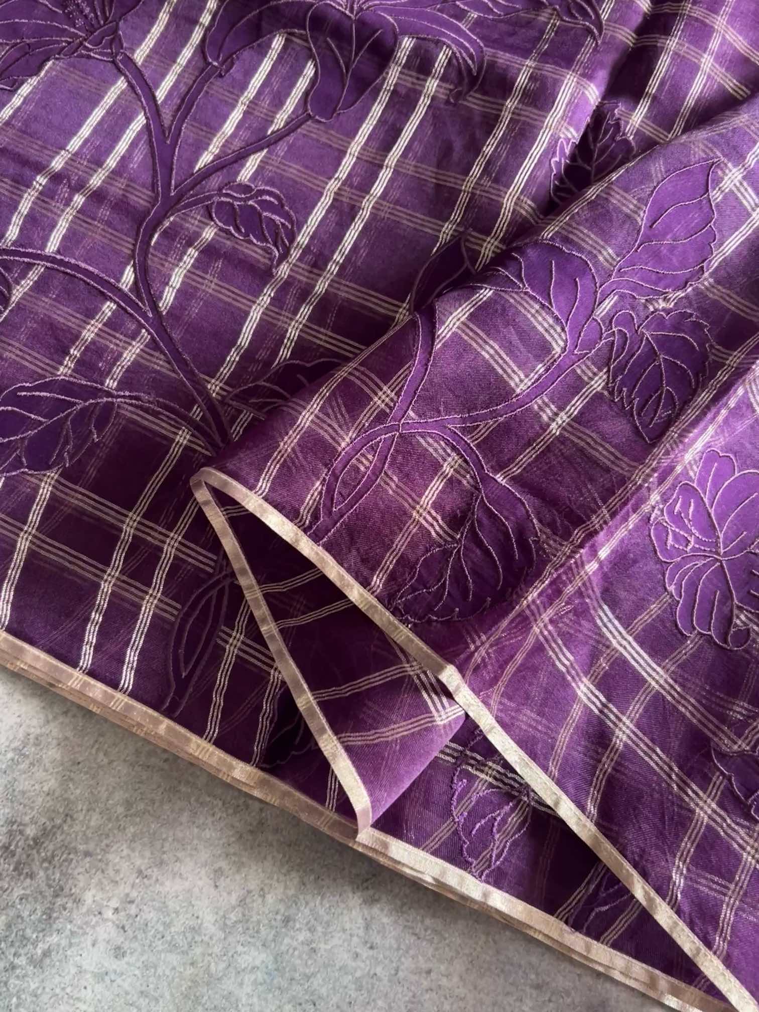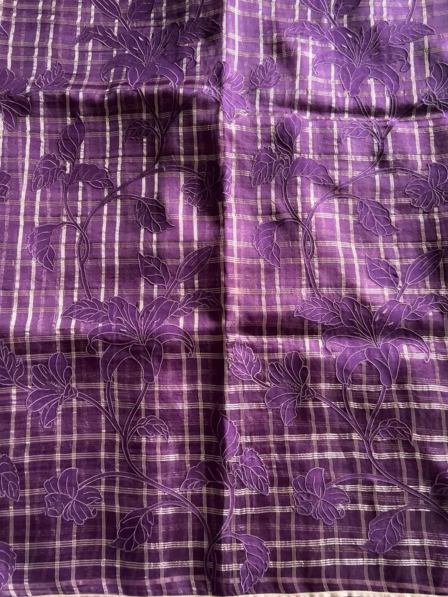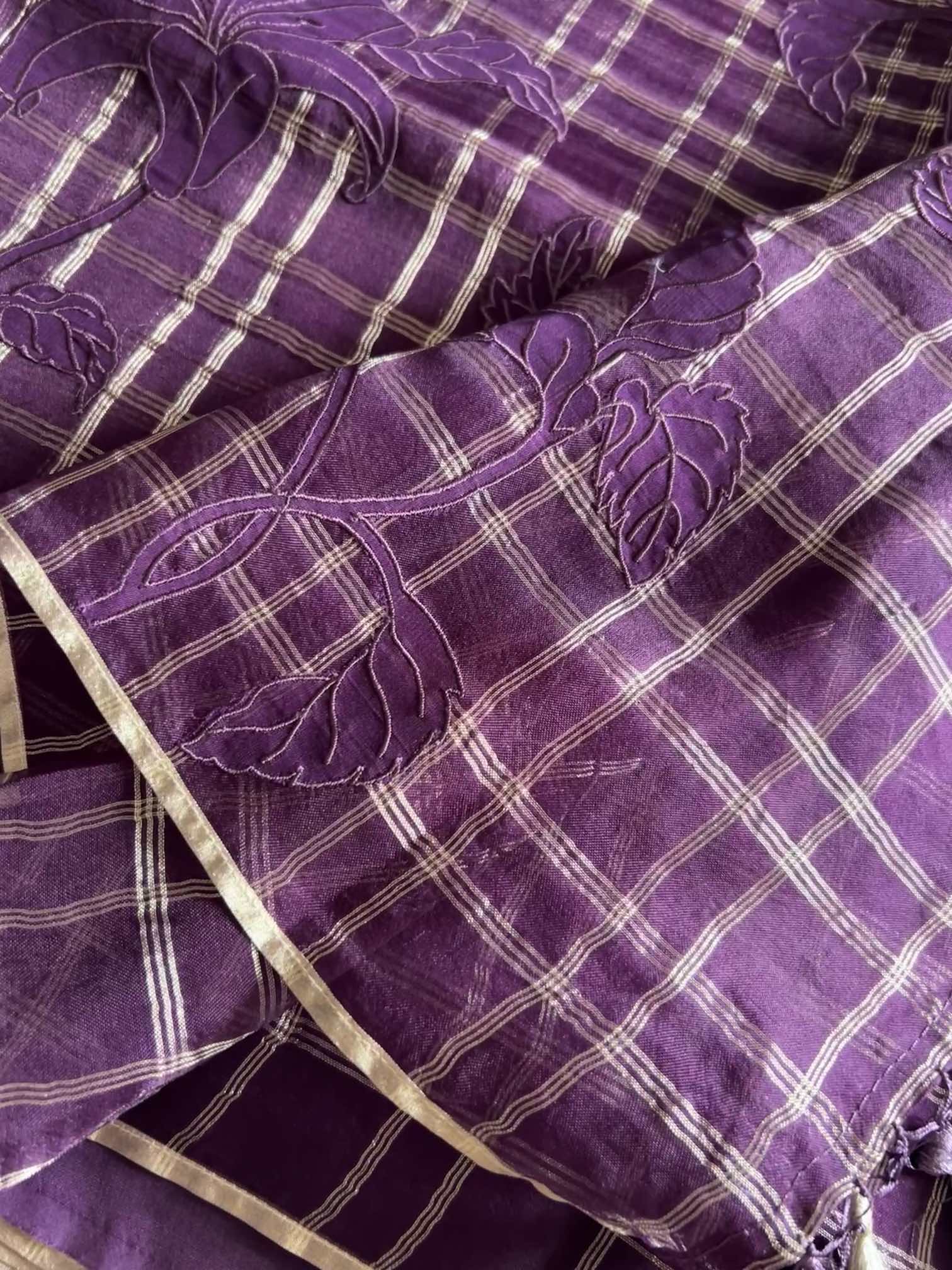 An organza silk saree with silver checks and delicate appliqué work exudes sheer elegance. Its translucent texture gives a graceful, airy charm, while the silver checks add a subtle shimmer and timeless sophistication. The appliqué detailing enhances its artisanal beauty, making the saree look refined, luxurious, and effortlessly captivating.