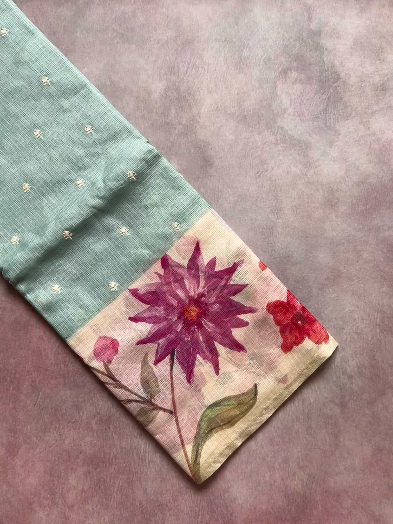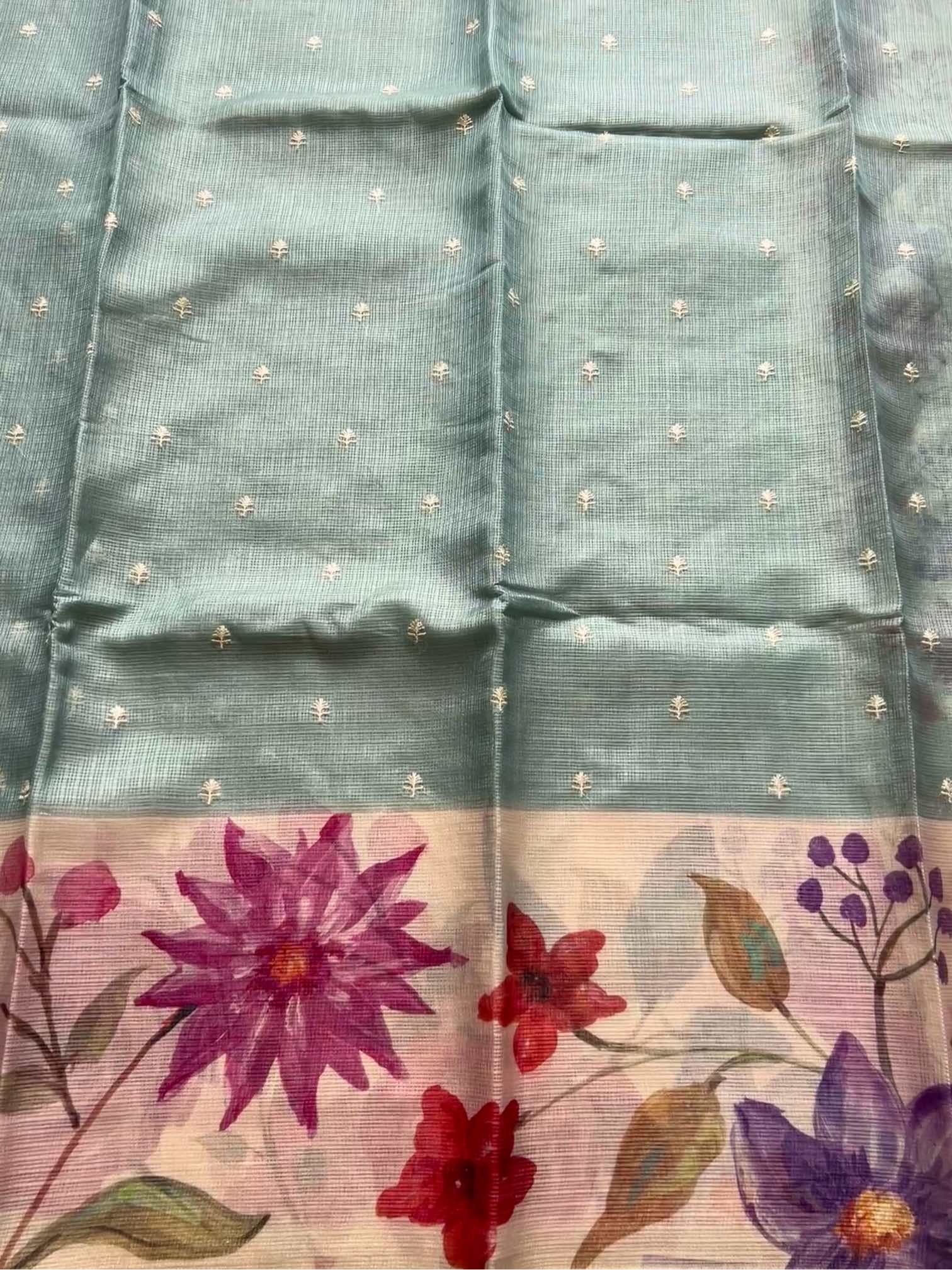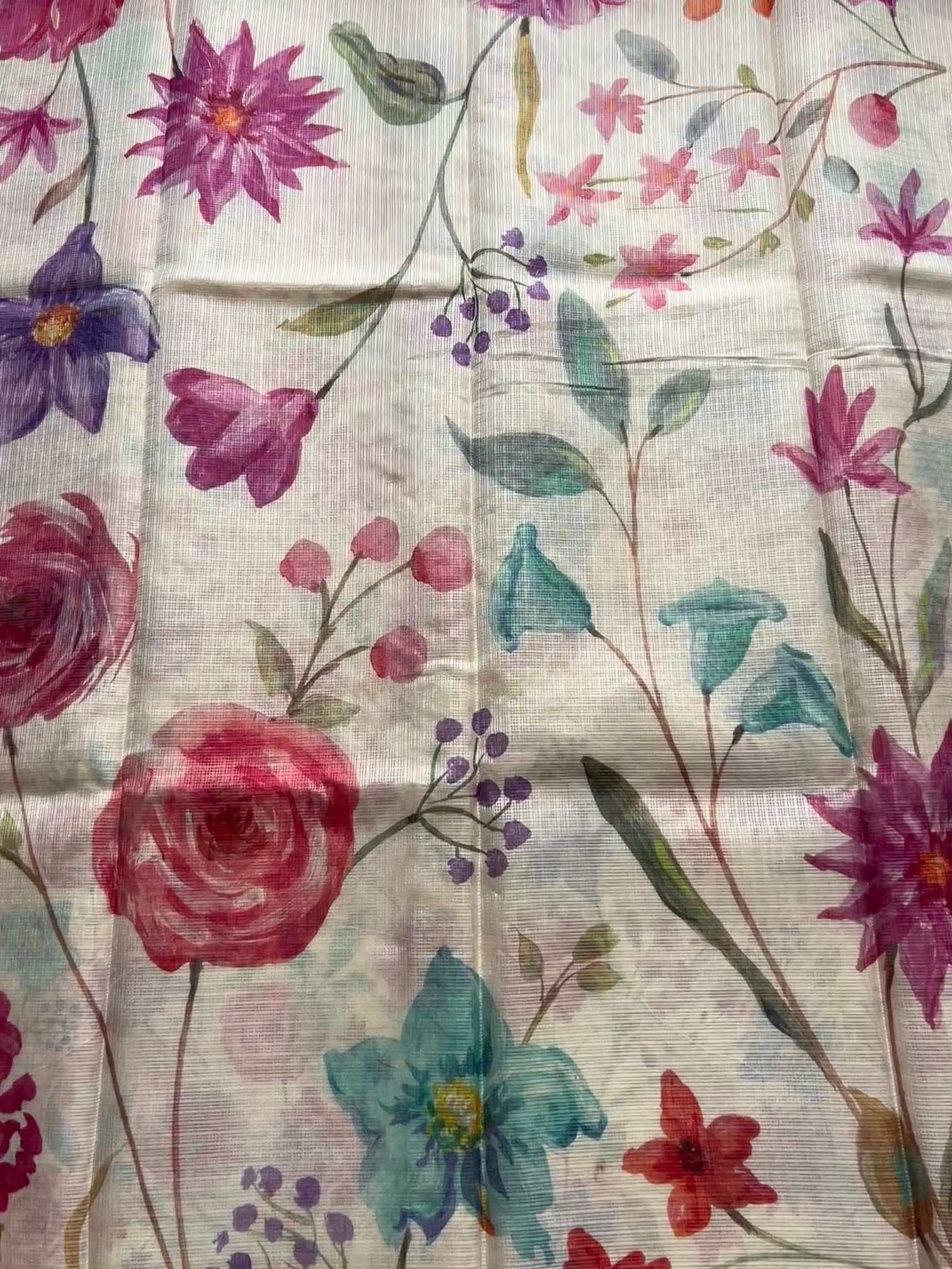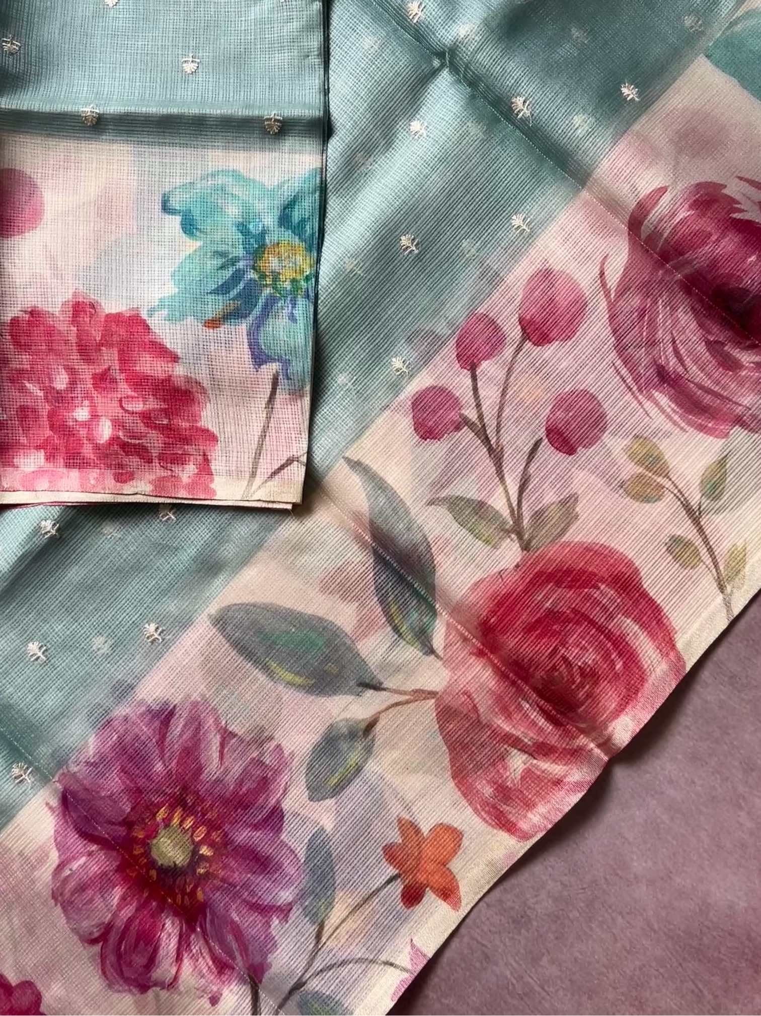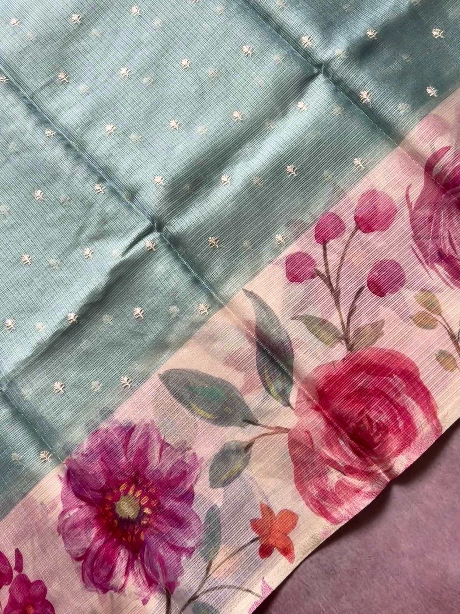 Printed Kota sarees with lace work borders exude a unique blend of simplicity and elegance. The airy, translucent texture of Kota fabric, combined with vibrant prints, creates a refreshing and graceful look. The delicate lace border adds a touch of sophistication, beautifully framing the saree with subtle charm.
