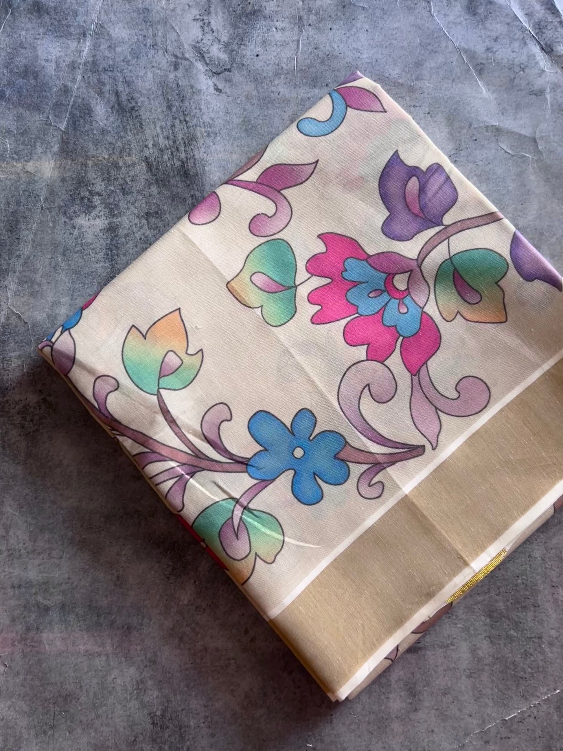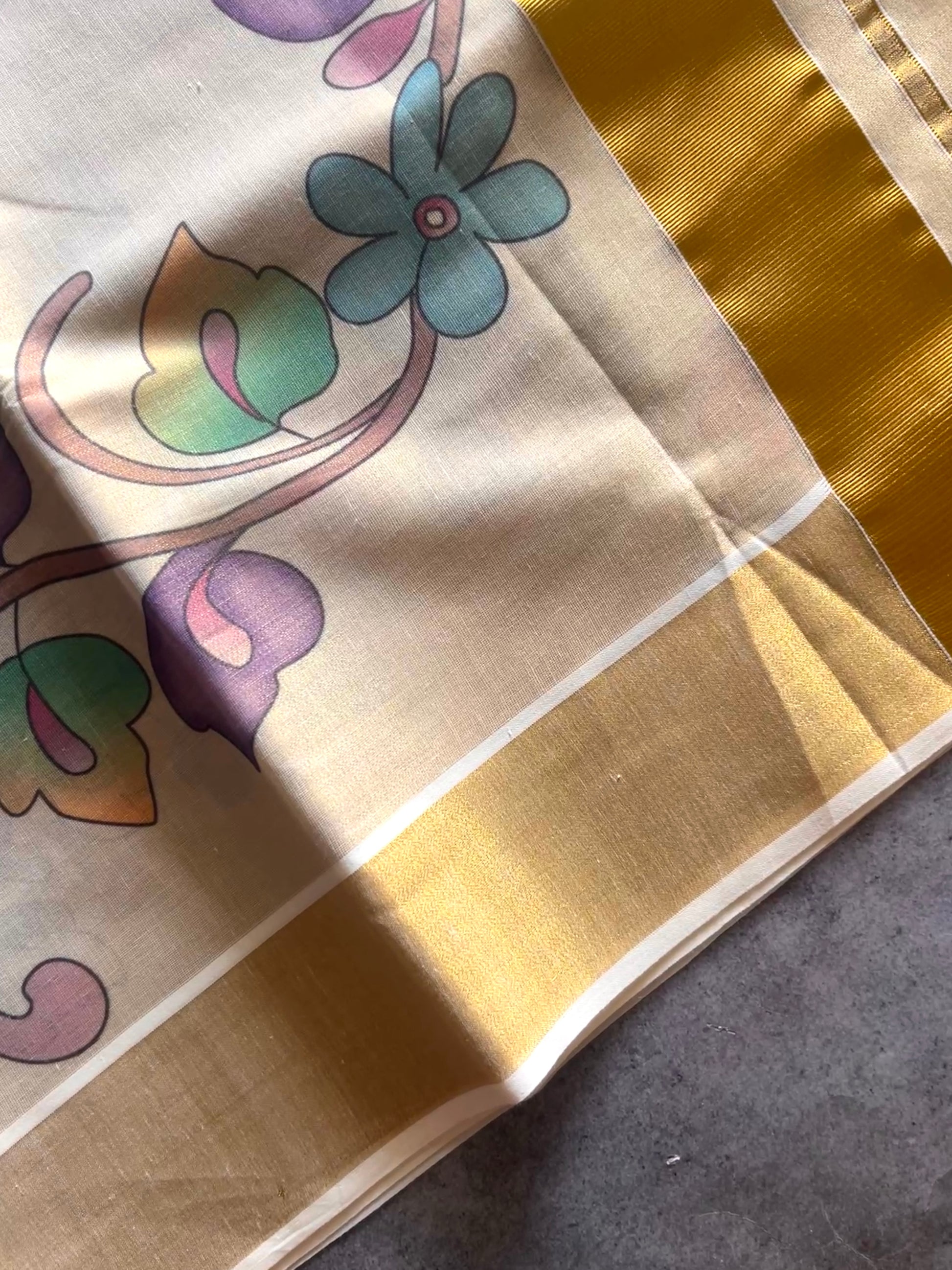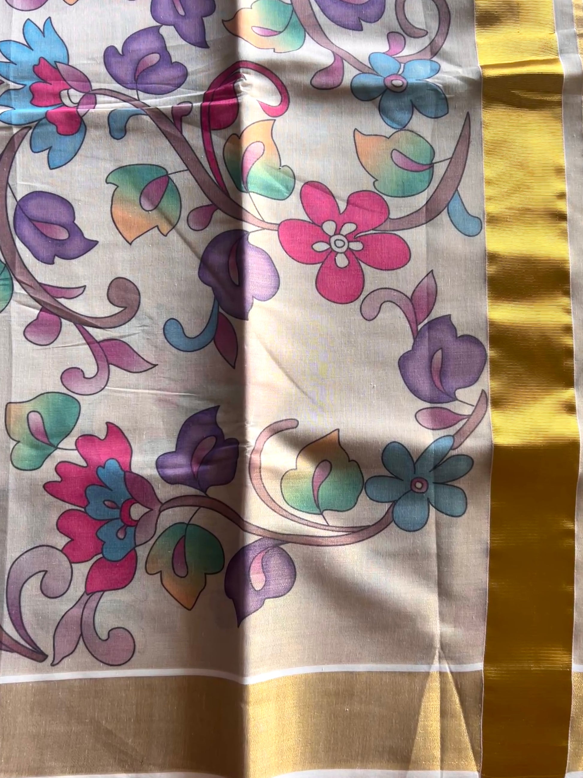 The soft cotton offers comfort and ease, while the floral prints add a delicate, festive charm that mirrors the blooming pookalam (flower rangoli). These sarees blend the grace of Kerala's heritage with a touch of modern artistry, making them a perfect choice for celebrating Onam with style and grace.