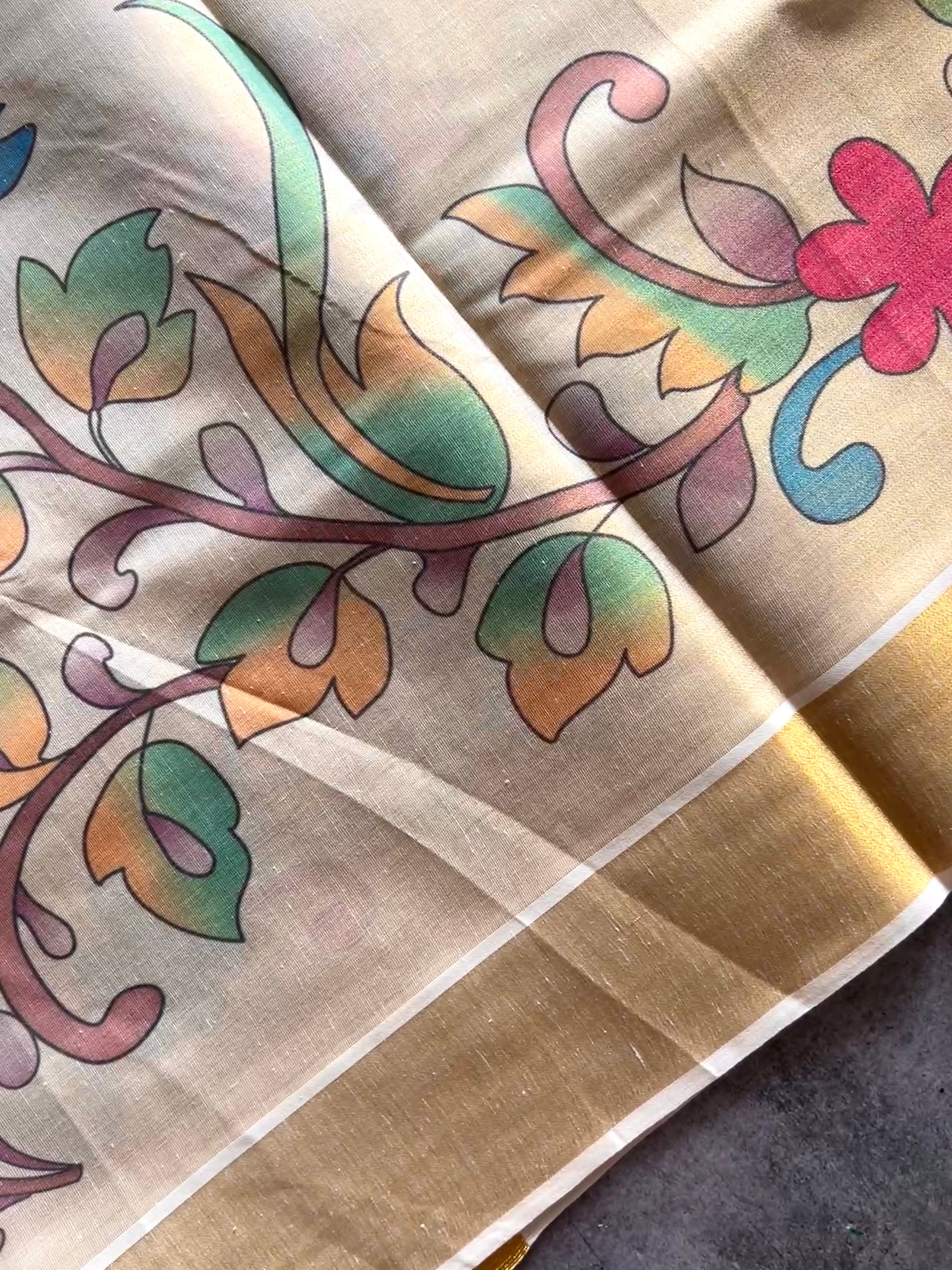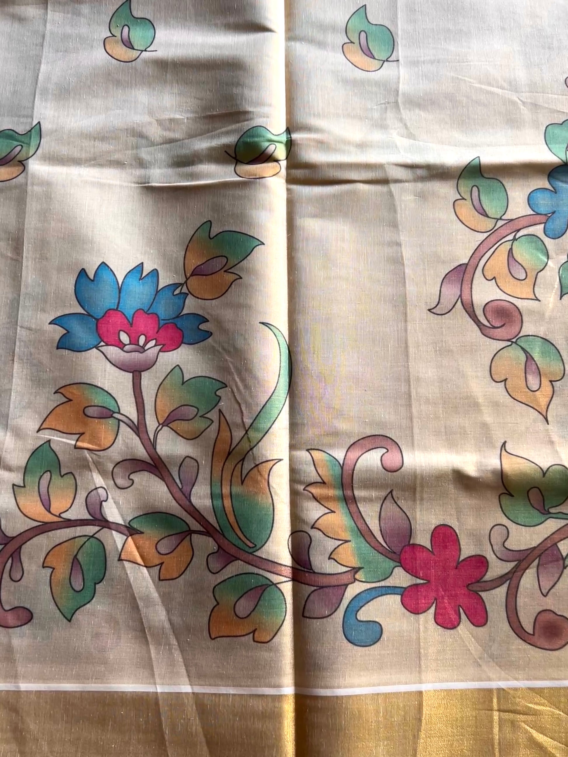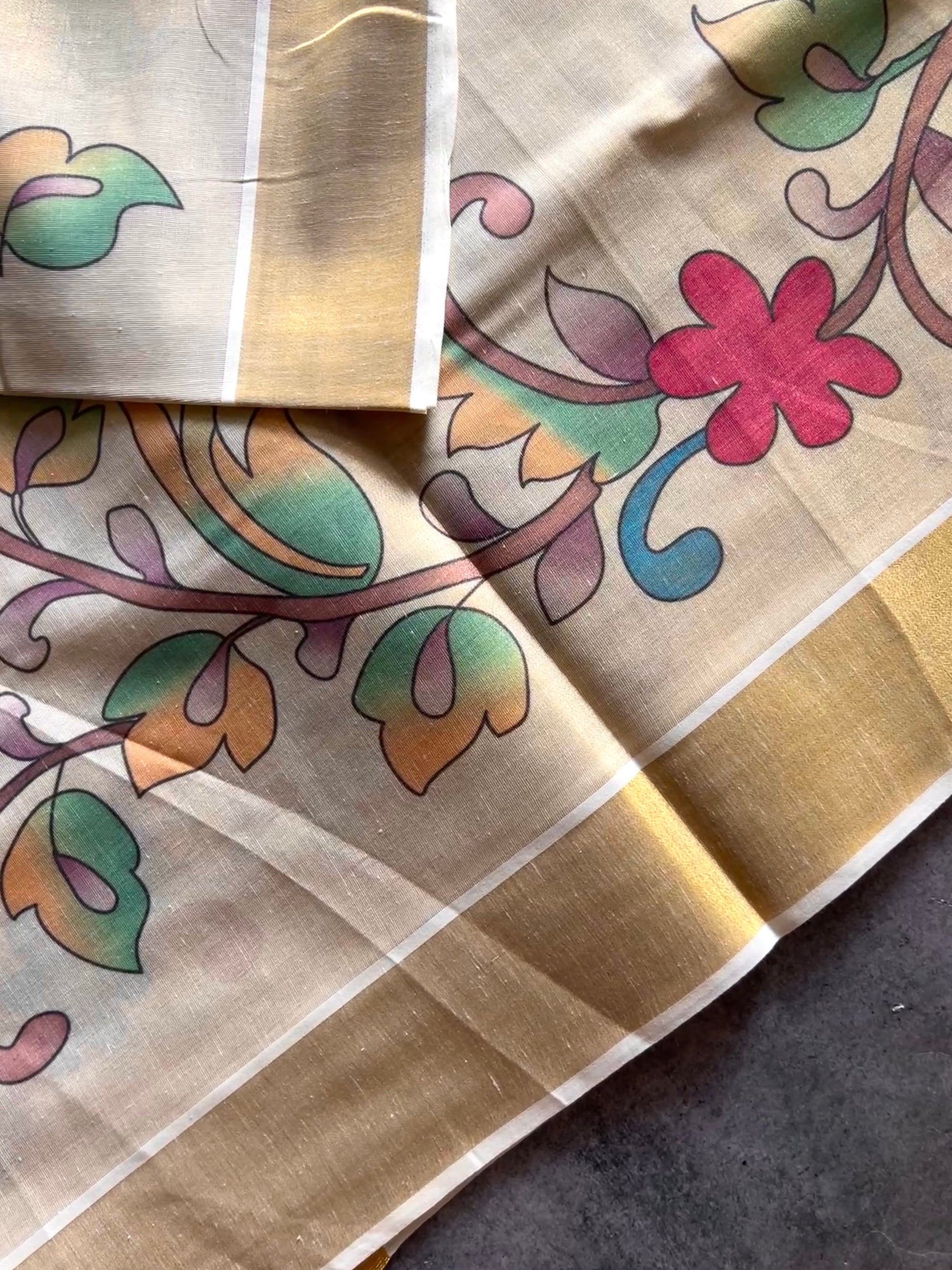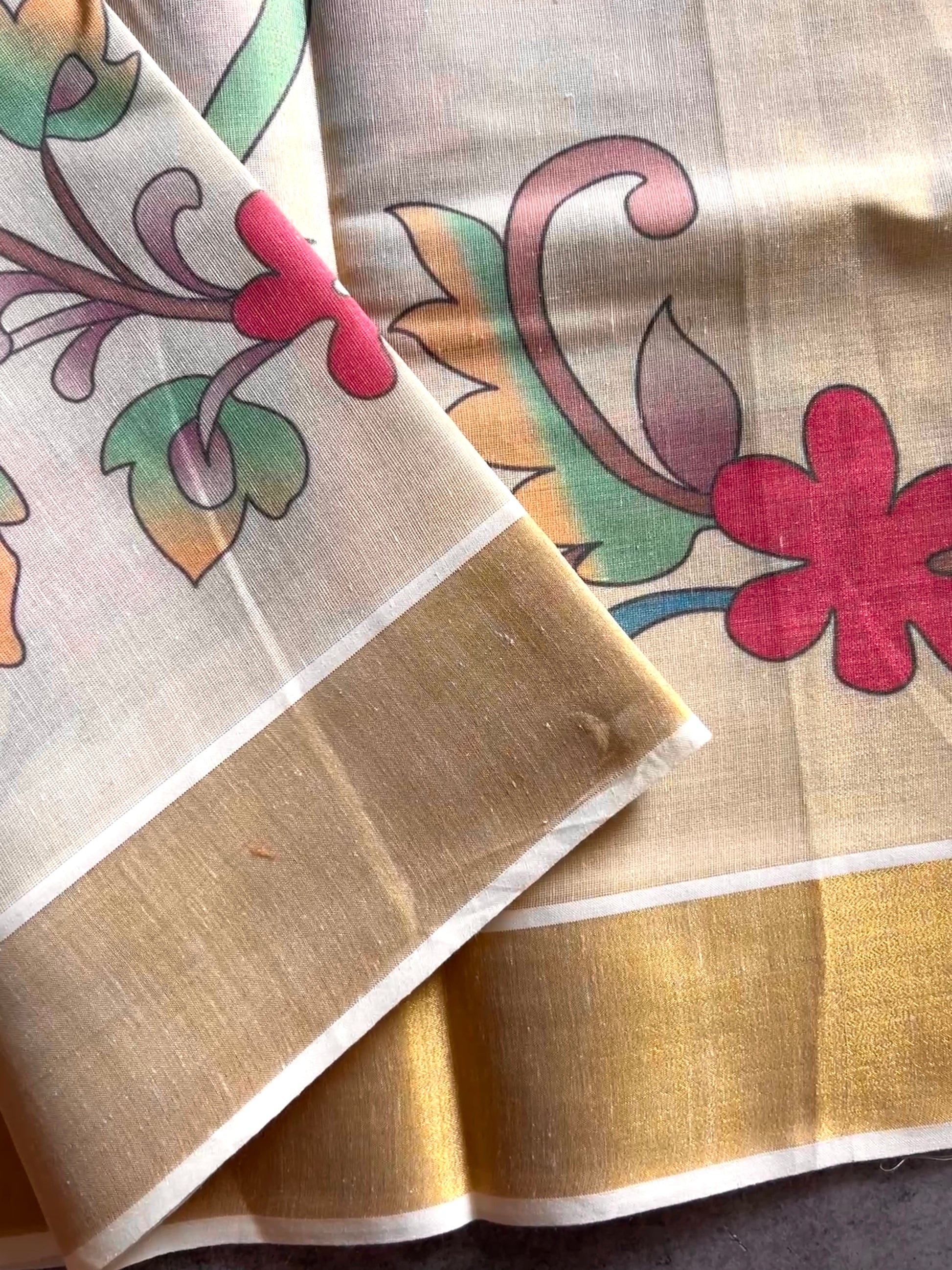 The soft cotton offers comfort and ease, while the floral prints add a delicate, festive charm that mirrors the blooming pookalam (flower rangoli). These sarees blend the grace of Kerala's heritage with a touch of modern artistry, making them a perfect choice for celebrating Onam with style and grace.