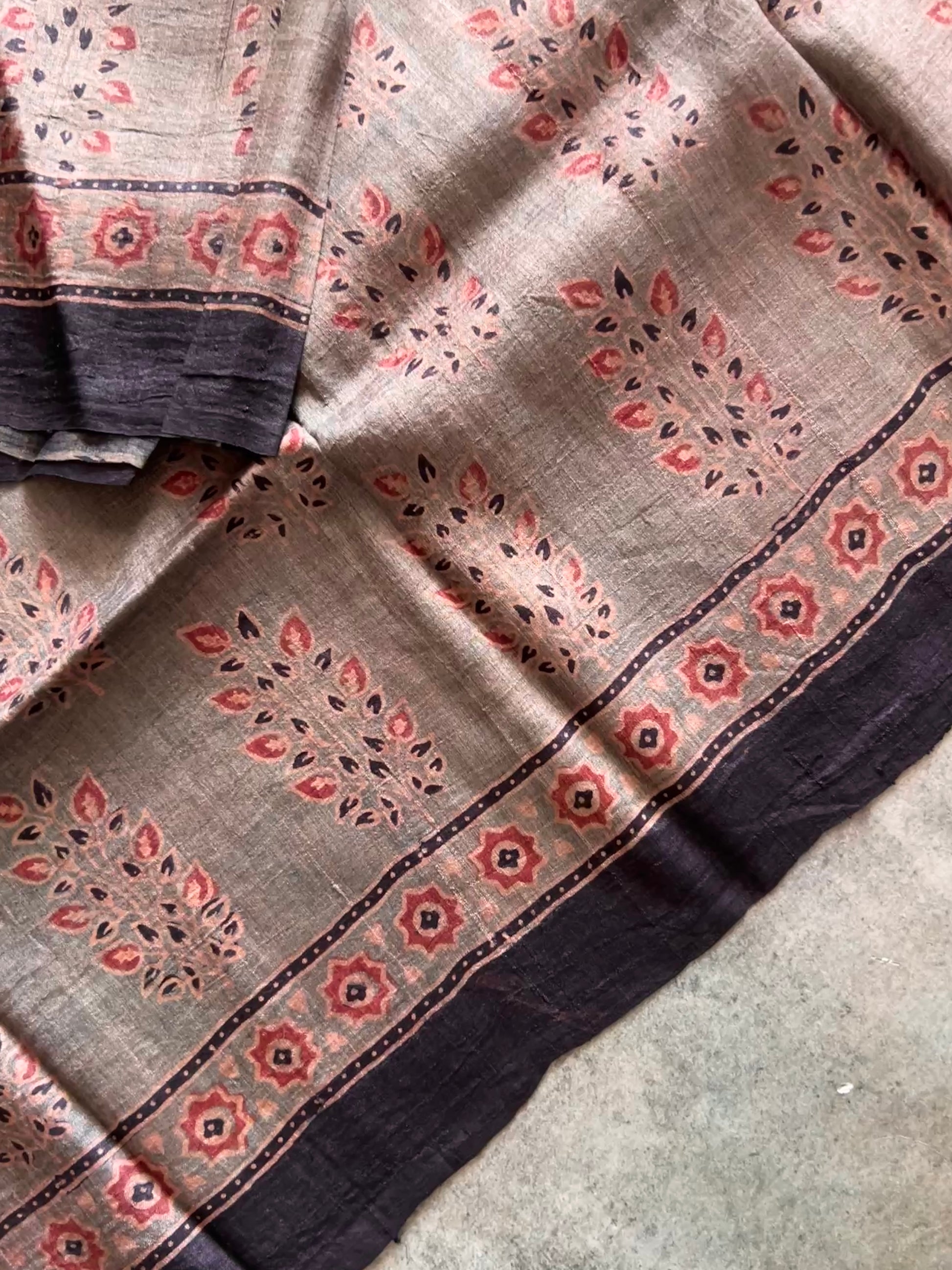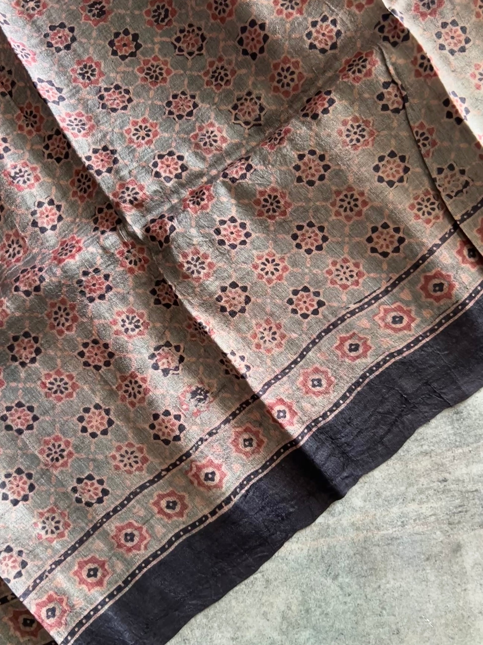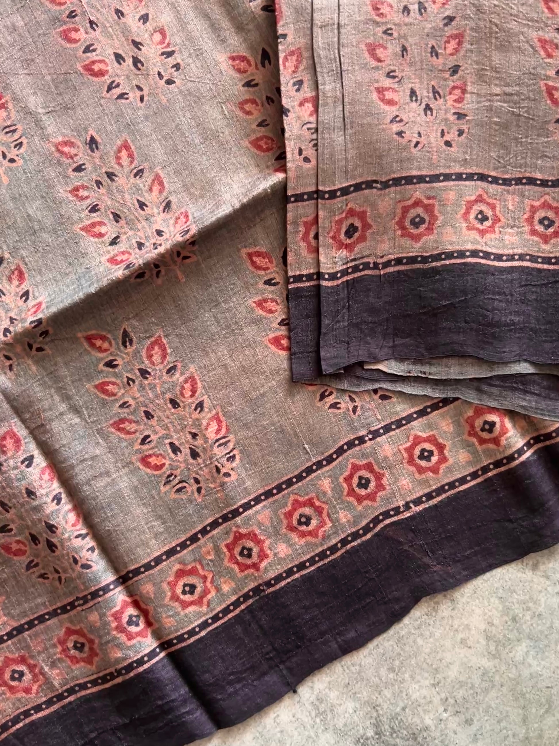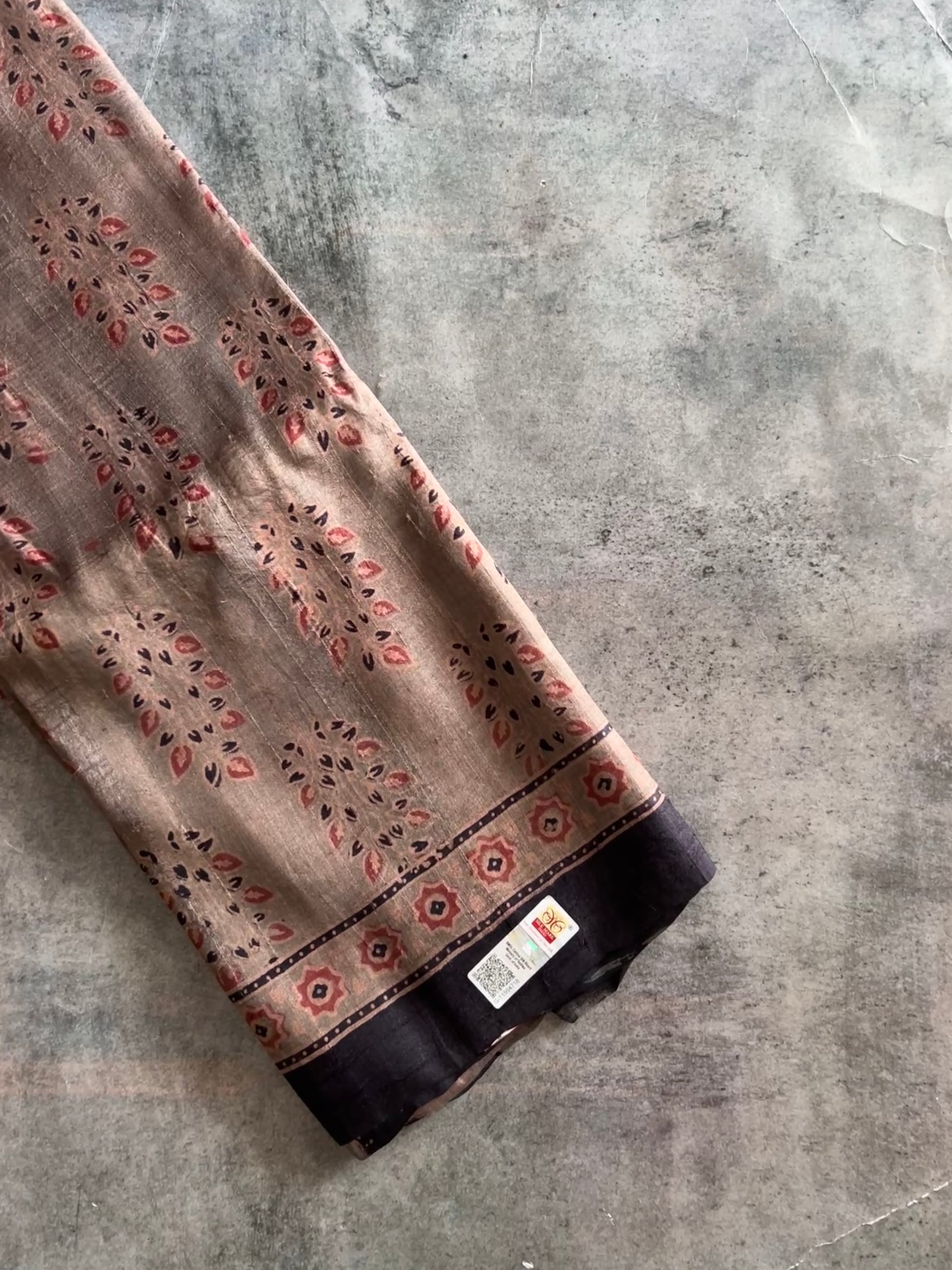 Rich, earthy hues and intricate Ajrakh block prints reflect centuries-old craftsmanship, while the natural sheen of Tussar silk adds a raw, organic elegance. The drape is both structured and fluid, making it ideal for those who appreciate heritage with a contemporary edge. It’s a saree that tells a story — bold, rooted, and beautifully timeless.
