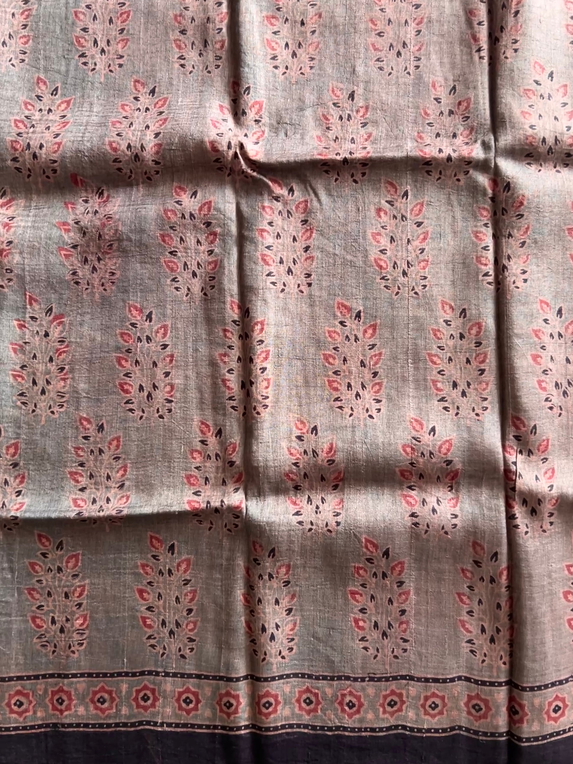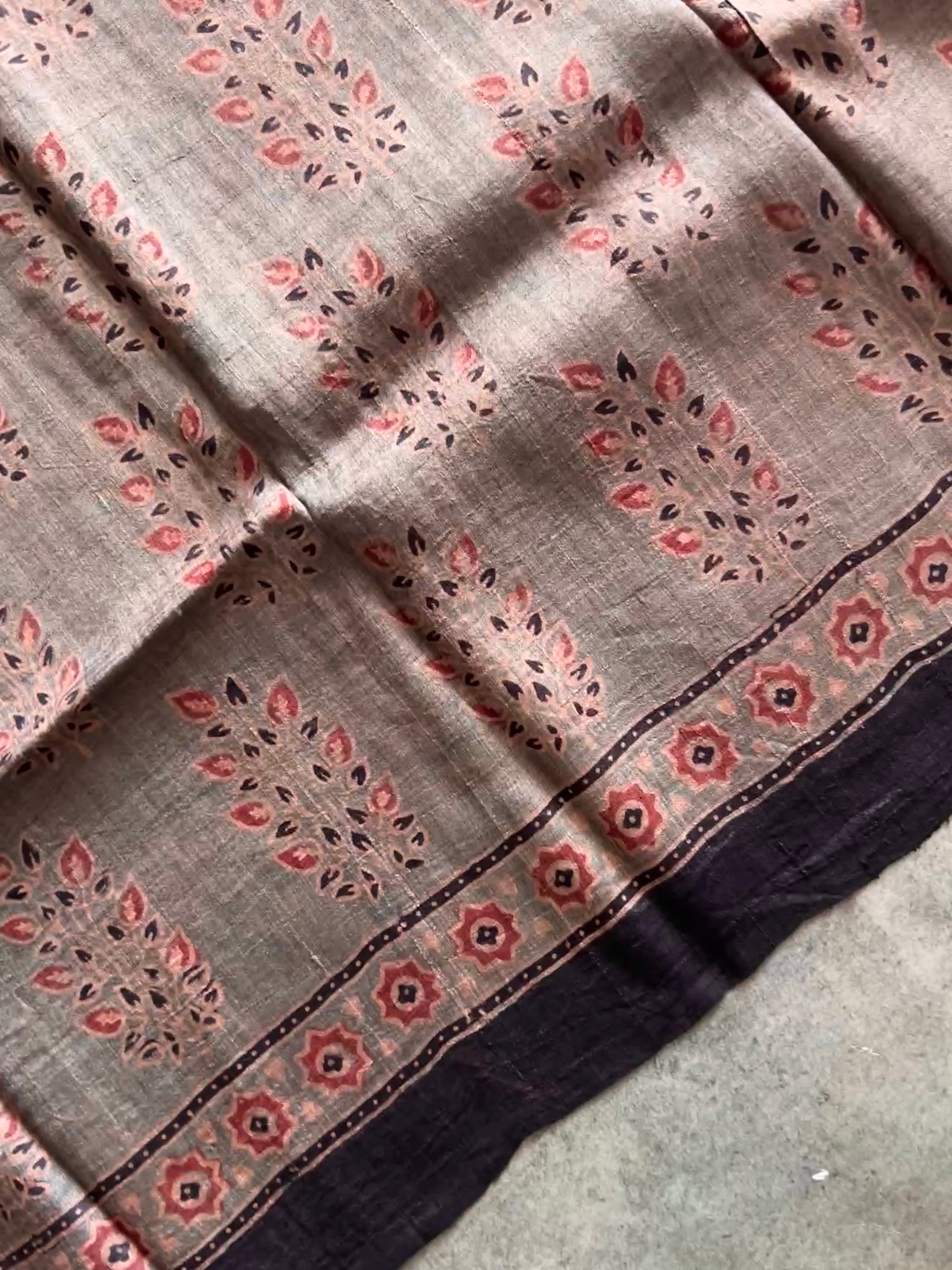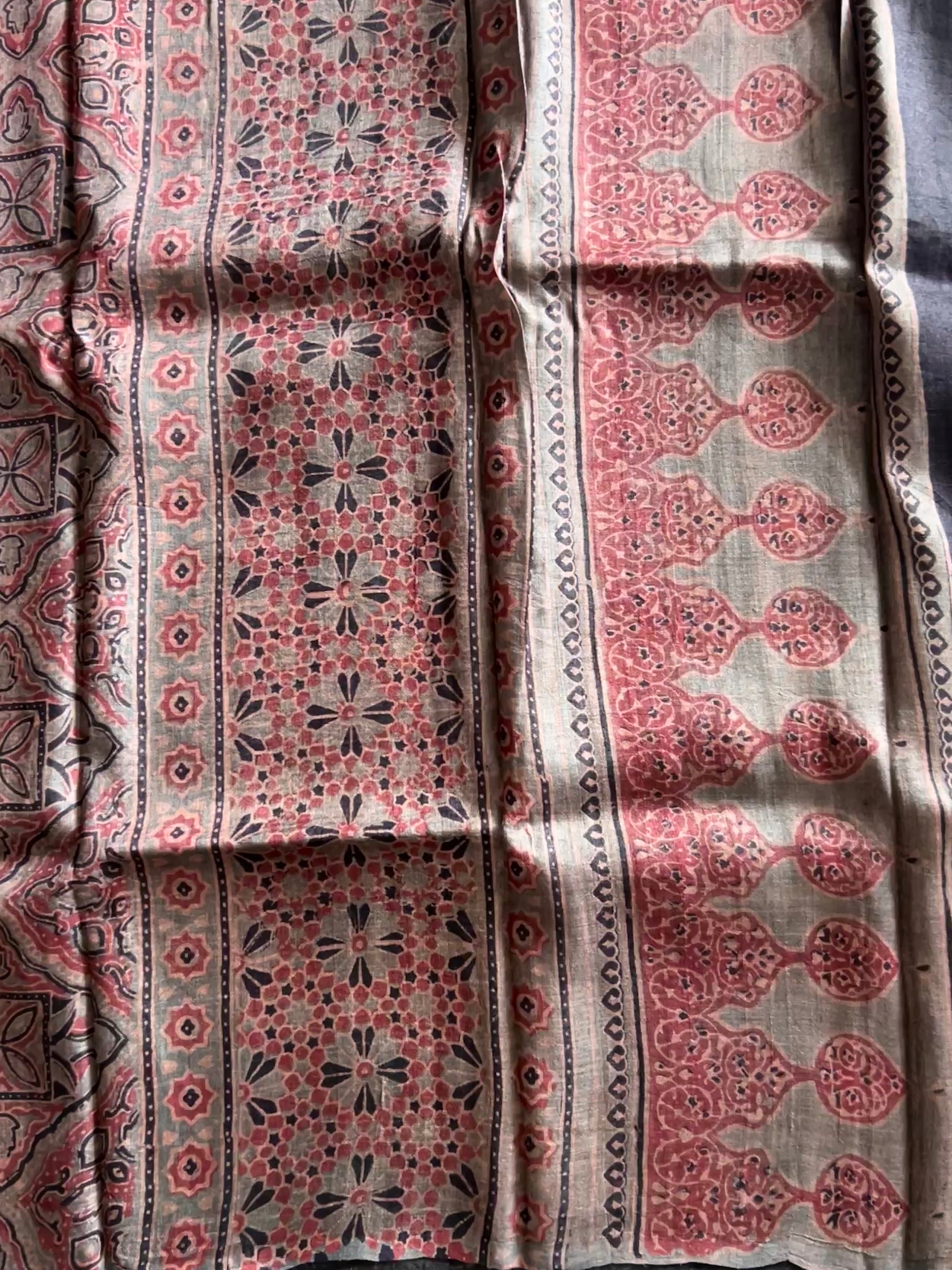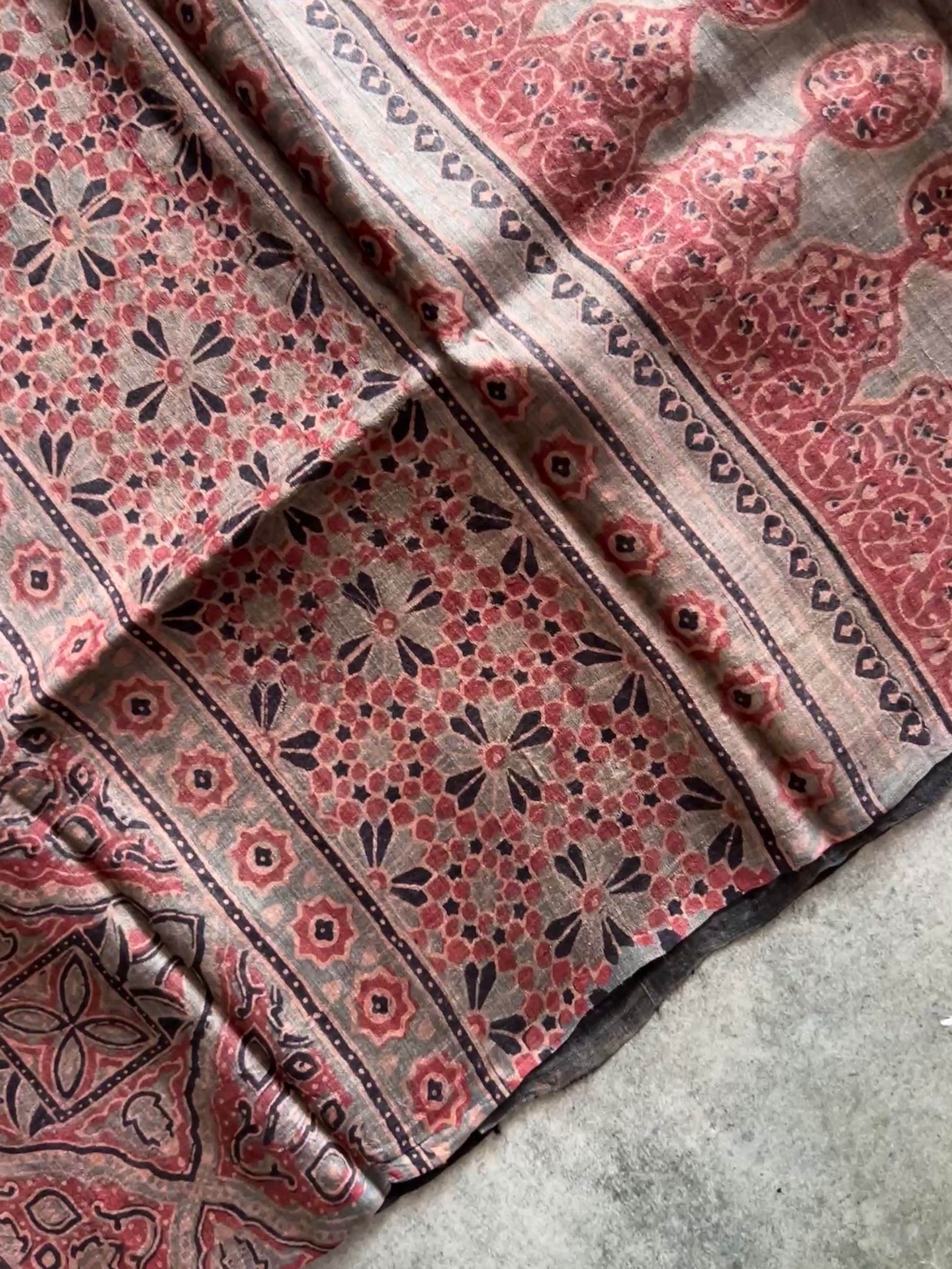 Rich, earthy hues and intricate Ajrakh block prints reflect centuries-old craftsmanship, while the natural sheen of Tussar silk adds a raw, organic elegance. The drape is both structured and fluid, making it ideal for those who appreciate heritage with a contemporary edge. It’s a saree that tells a story — bold, rooted, and beautifully timeless.