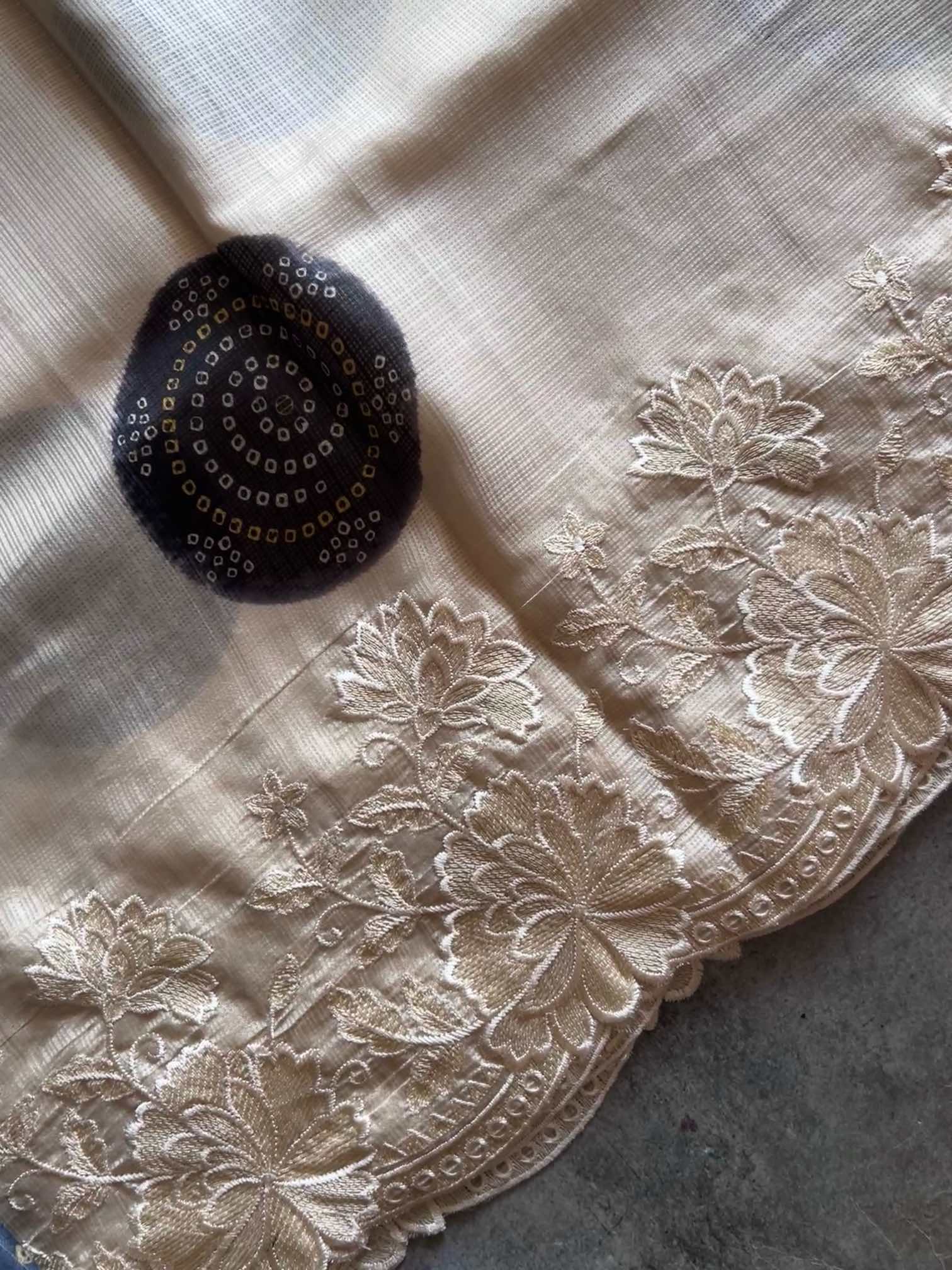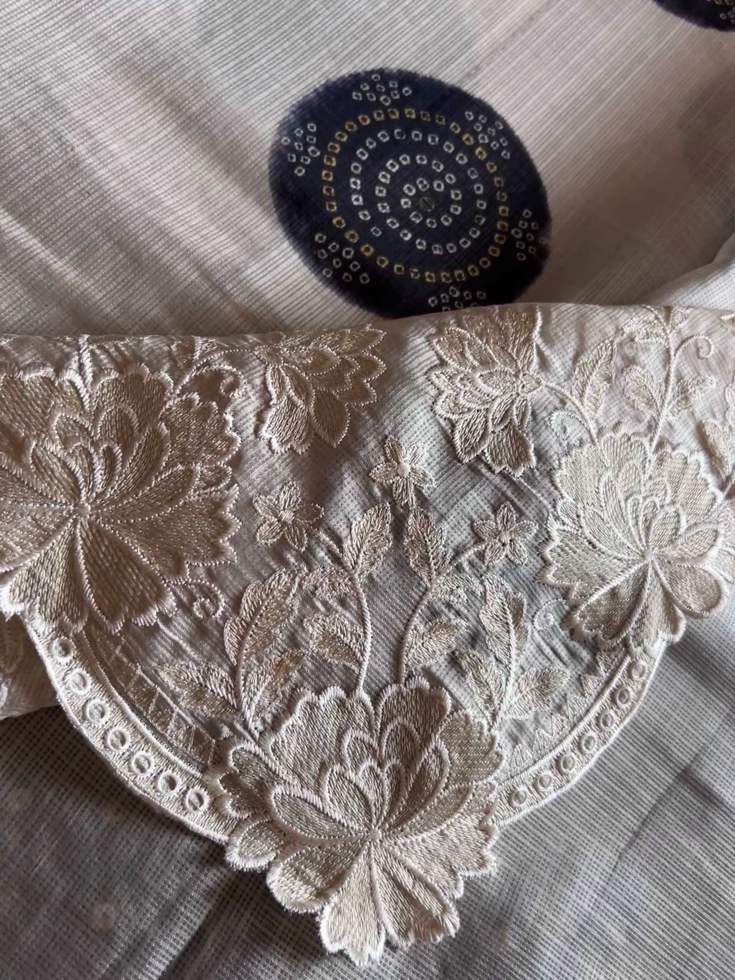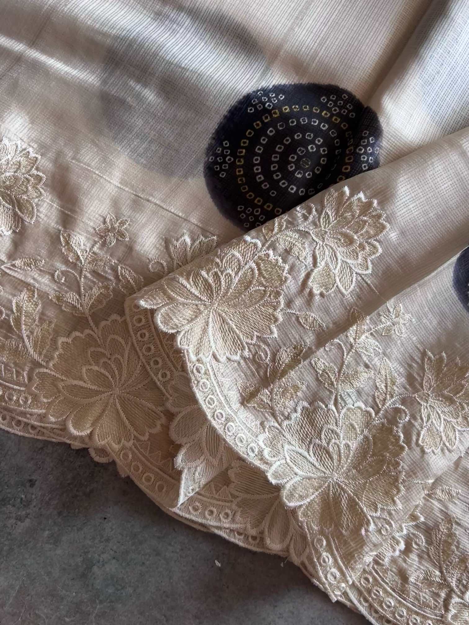 Kota silk exudes an airy elegance, its sheer texture lending a graceful lightness to every drape. The intricately embroidered border adds a touch of regal charm, while the Bandhni prints scattered across the body bring vibrant tradition and timeless artistry together in perfect harmony.