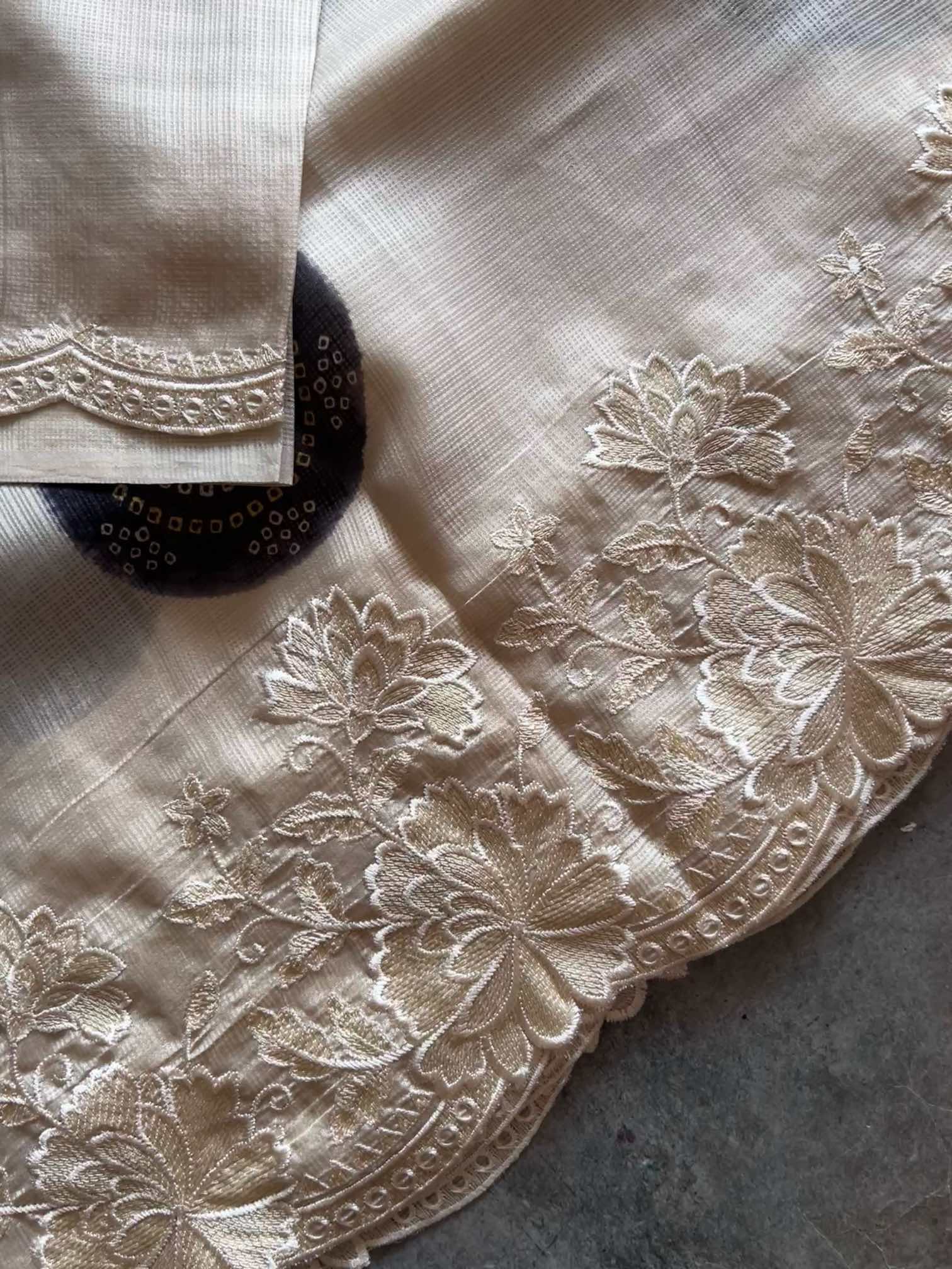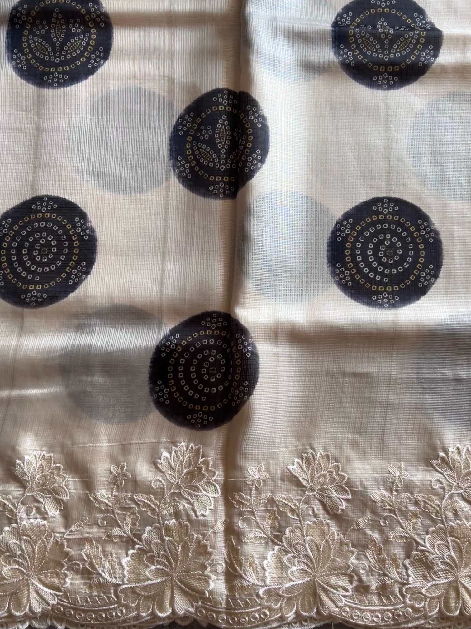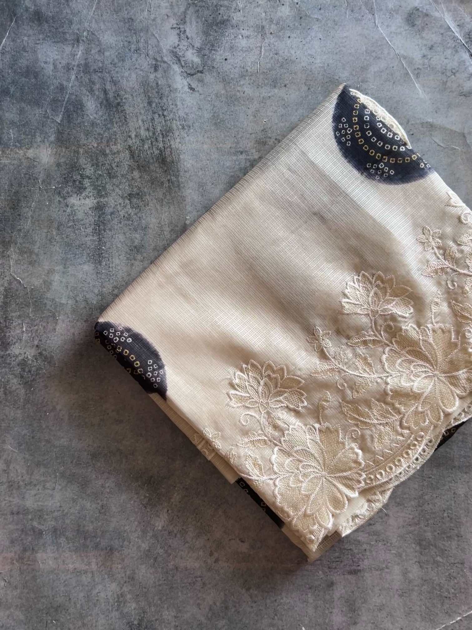 Kota silk exudes an airy elegance, its sheer texture lending a graceful lightness to every drape. The intricately embroidered border adds a touch of regal charm, while the Bandhni prints scattered across the body bring vibrant tradition and timeless artistry together in perfect harmony.
