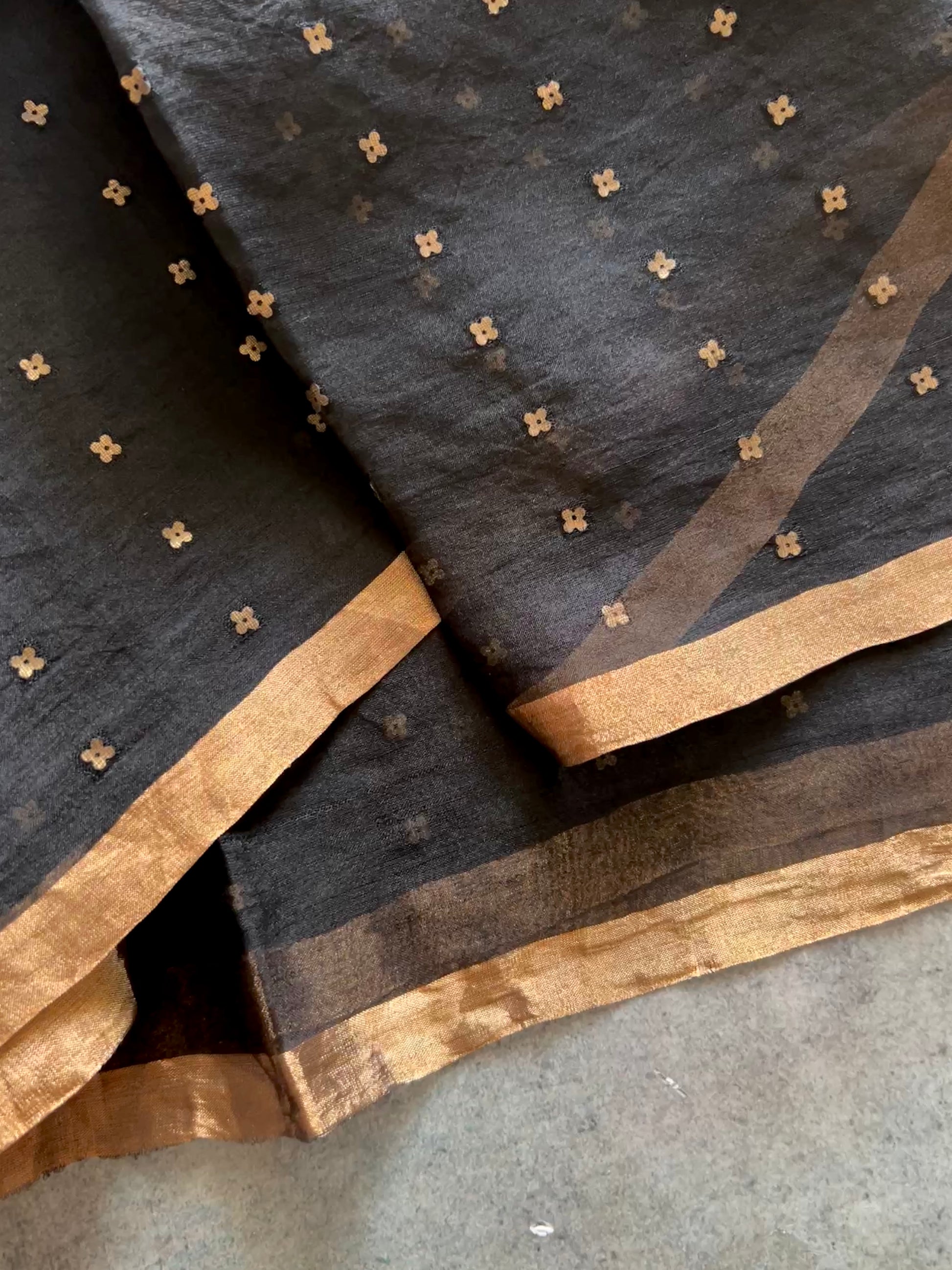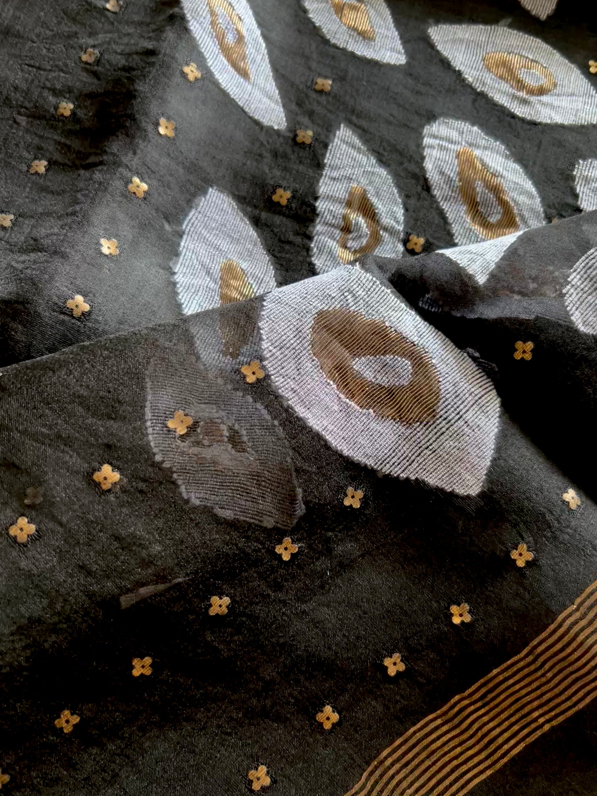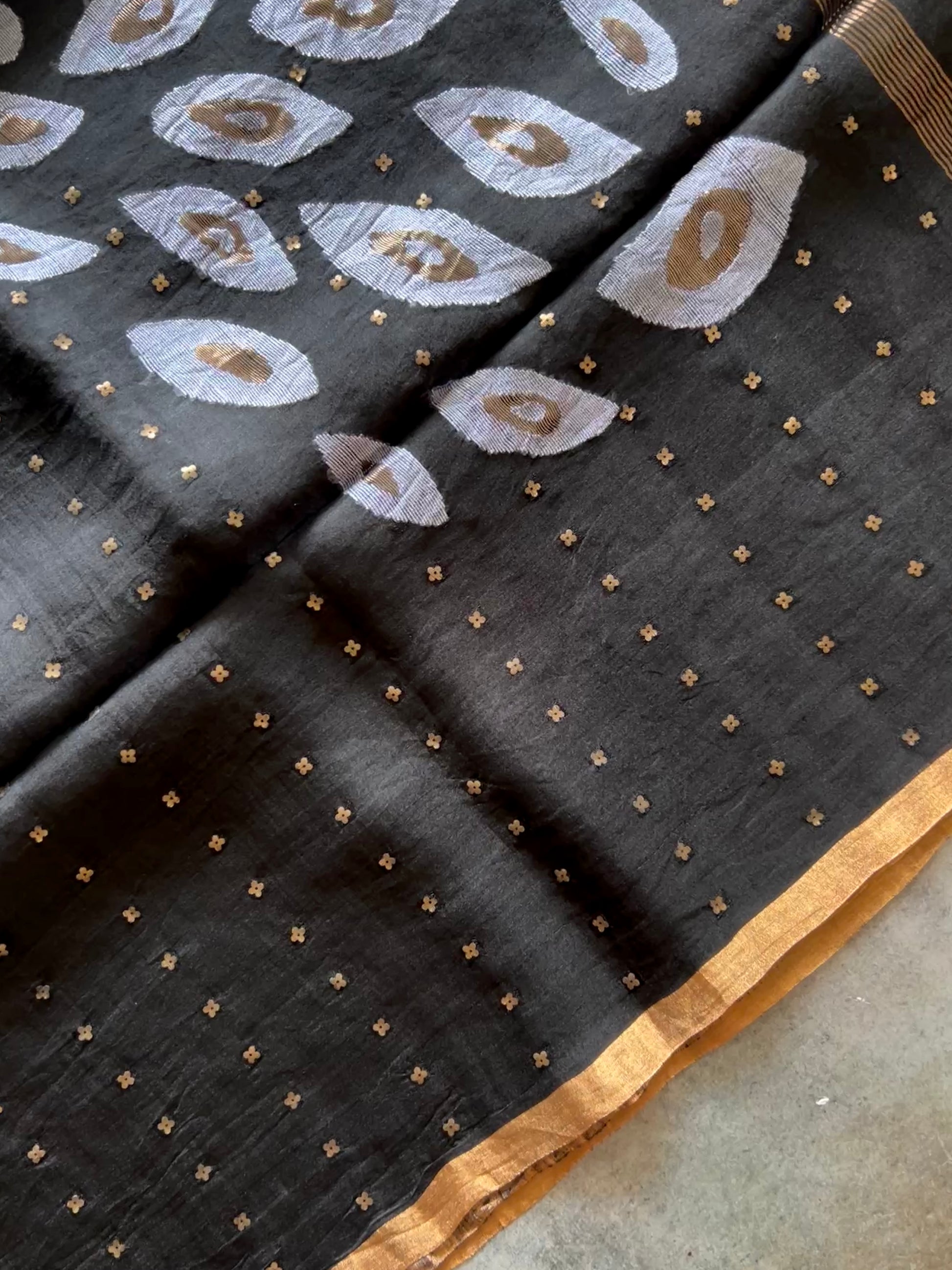 The delicate sheen of the Muslin silk fabric, renowned for its softness and lightweight nature, drapes gracefully, enhancing the wearer's beauty. The sequence work adds a subtle yet mesmerizing sparkle, elevating the saree with a modern touch of glamour while maintaining its traditional essence. The Jamdani Pallu , handwoven with intricate patterns, brings an exquisite cultural richness to the saree. The combination of these elements creates a perfect balance between luxurious opulence and traditional artistry, making the saree a stunning choice for weddings, festivals, or any special occasion.