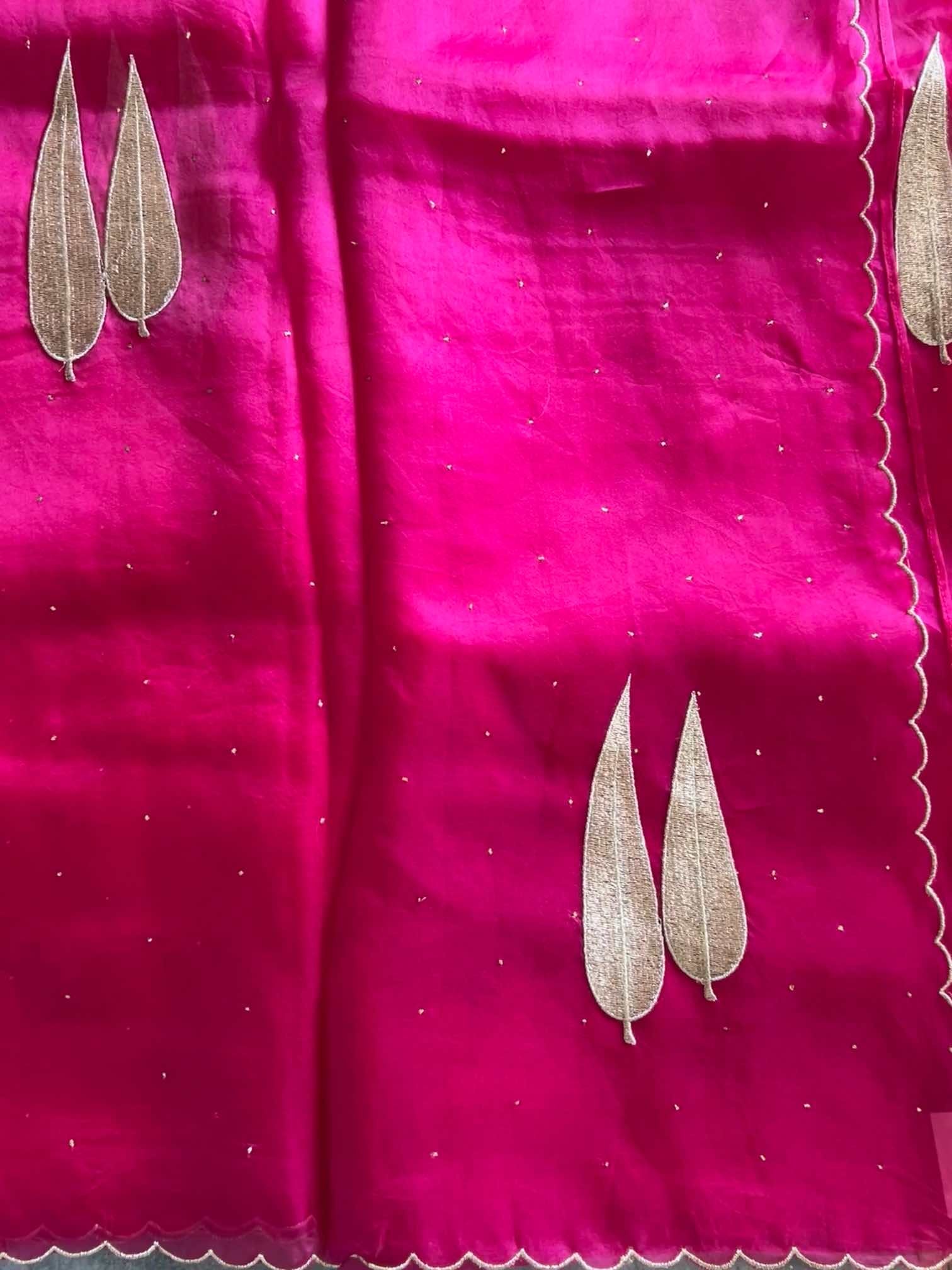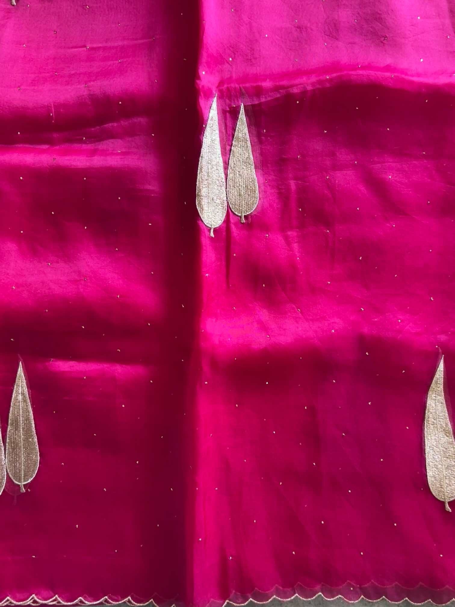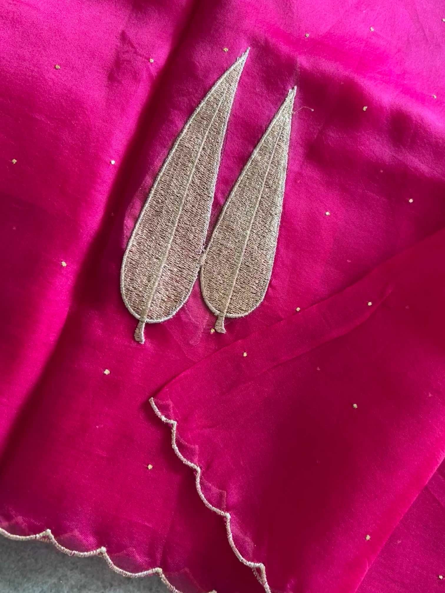 An organza silk saree shimmers with sheer elegance, light and luminous in every drape. The all-over Mukesh work adds a subtle sparkle, while the leaf-shaped appliqué in rich gold thread brings a touch of regal artistry. Finished with delicate scalloped edging, the saree feels exquisitely graceful—where fine craftsmanship meets timeless beauty.