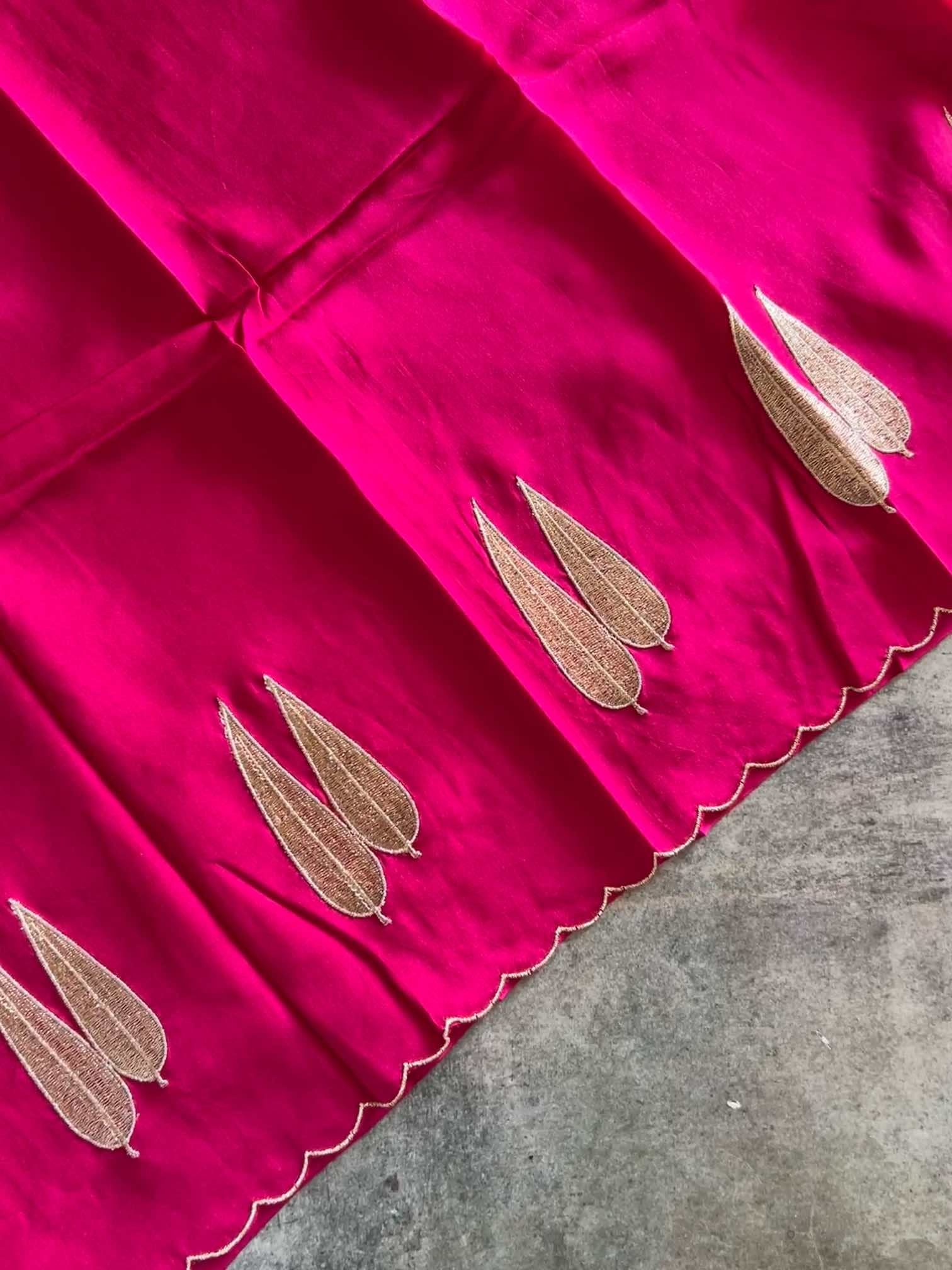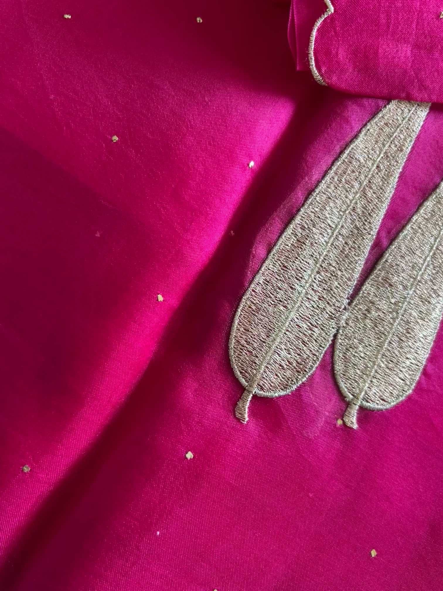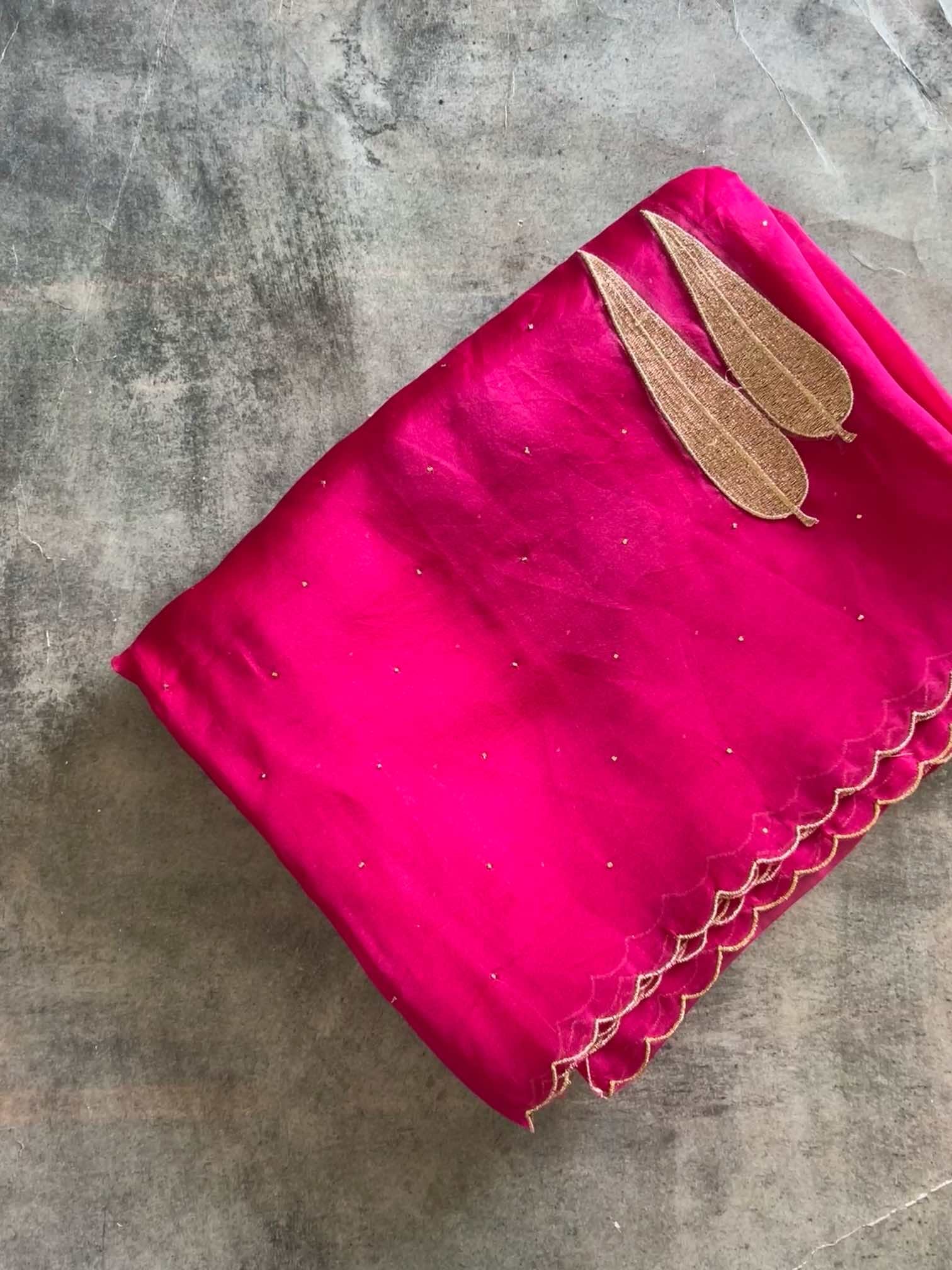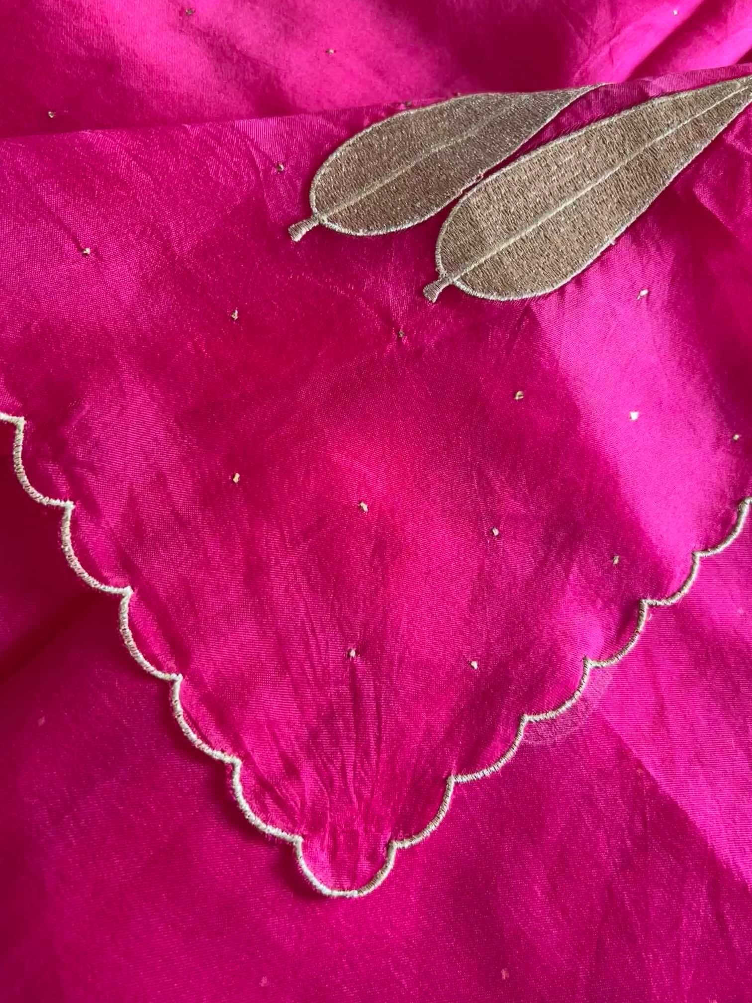 An organza silk saree shimmers with sheer elegance, light and luminous in every drape. The all-over Mukesh work adds a subtle sparkle, while the leaf-shaped appliqué in rich gold thread brings a touch of regal artistry. Finished with delicate scalloped edging, the saree feels exquisitely graceful—where fine craftsmanship meets timeless beauty.