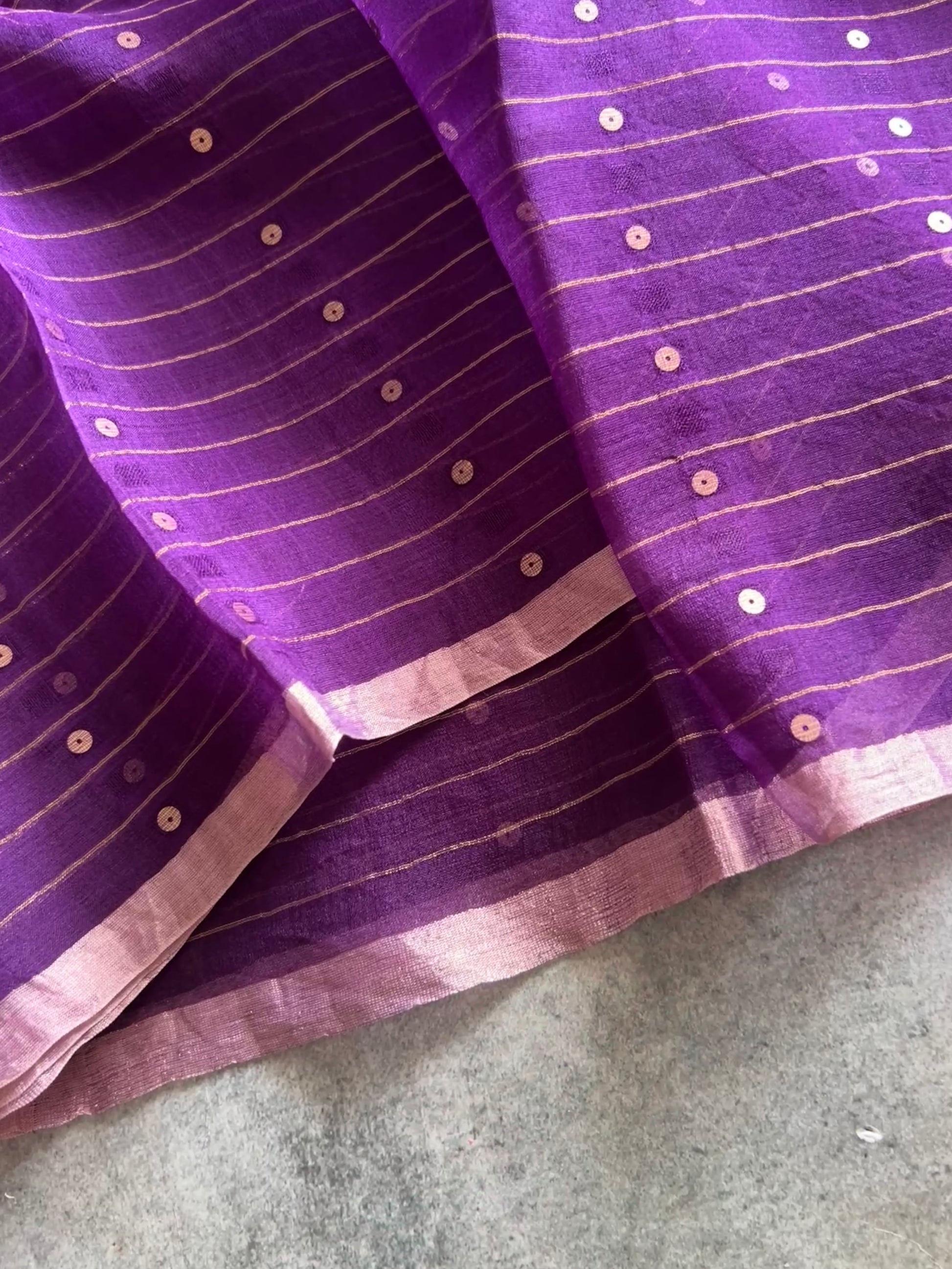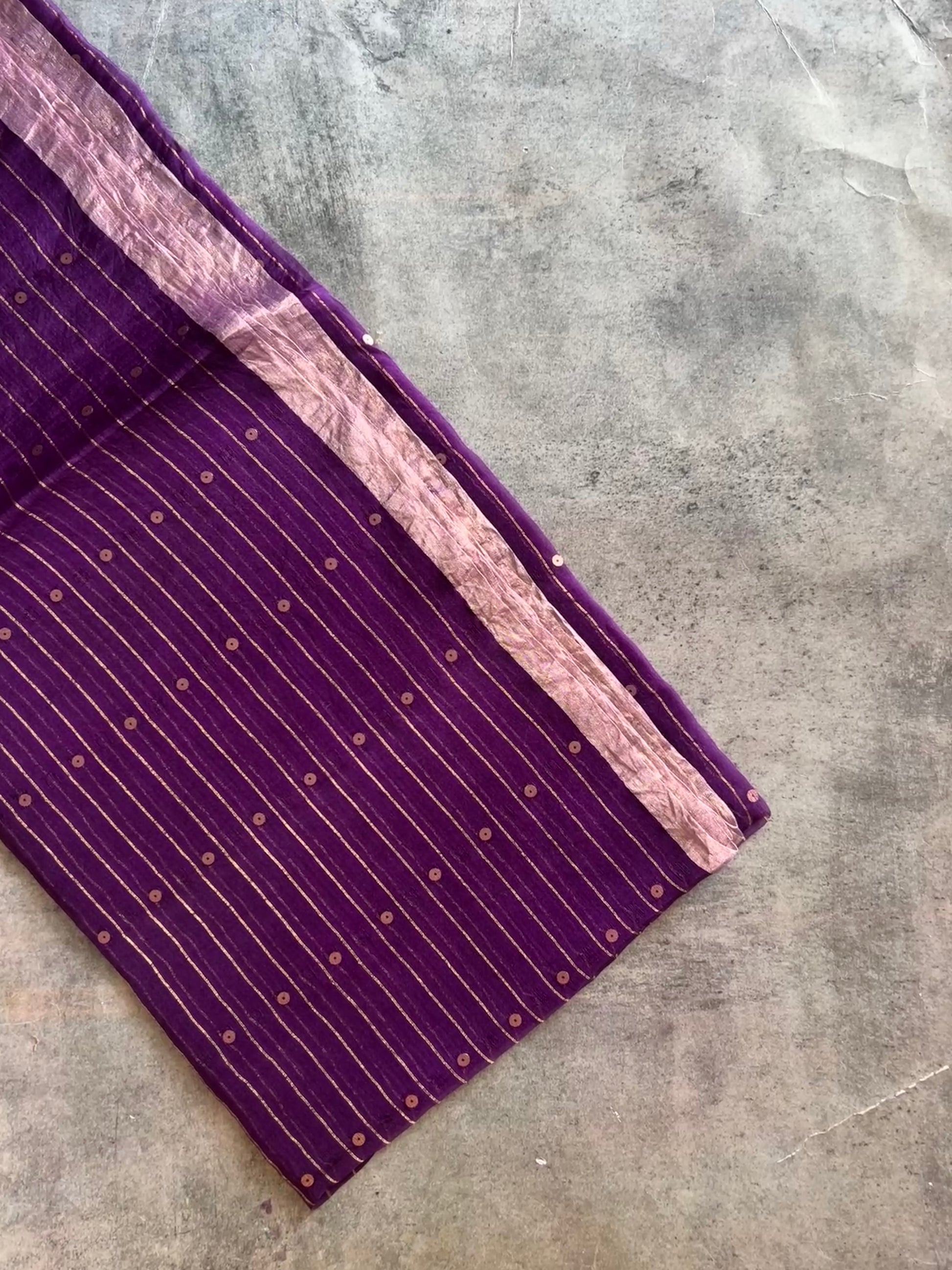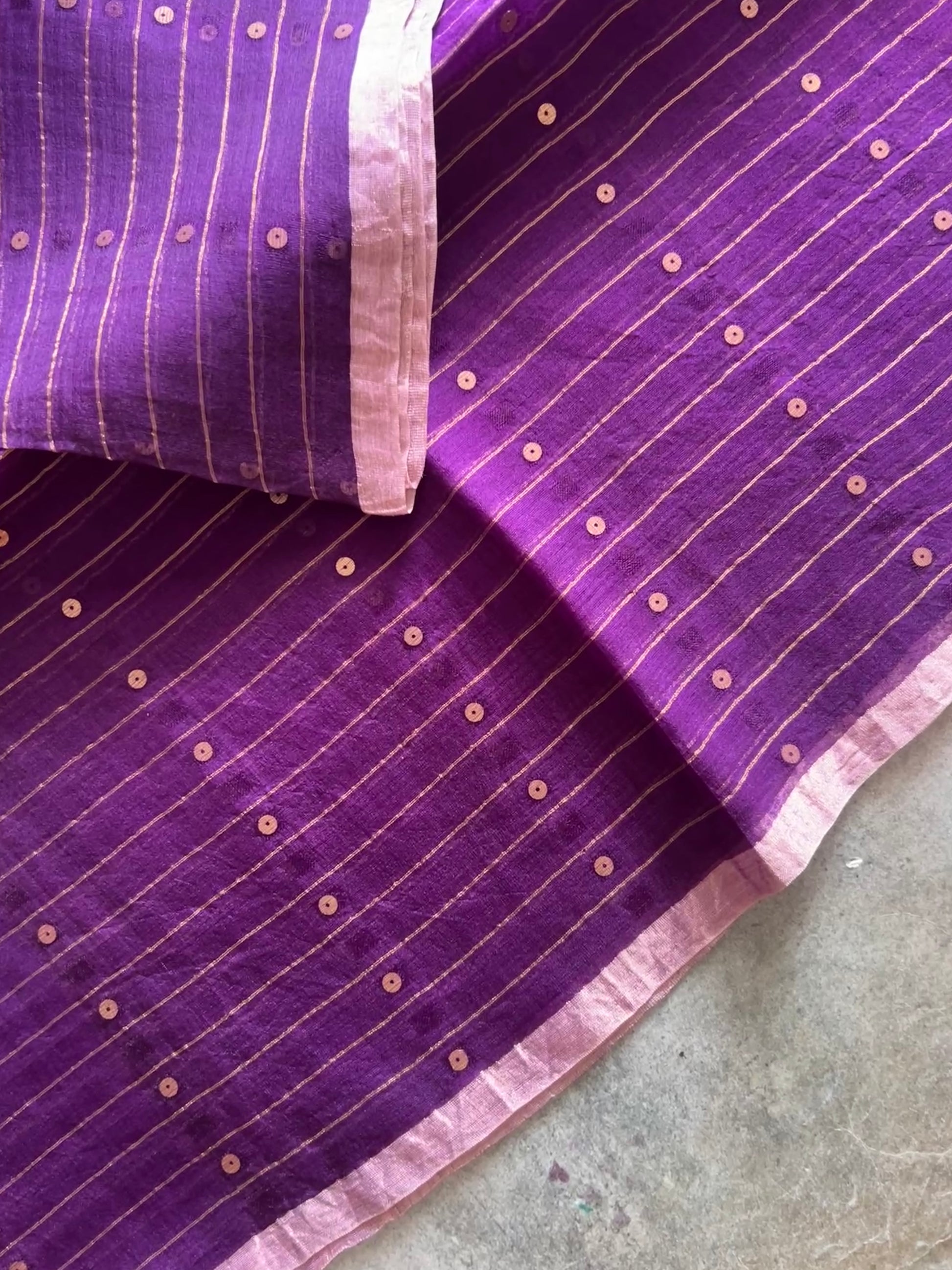 The muslin silk, known for its feather-light texture and smooth finish, drapes like a whisper, while the gini work—fine metallic detailing—adds a gentle sparkle throughout. With its subtle elegance and intricate craftsmanship, this saree captures the essence of understated luxury, making it perfect for both festive and formal occasions.