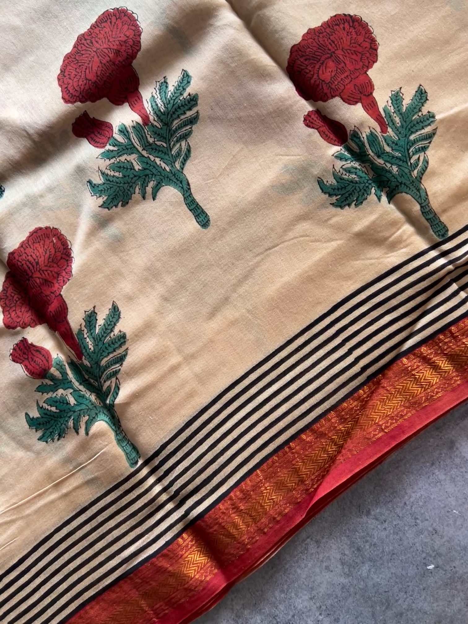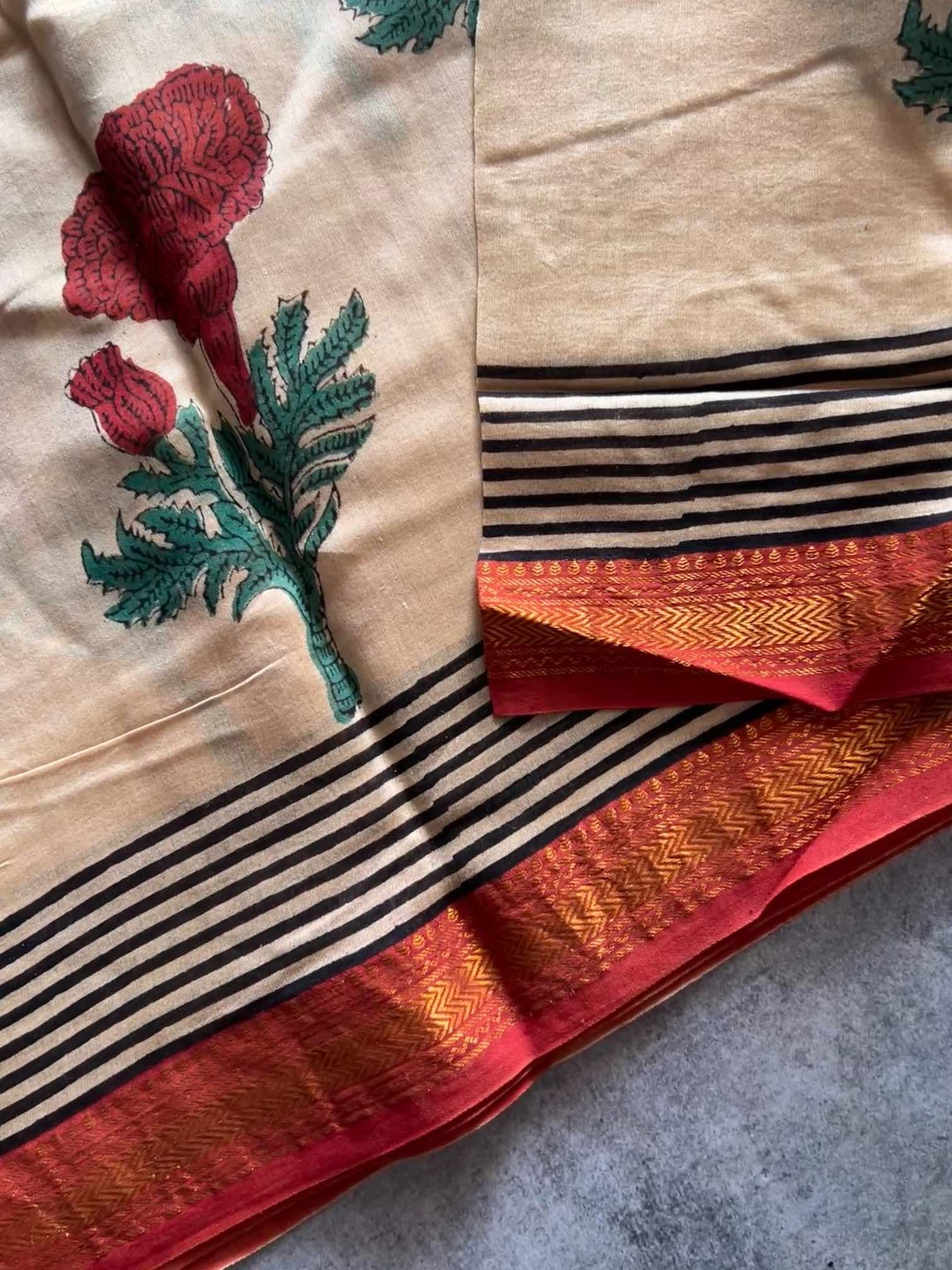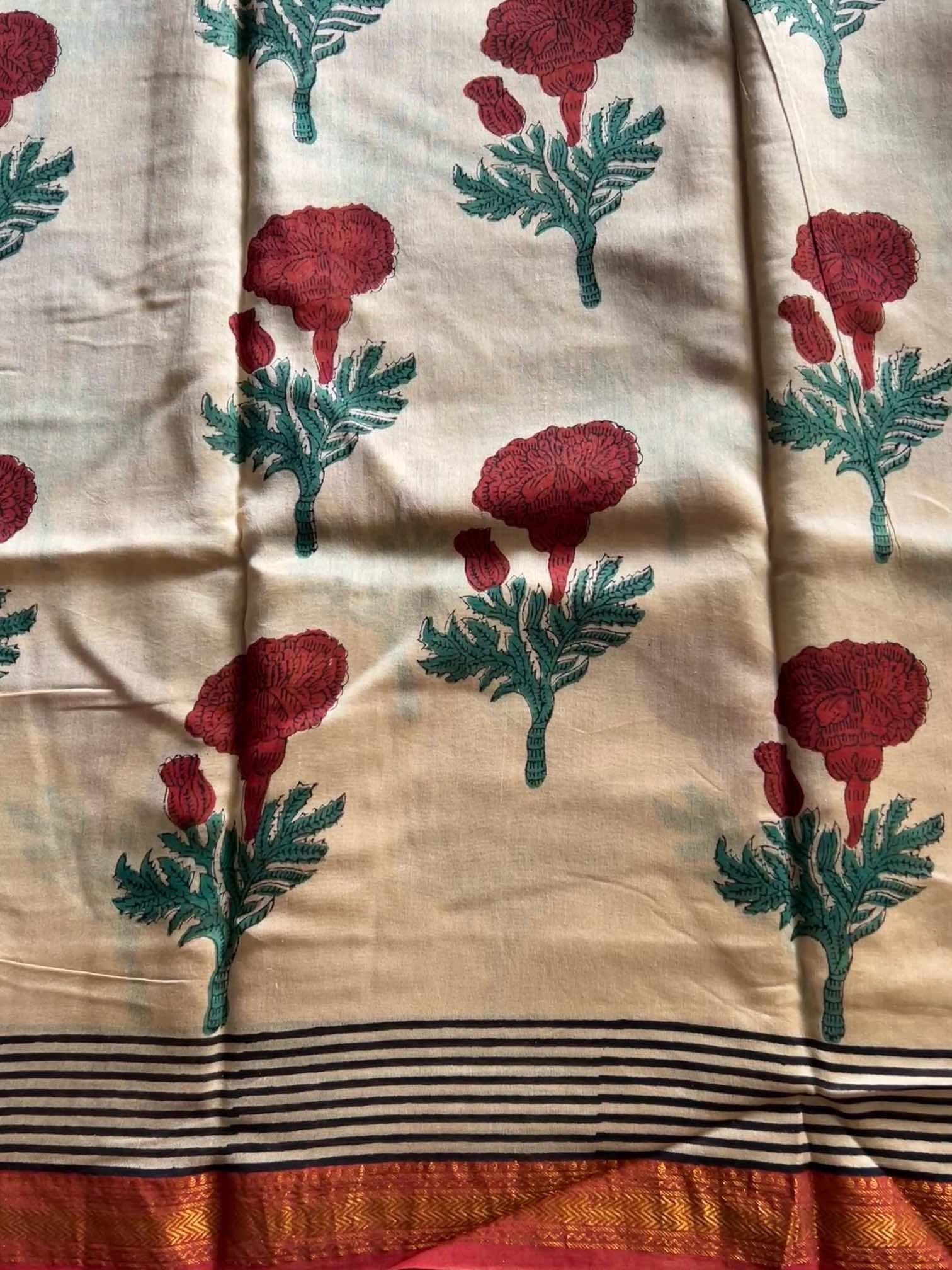Elegant and classy handblock printed maheswari cotton silk saree. These exquisite pieces are very comfortable to wear and feels extremely soft and classy when draped.