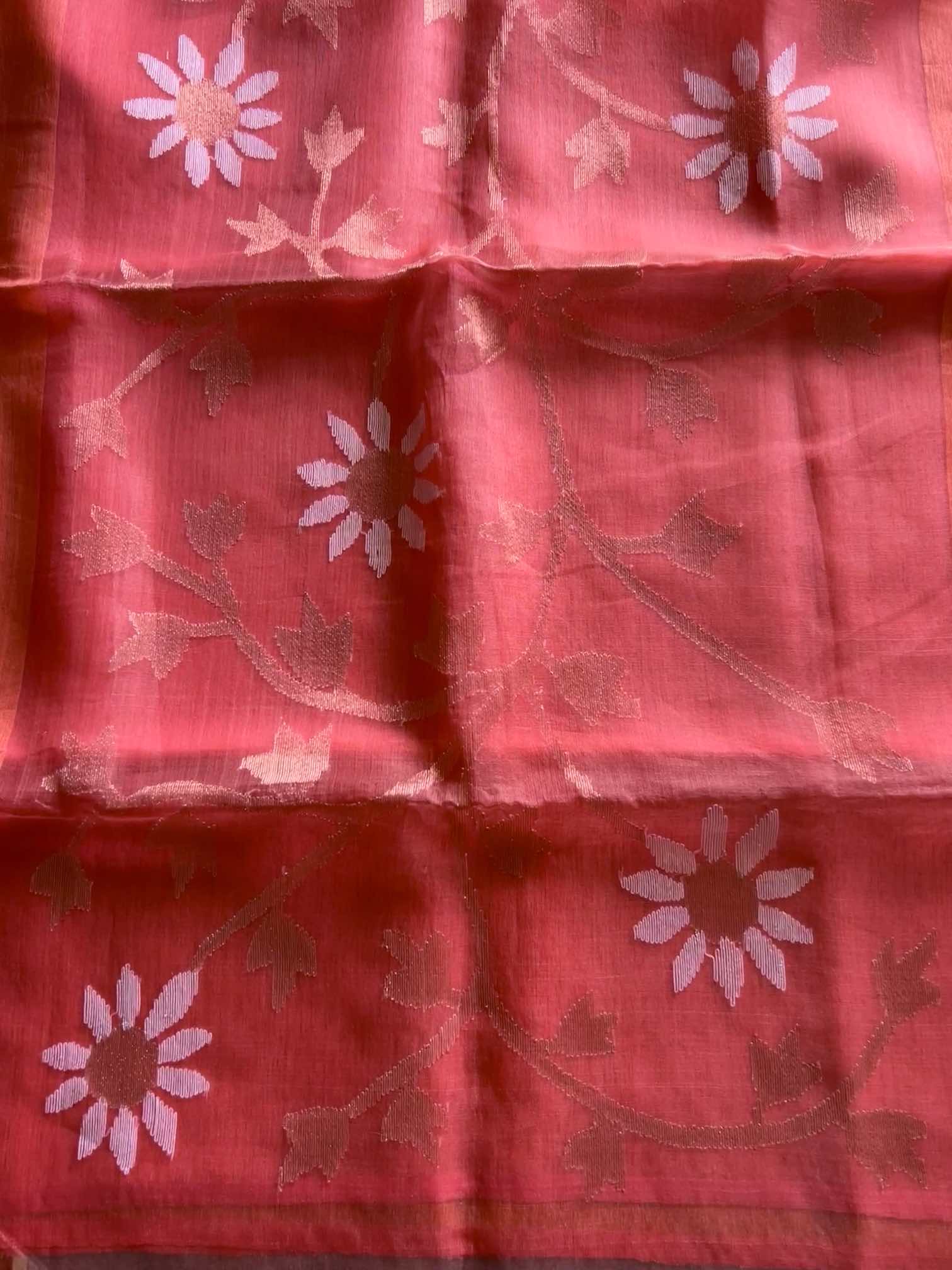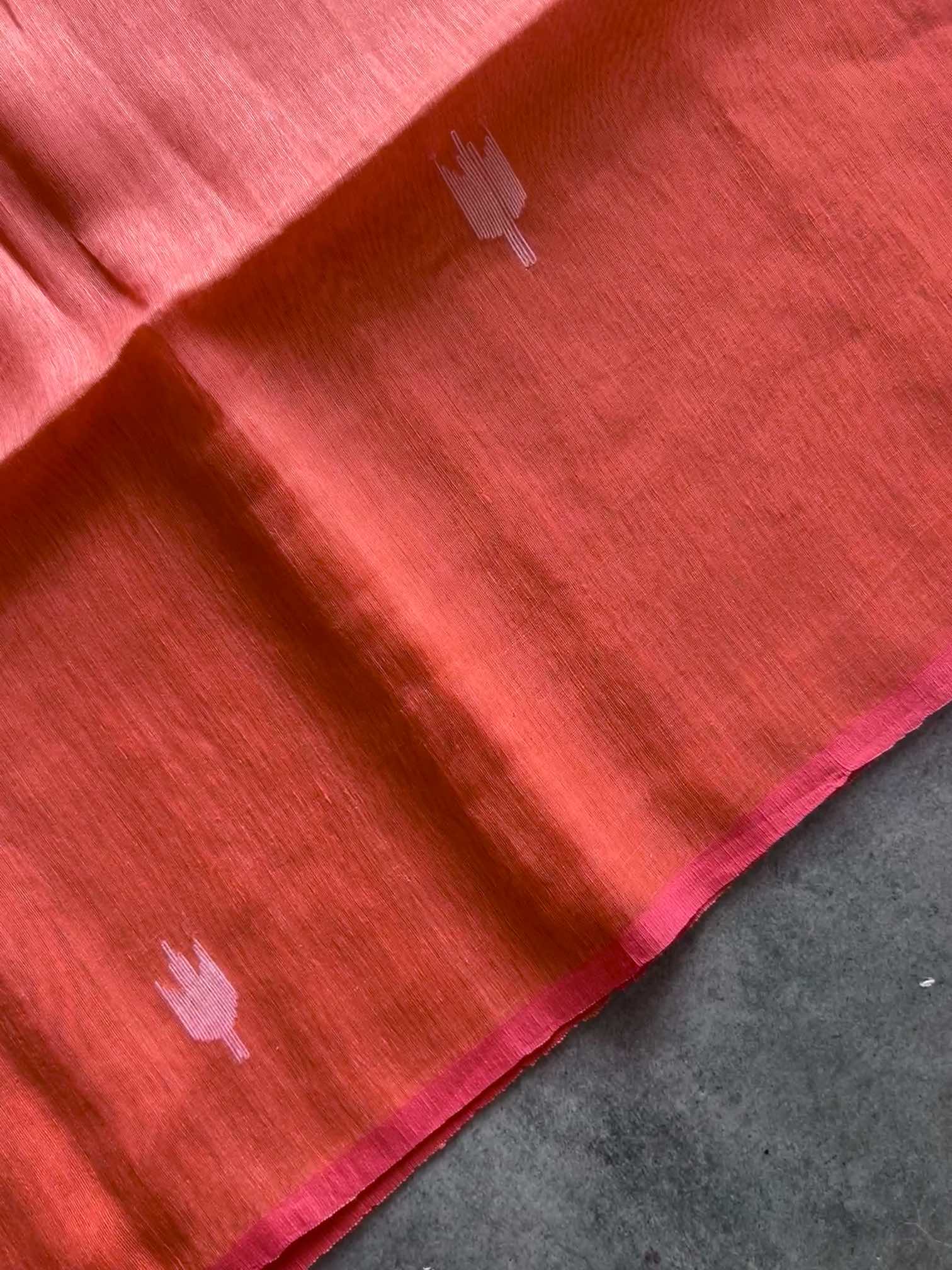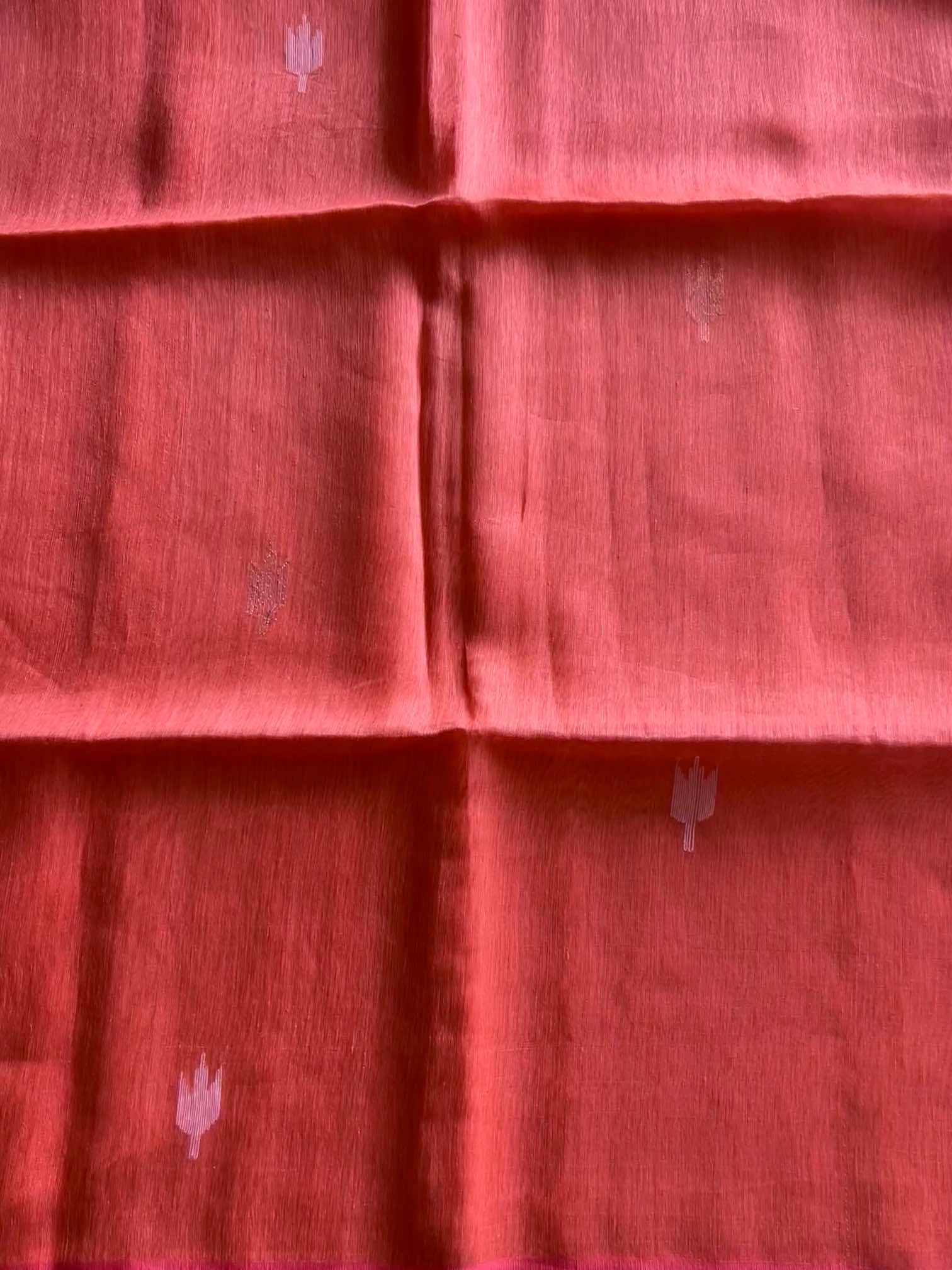 A linen silk saree with a muslin pallu adorned in Jamdani weave is pure poetry in fabric—light, breathable elegance paired with intricate handwoven artistry. The soft sheen of linen silk meets the airy grace of muslin, while the Jamdani motifs add a whisper of heritage, making the drape effortlessly refined and timeless.