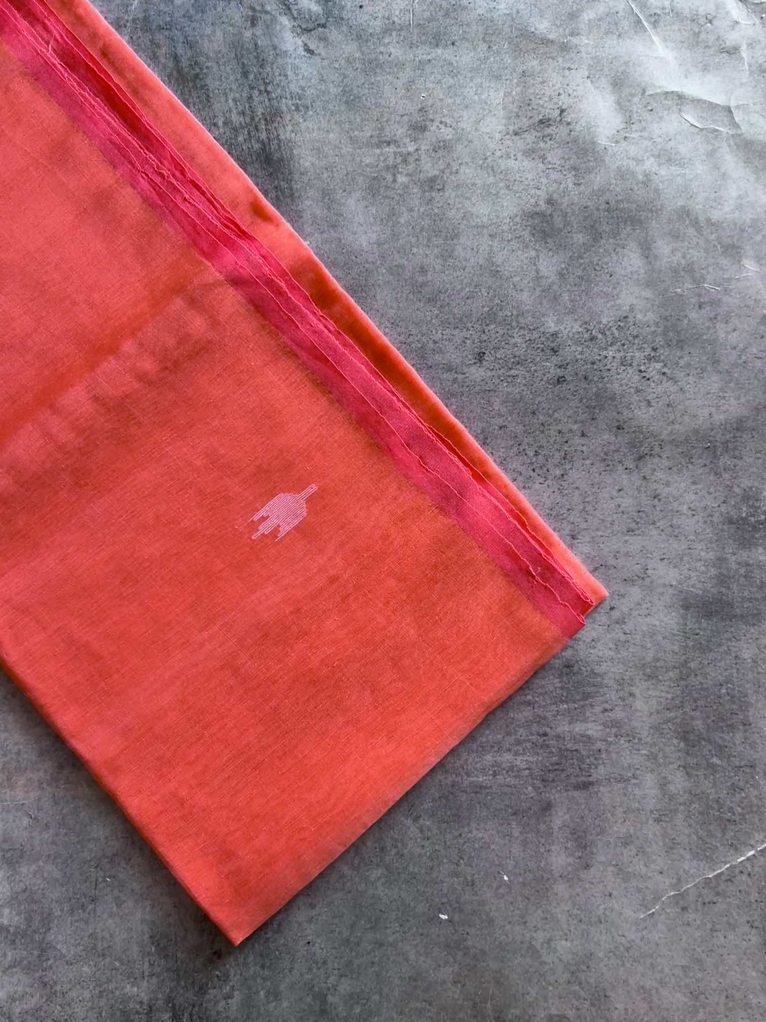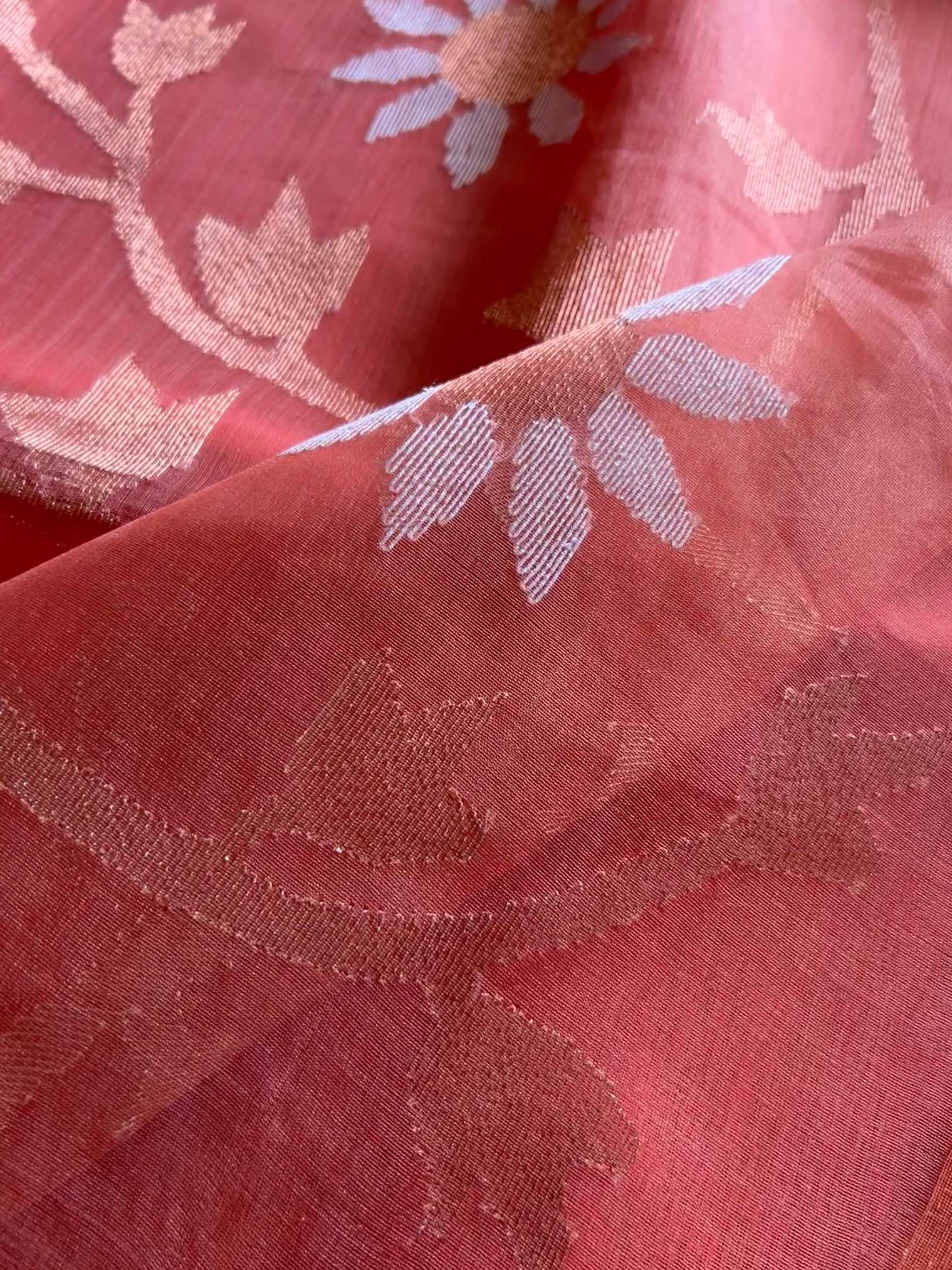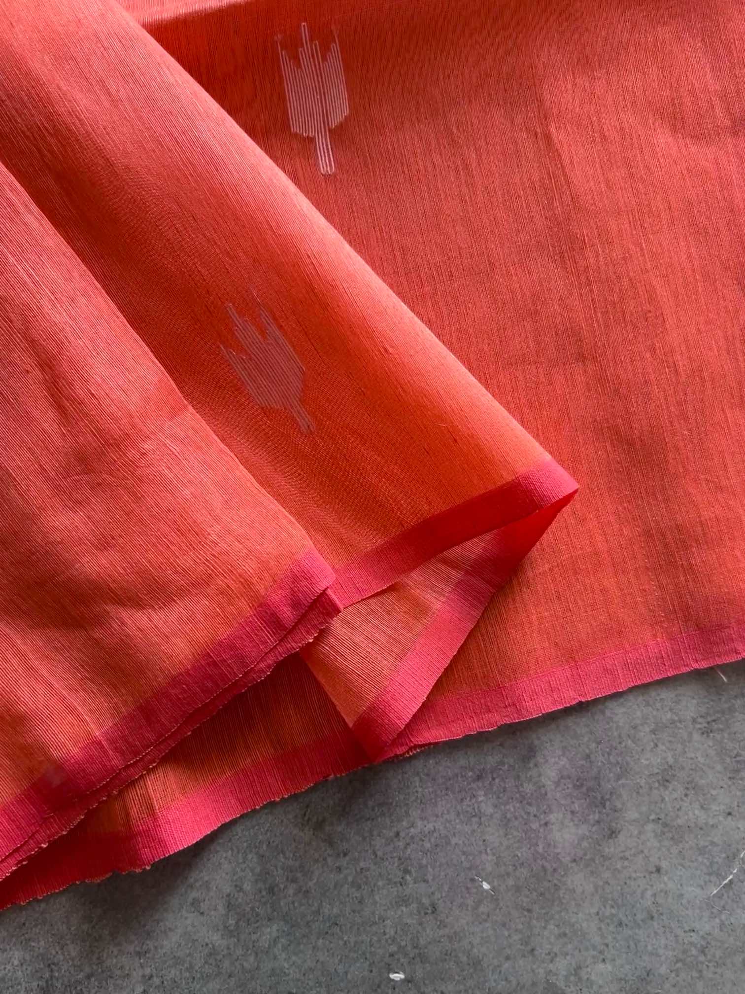 A linen silk saree with a muslin pallu adorned in Jamdani weave is pure poetry in fabric—light, breathable elegance paired with intricate handwoven artistry. The soft sheen of linen silk meets the airy grace of muslin, while the Jamdani motifs add a whisper of heritage, making the drape effortlessly refined and timeless.