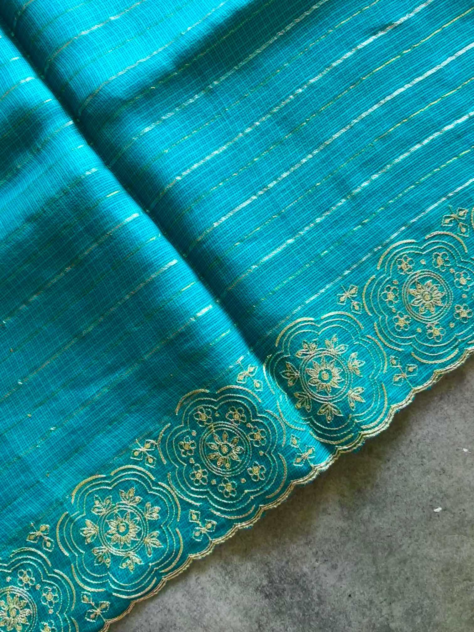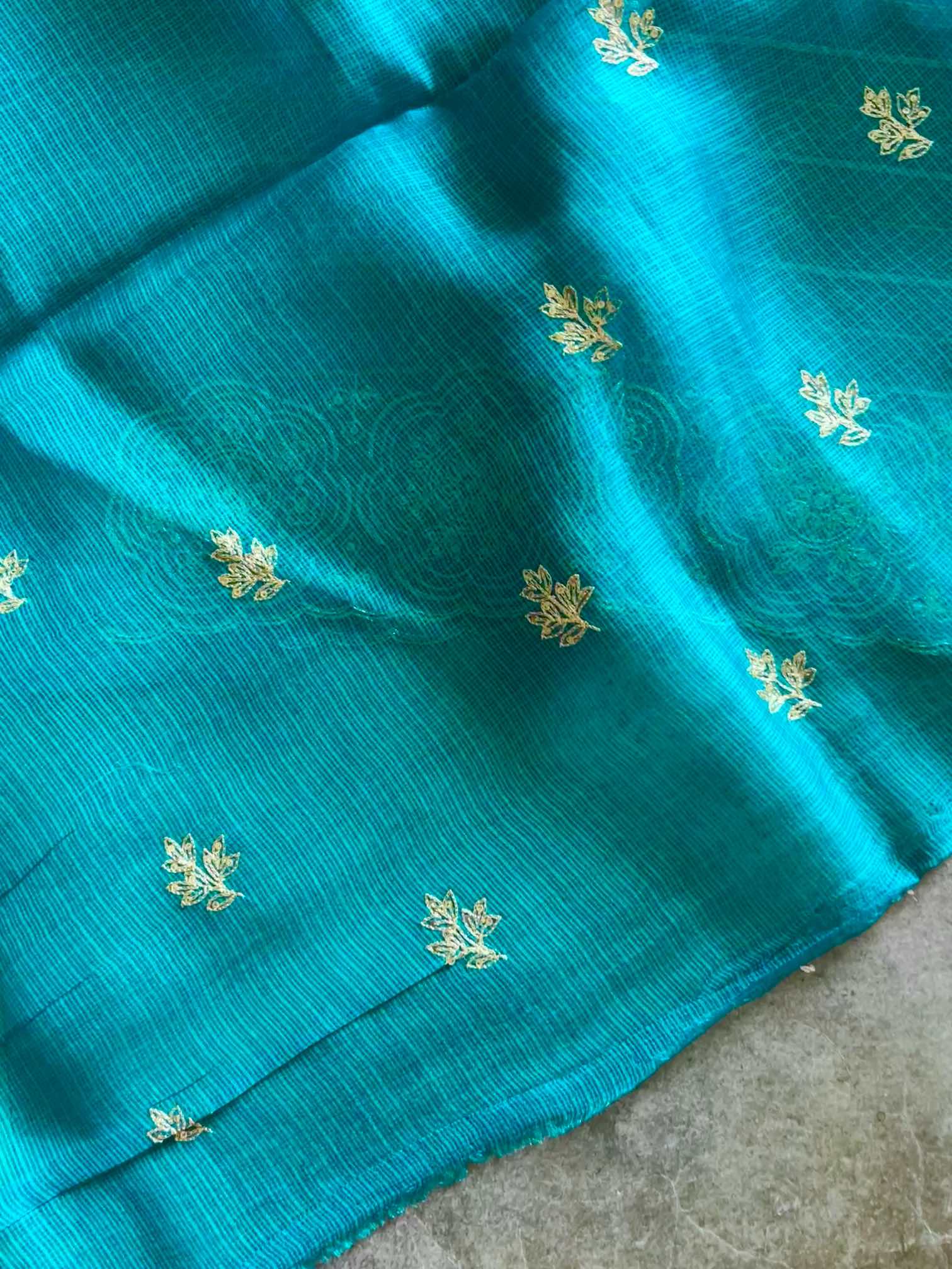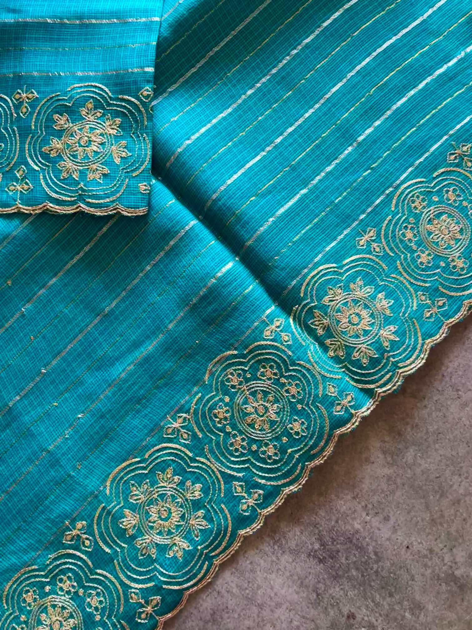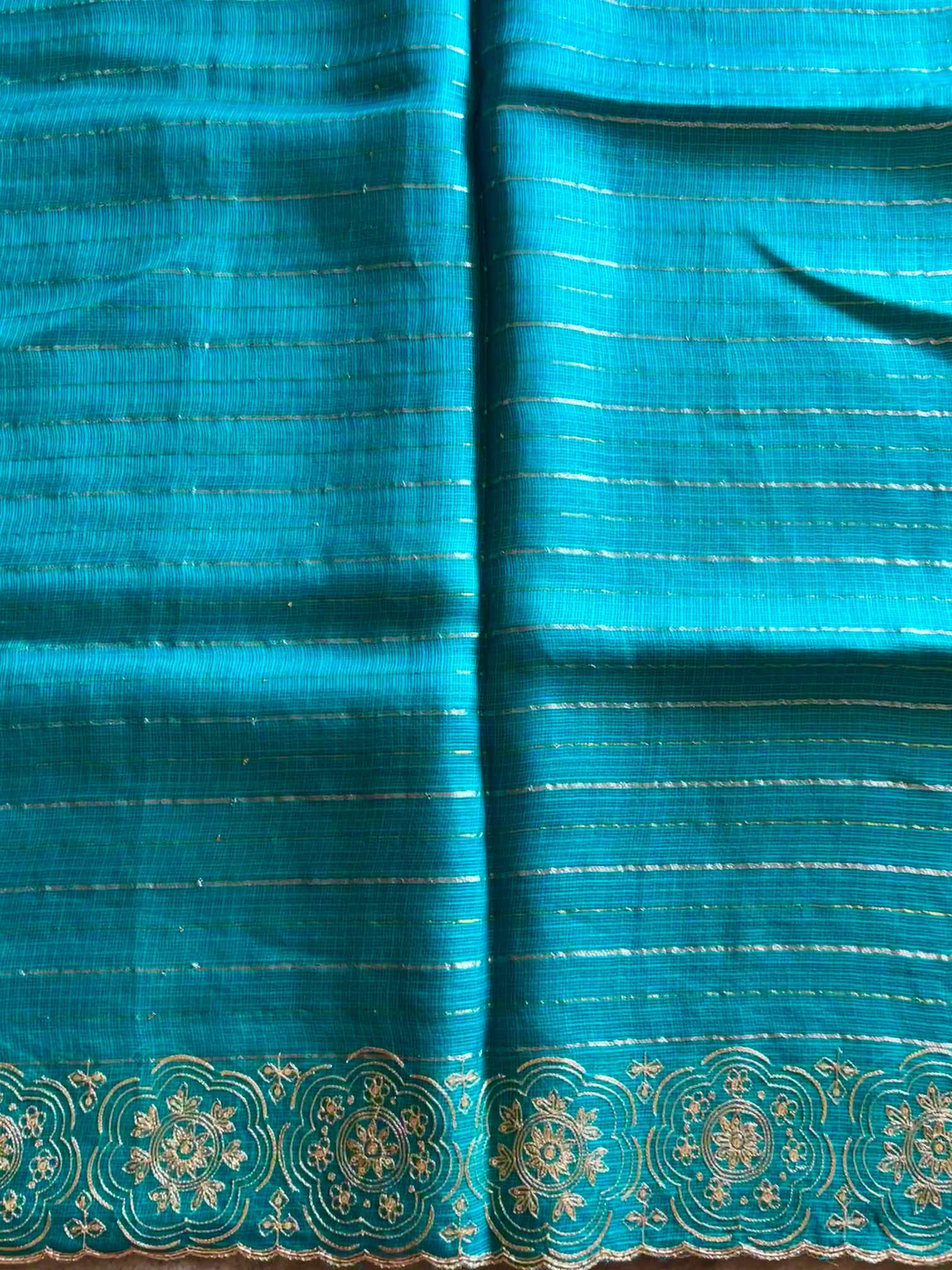 The Kota silk saree shimmers with quiet elegance, its gold and silver stripes catching the light like soft poetry. Delicate silver embroidery along the border adds a regal finish, blending tradition with timeless grace in every fold.