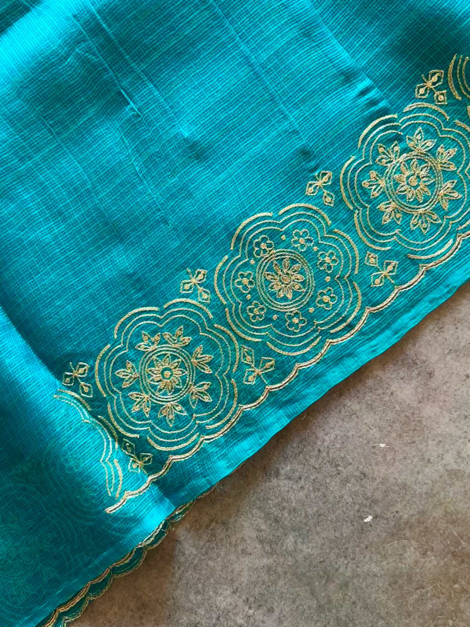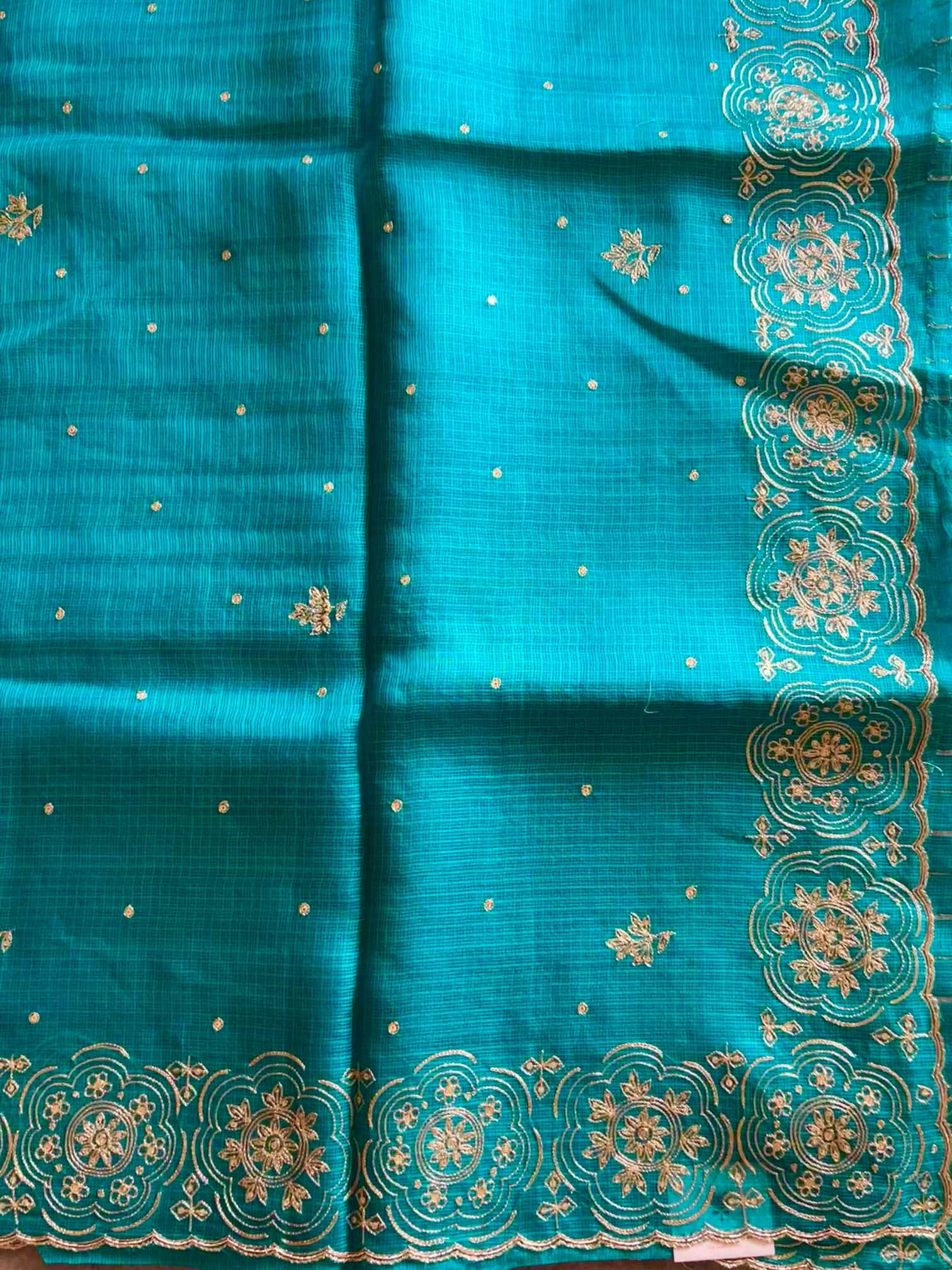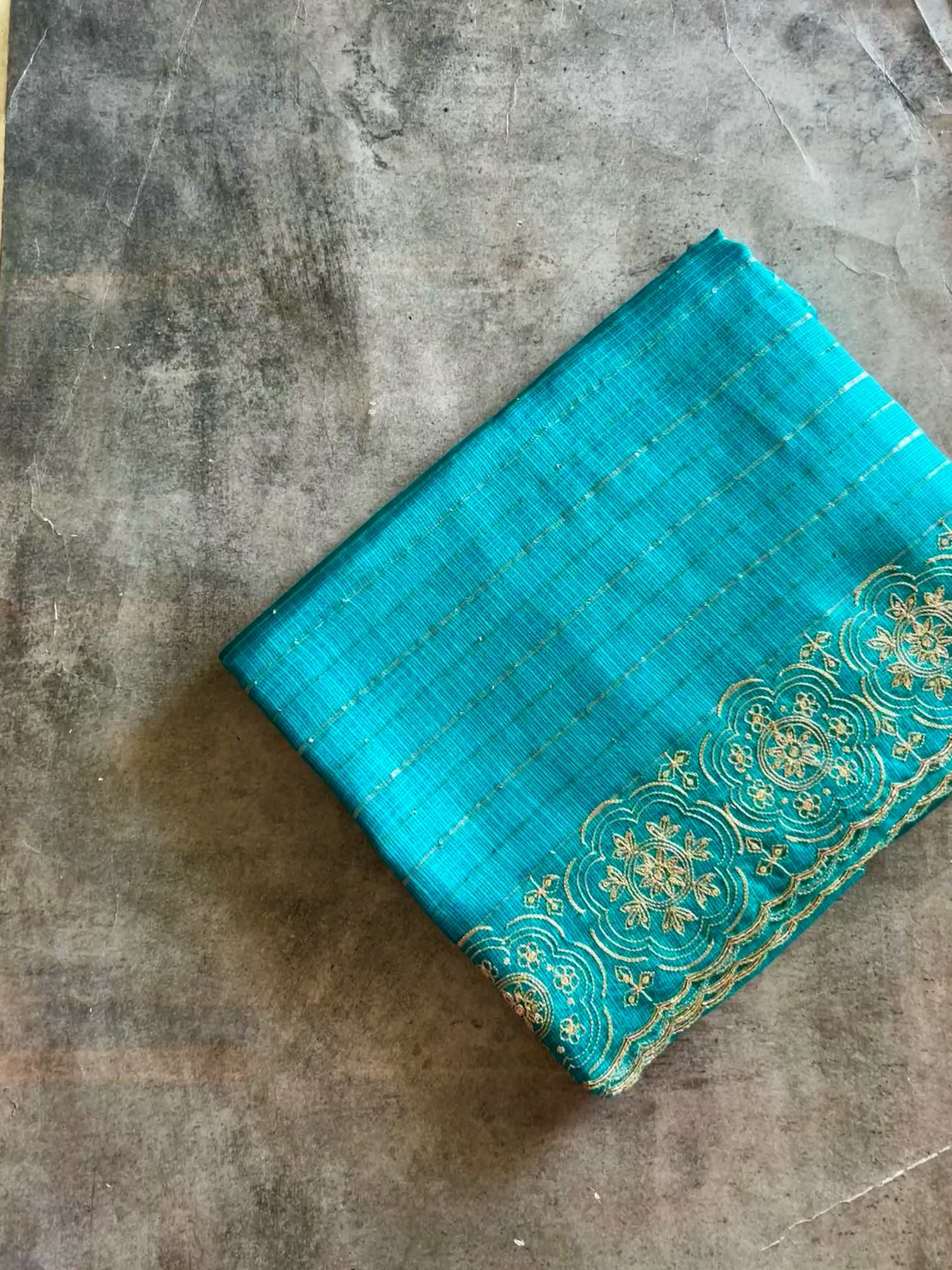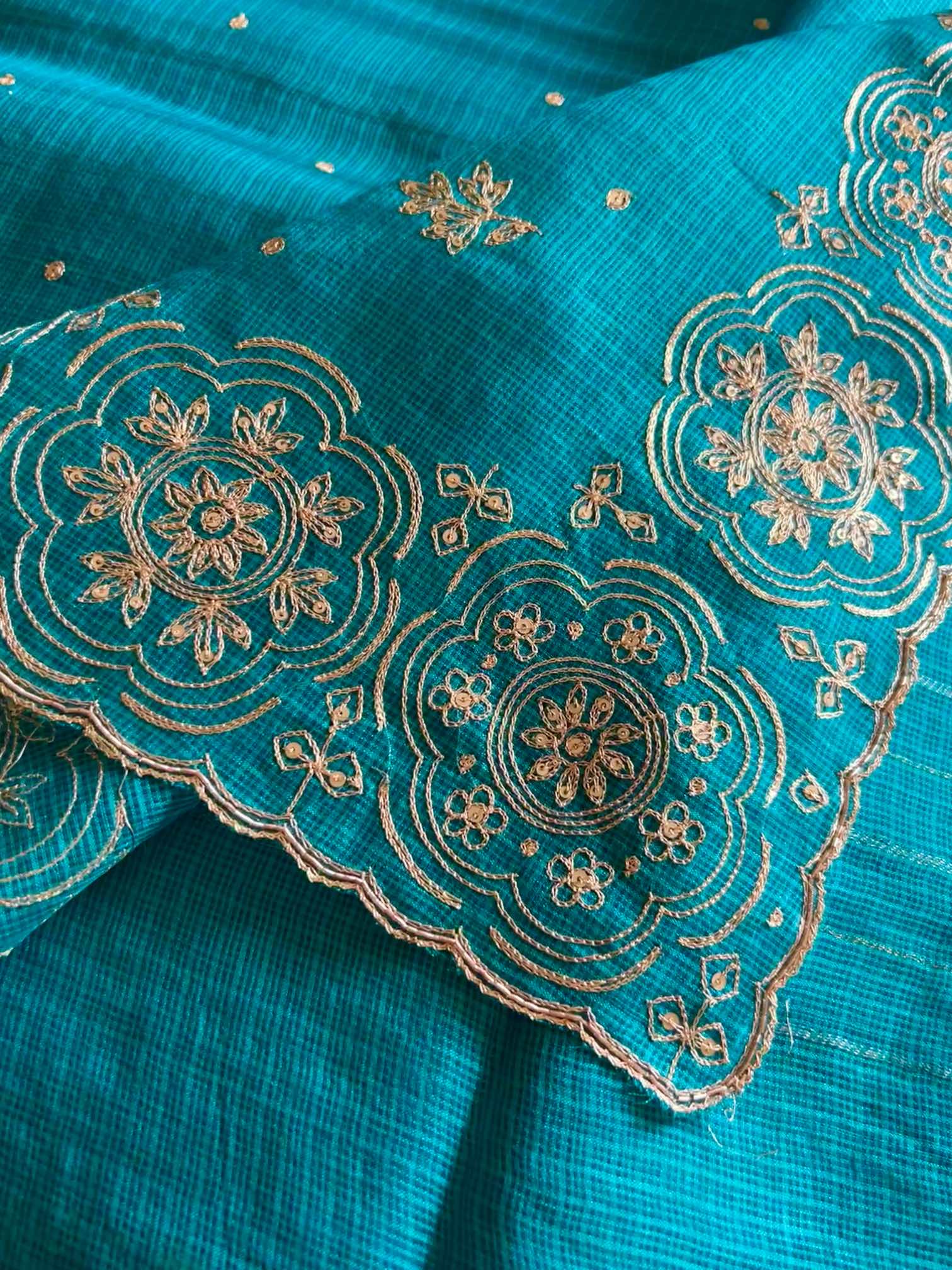 The Kota silk saree shimmers with quiet elegance, its gold and silver stripes catching the light like soft poetry. Delicate silver embroidery along the border adds a regal finish, blending tradition with timeless grace in every fold.