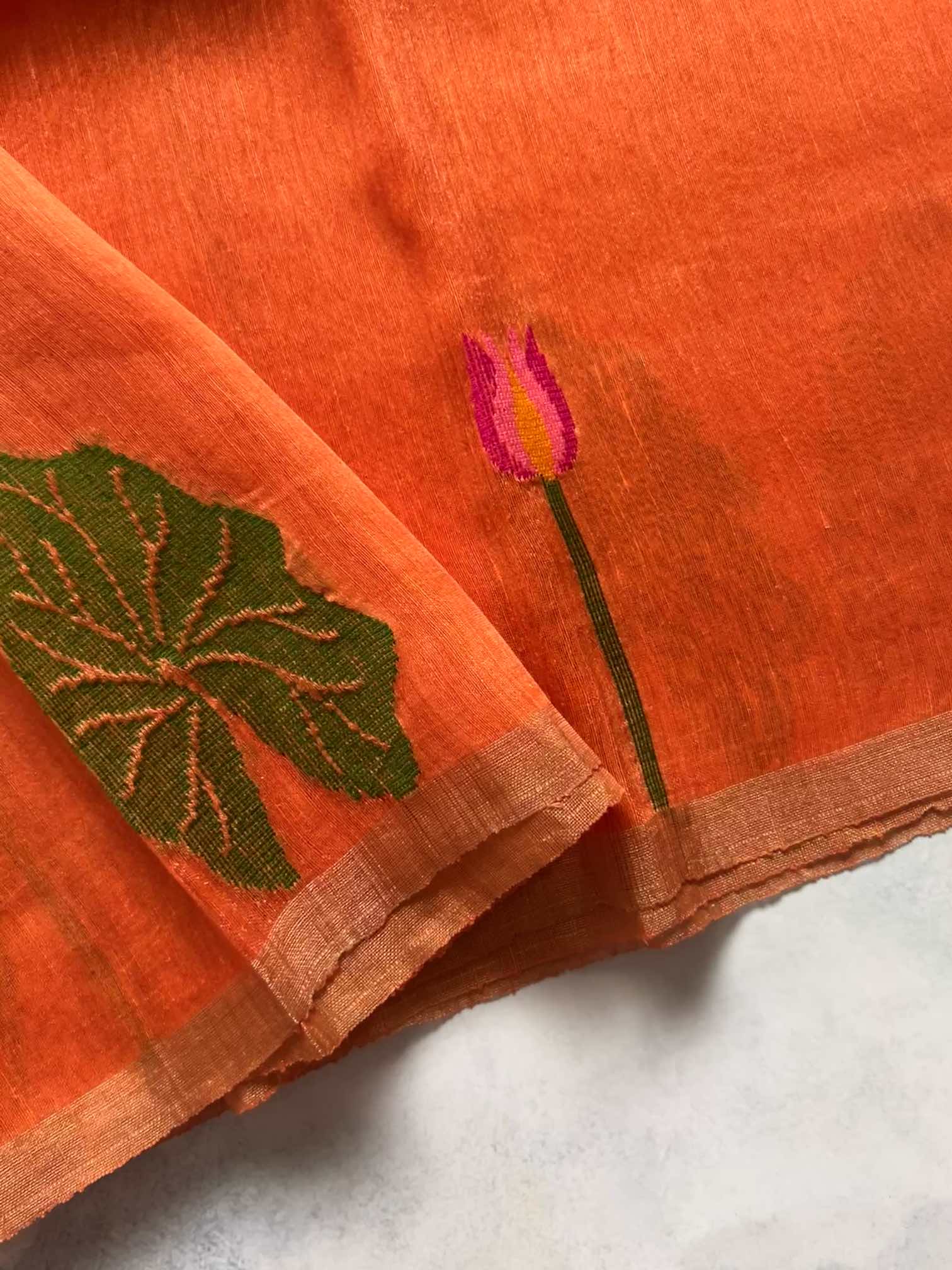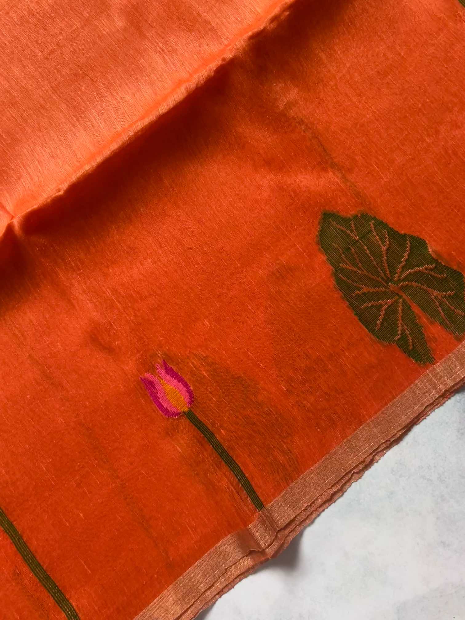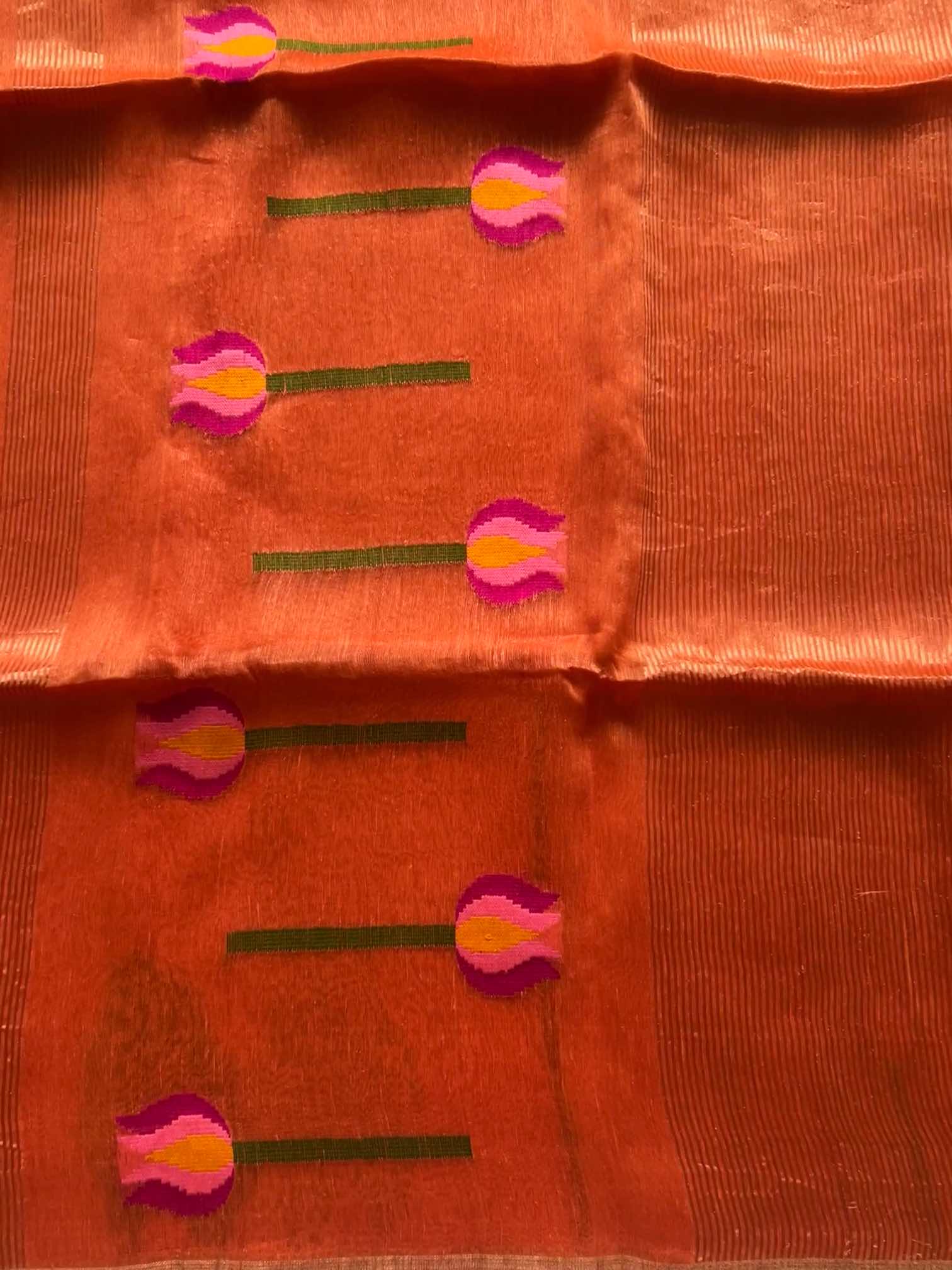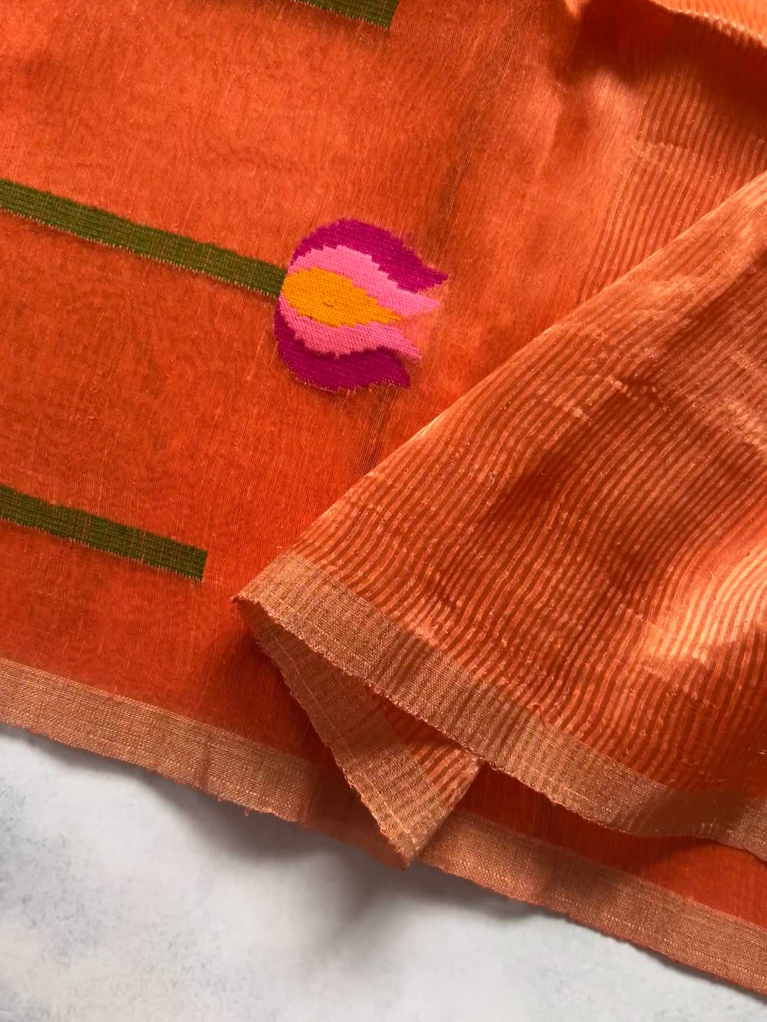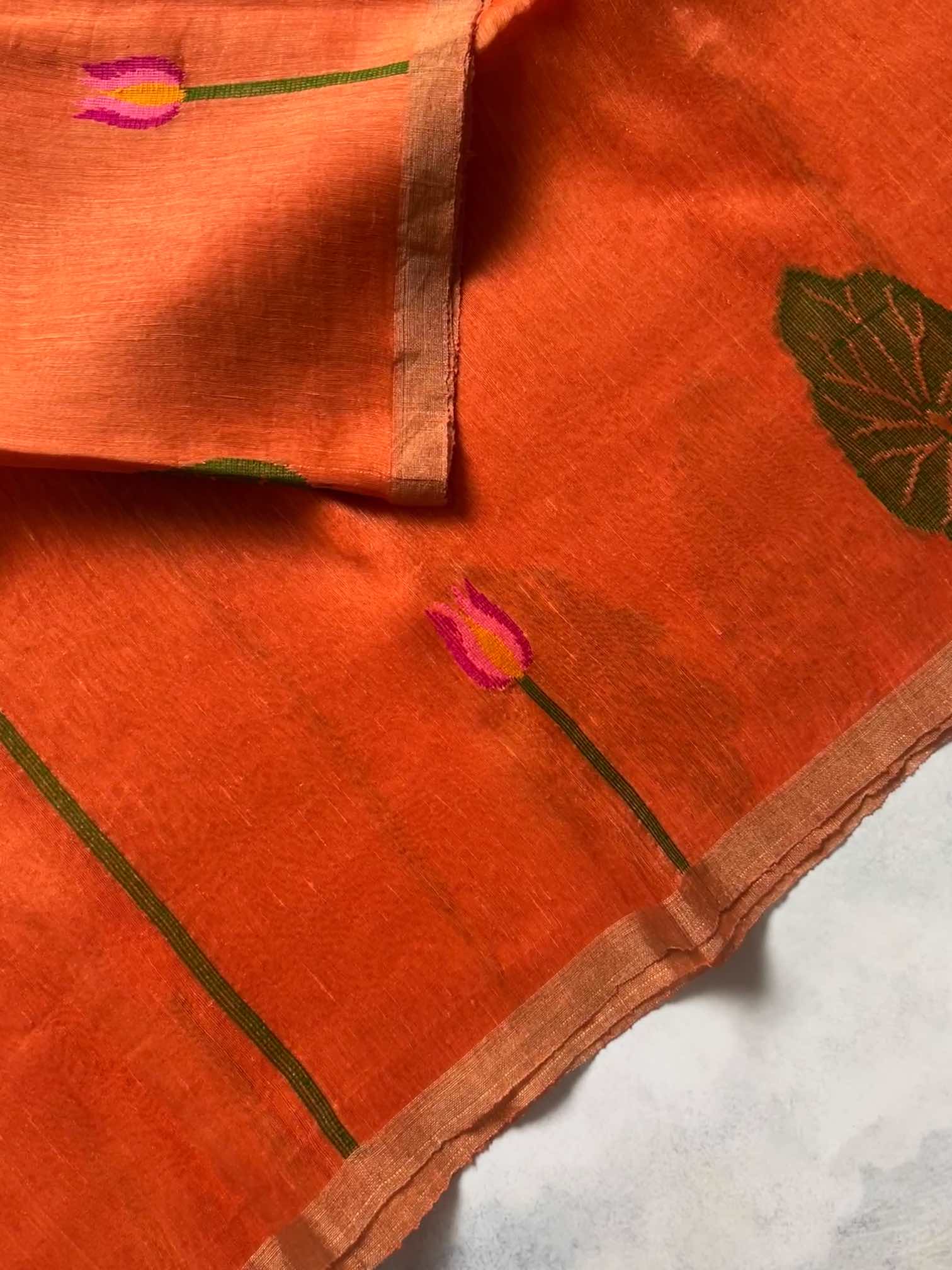 The beauty of pure linen with Jamdani lies in its exquisite blend of tradition and texture. Pure linen offers a crisp, airy feel with a natural luster, while Jamdani weaving adds intricate, timeless patterns that bring sophistication and artistry to the fabric. Together, they create a harmonious fusion that is both elegant and visually captivating, celebrating craftsmanship with every thread.