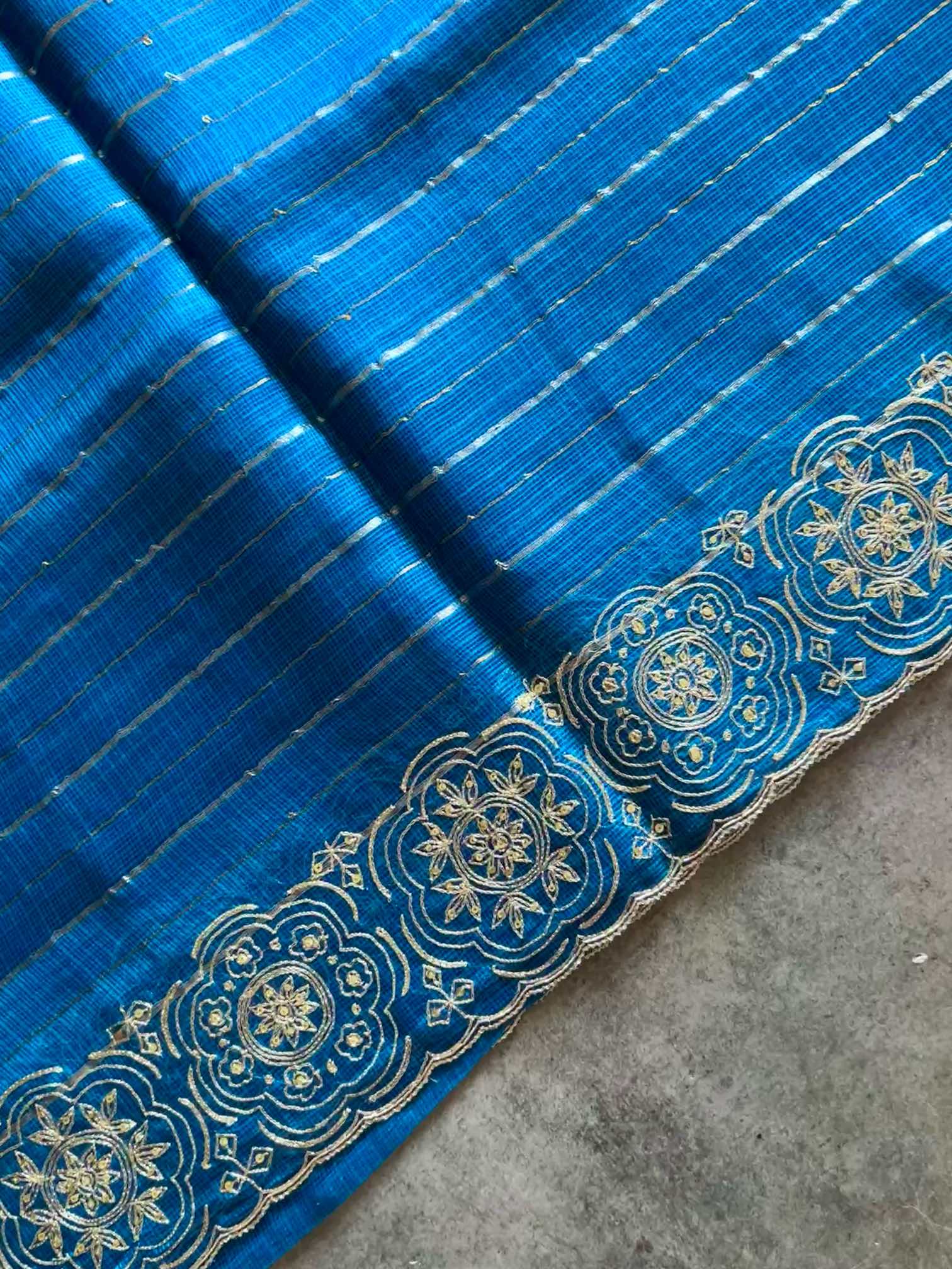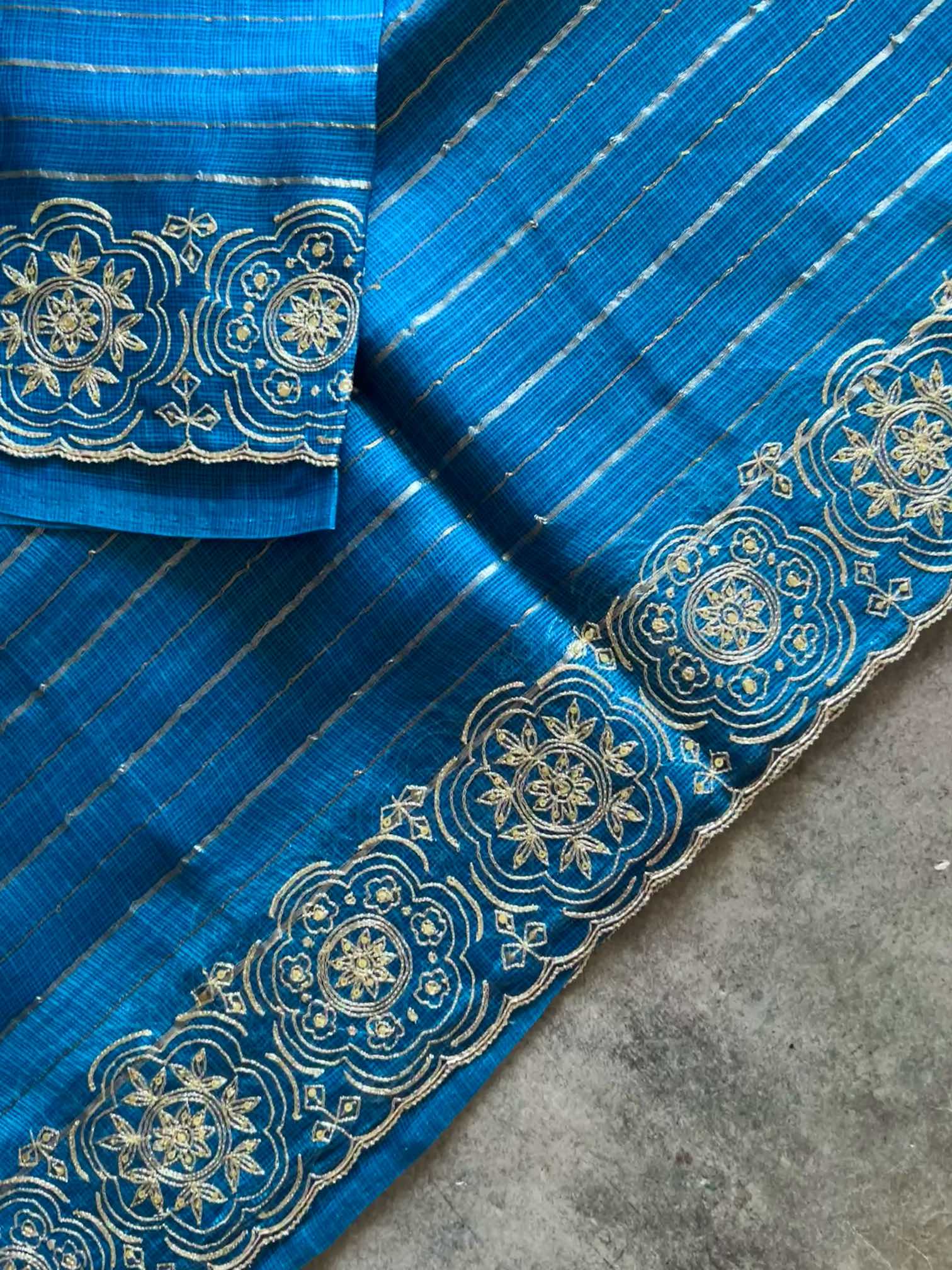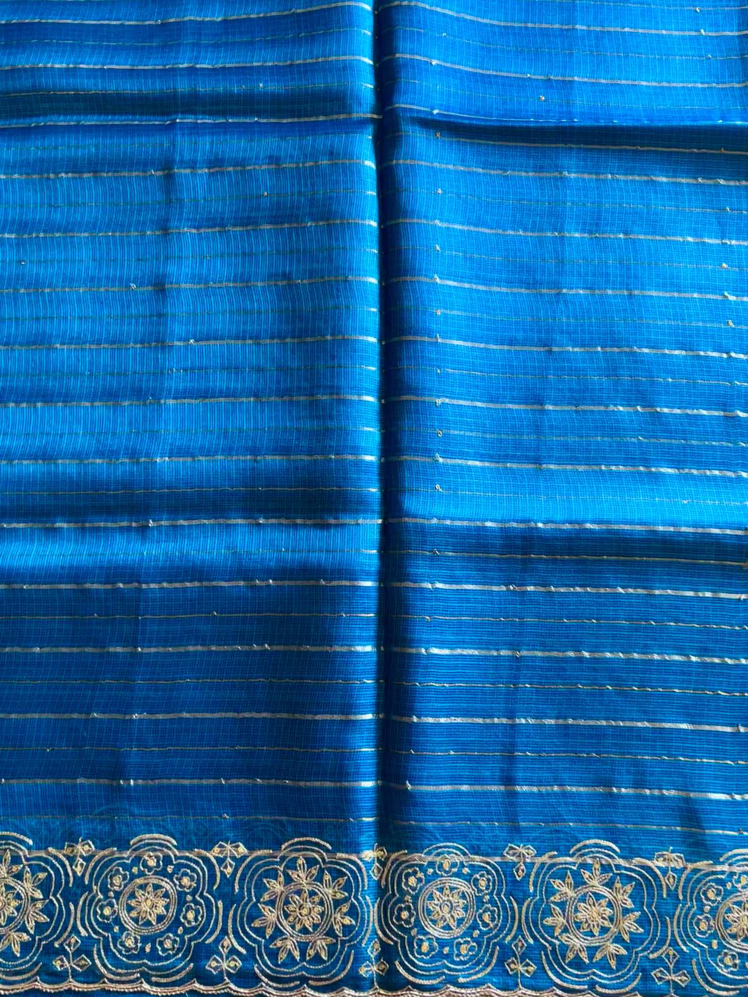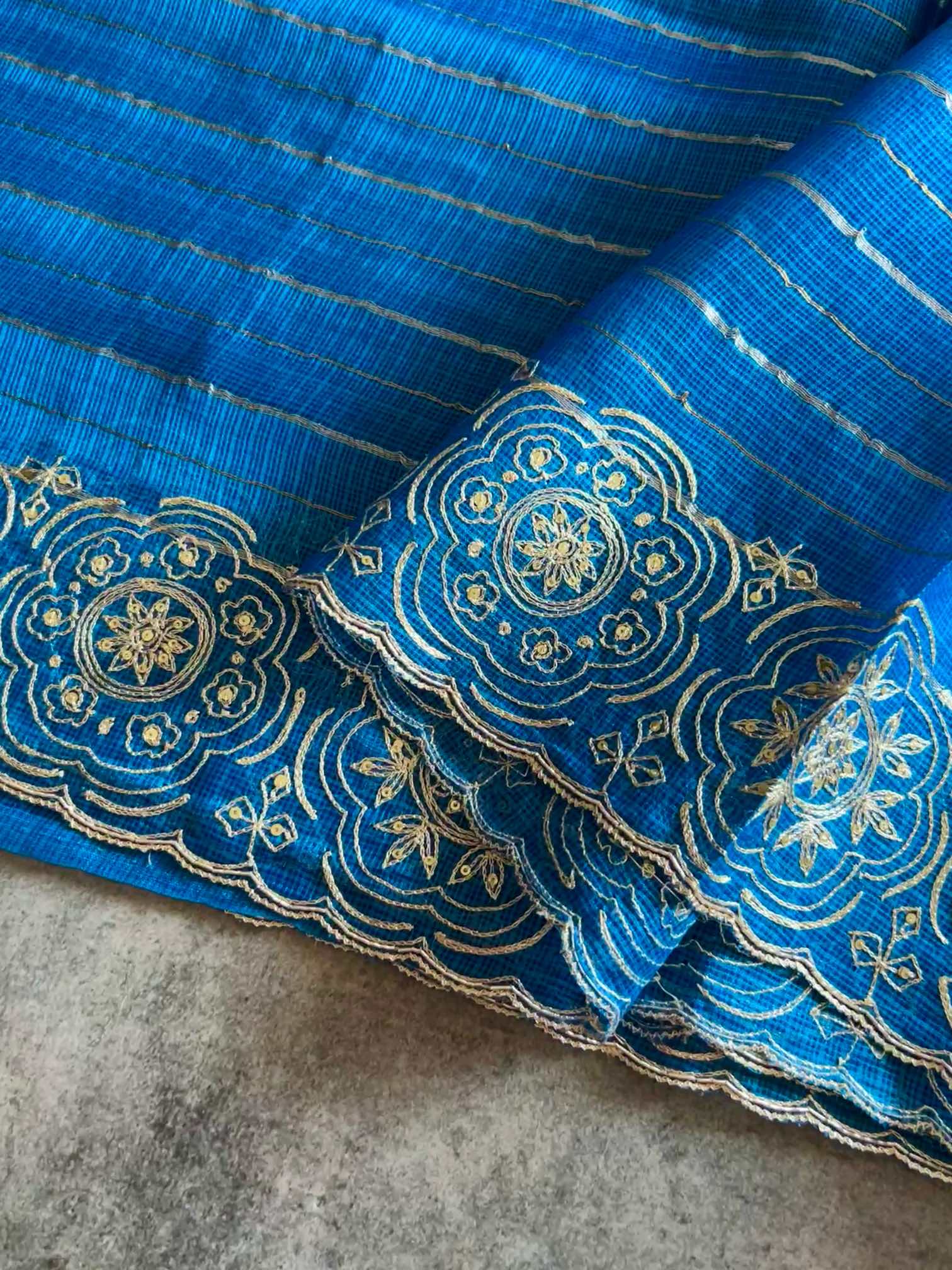 The Kota silk saree shimmers with quiet elegance, its gold and silver stripes catching the light like soft poetry. Delicate silver embroidery along the border adds a regal finish, blending tradition with timeless grace in every fold.