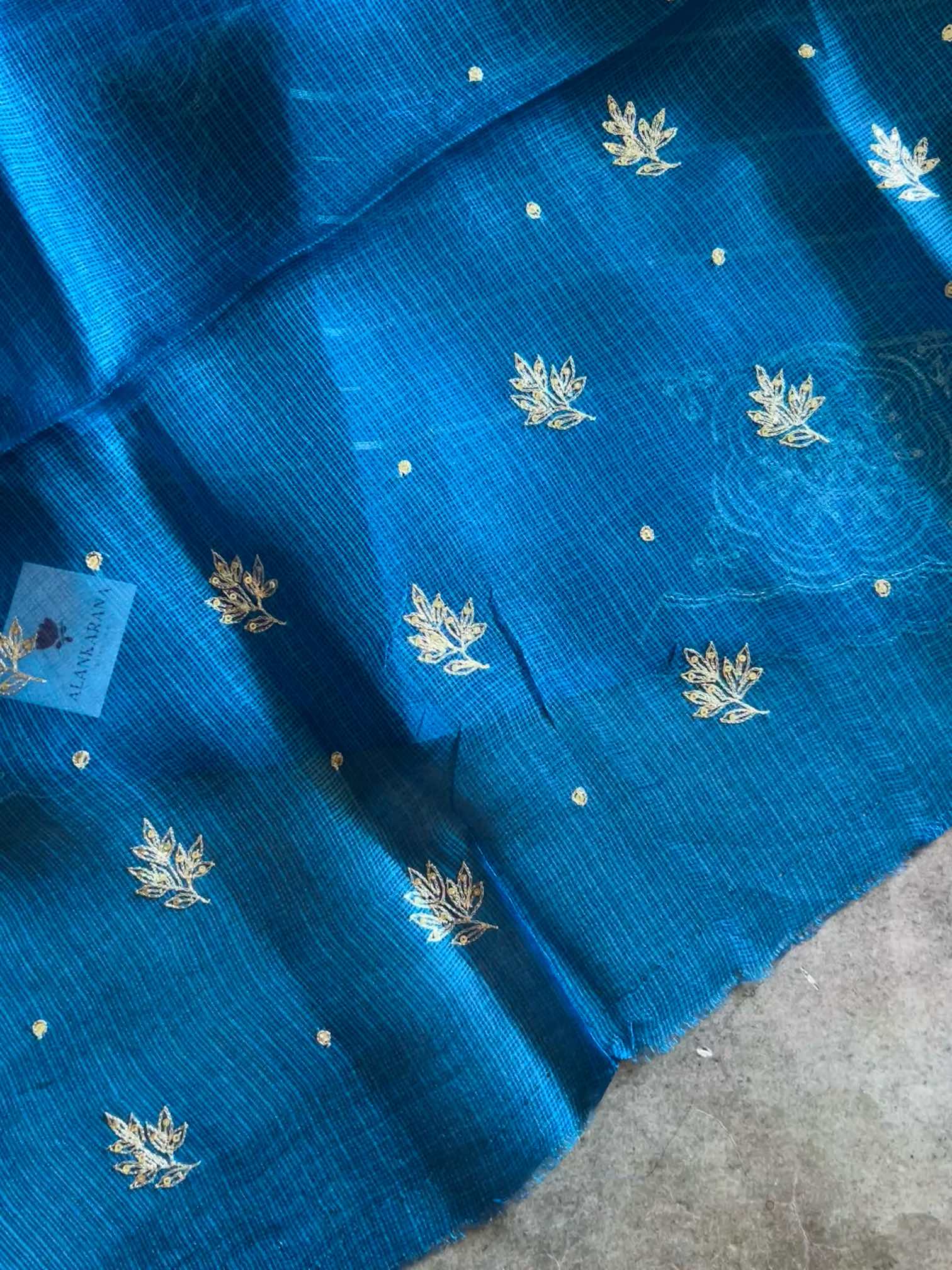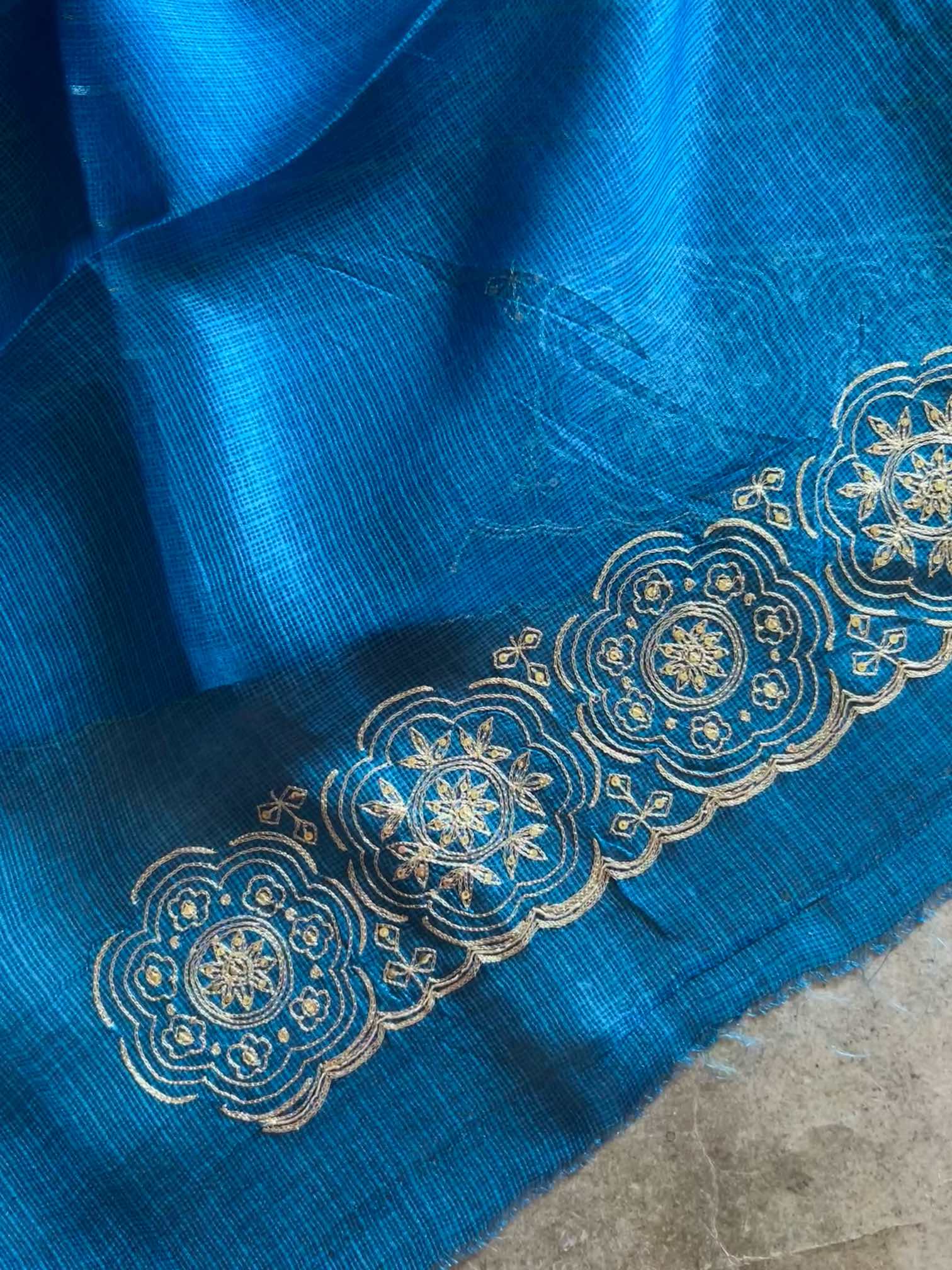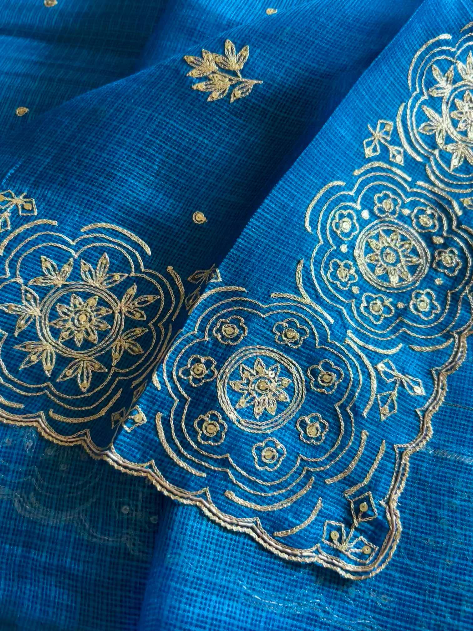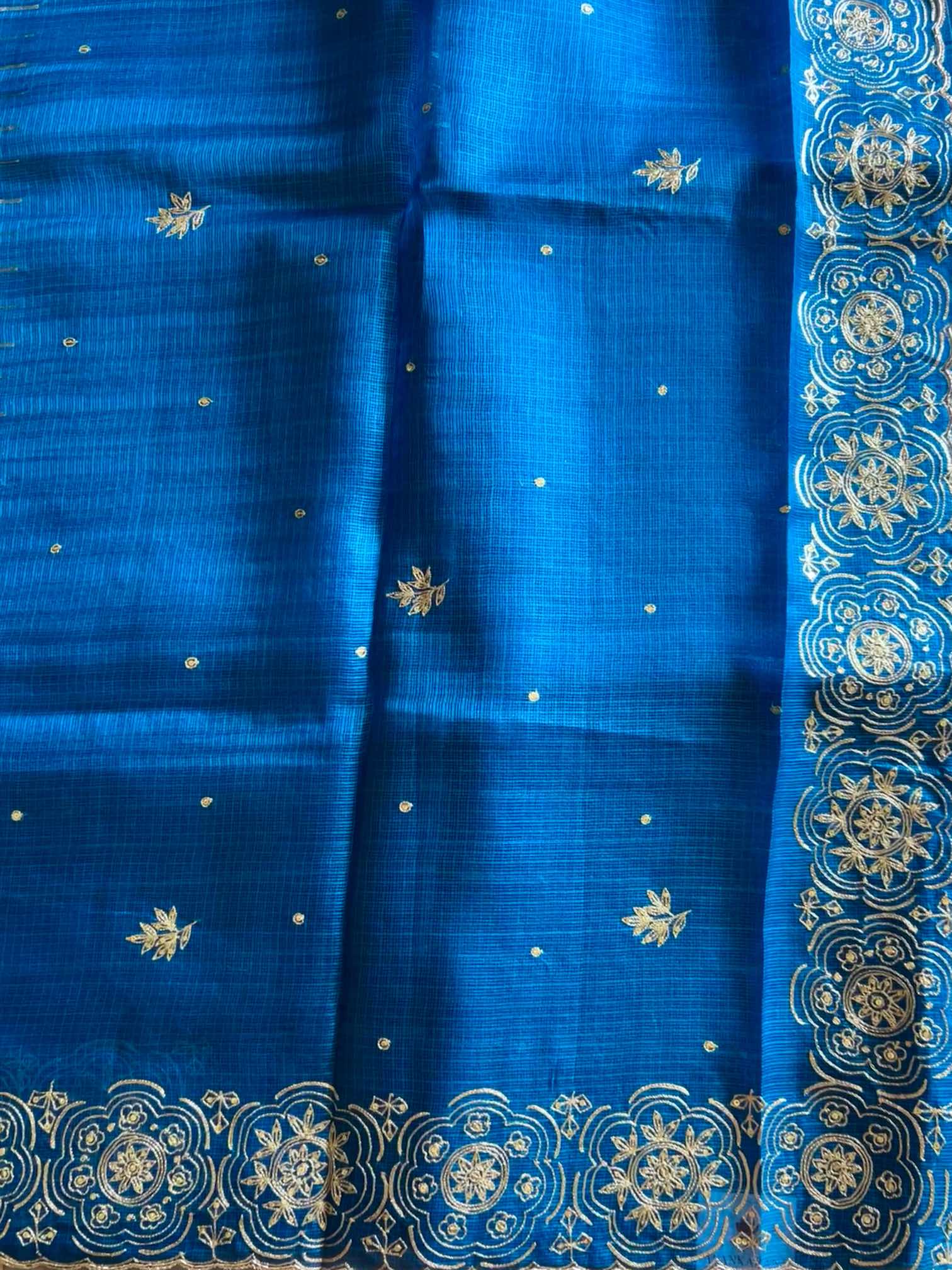 The Kota silk saree shimmers with quiet elegance, its gold and silver stripes catching the light like soft poetry. Delicate silver embroidery along the border adds a regal finish, blending tradition with timeless grace in every fold.