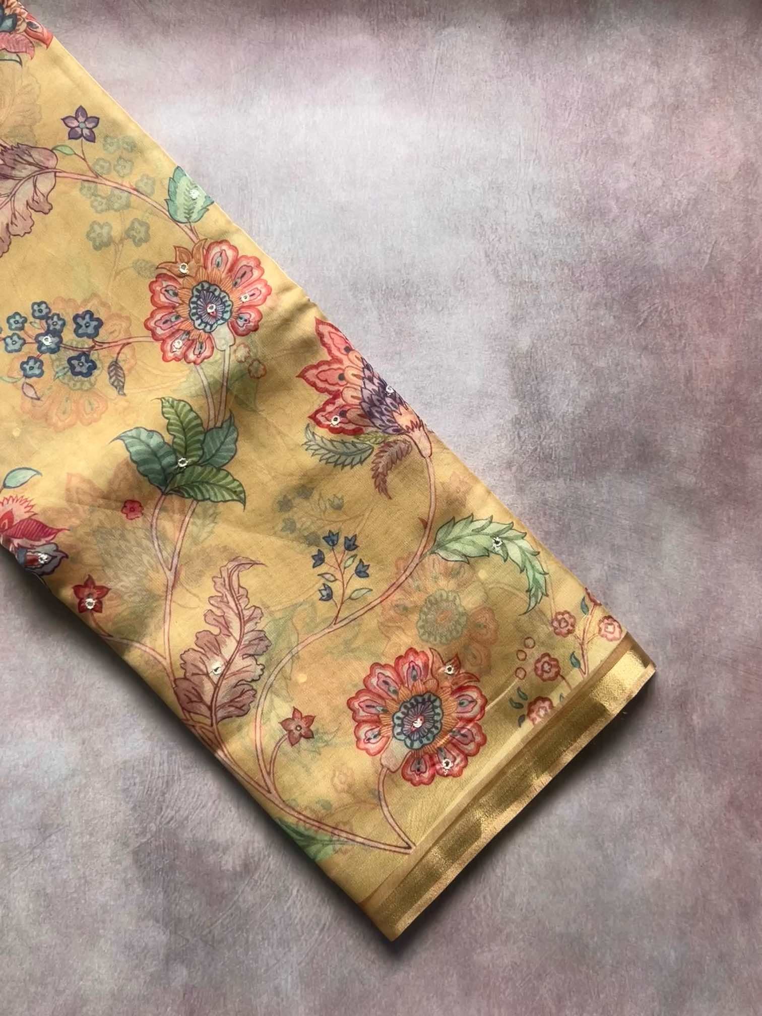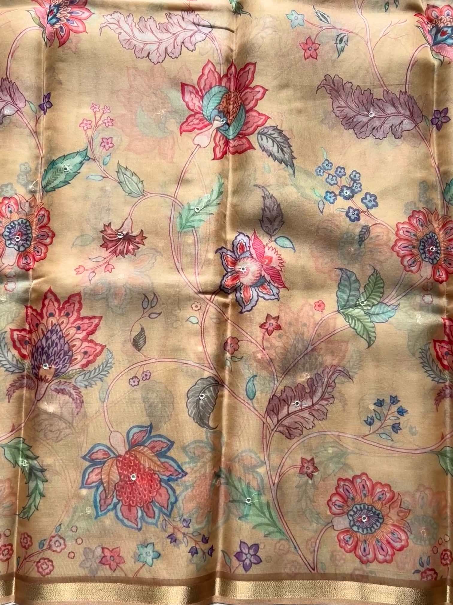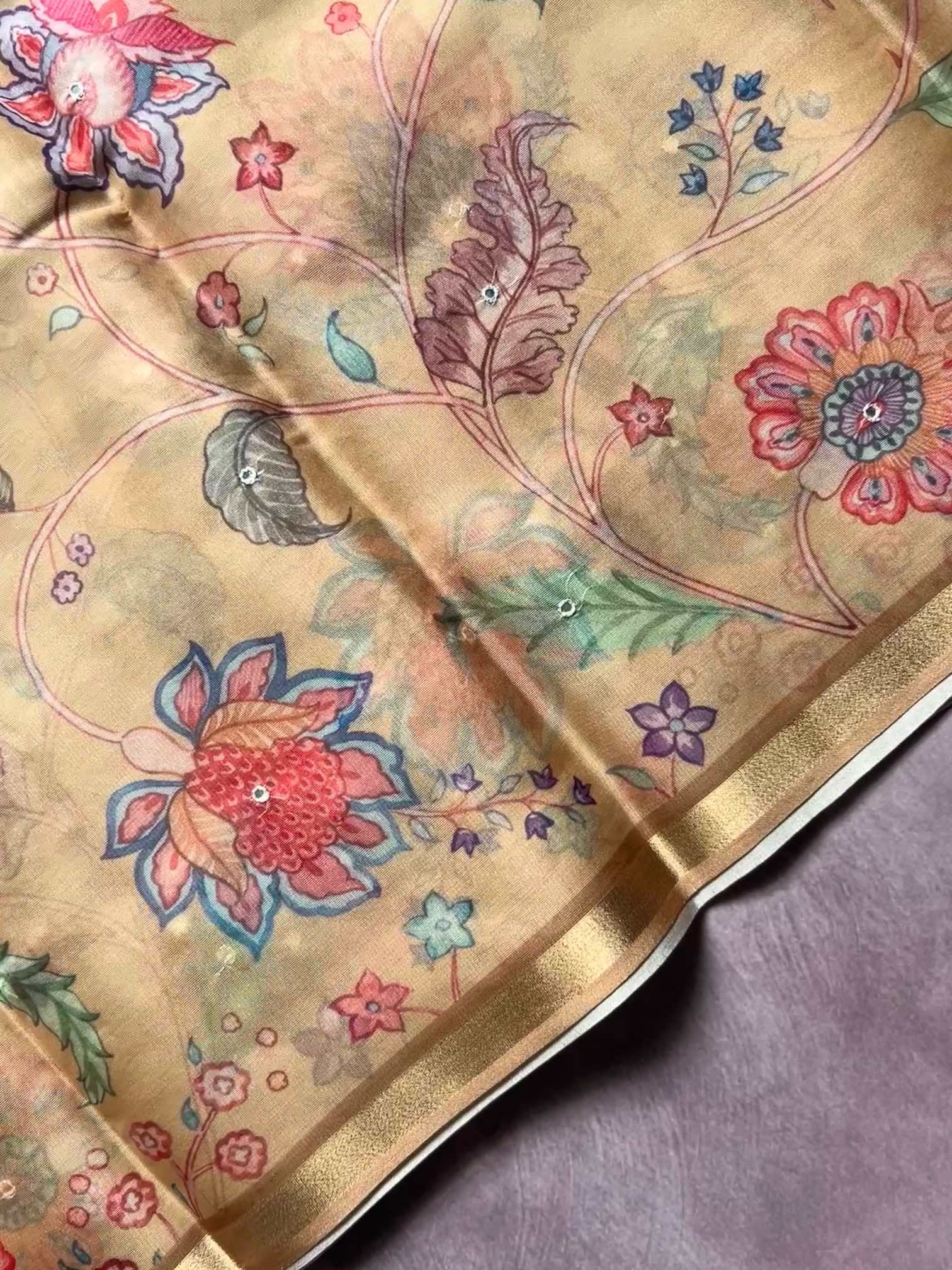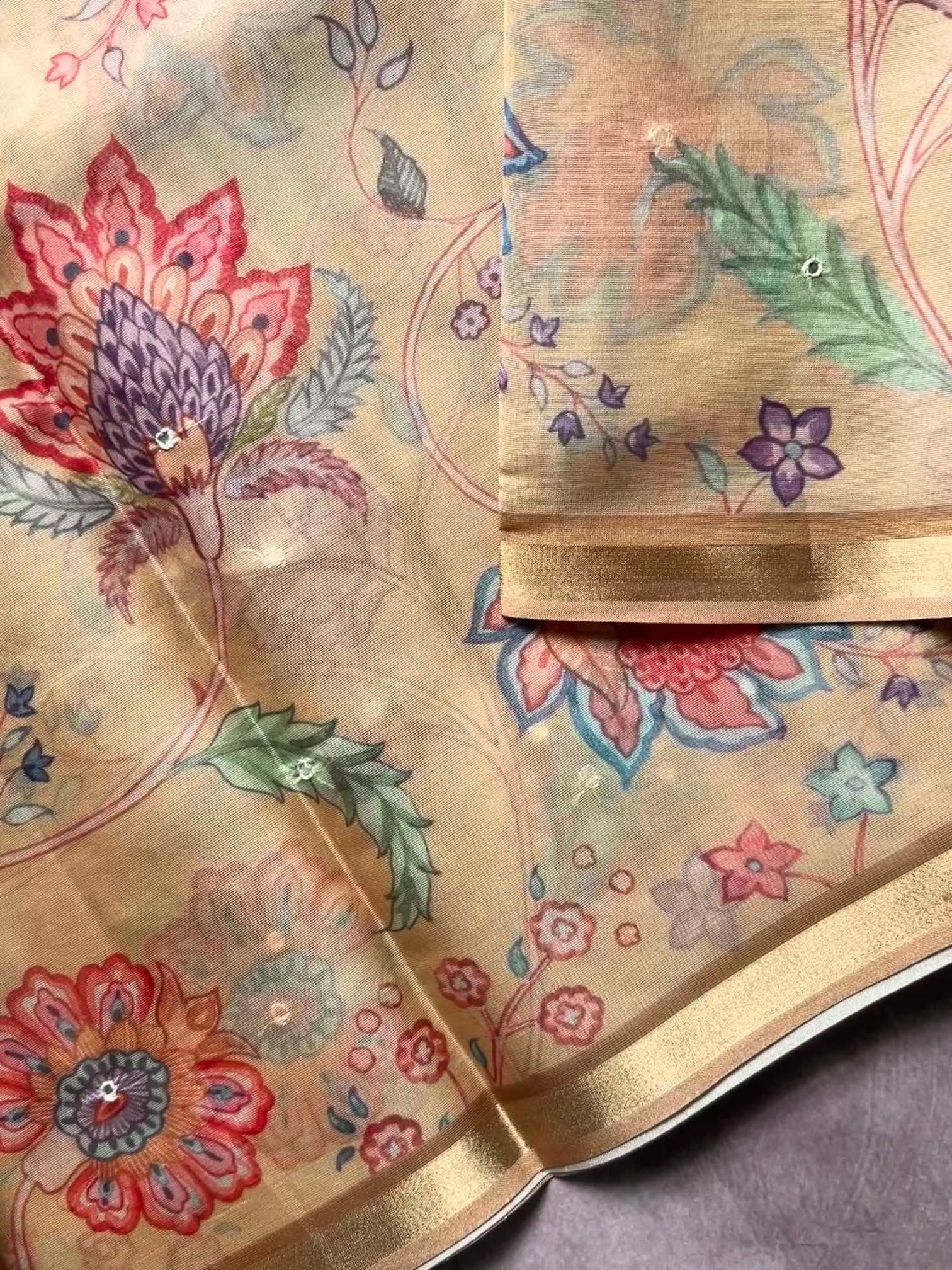 The lightweight synthetic fabric drapes effortlessly, while vibrant digital prints add sharp, contemporary designs. Intricate mirror-work embroidery enhances the saree with a touch of sparkle, making it perfect for festive occasions, parties, and celebrations.
