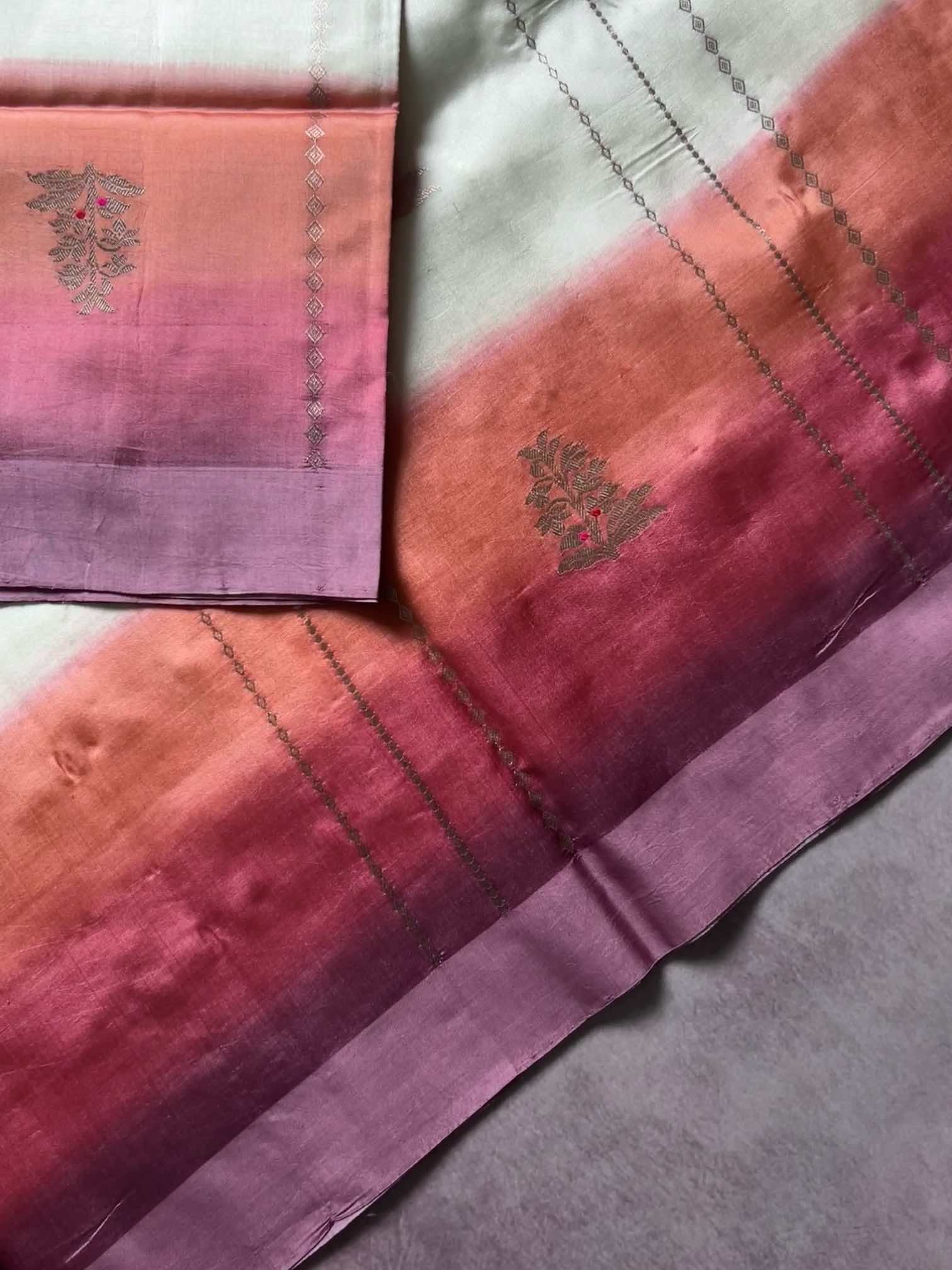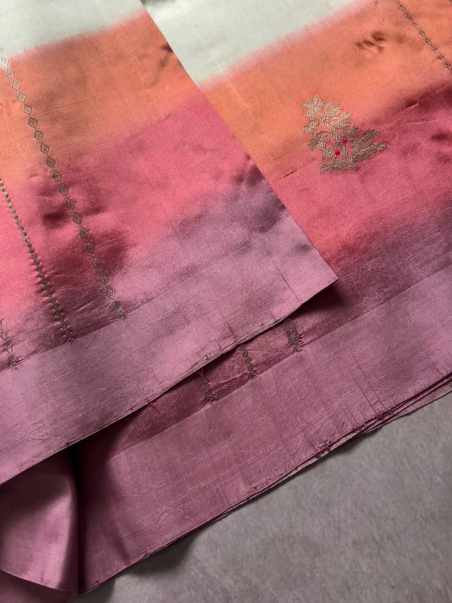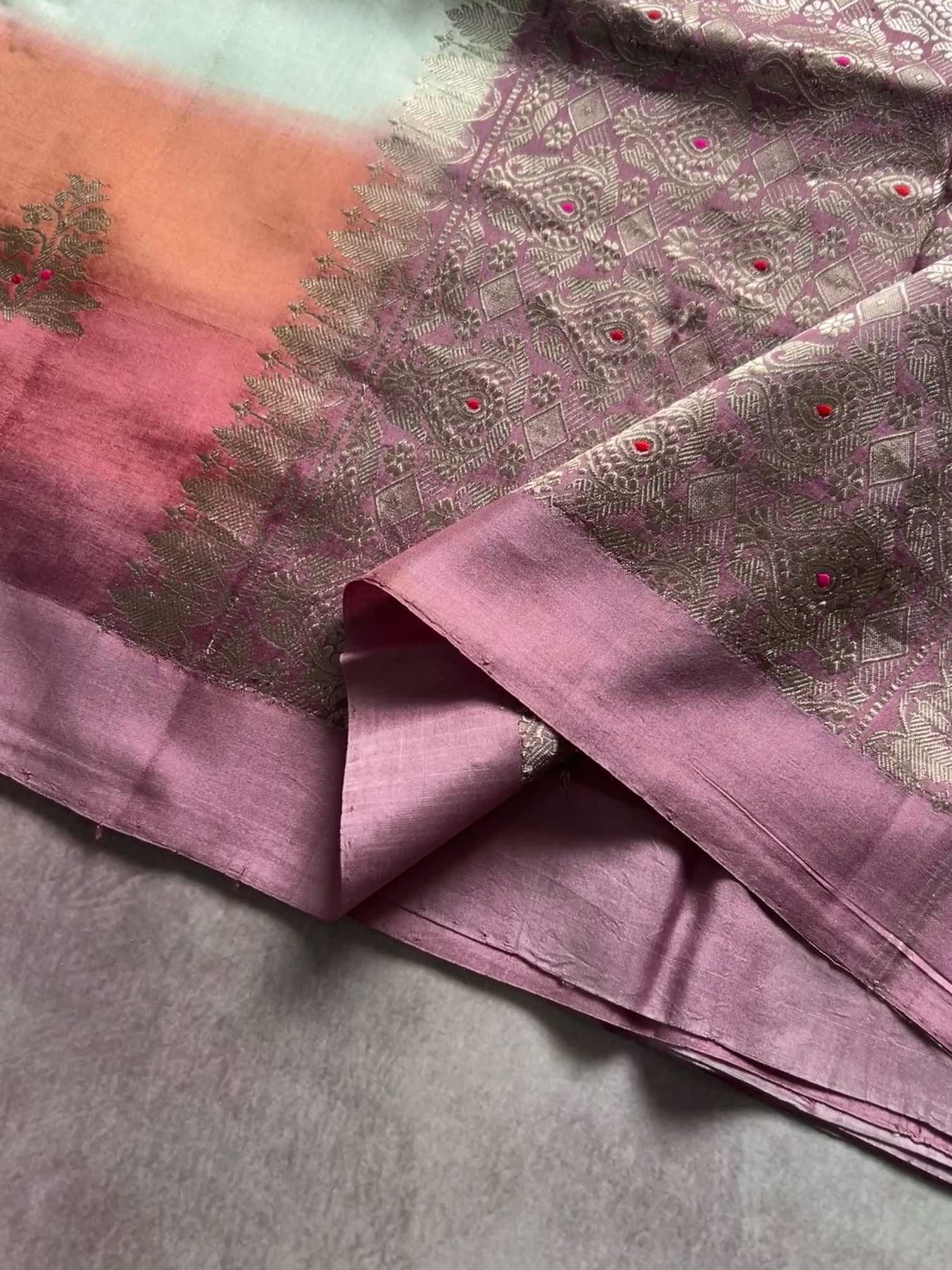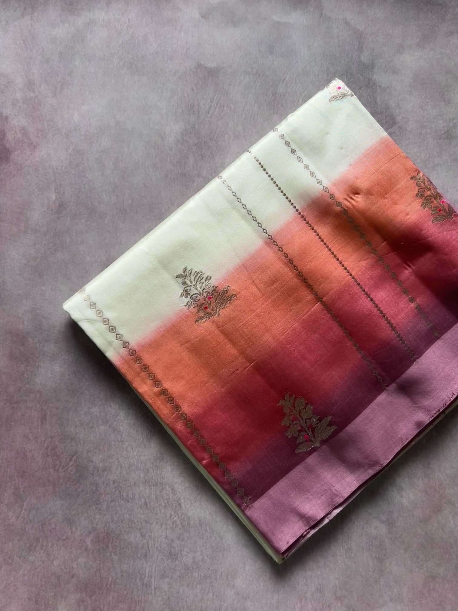 A multicolour shaded Banaras saree is a celebration of colour and craft. The gentle play of hues adds depth and movement, while the finely zari-woven floral motifs lend it a rich, regal charm. Together, they create a saree that feels luxurious yet graceful—an exquisite blend of traditional artistry and timeless beauty.