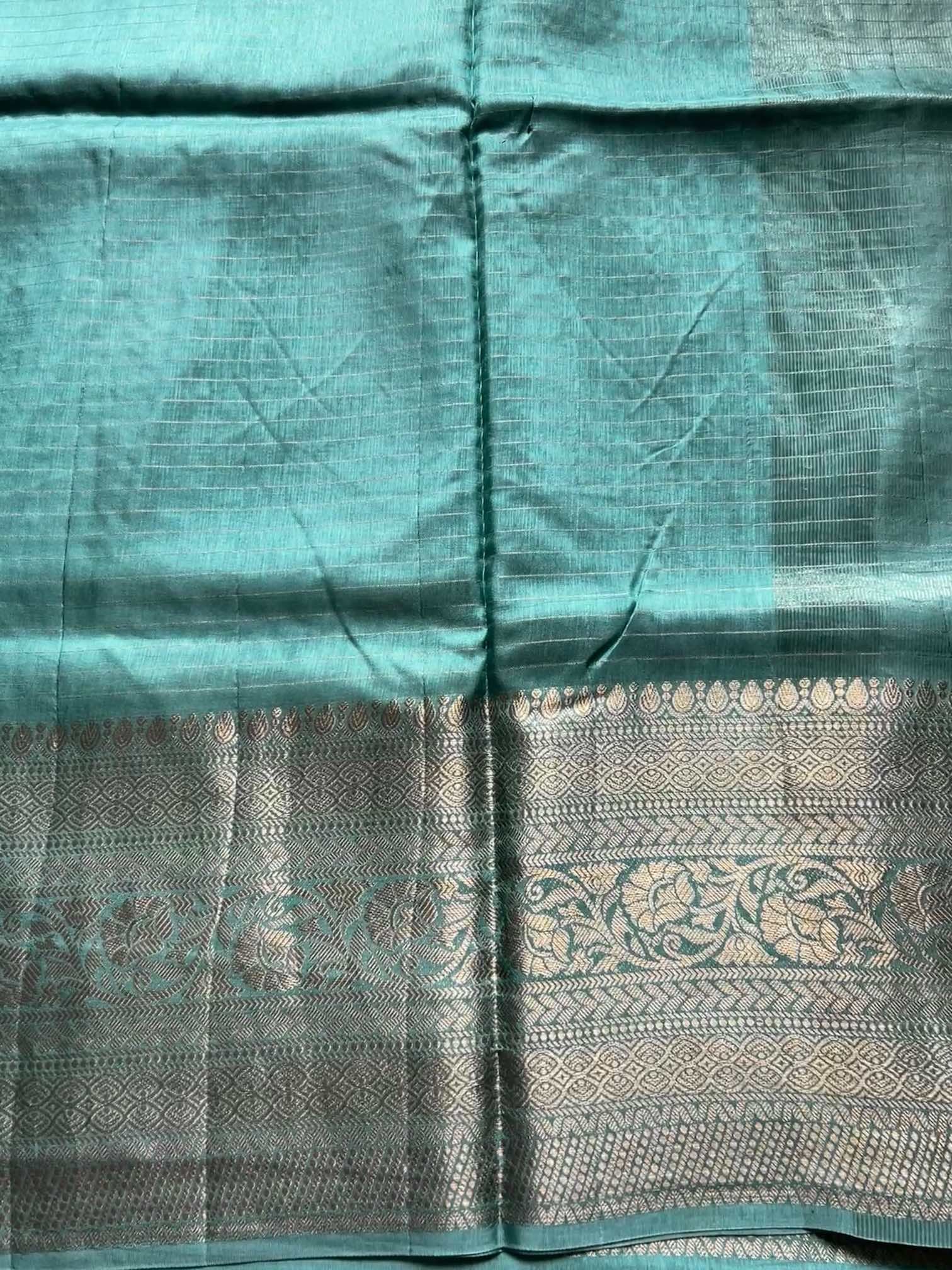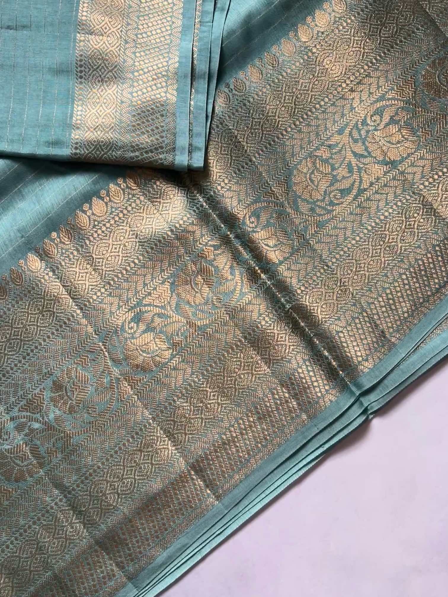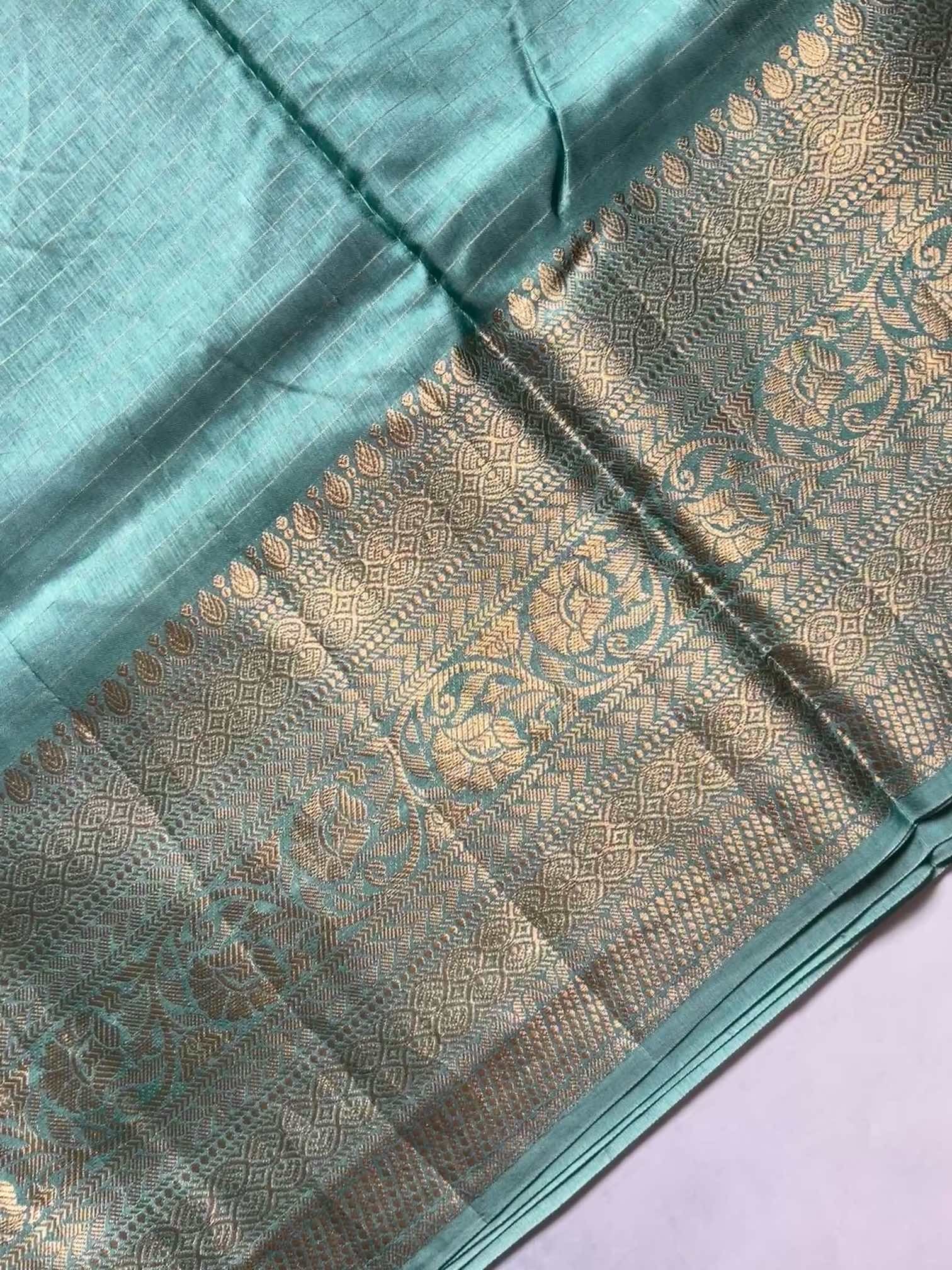 The soft, fluid texture of dola silk drapes with effortless grace, catching light in a gentle, elegant sheen. The brocade border adds a regal touch—rich, intricate, and timeless—while the fine zari lines running through the body create a subtle shimmer, giving the saree an ethereal charm.Together, these elements make the saree both sophisticated and captivating, perfect for moments that call for quiet grandeur and classic beauty.