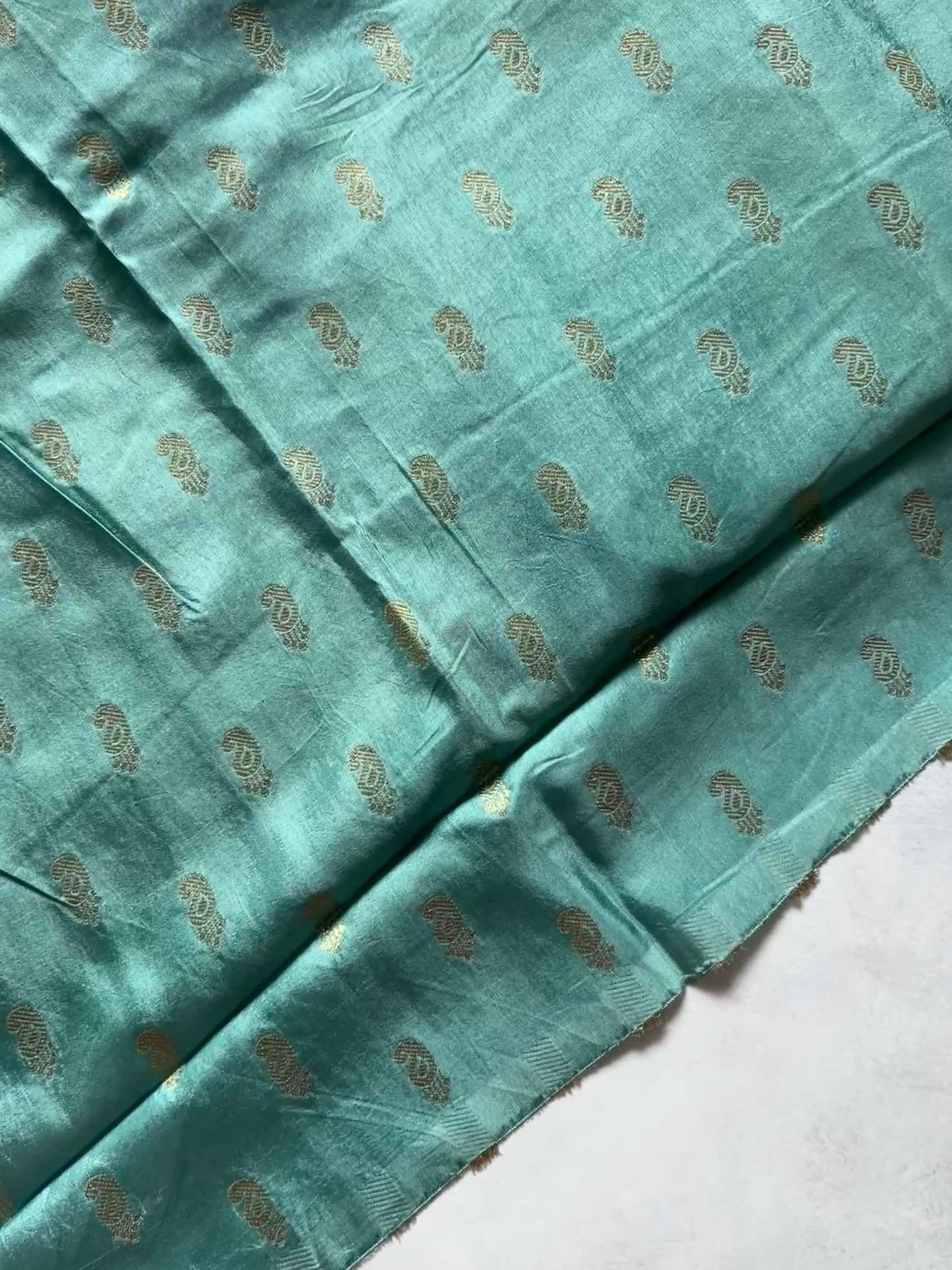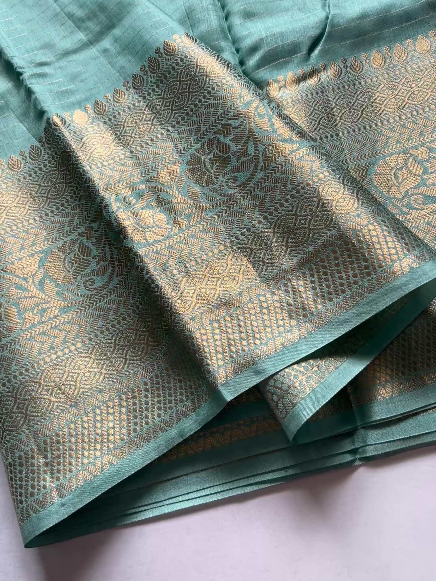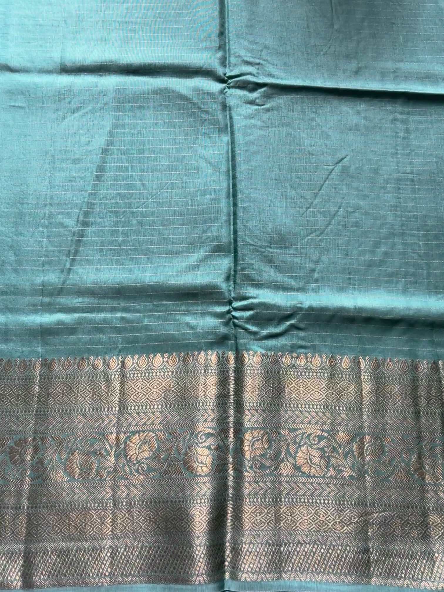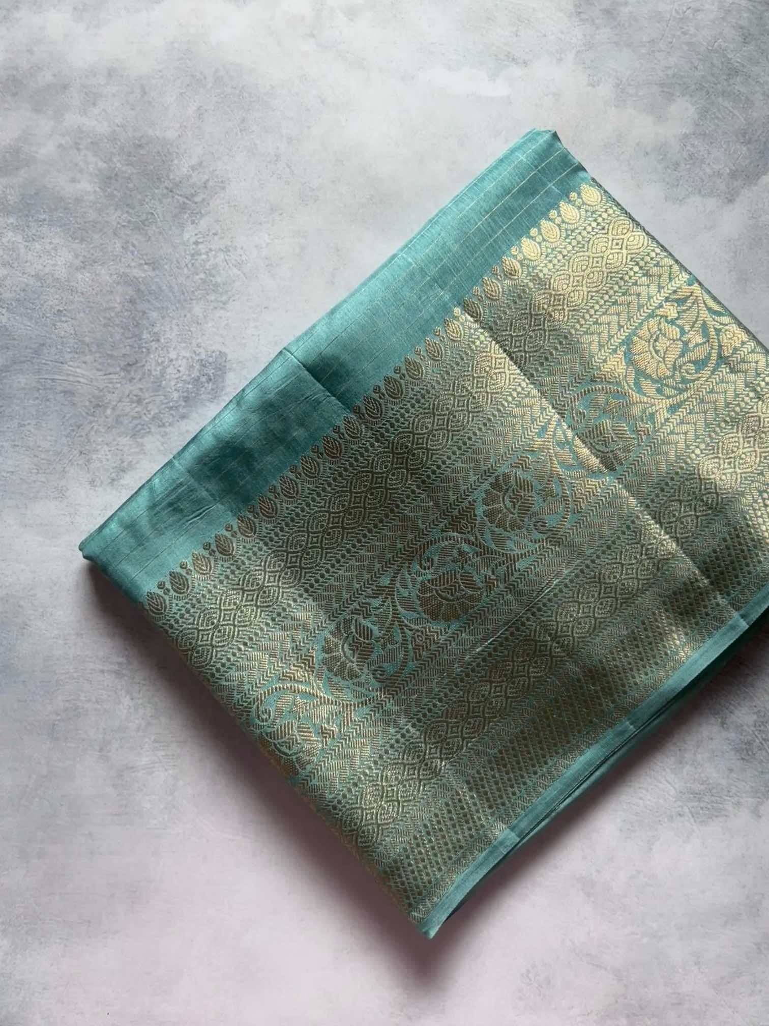 The soft, fluid texture of dola silk drapes with effortless grace, catching light in a gentle, elegant sheen. The brocade border adds a regal touch—rich, intricate, and timeless—while the fine zari lines running through the body create a subtle shimmer, giving the saree an ethereal charm.Together, these elements make the saree both sophisticated and captivating, perfect for moments that call for quiet grandeur and classic beauty.
