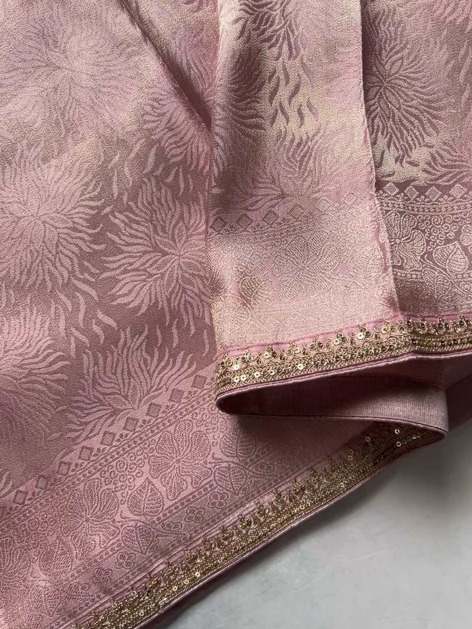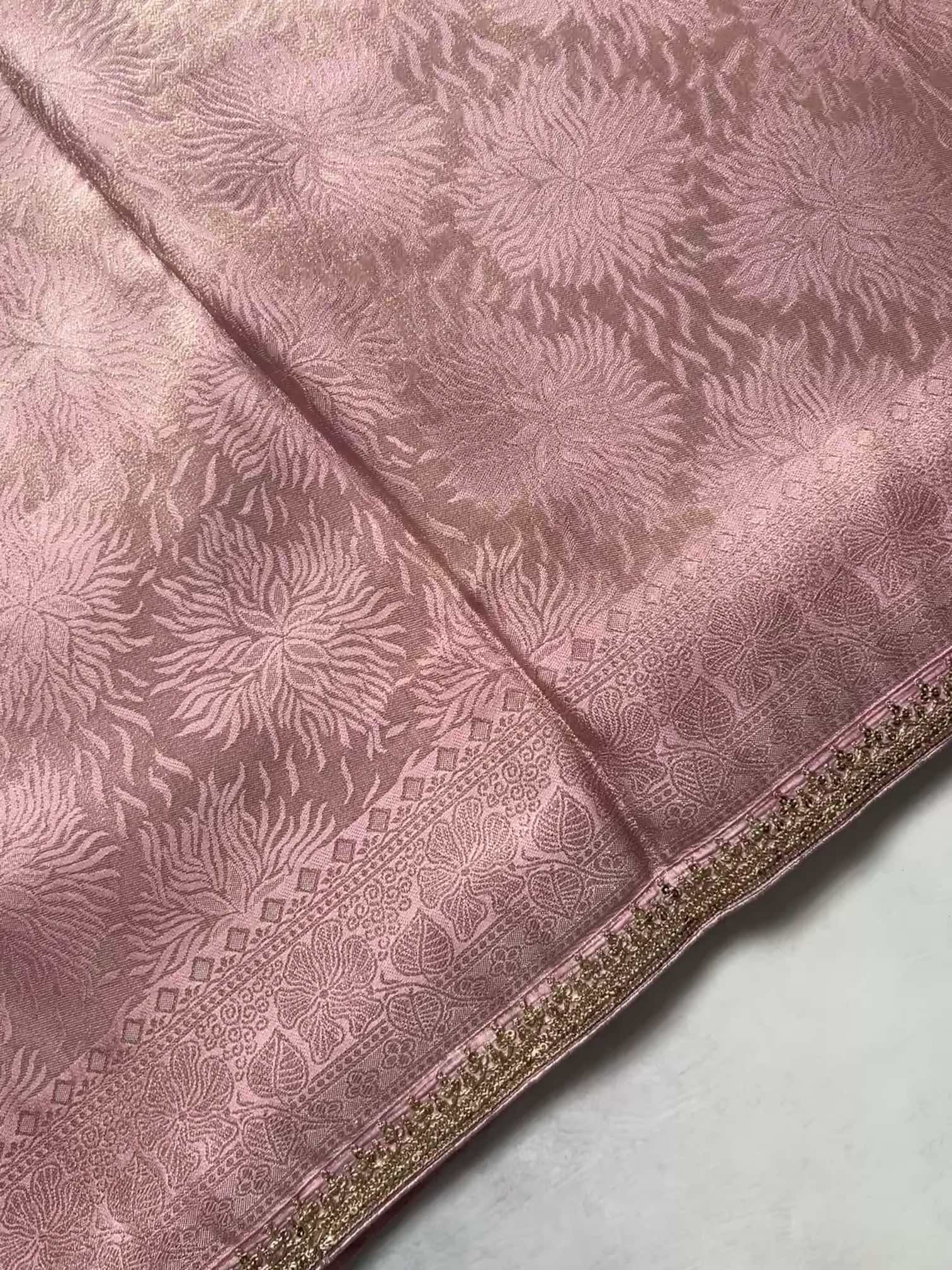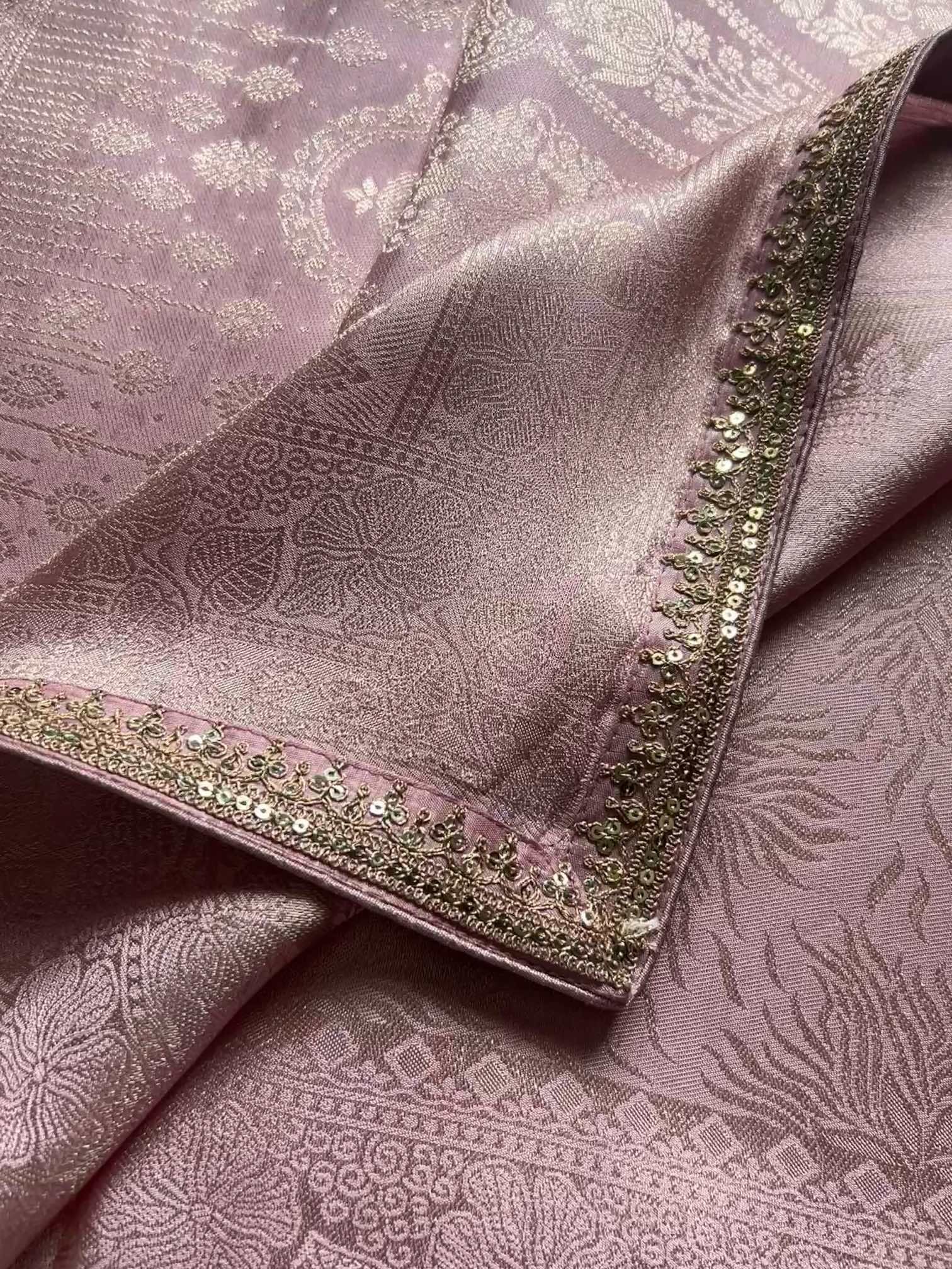 The Banaras brocade saree is a timeless symbol of Indian elegance, known for its luxurious silk fabric and intricate zari work. When adorned with embroidery appliqué work along the border, it becomes a true masterpiece. The rich brocade weaves — often featuring floral and Mughal motifs — are beautifully complemented by the detailed appliqué, adding texture, contrast, and an artisanal charm. This fusion of tradition and craftsmanship creates a saree that is both regal and expressive — perfect for grand occasions where grace meets heritage.