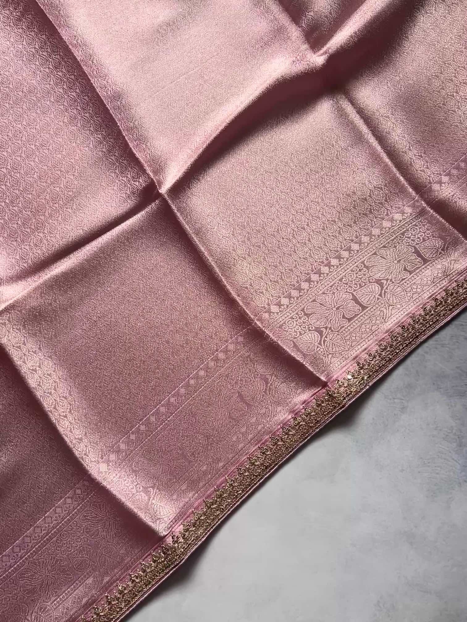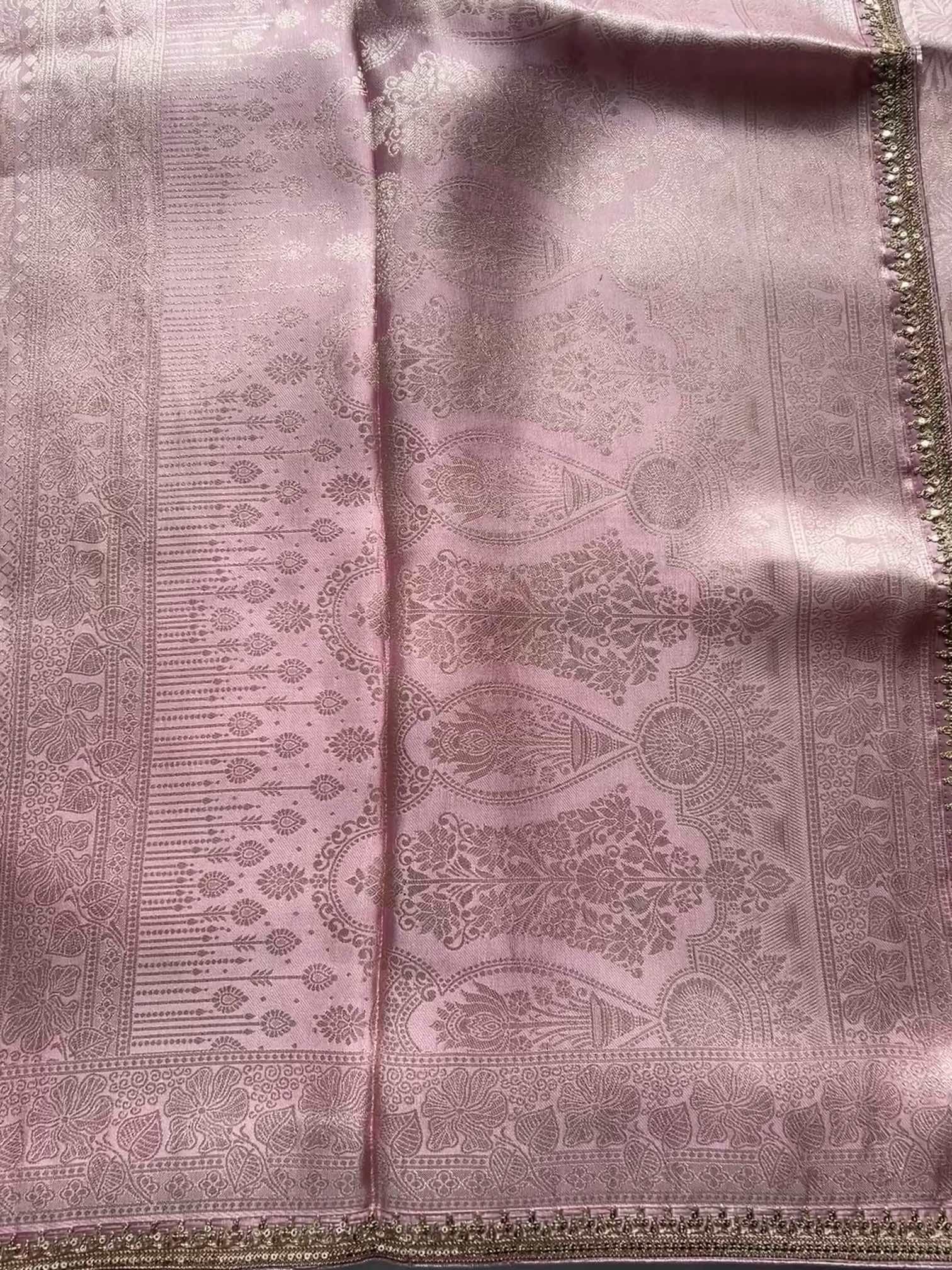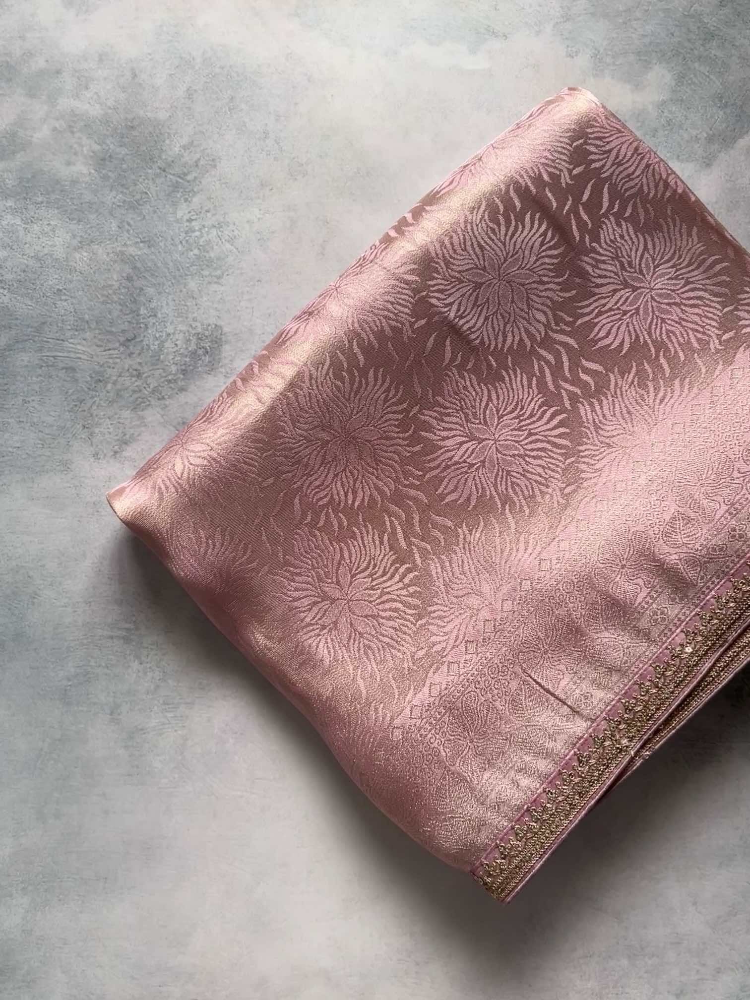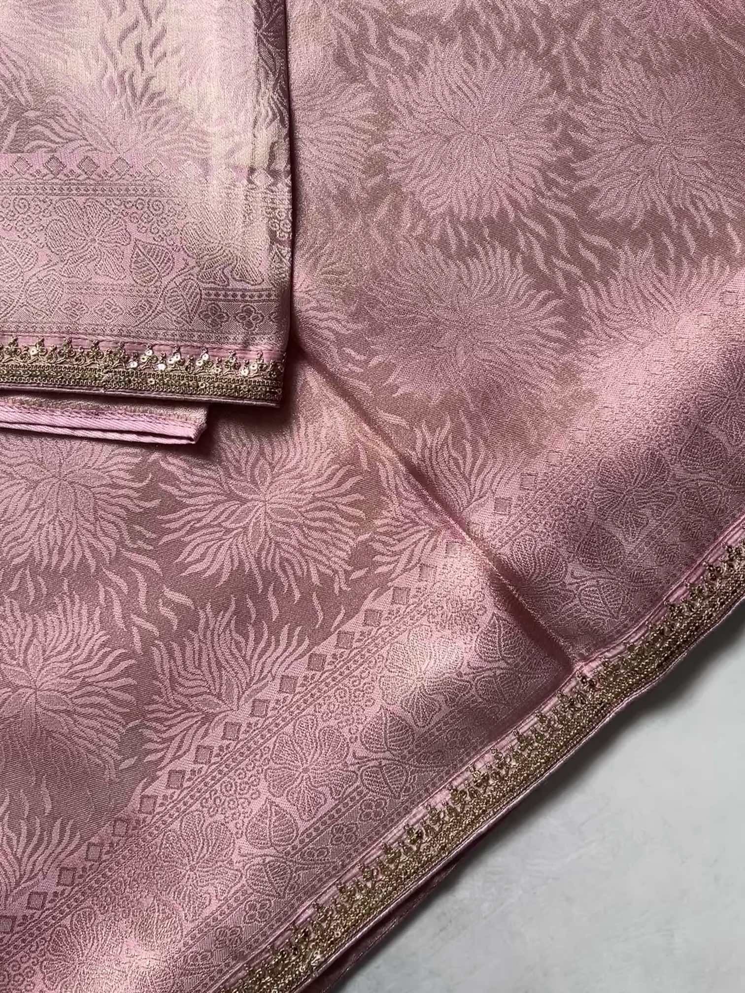The Banaras brocade saree is a timeless symbol of Indian elegance, known for its luxurious silk fabric and intricate zari work. When adorned with embroidery appliqué work along the border, it becomes a true masterpiece. The rich brocade weaves — often featuring floral and Mughal motifs — are beautifully complemented by the detailed appliqué, adding texture, contrast, and an artisanal charm. This fusion of tradition and craftsmanship creates a saree that is both regal and expressive — perfect for grand occasions where grace meets heritage.