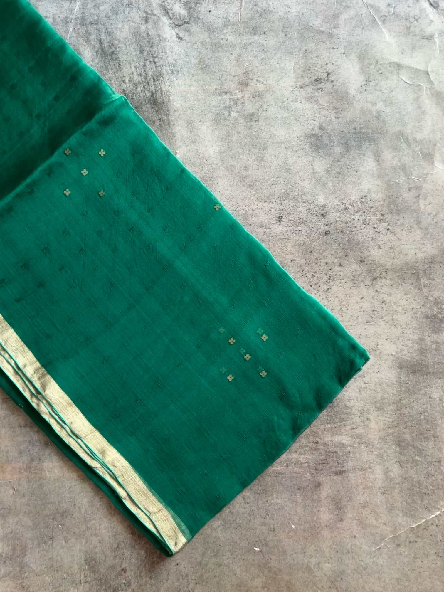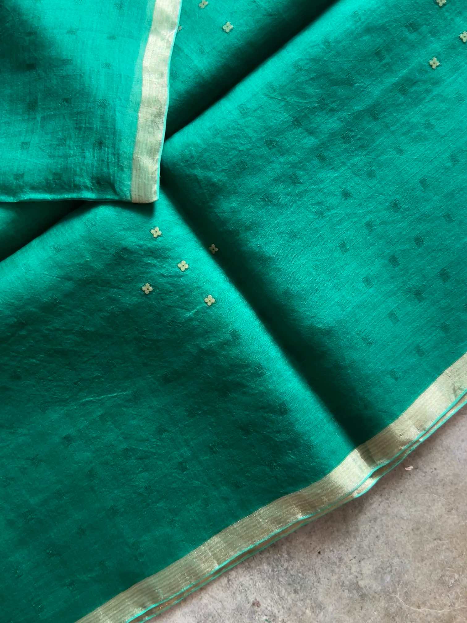 The delicate sheen of the Muslin silk fabric, renowned for its softness and lightweight nature, drapes gracefully, enhancing the wearer's beauty. The sequence work adds a subtle yet mesmerizing sparkle, elevating the saree with a modern touch of glamour while maintaining its traditional essence. The combination of these elements creates a perfect balance between luxurious opulence and traditional artistry, making the saree a stunning choice for weddings, festivals, or any special occasion.