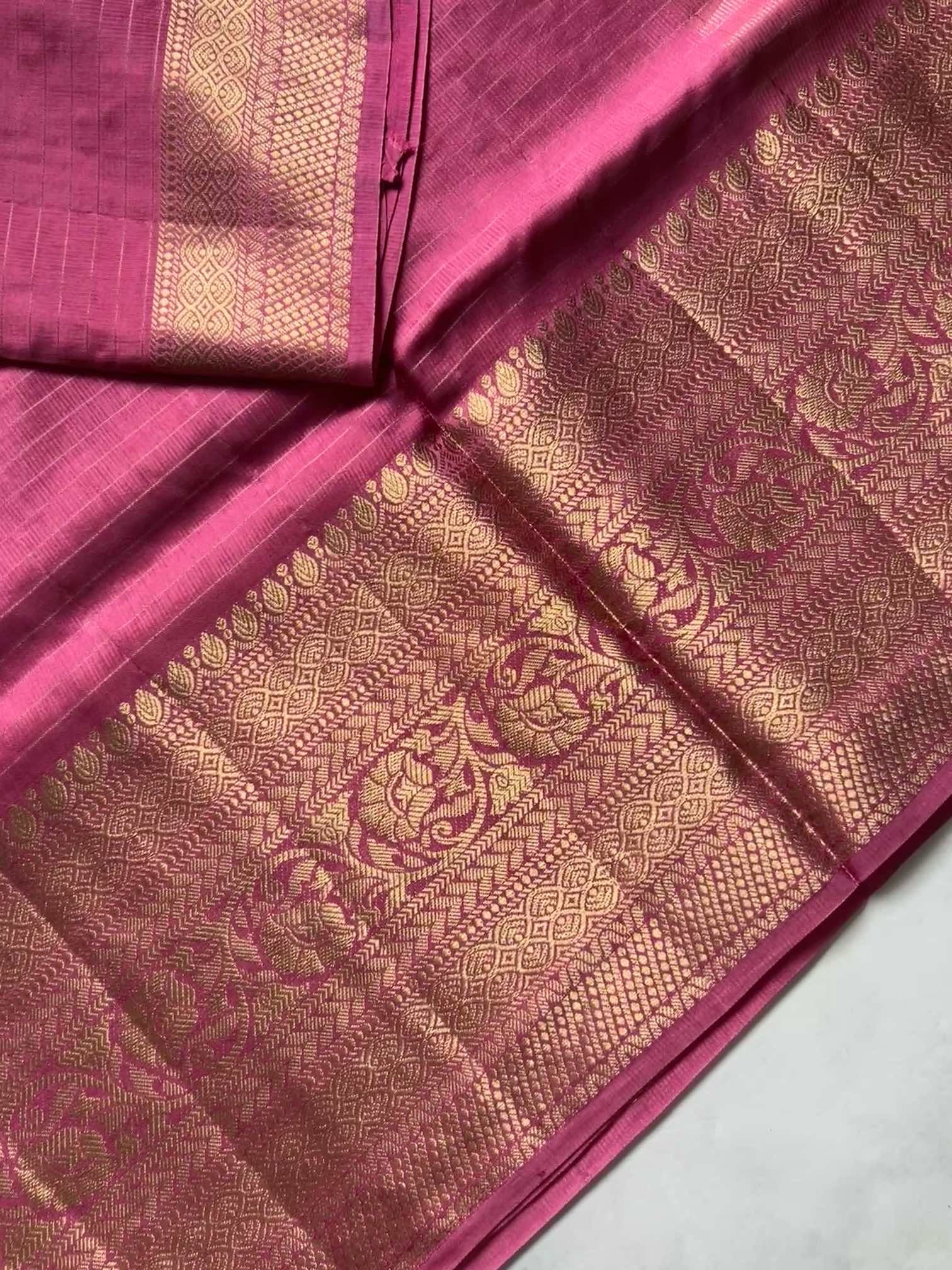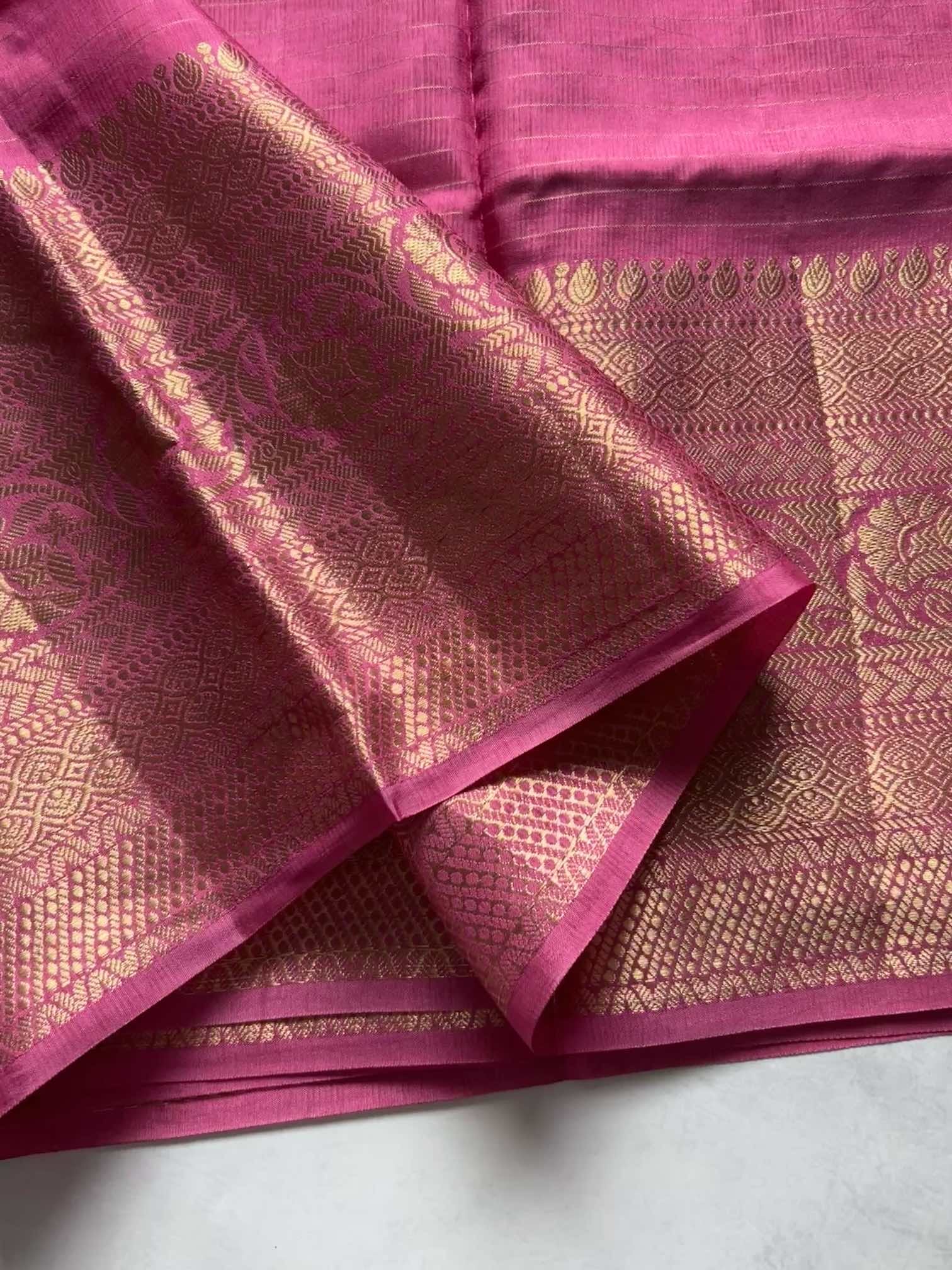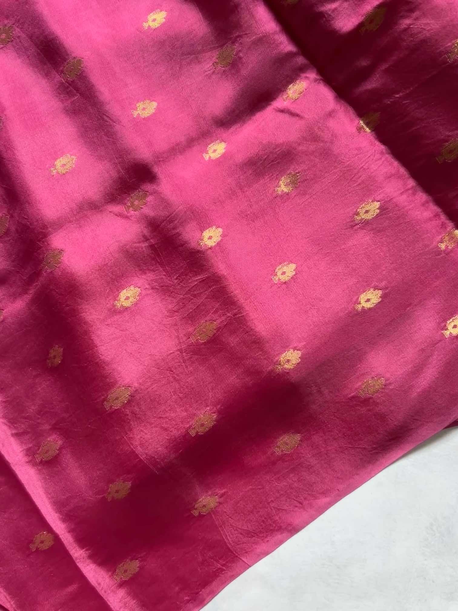 The soft, fluid texture of dola silk drapes with effortless grace, catching light in a gentle, elegant sheen. The brocade border adds a regal touch—rich, intricate, and timeless—while the fine zari lines running through the body create a subtle shimmer, giving the saree an ethereal charm.Together, these elements make the saree both sophisticated and captivating, perfect for moments that call for quiet grandeur and classic beauty.