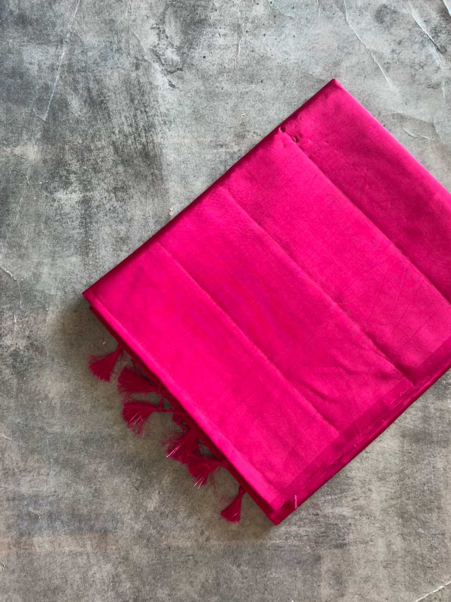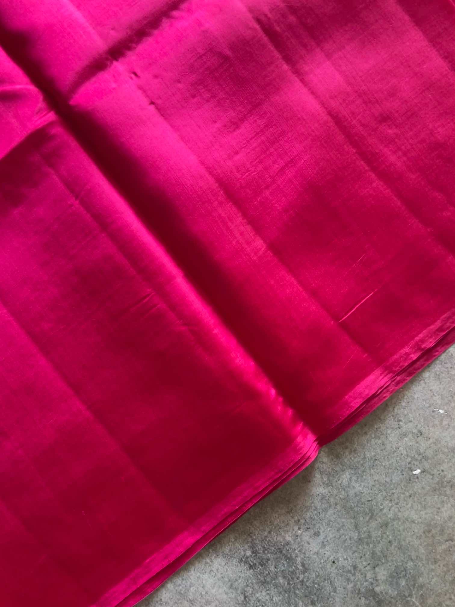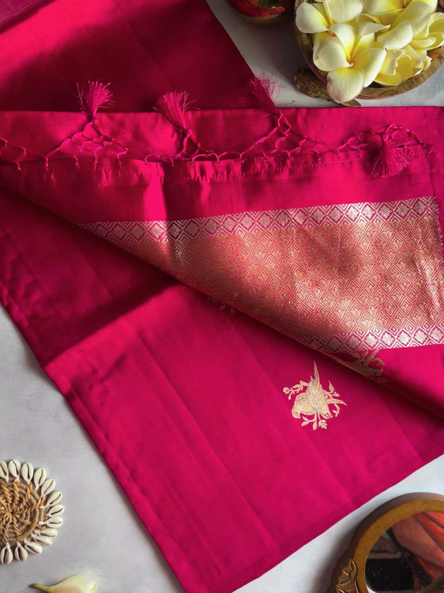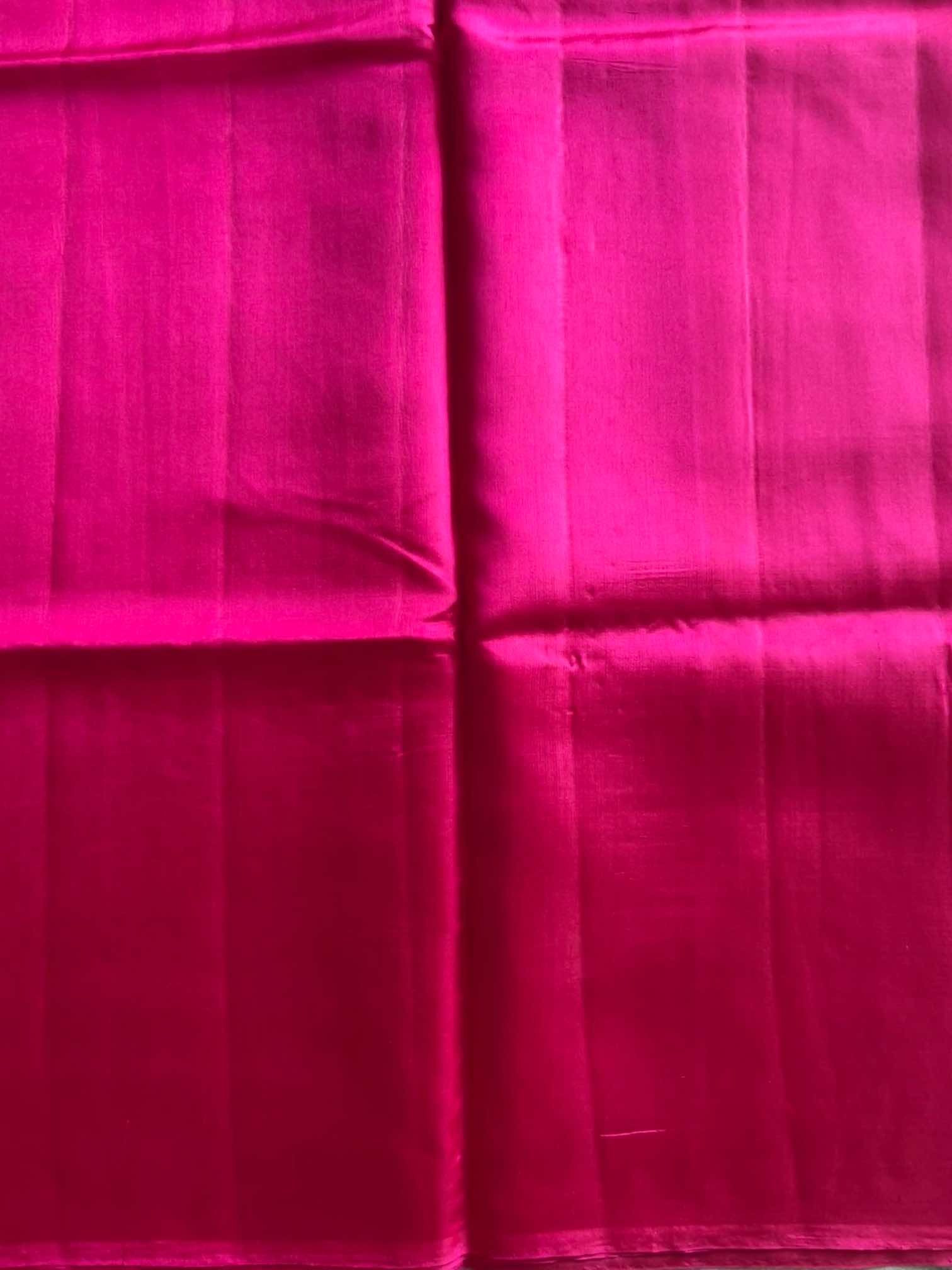 A Banaras silk saree with a plain body and zari-woven pallu is elegance in its purest form. The smooth, unadorned body lets the richness of the silk glow softly, while the intricately woven zari pallu adds a quiet touch of grandeur.