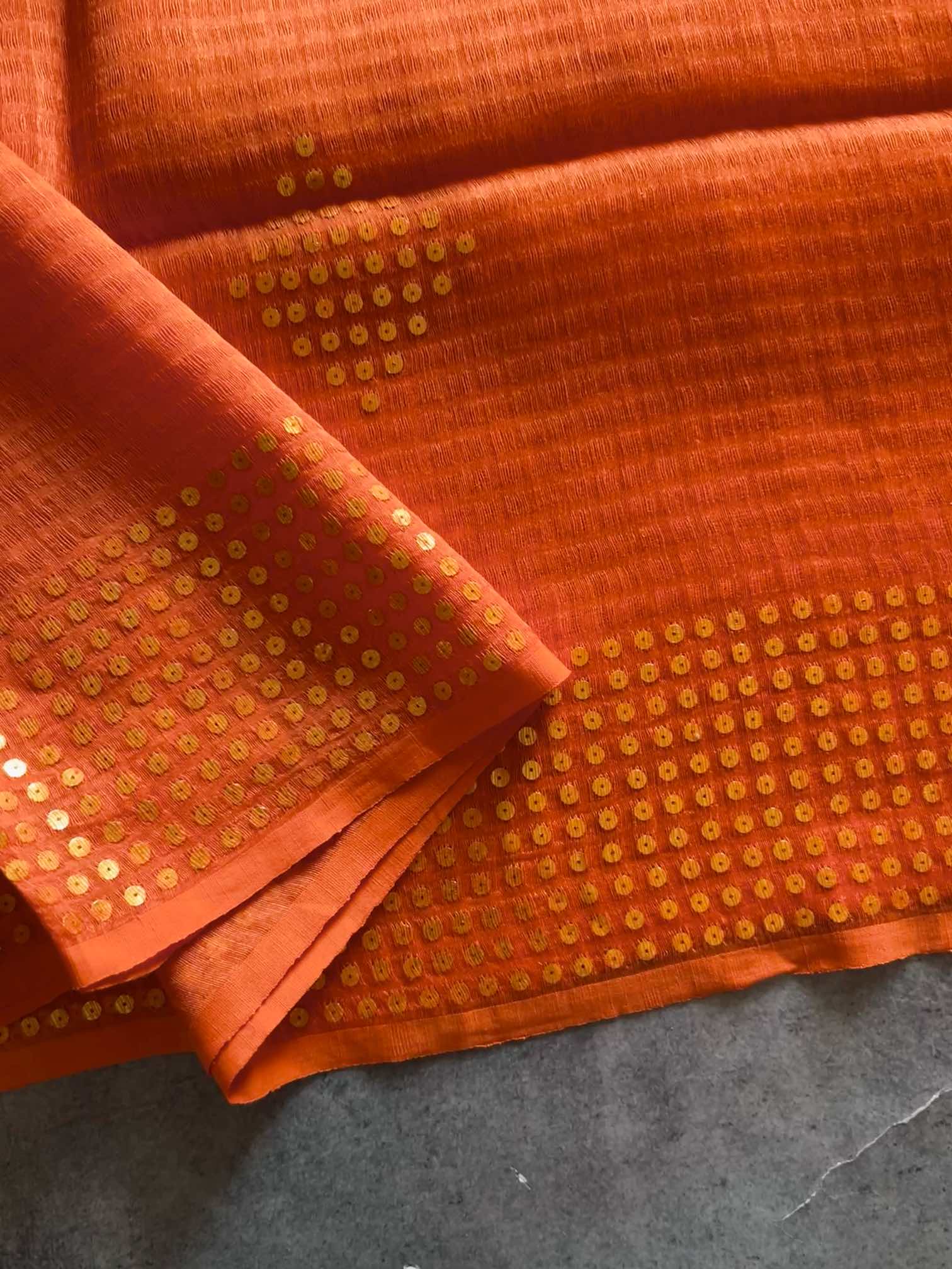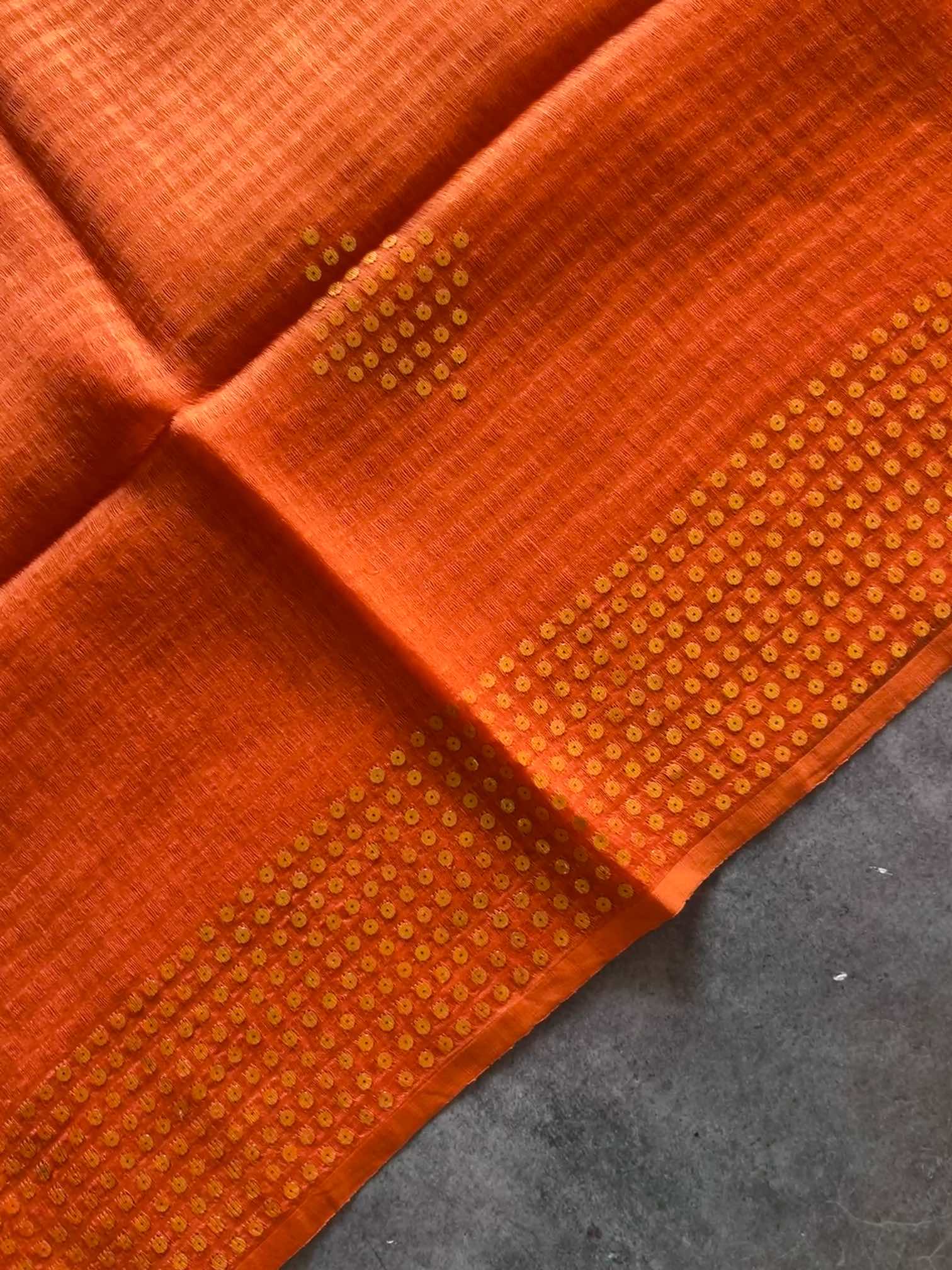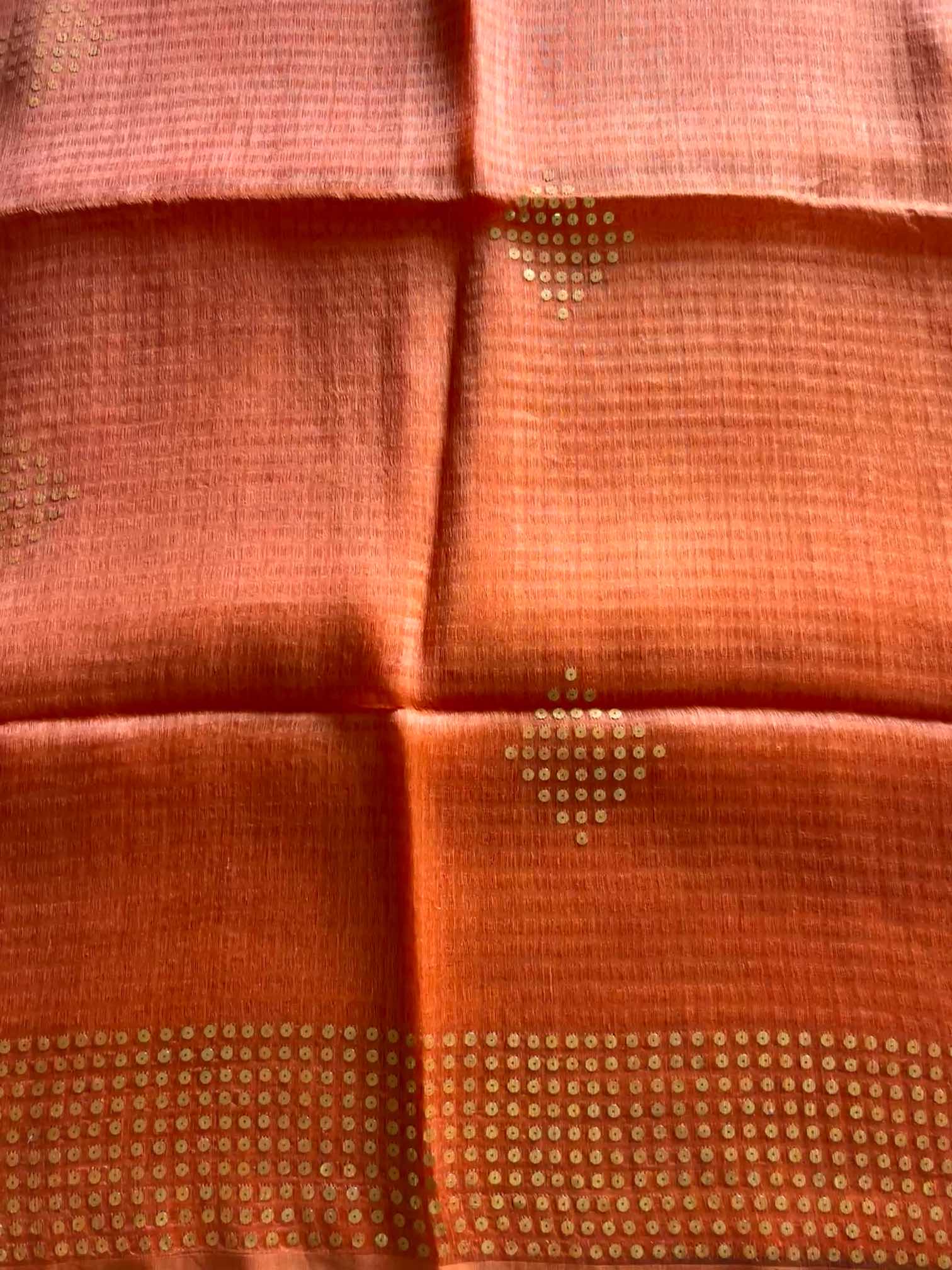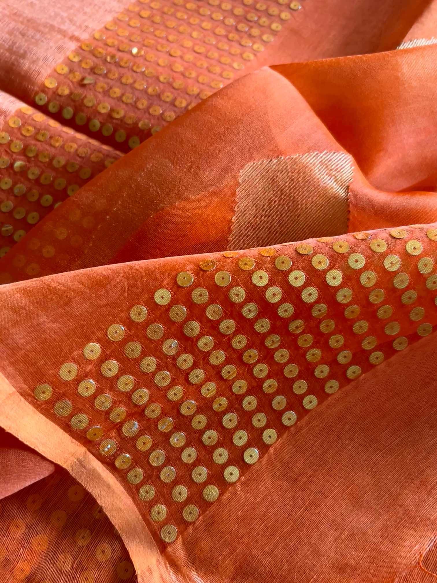 Pure muslin silk with gini work is a stunning blend of softness and sparkle. The airy elegance of muslin silk pairs beautifully with the intricate shimmer of gini embroidery, creating a fabric that’s both graceful and regal. The 6-heald handloom technique allows intricate placement of pocket sequins, subtly catching the light with every movement. The subtle shimmer and refined finish exude timeless sophistication, capturing light and movement with quiet luxury.