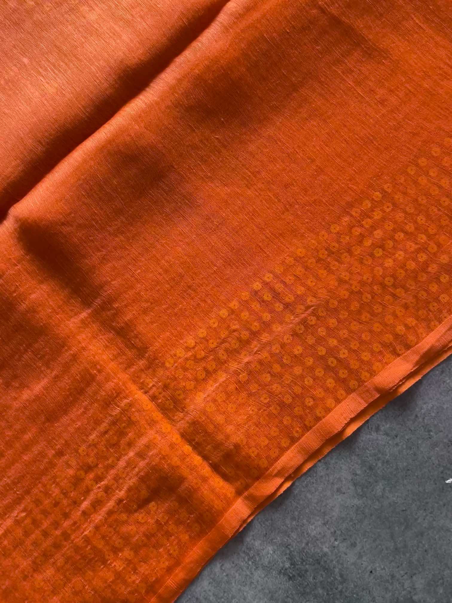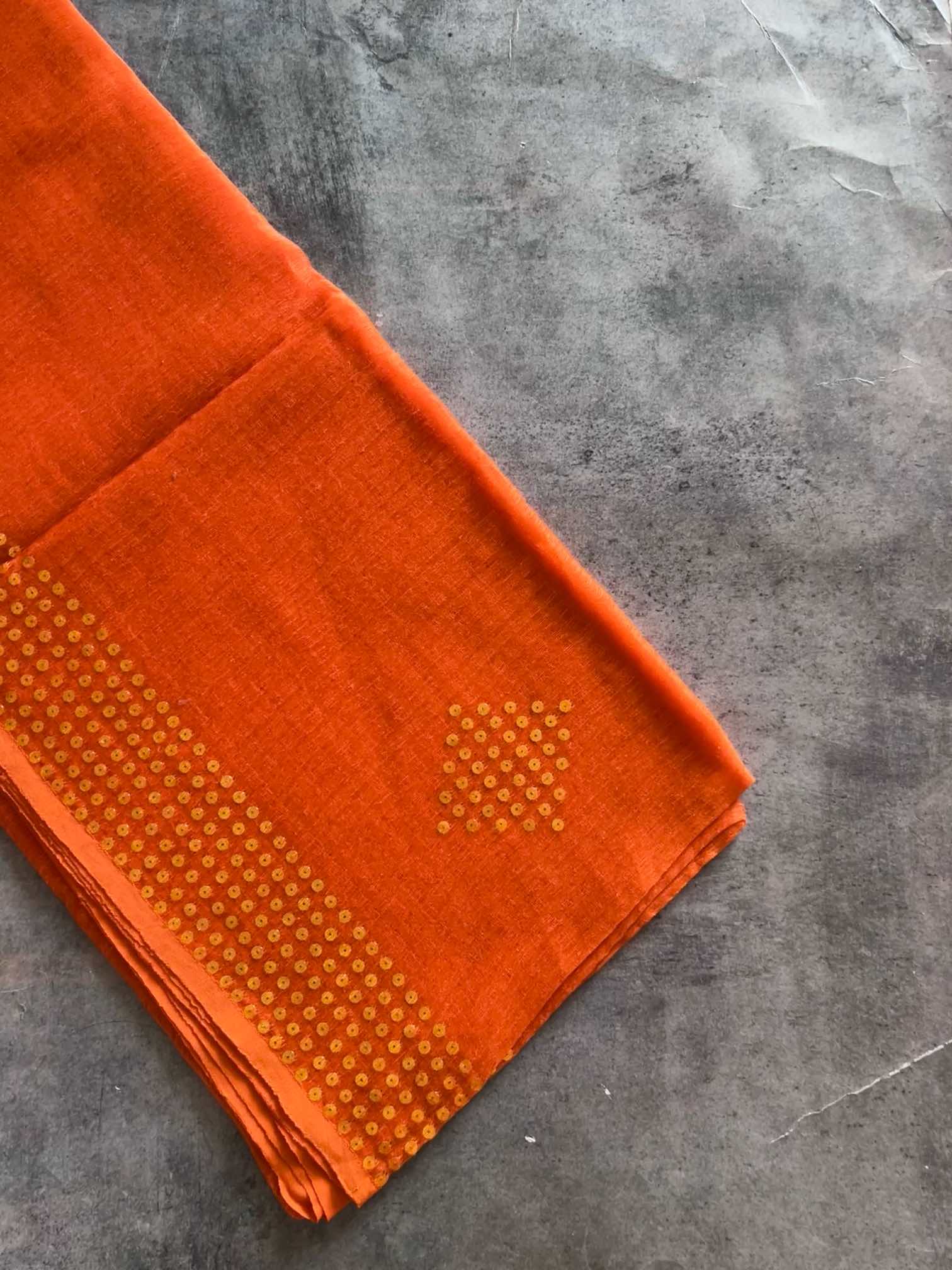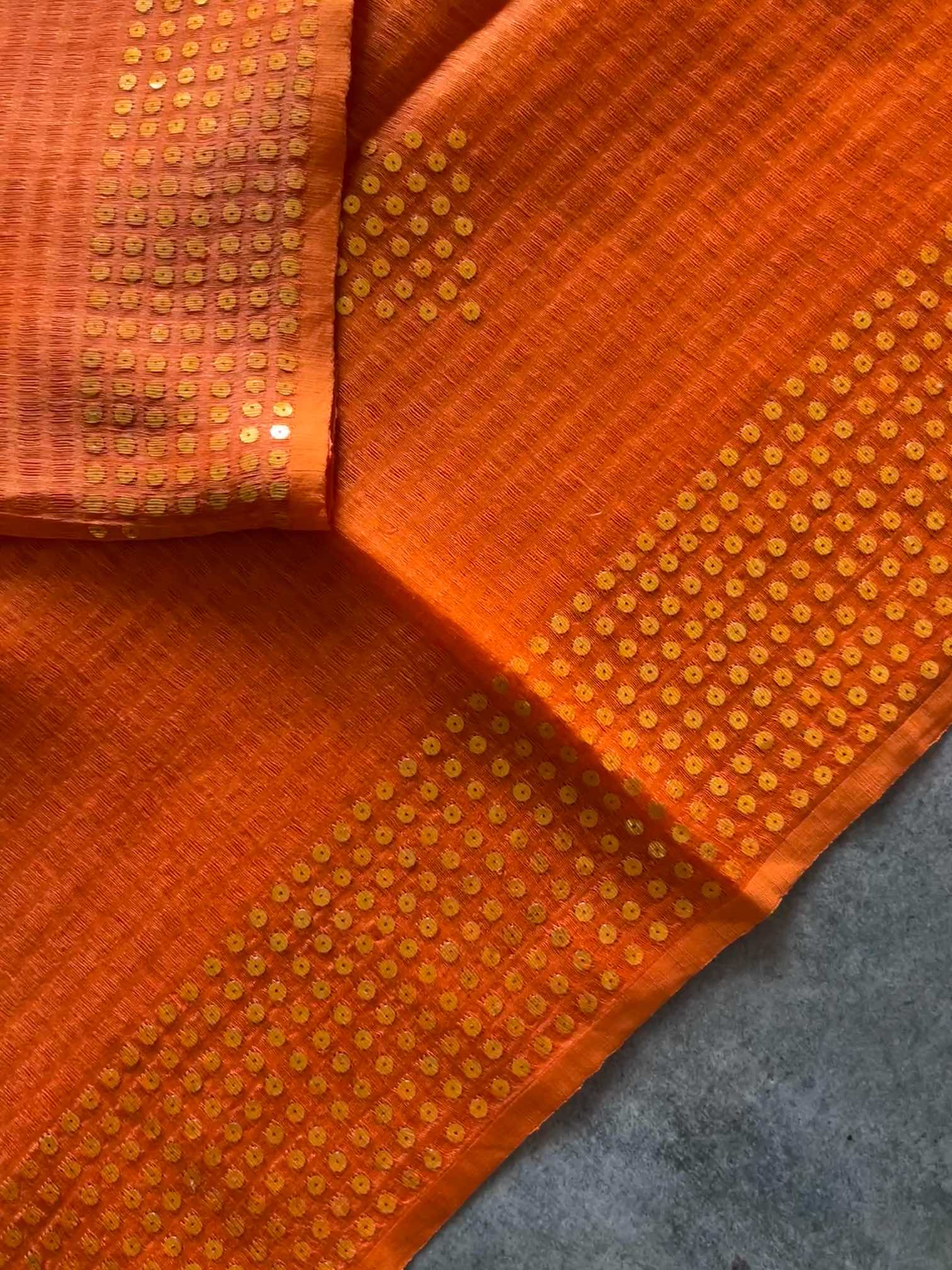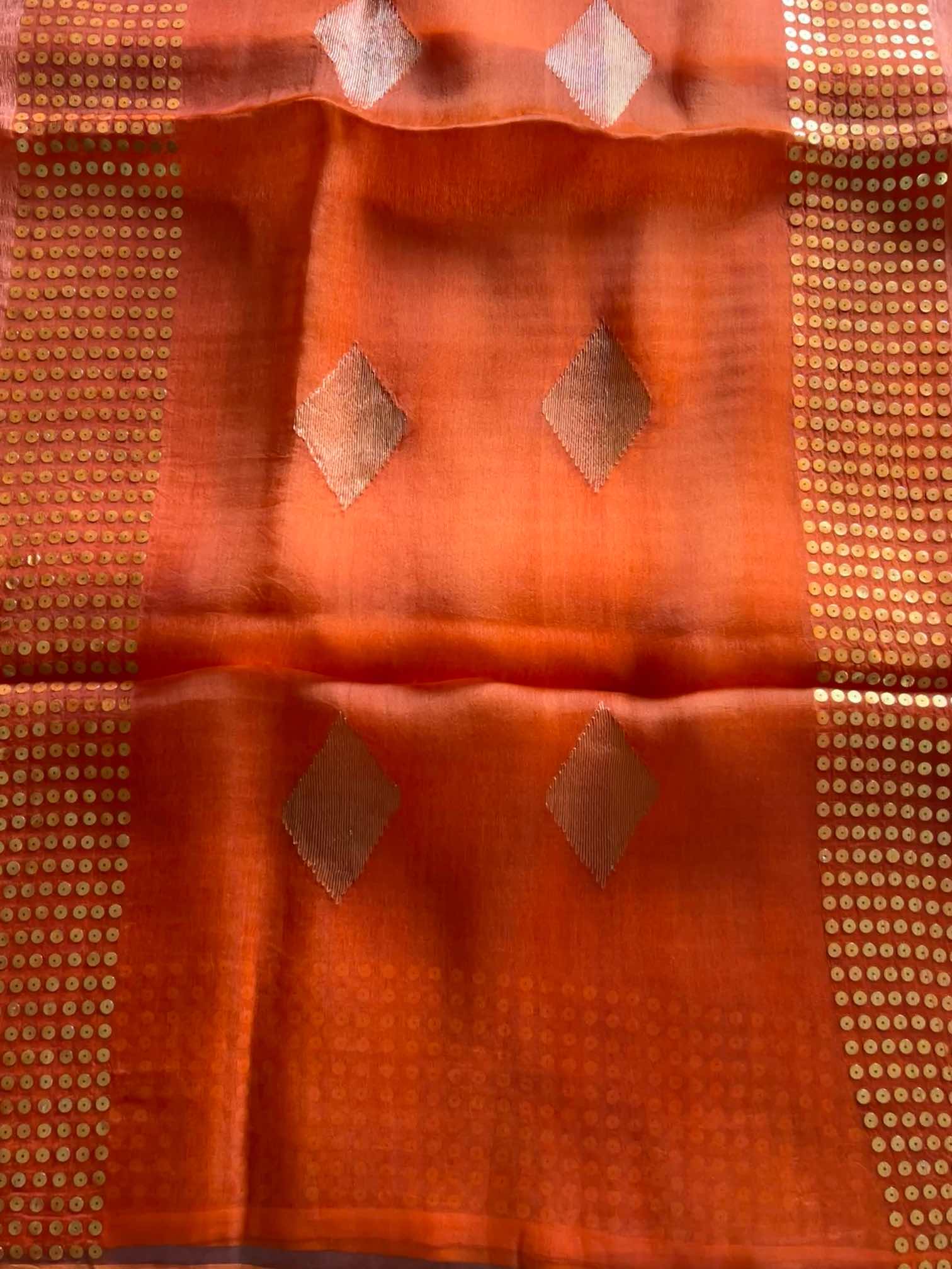 Pure muslin silk with gini work is a stunning blend of softness and sparkle. The airy elegance of muslin silk pairs beautifully with the intricate shimmer of gini embroidery, creating a fabric that’s both graceful and regal. The 6-heald handloom technique allows intricate placement of pocket sequins, subtly catching the light with every movement. The subtle shimmer and refined finish exude timeless sophistication, capturing light and movement with quiet luxury.