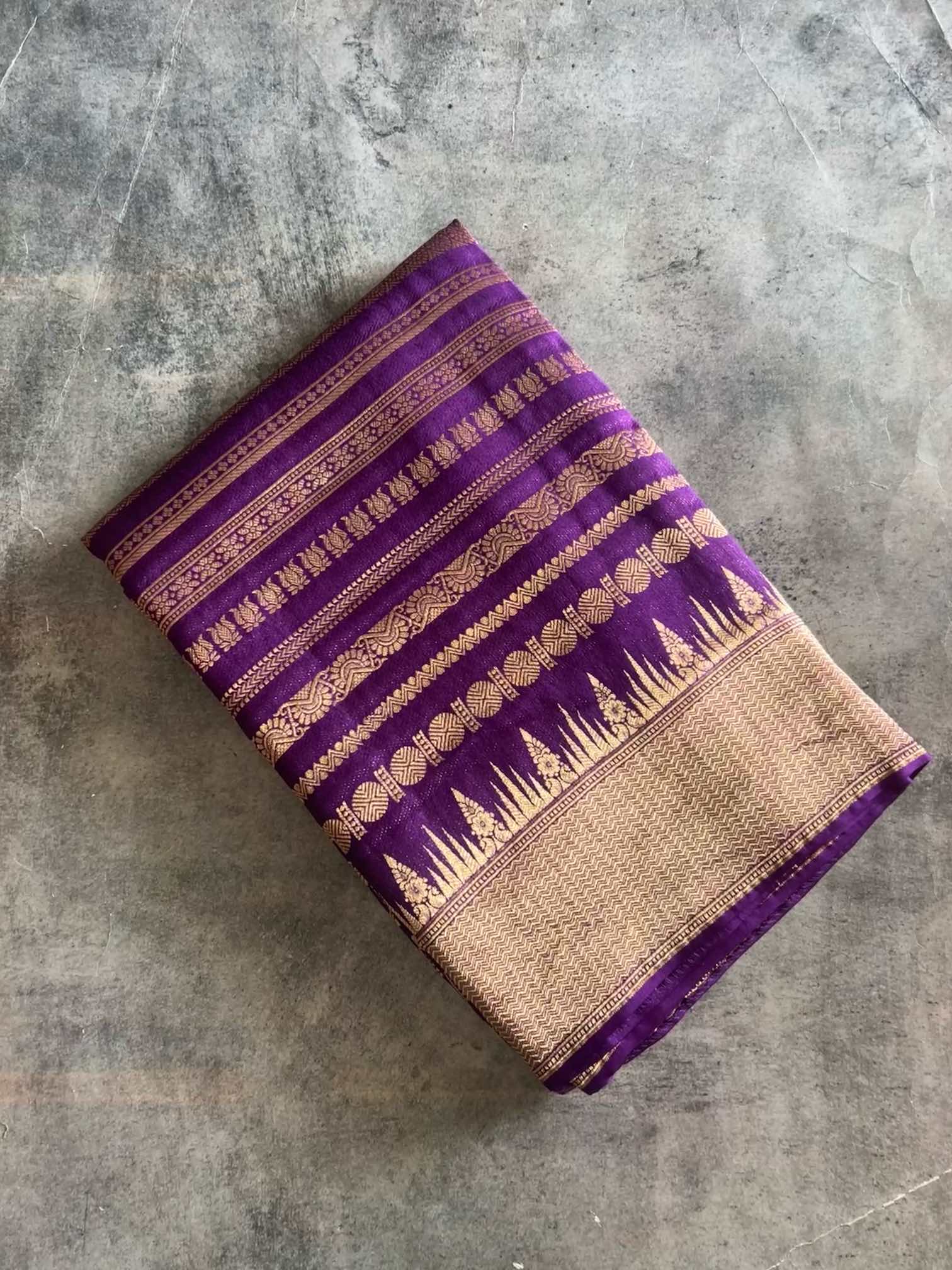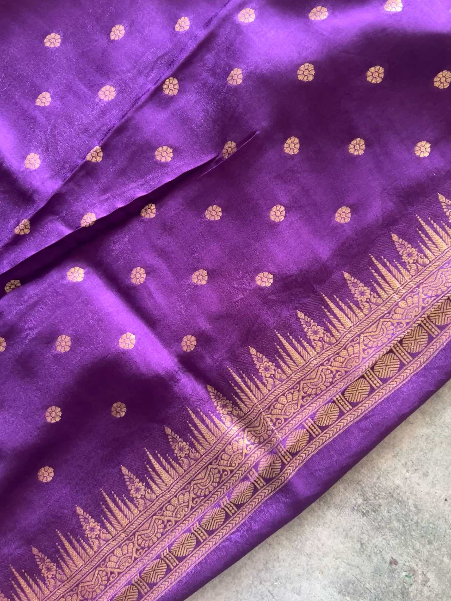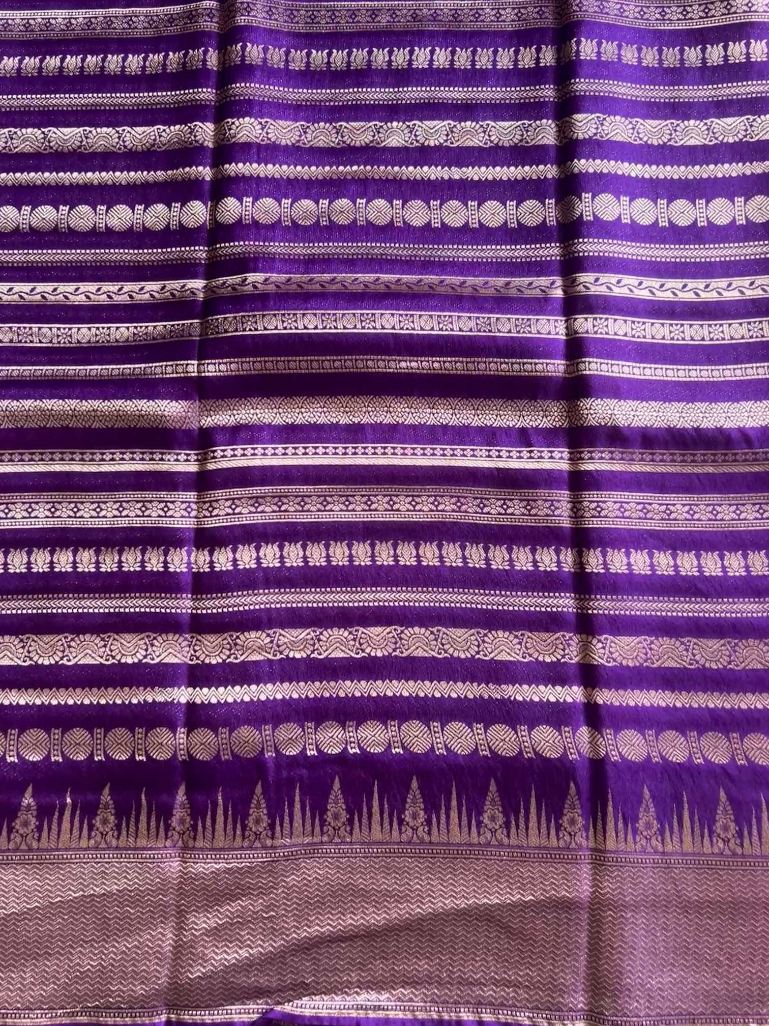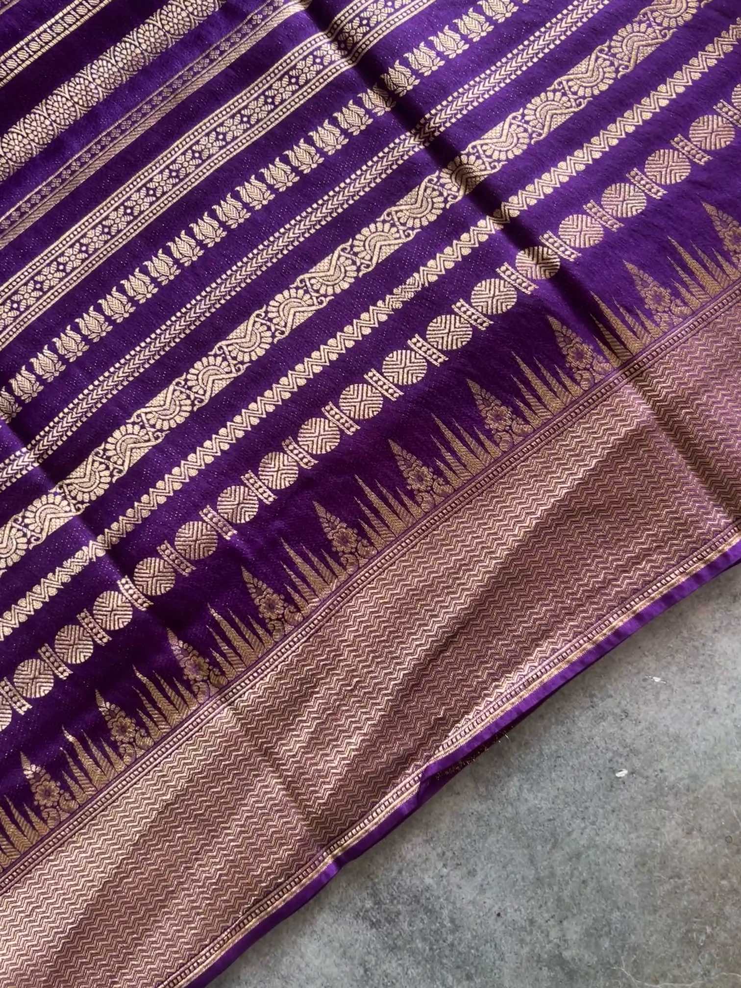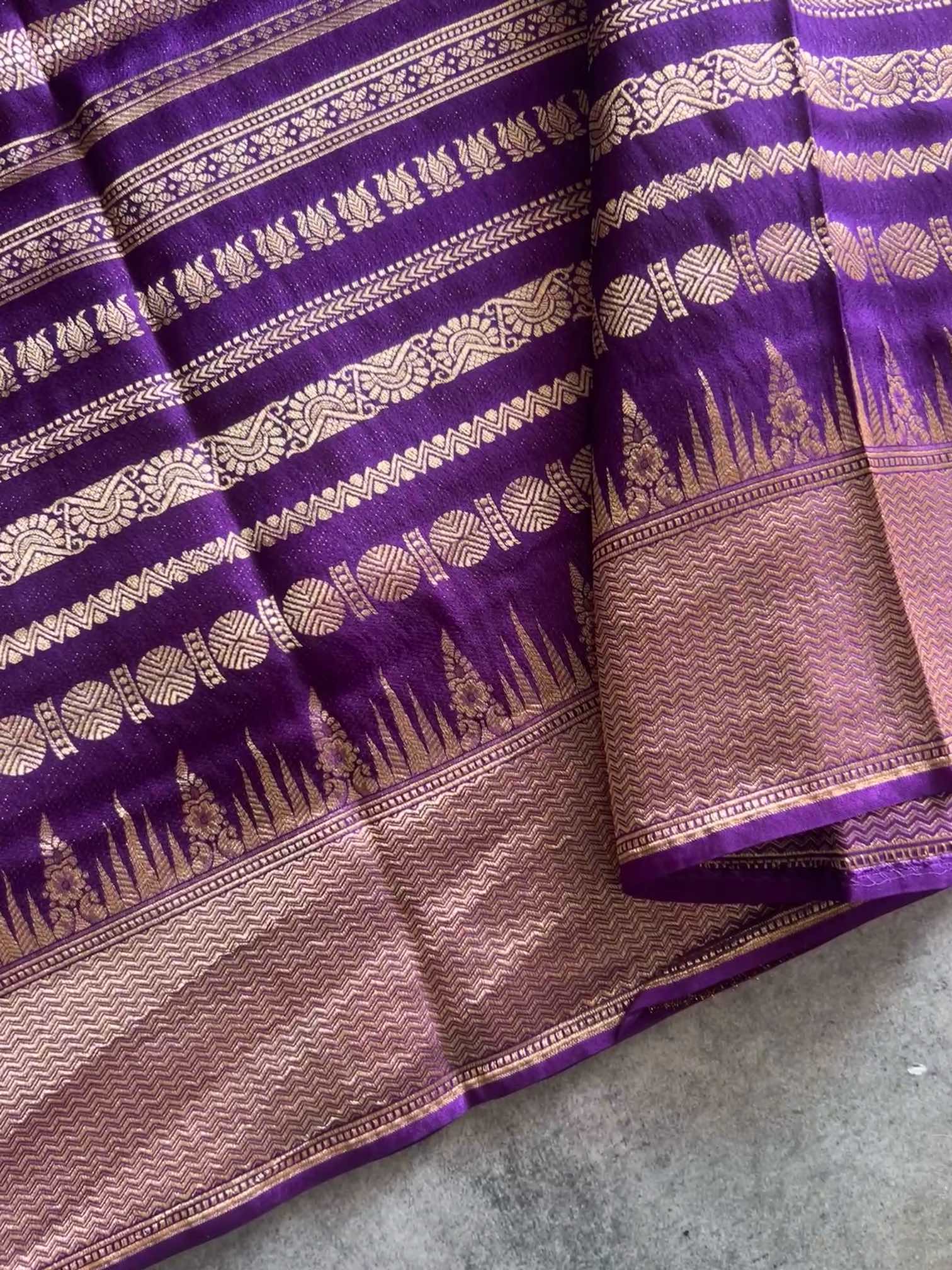 A crepe brocade saree with vertical zari patterns is sheer elegance—fluid drape, rich texture, and a subtle shimmer that elongates the silhouette. The vertical zari lines add a regal rhythm across the body, making it timeless, graceful, and effortlessly luxurious.