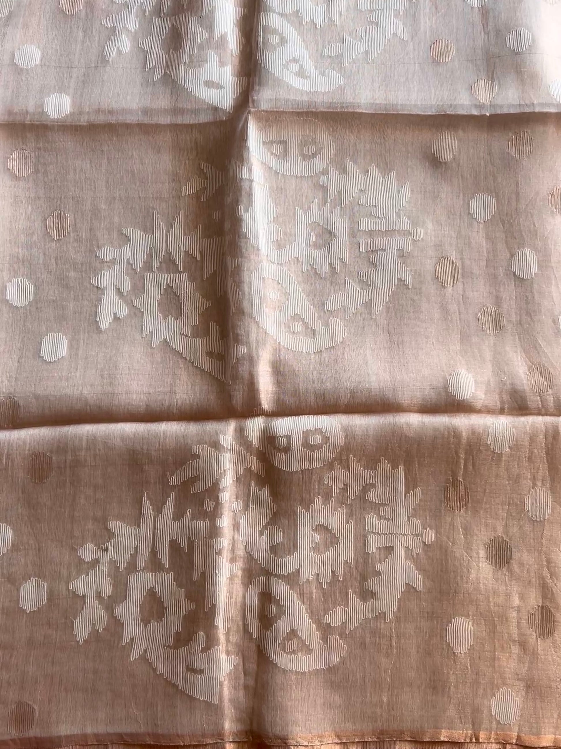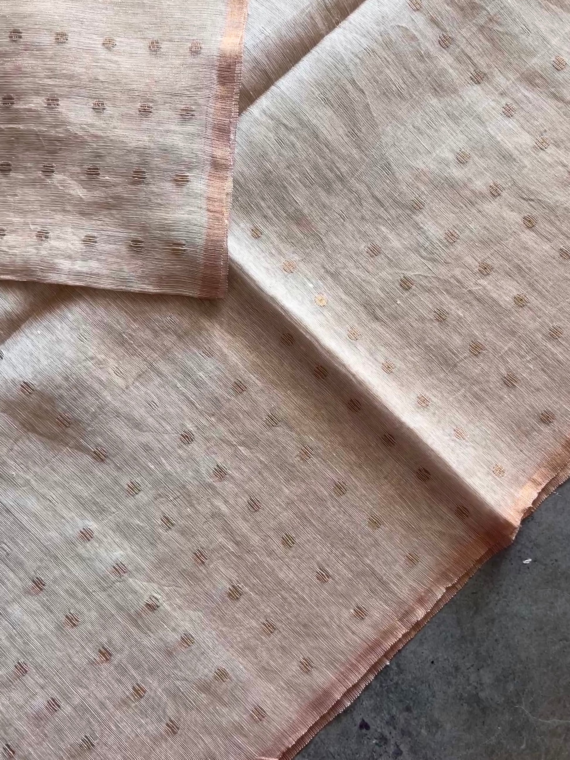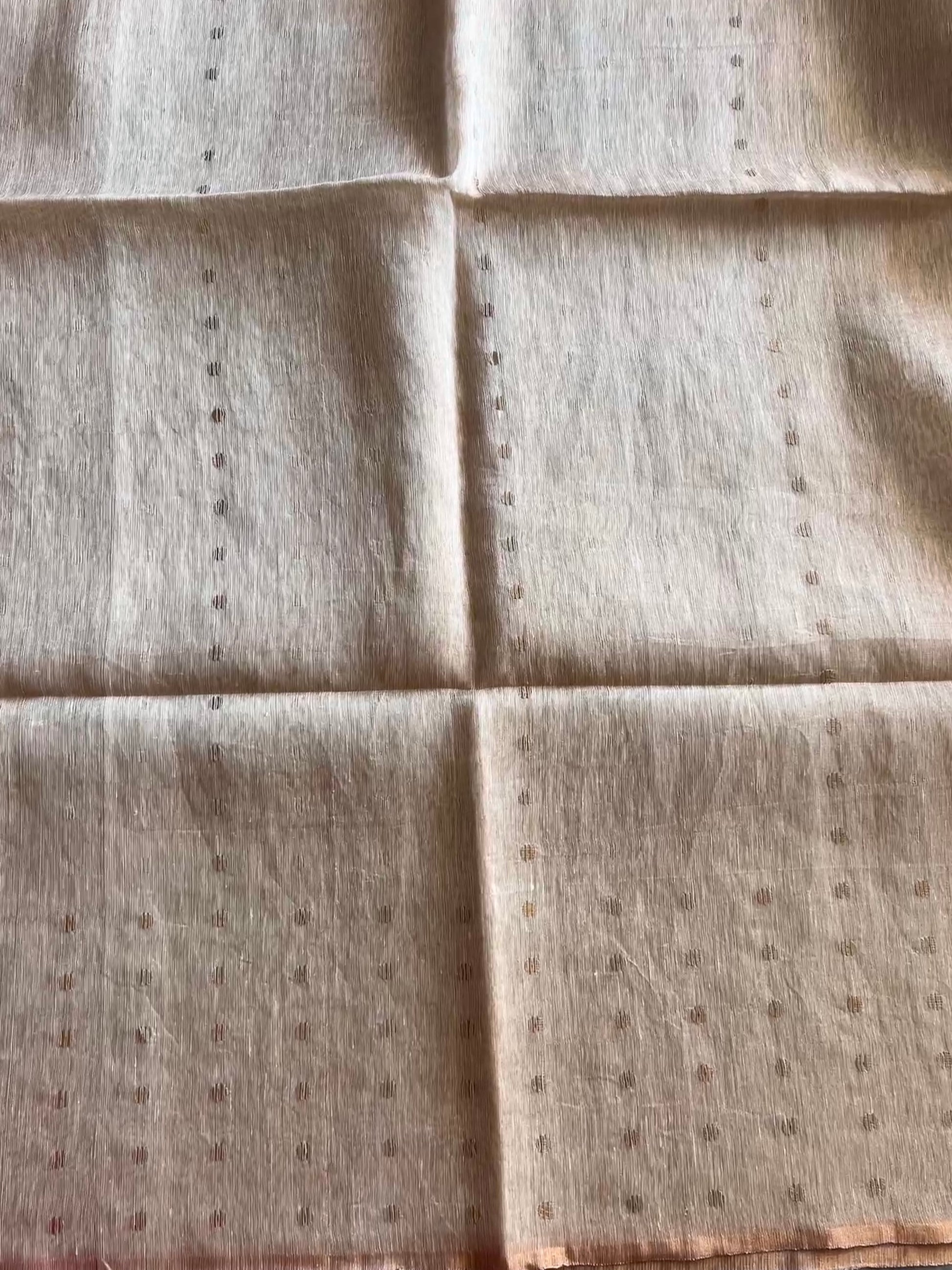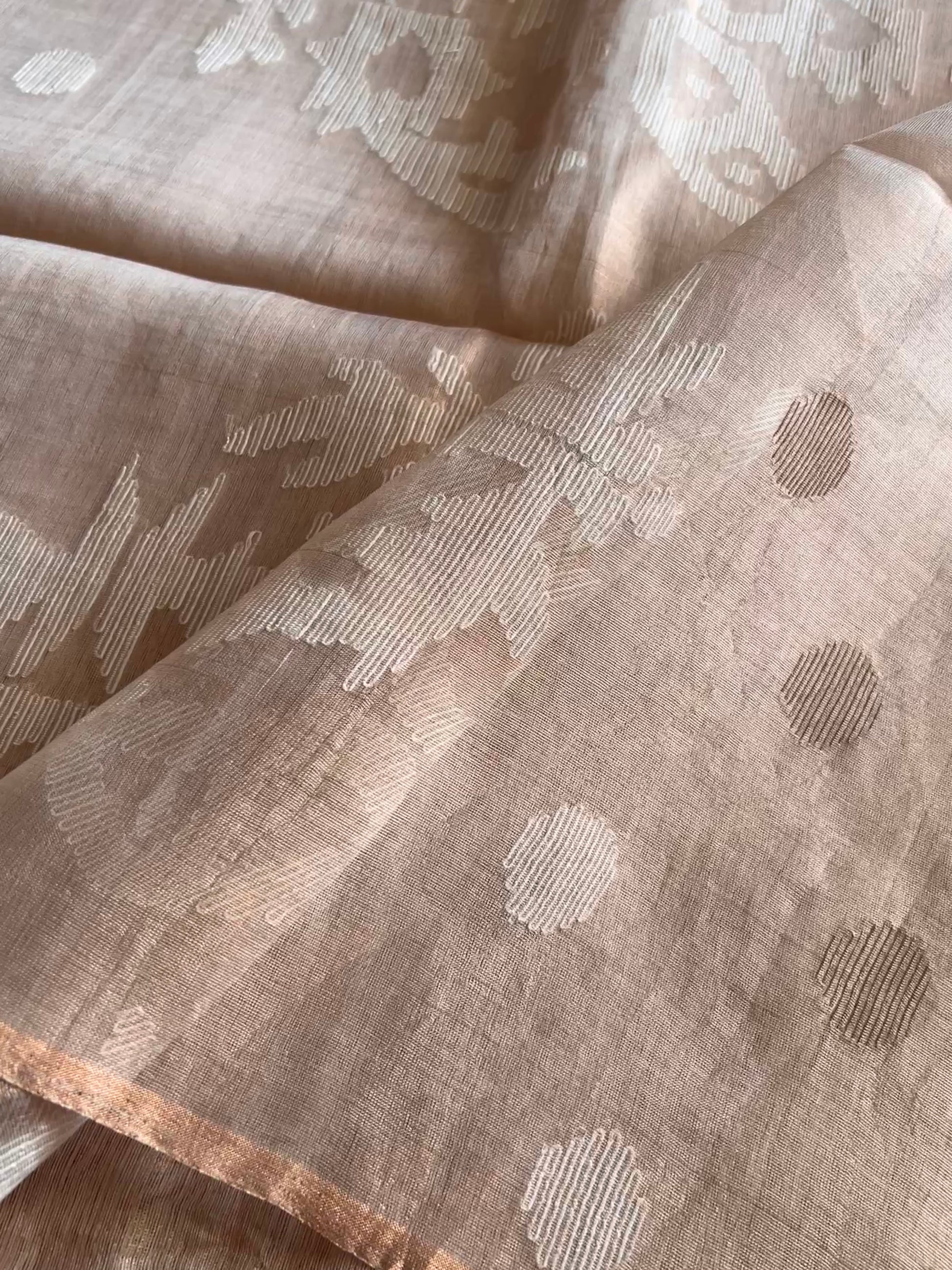 The linen silk fabric offers a perfect blend of crisp texture and subtle sheen, exuding effortless grace. Delicate gini work—with its fine metallic motifs—adds a gentle shimmer, infusing the saree with understated luxury. The highlight is the pallu adorned with Jamdhani weaving, where intricate, handwoven motifs seem to float on the airy fabric, showcasing the weaver's finesse and creativity.