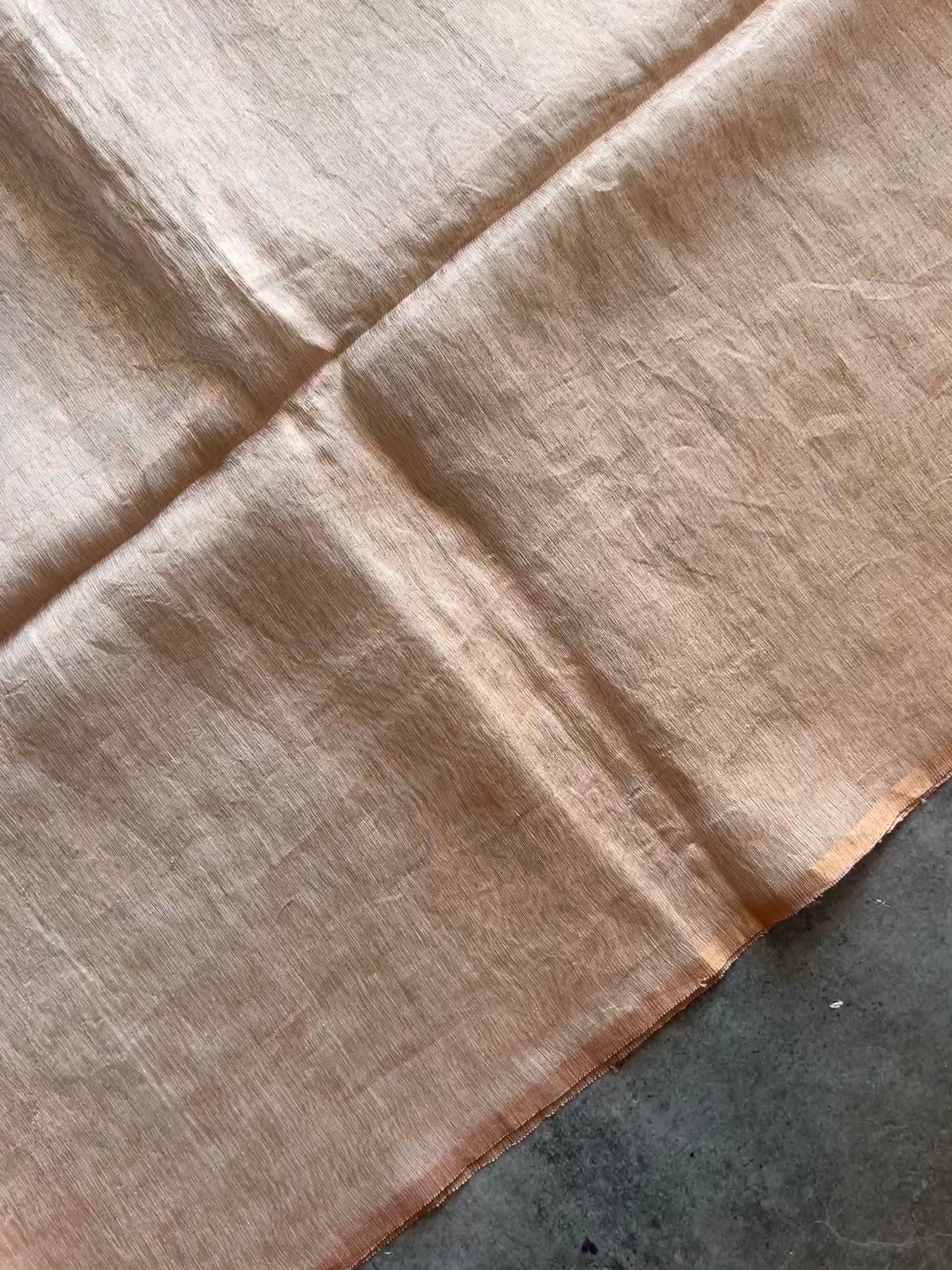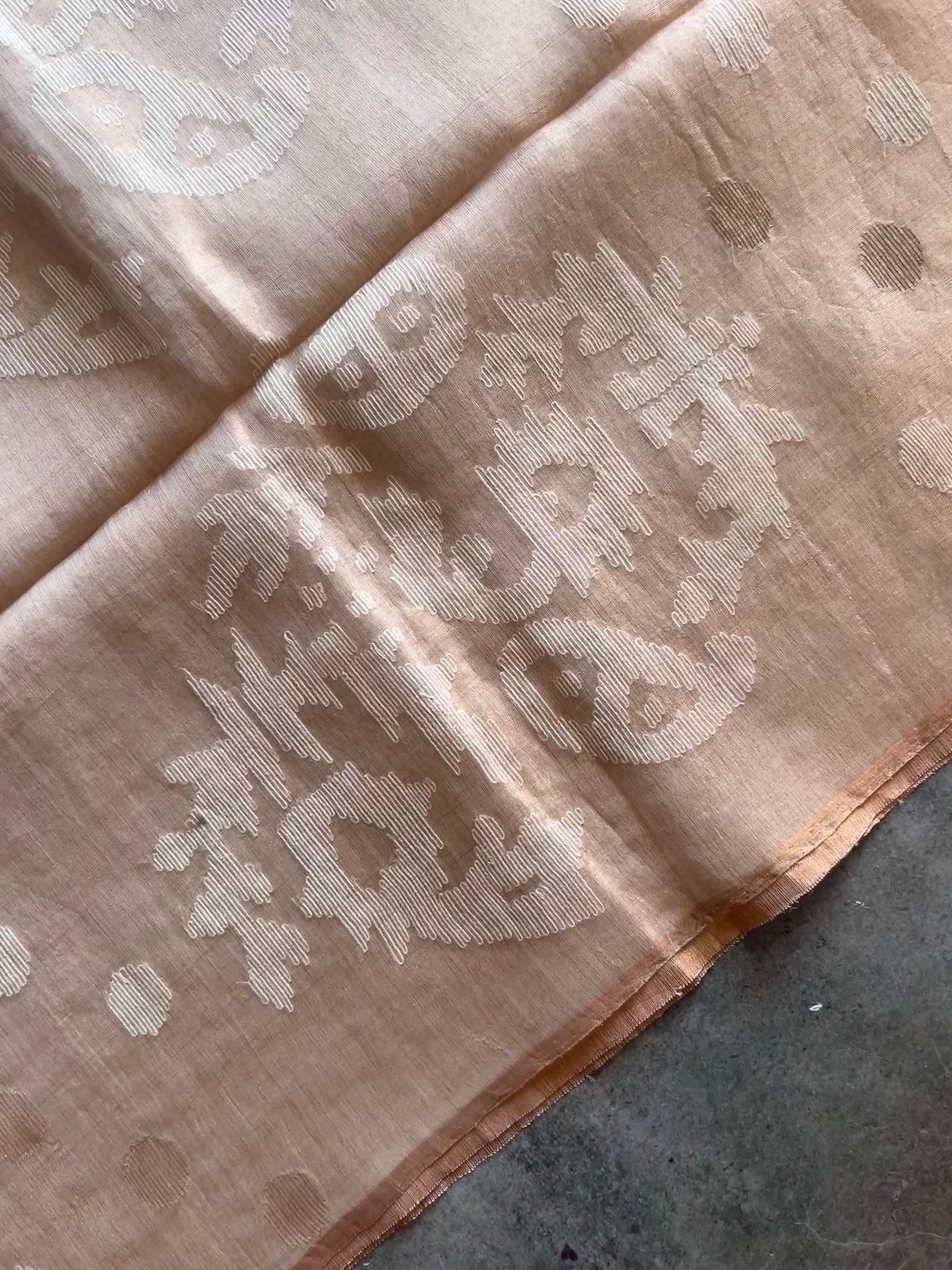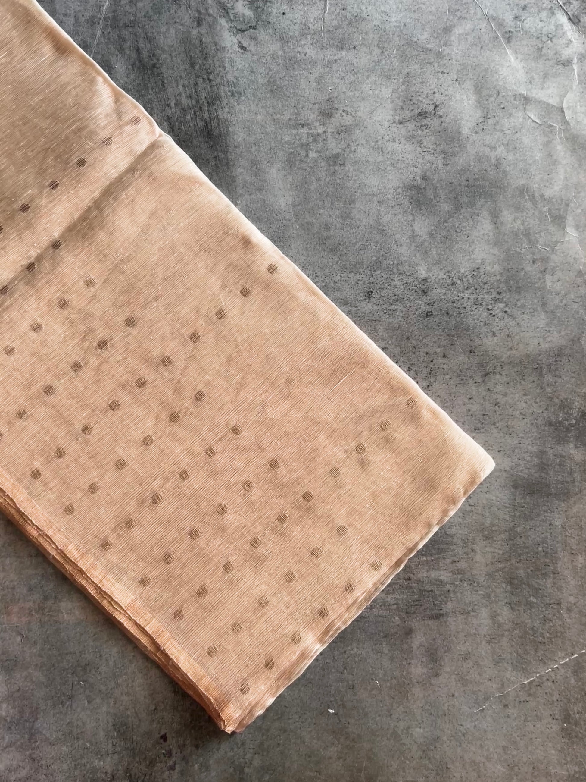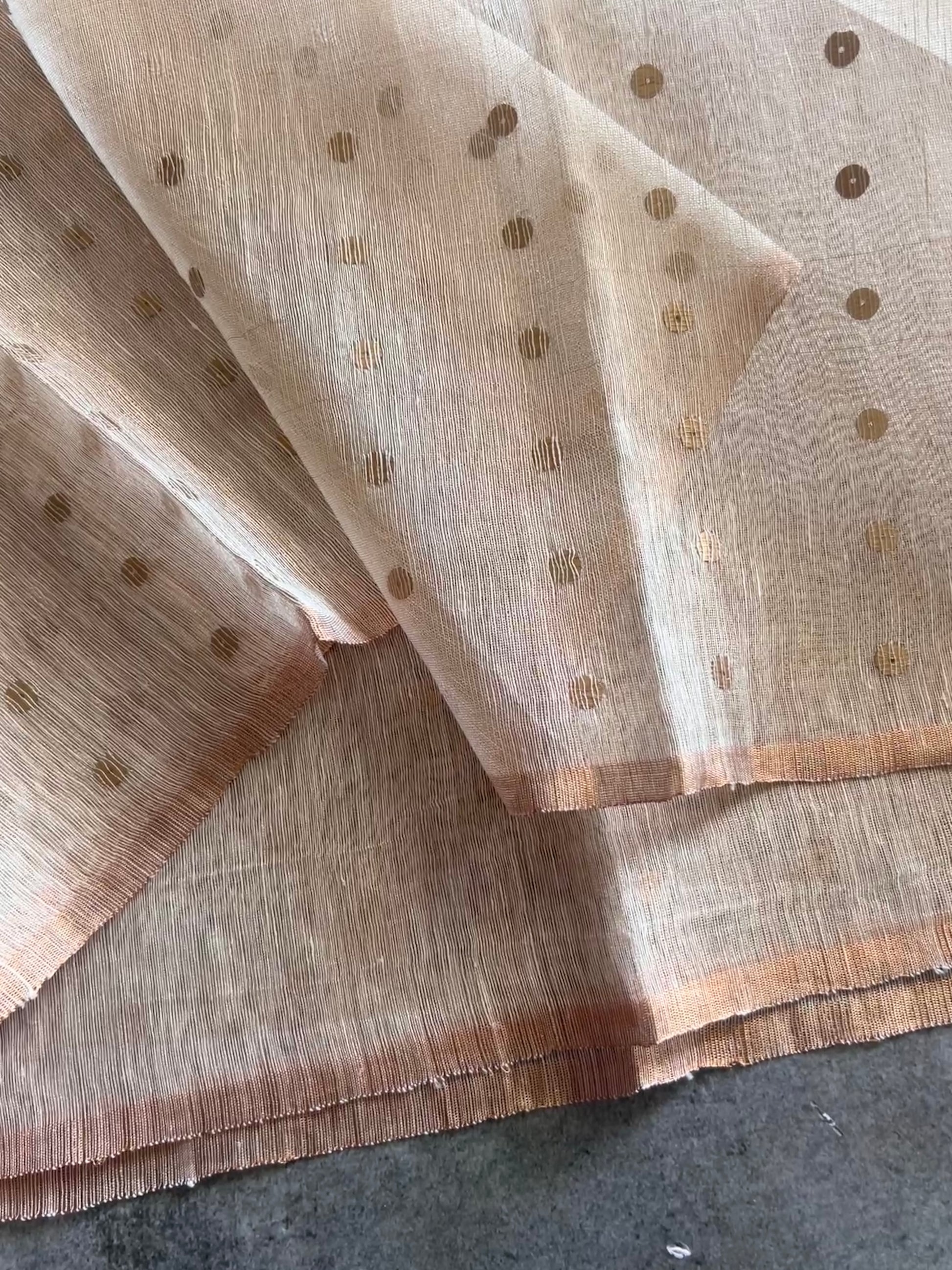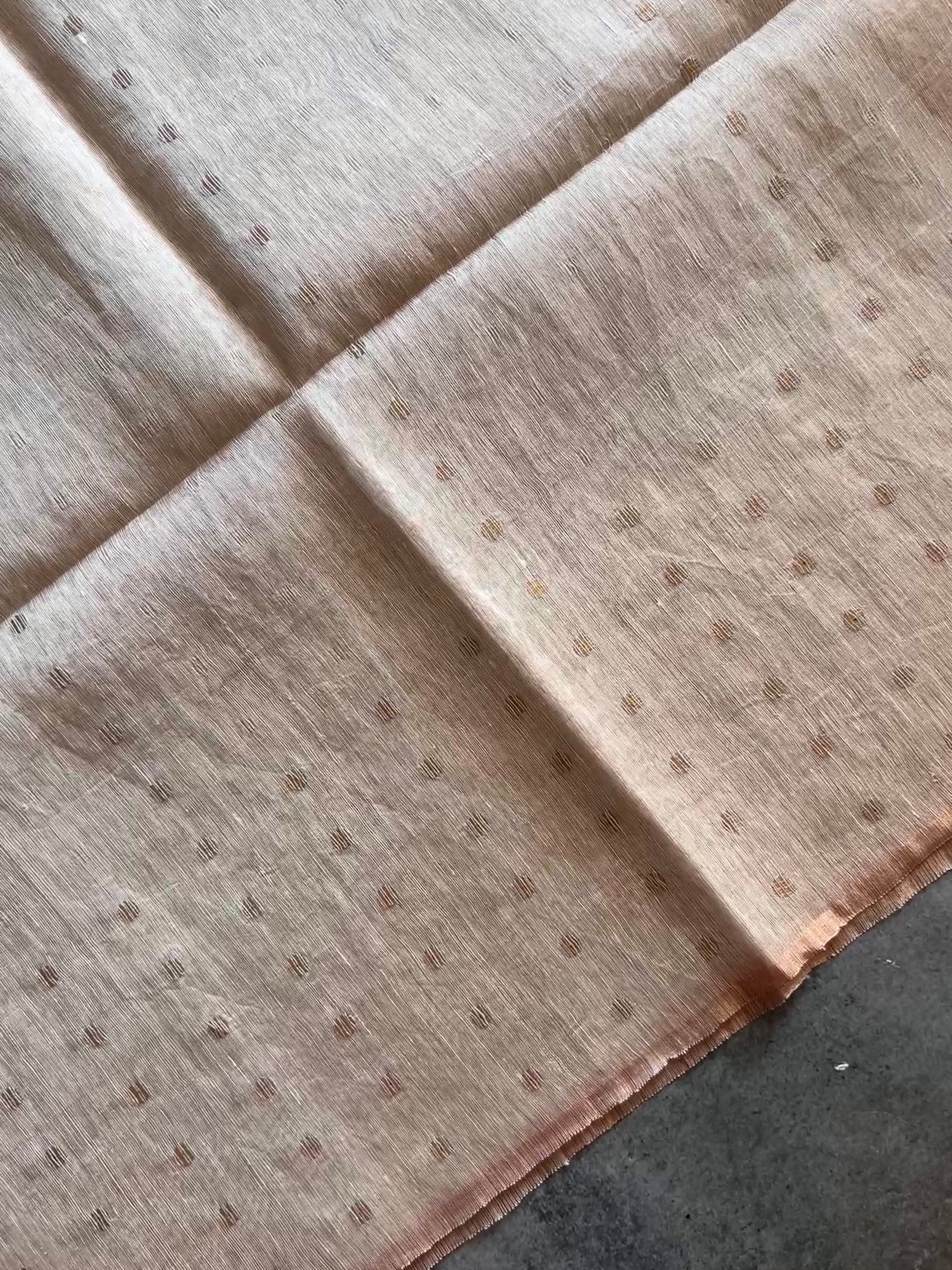 The linen silk fabric offers a perfect blend of crisp texture and subtle sheen, exuding effortless grace. Delicate gini work—with its fine metallic motifs—adds a gentle shimmer, infusing the saree with understated luxury. The highlight is the pallu adorned with Jamdhani weaving, where intricate, handwoven motifs seem to float on the airy fabric, showcasing the weaver's finesse and creativity.