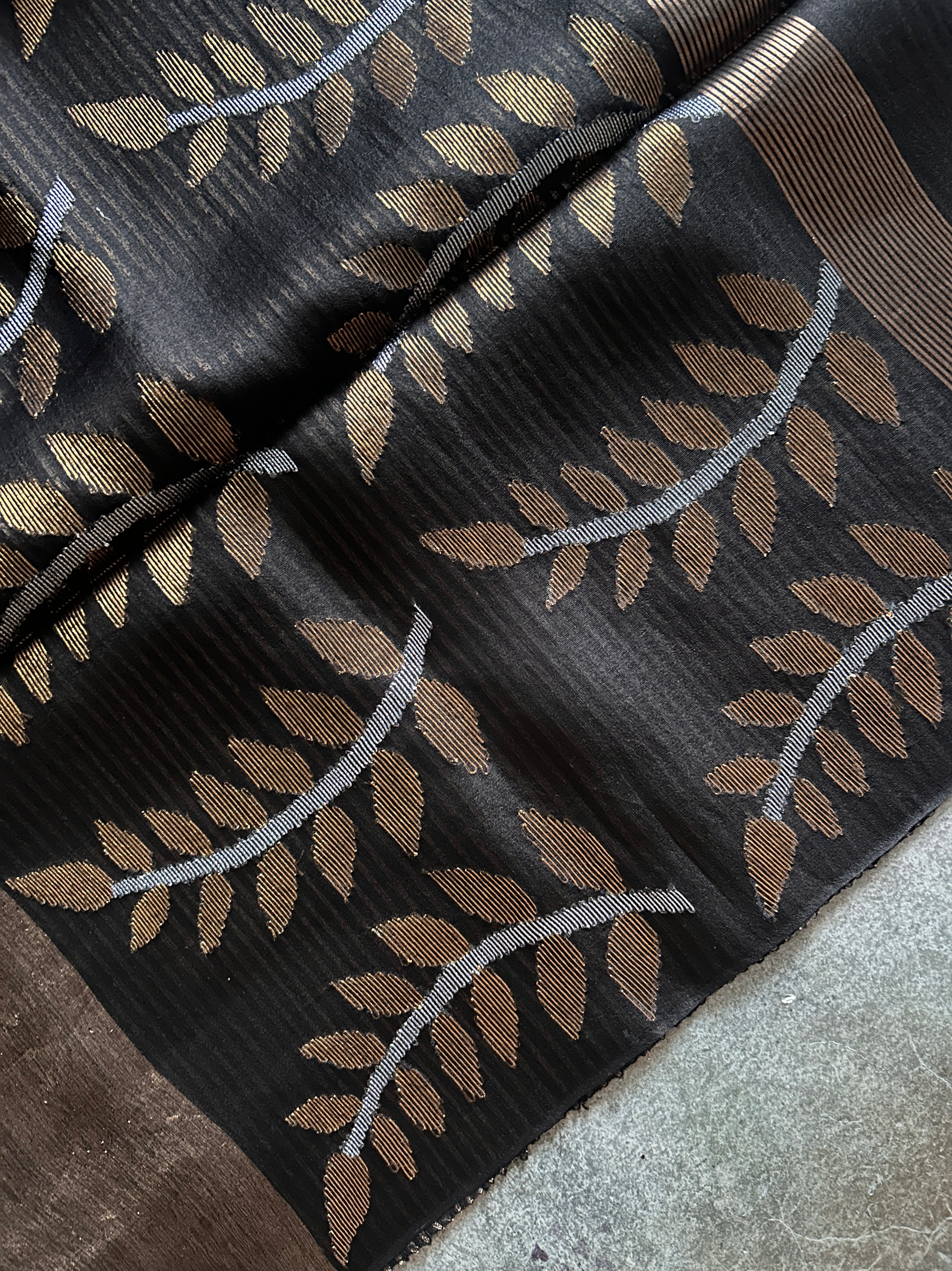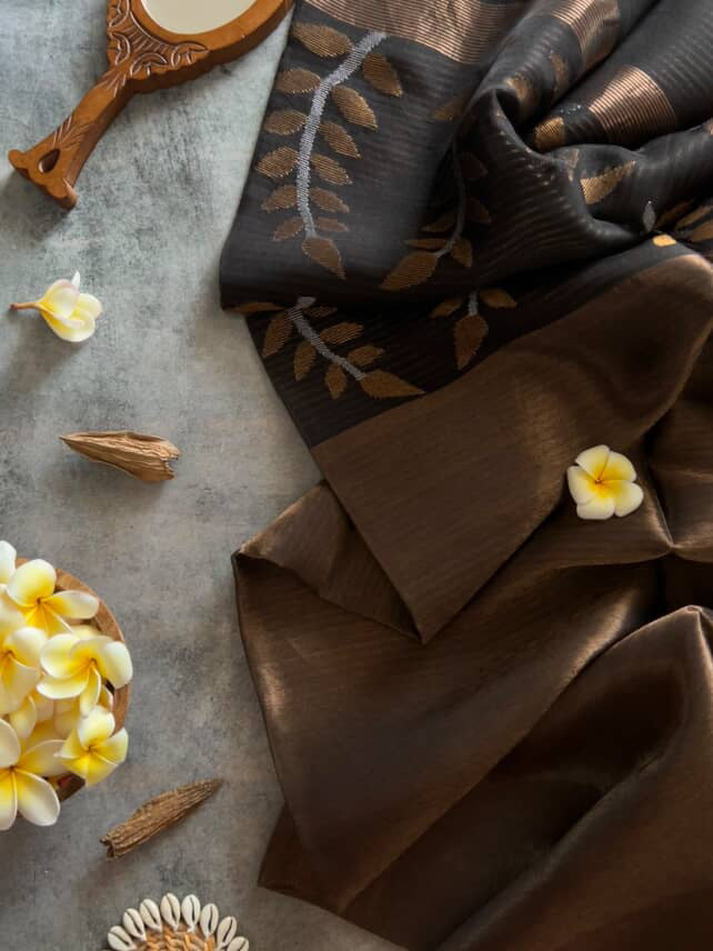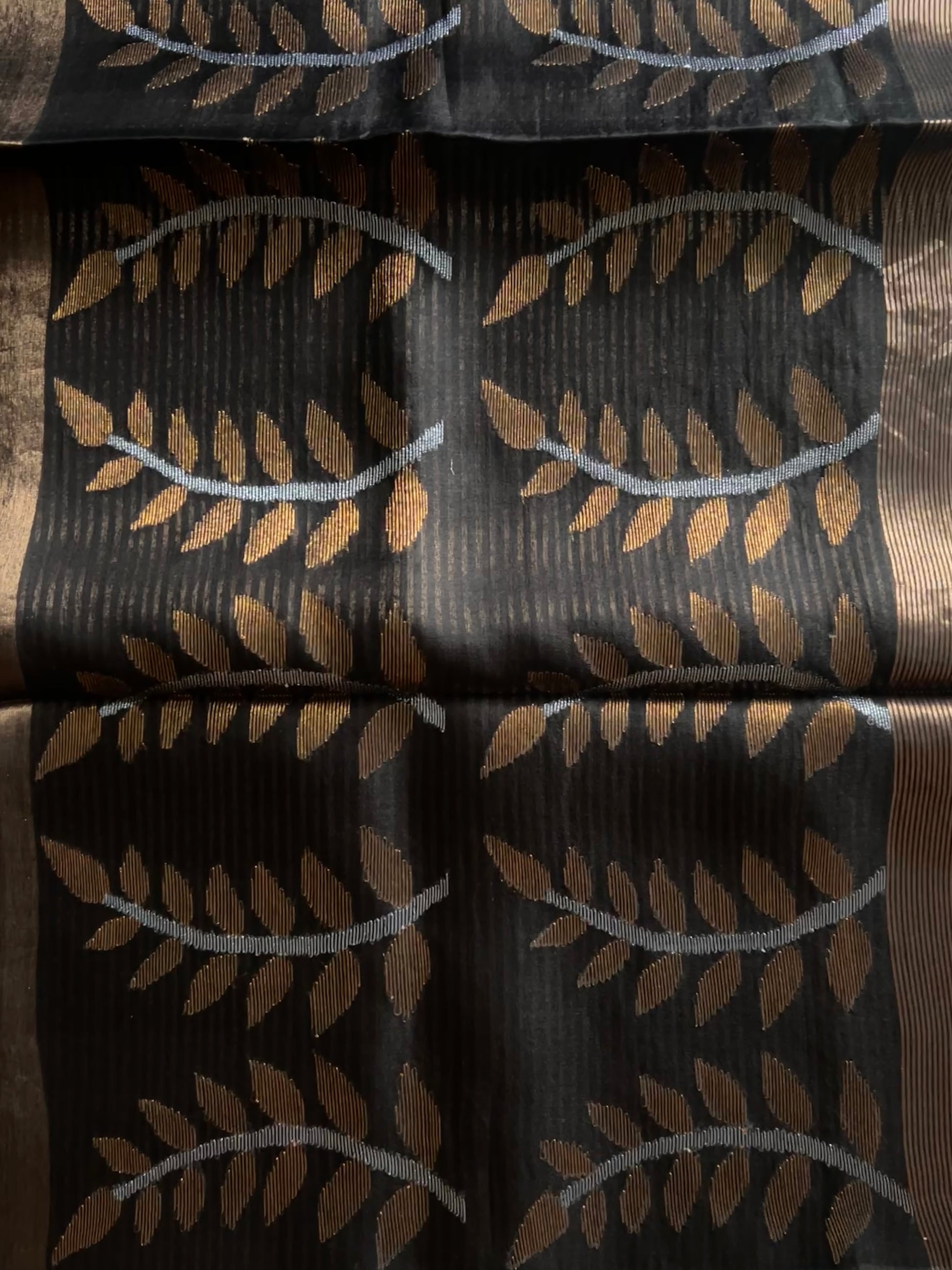 A pure tissue saree with a muslin pallu adorned with intricate Jamdani weave is a timeless expression of elegance and craftsmanship. The shimmering texture of tissue fabric lends a regal glow, while the airy softness of muslin adds grace and fluidity. The Jamdani weave, known for its delicate motifs and labor-intensive artistry, adds a heritage touch, turning the saree into a poetic blend of tradition and luxury — perfect for those who appreciate understated opulence and artisanal beauty.